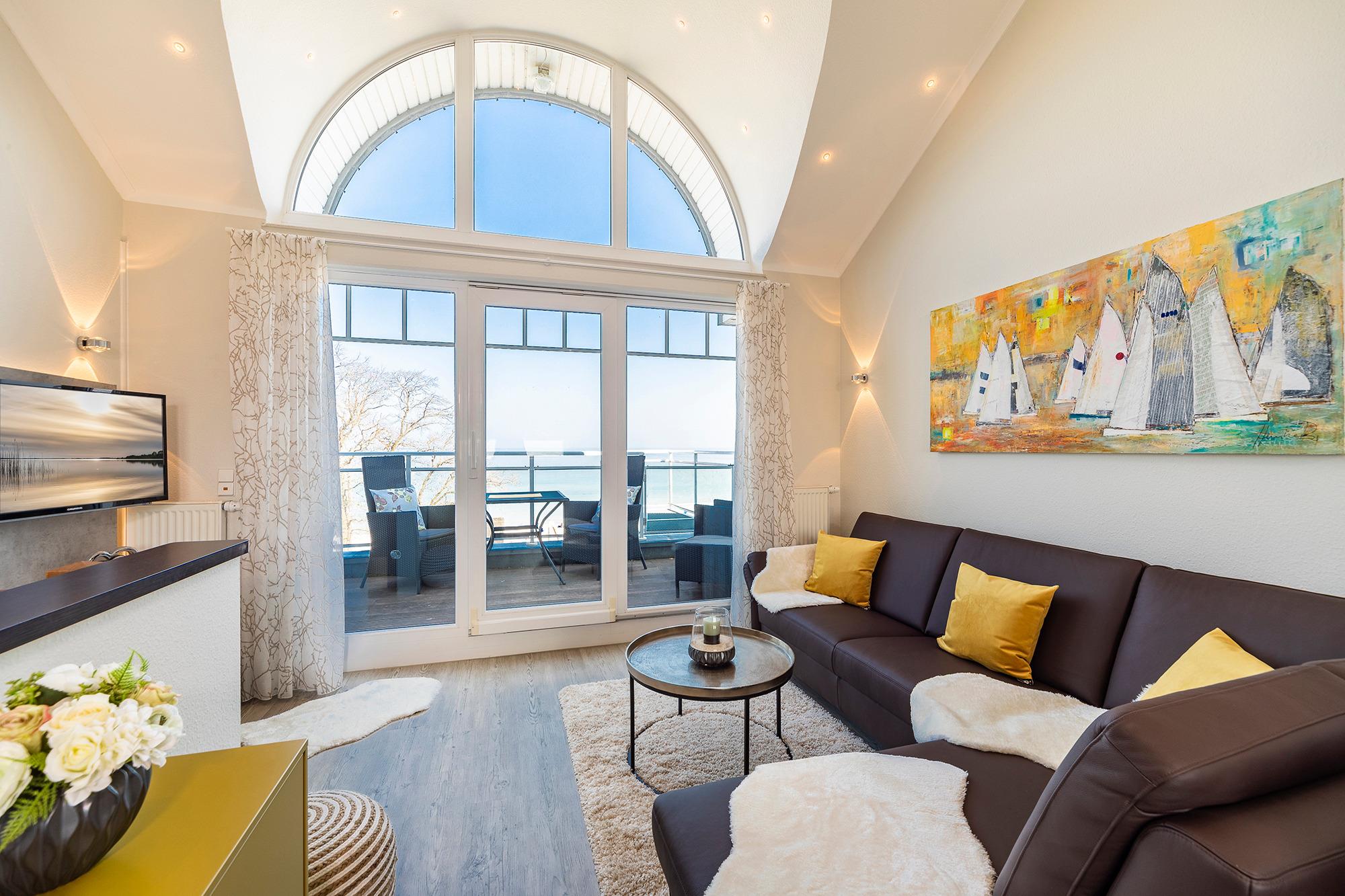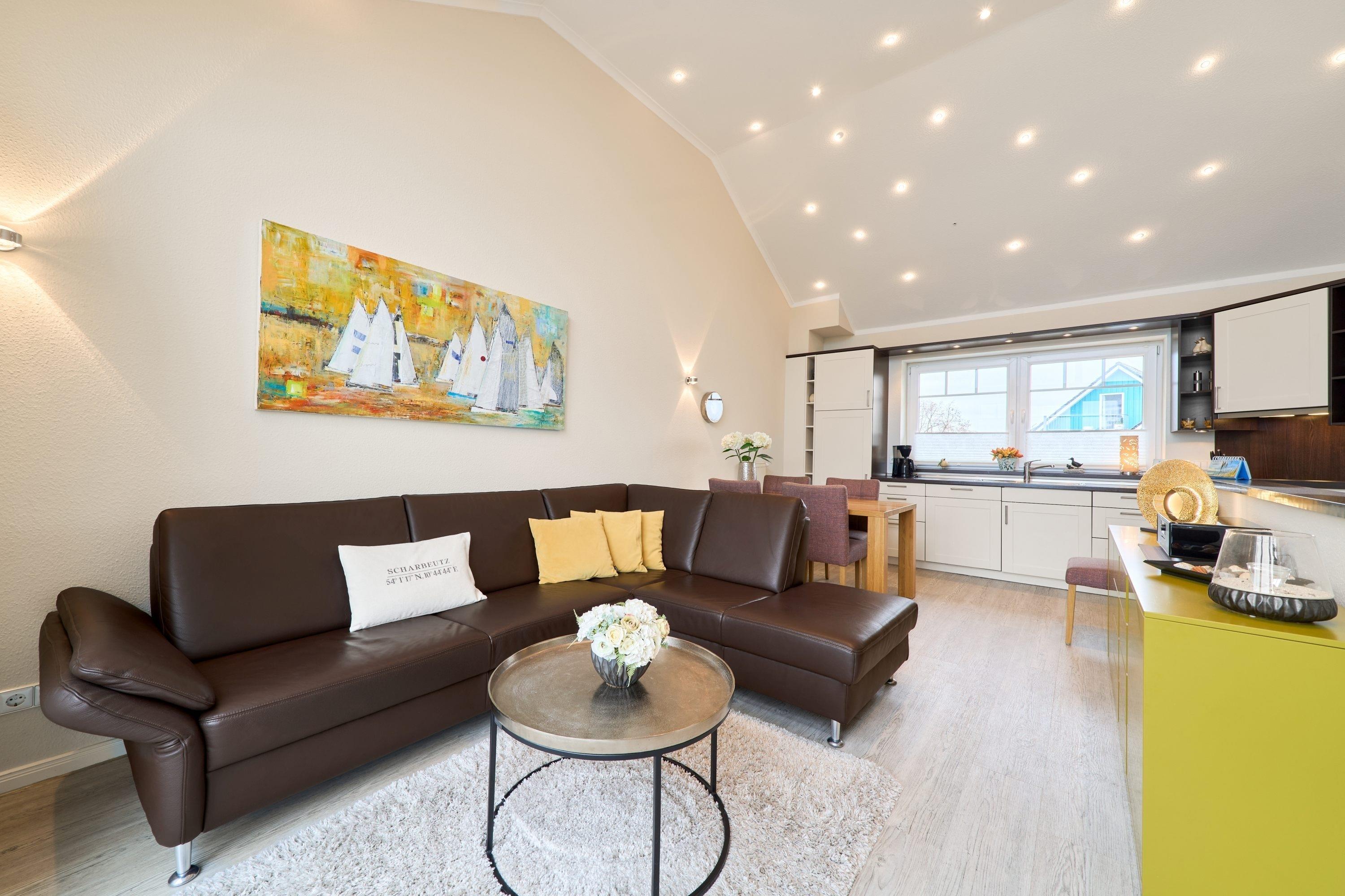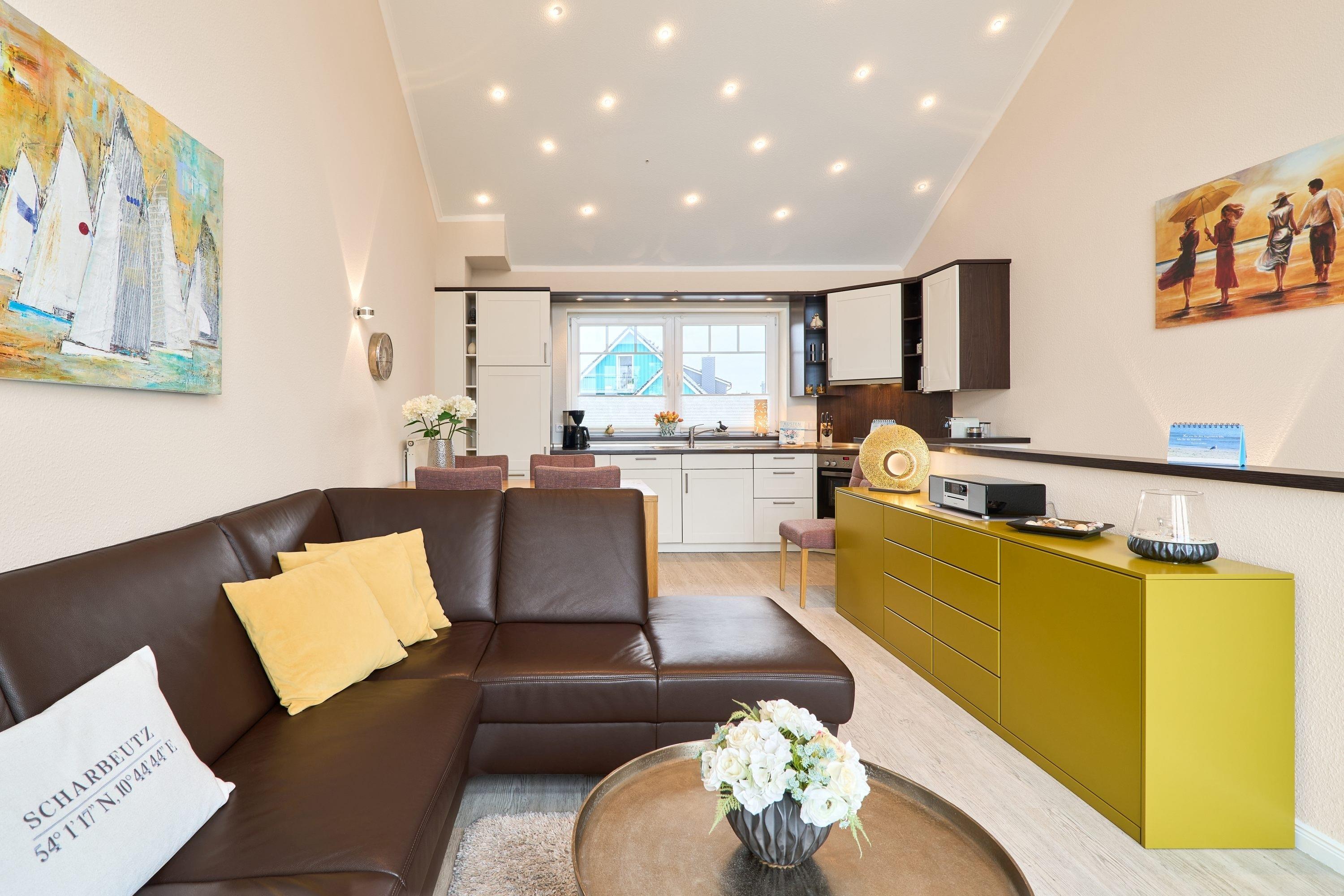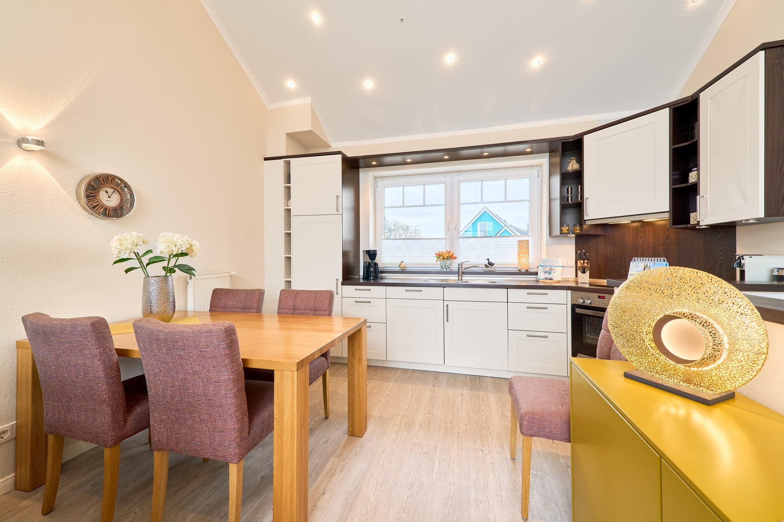 Der ansprechende Wohnbereich mit einem großen Panoramafenster ist mit einer gemütlichen Sofaecke ausgestattet. Neben einem TV-Flachbildfernseher und einer Sono-Anlage steht Ihnen selbstverständlich kostenloses WLAN zur Verfügung. Vom Wohnbereich aus gelangen Sie auf die Dachterrasse Richtung Ostsee. Diese ist mit einem Tisch, Stühlen und einer elektrischen Markise ausgestattet. Die helle Küche lässt keine Wünsche offen. Ein nettes Extra bieten die bereitgestellten Kochbücher mit vielen leckeren Rezepten zum Nachkochen. Der Esstisch bietet Ihnen ausreichend Platz für gesellige Stunden.