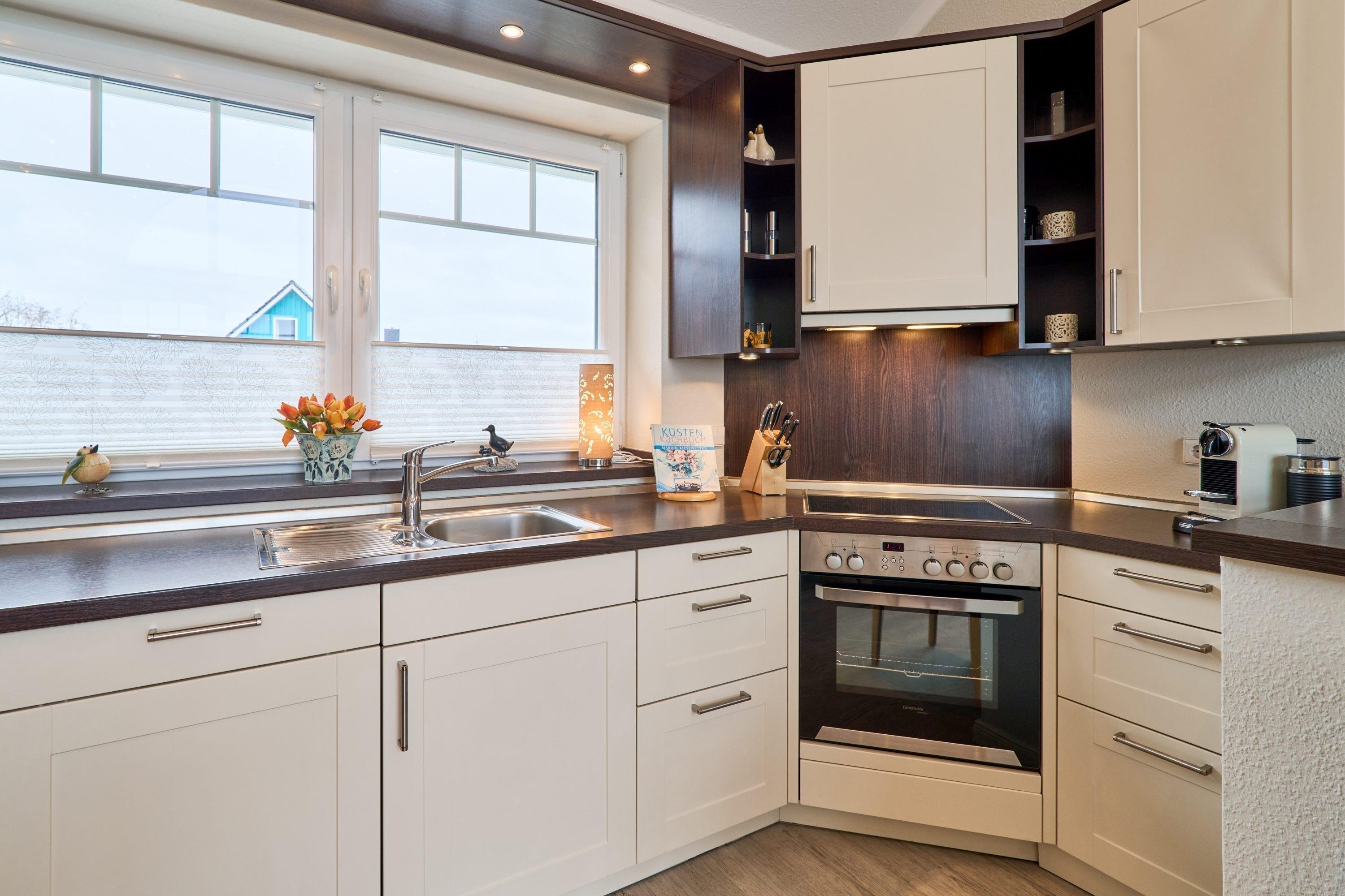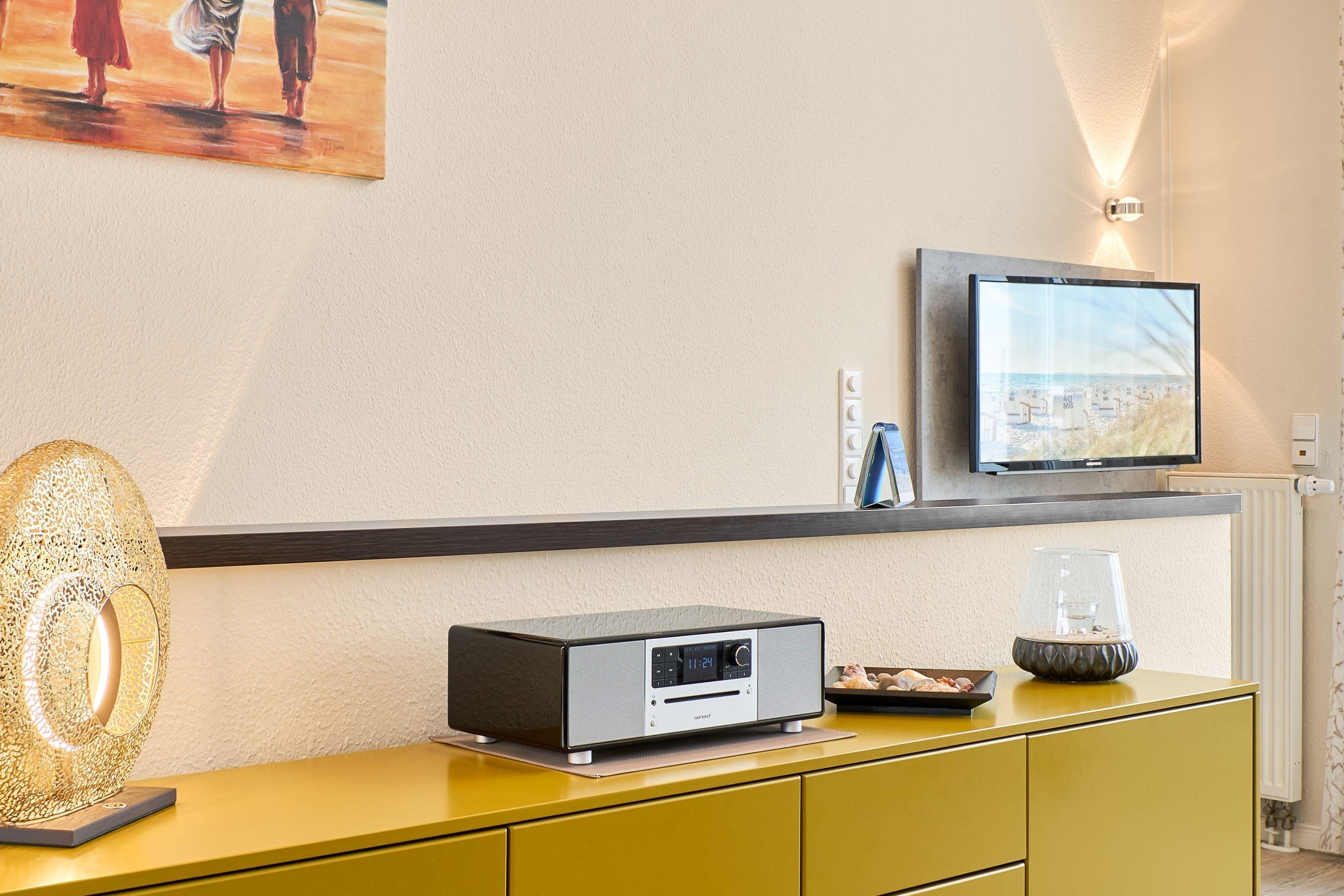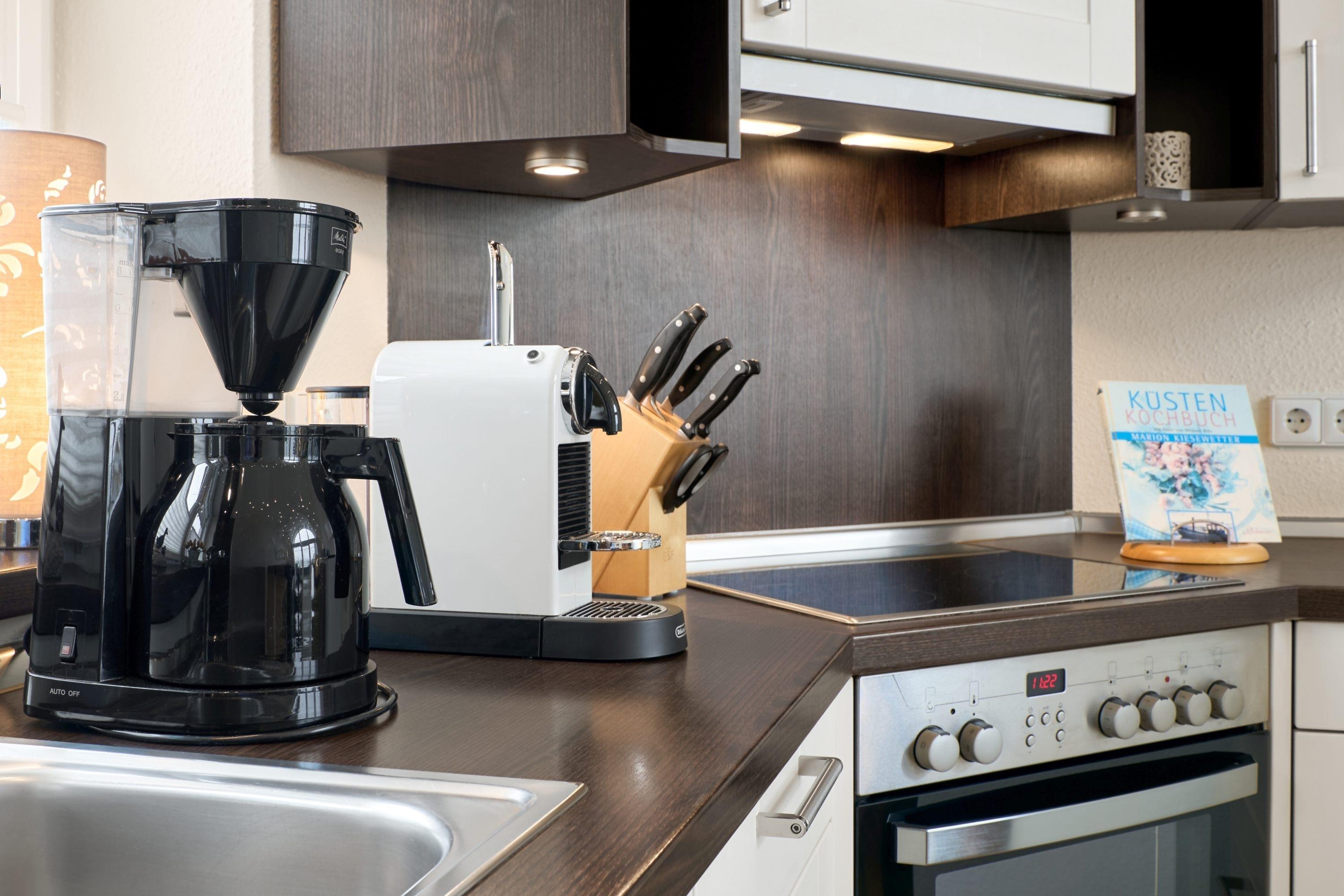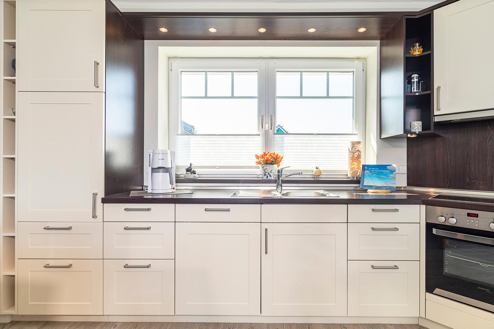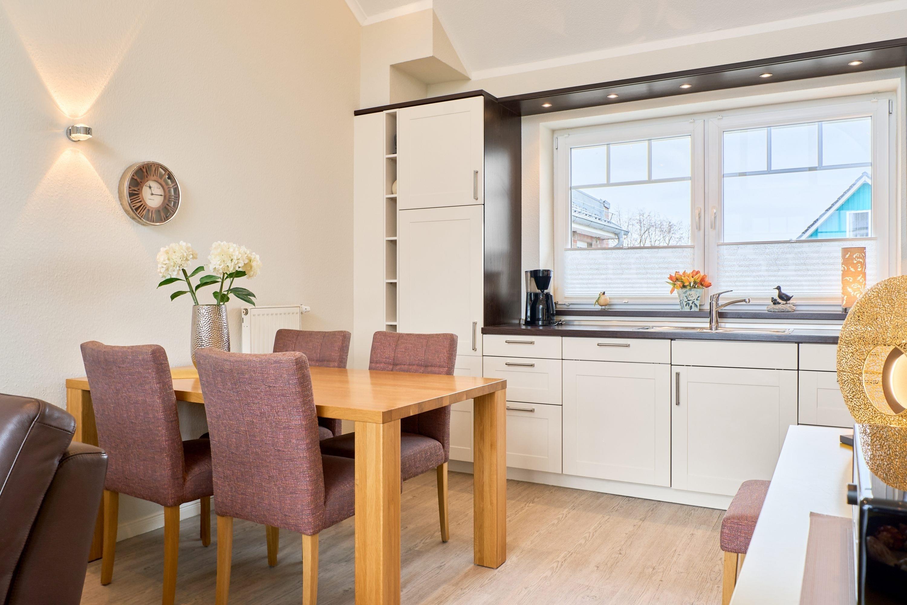 Der ansprechende Wohnbereich mit einem großen Panoramafenster ist mit einer gemütlichen Sofaecke ausgestattet. Neben einem TV-Flachbildfernseher und einer Sono-Anlage steht Ihnen selbstverständlich kostenloses WLAN zur Verfügung. Vom Wohnbereich aus gelangen Sie auf die Dachterrasse Richtung Ostsee. Diese ist mit einem Tisch, Stühlen und einer elektrischen Markise ausgestattet. Die helle Küche lässt keine Wünsche offen. Ein nettes Extra bieten die bereitgestellten Kochbücher mit vielen leckeren Rezepten zum Nachkochen. Der Esstisch bietet Ihnen ausreichend Platz für gesellige Stunden.