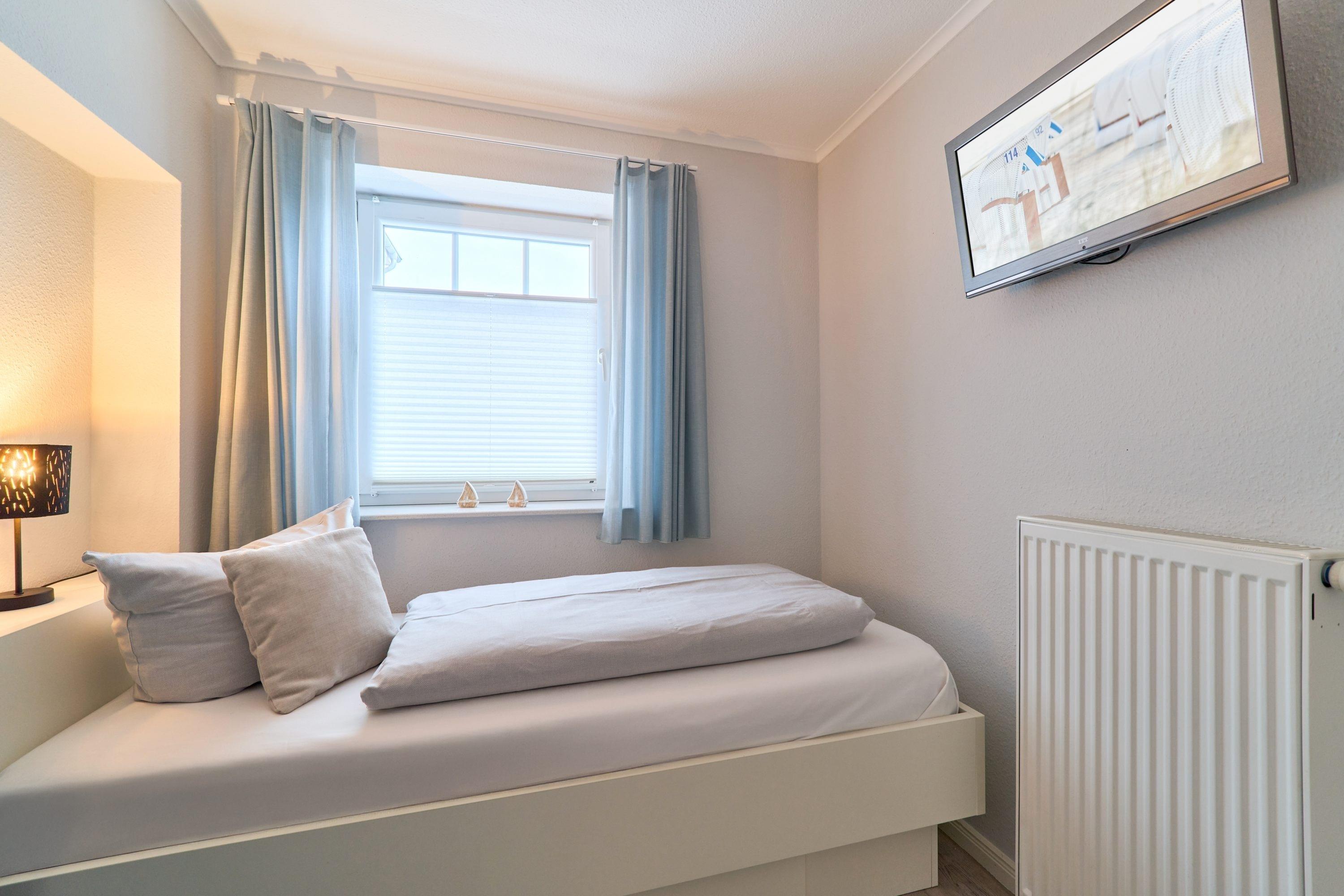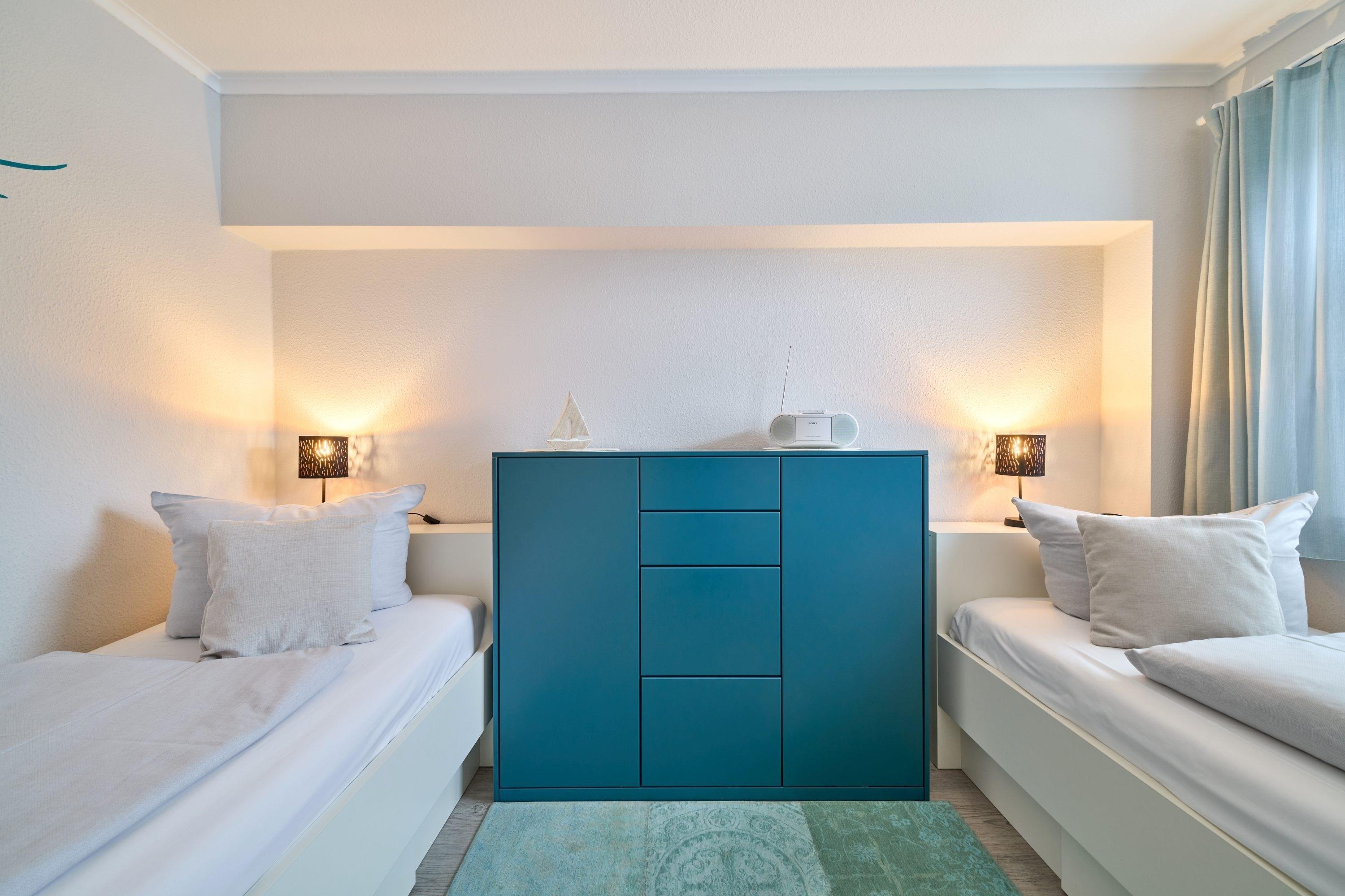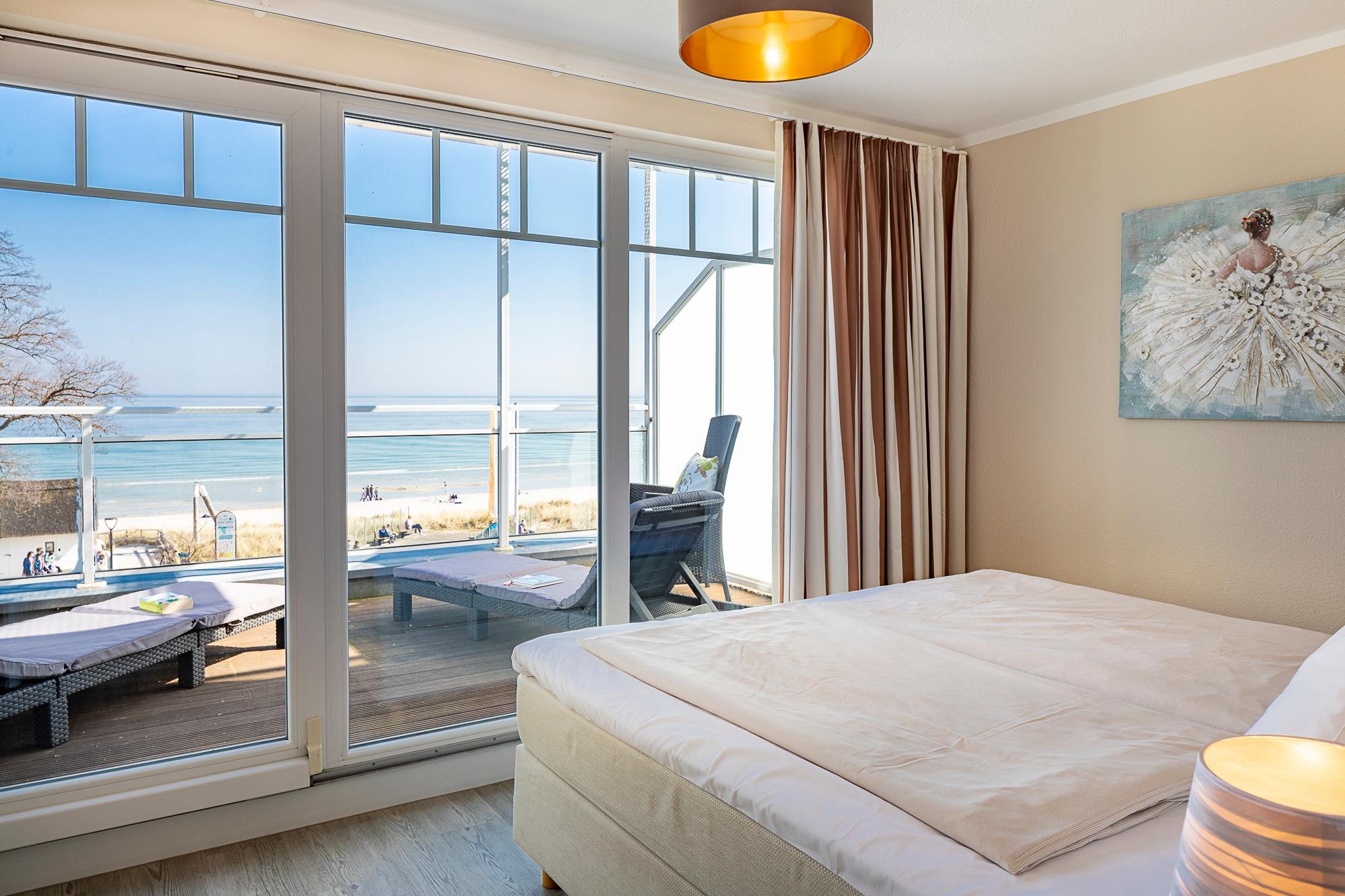 Aufwachen und von der Terrasse auf die Ostsee blicken – dies können Sie vom 1. Schlafzimmer aus. Hier steht ein bequemes Boxspringbett (1,80 x 2,00m) und ein geräumiger Kleiderschrank. Das 2. Schlafzimmer ist mit zwei Einzelbetten (0,90 x 2,00m) sowie einem TV ausgestattet. Das helle Bad verfügt über eine bodentiefe Dusche und einen Handtuchheizkörper.