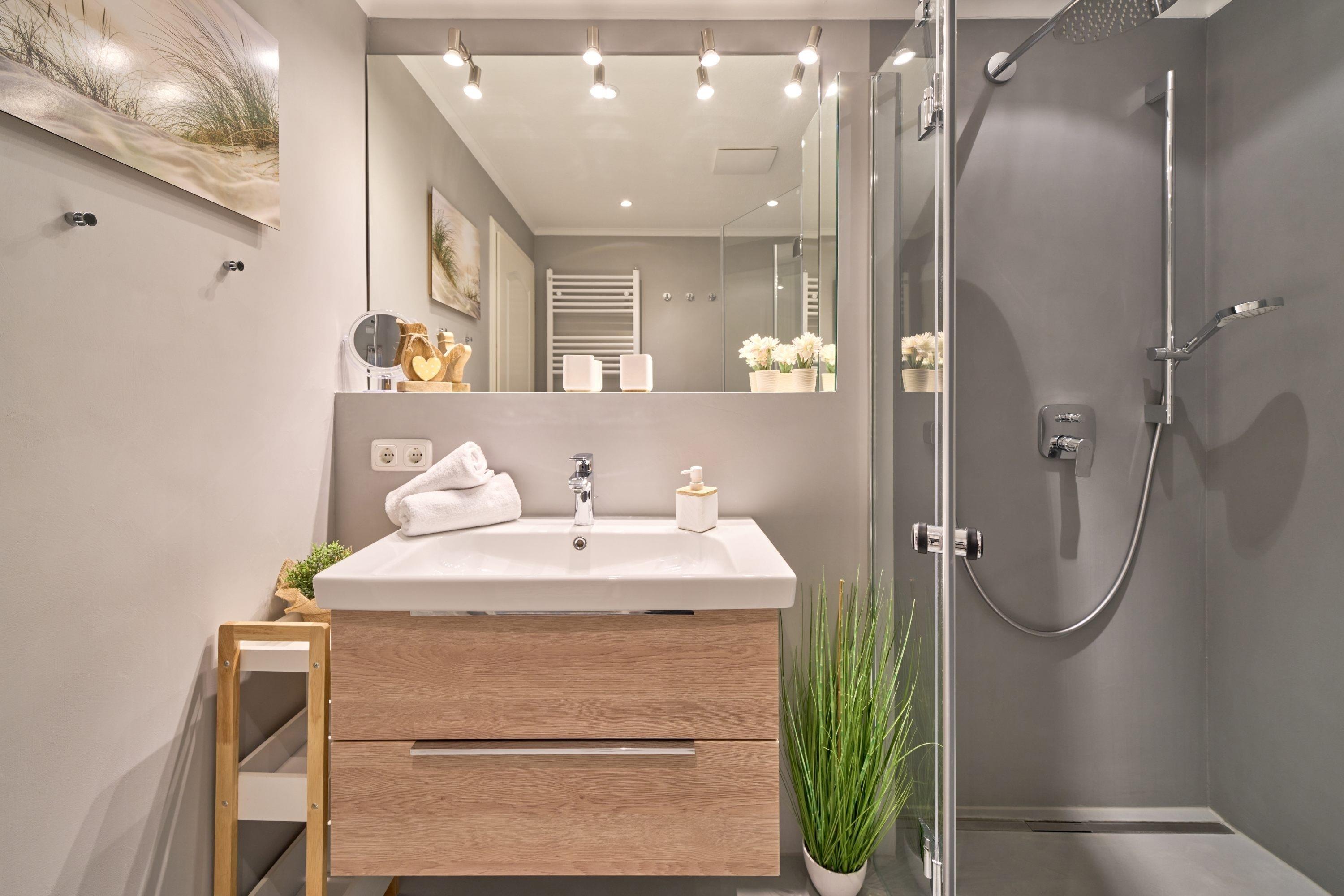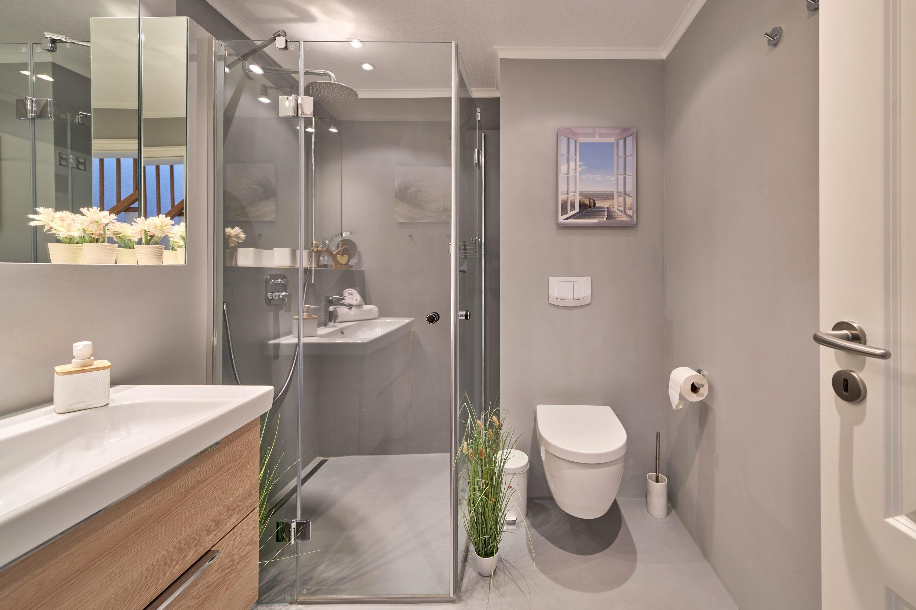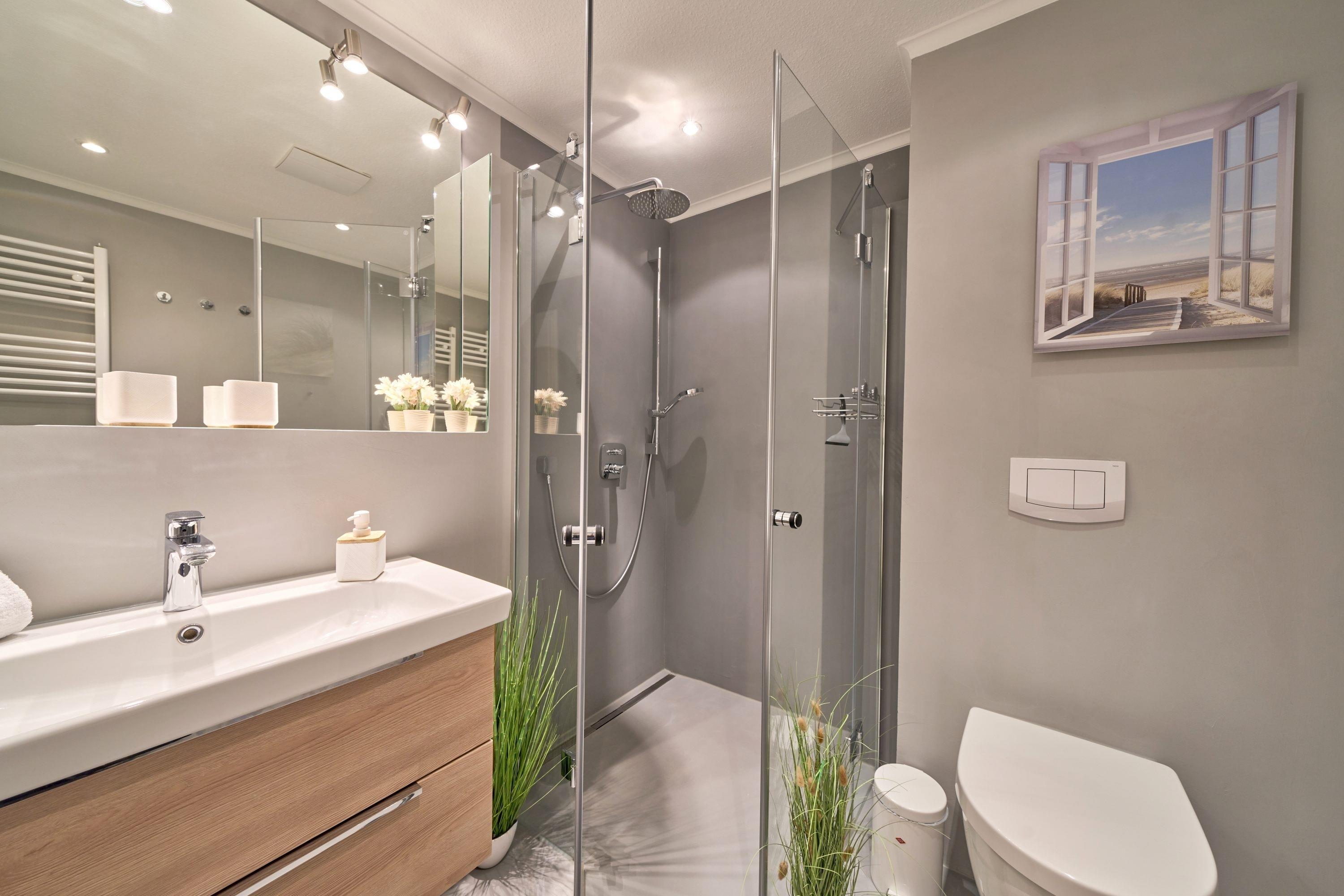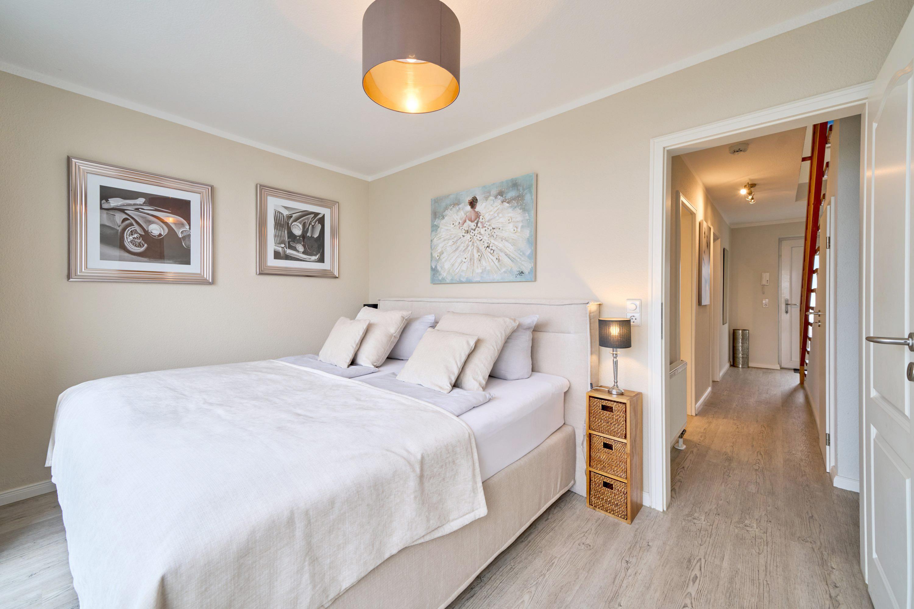 Aufwachen und von der Terrasse auf die Ostsee blicken – dies können Sie vom 1. Schlafzimmer aus. Hier steht ein bequemes Boxspringbett (1,80 x 2,00m) und ein geräumiger Kleiderschrank. Das 2. Schlafzimmer ist mit zwei Einzelbetten (0,90 x 2,00m) sowie einem TV ausgestattet. Das helle Bad verfügt über eine bodentiefe Dusche und einen Handtuchheizkörper.