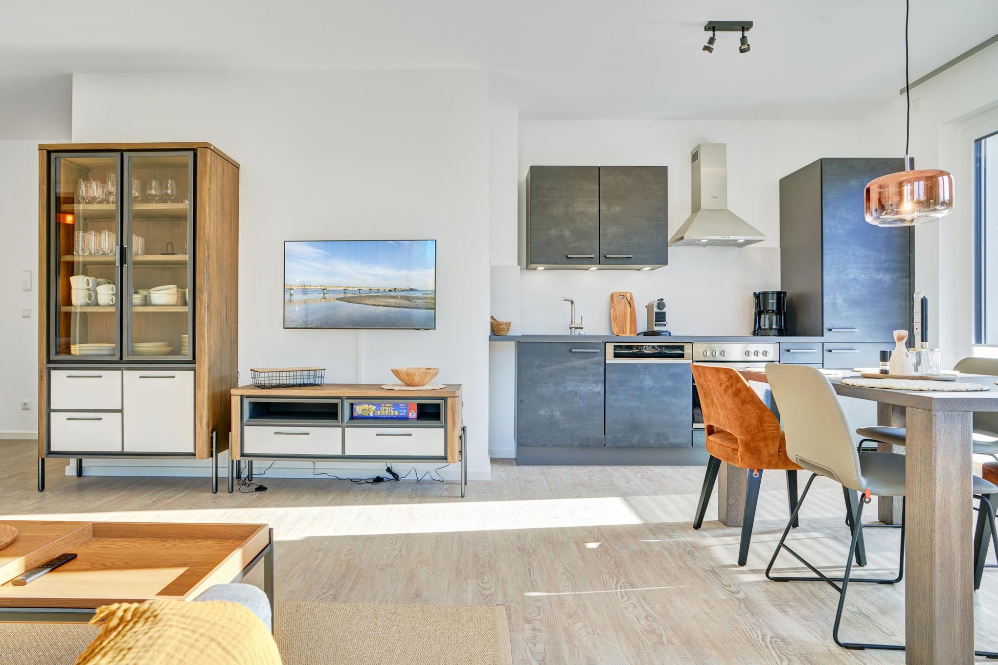 Die Ferienwohnung strahlt mit ihren bodentiefen Fenstern eine helle, behagliche Gemütlichkeit aus. Die Einbauküche im Wohn-Essbereich ist komplett ausgestattet und lässt keine Wünsche offen; Küchenzeile mit Backofen, Ceran-Kochfeld, Elektroherd,[nbsp] Geschirrspüler, Kühlschrank und Gefrierschrank, Filterkaffeemaschine, Krups-Kapsel-Maschine. Der Wohnbereich ist mit einem hochwertigen Sofa (kann mit wenigen leichten Handgriffen zu einem vollwertigen Bett umgebaut werden), einem Wohnzimmertisch, einem großen TV sowie einem Essbereich ausgestattet. Aus dem Wohnbereich gelangen Sie auf den herrlichen Sonnenbalkon nach Südwesten. Hier stehen Ihnen Tisch und Stühle sowie ein Relaxsessel zur Verfügung. Das Schlafzimmer ist mit einem Boxspringbett (180x200) ausgestattet und verfügt über einen Kleiderschrank, 2 Nachttische und einen TV. Sind Sie es gewohnt, im Dunkeln zu schlafen? Kein Problem, denn es stehen Ihnen elektrische Außenrollläden zur Verfügung. Das Duschbad in heller Optik mit bodengleicher Dusche und Handtuchheizkörper, Fön, Kosmetikspiegel. Großer, halb umlaufender Südwestbalkon mit Tisch und Stühlen sowie zwei Relax-Sesseln. Die gesamte Wohnung ist mit einer Fußbodenheizung sowie mit einem Sicht- bzw. Lichtschutz an allen Fenstern und zusätzlichen elektrischen Rollläden ausgestattet.