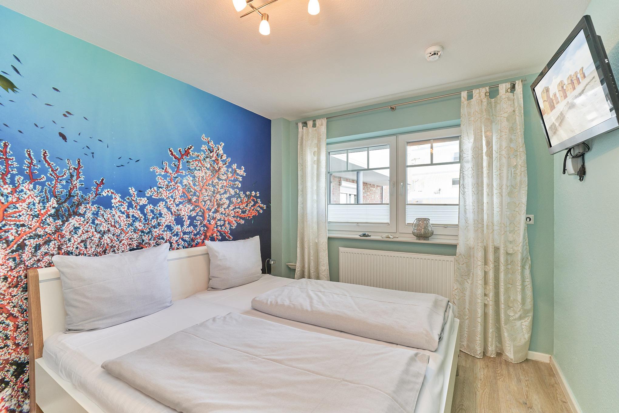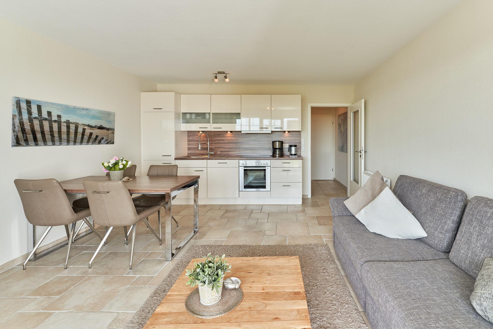 Der Wohn-Essbereich ist mit einem Esstisch und einer Couch ausgestattet, die sich mit nur wenigen Handgriffen in eine Schlafcouch umwandeln lässt. Neben einem Flachbildfernseher, einem DVD-Player und einer Stereoanlage steht Ihnen selbstverständlich kostenloses WLAN zur Verfügung. Die Terrasse Richtung Osten ist mit einem Tisch, Stühlen, einer Bank und einem Sonnenschutz ausgestattet. Die helle Küche lässt keine Wünsche offen. Im Schlafzimmer stehen ein Flachbildfernseher, ein bequemes Doppelbett (1,80 x 2,00m) und ein geräumiger Kleiderschrank. Zur Verdunkelung sind elektrische Rollläden angebracht. Das helle Bad verfügt über eine bodentiefe Dusche und ausreichend Ablageflächen. Neben der Fußbodenheizung befindet sich hier ein zusätzlicher Handtuchheizkörper.