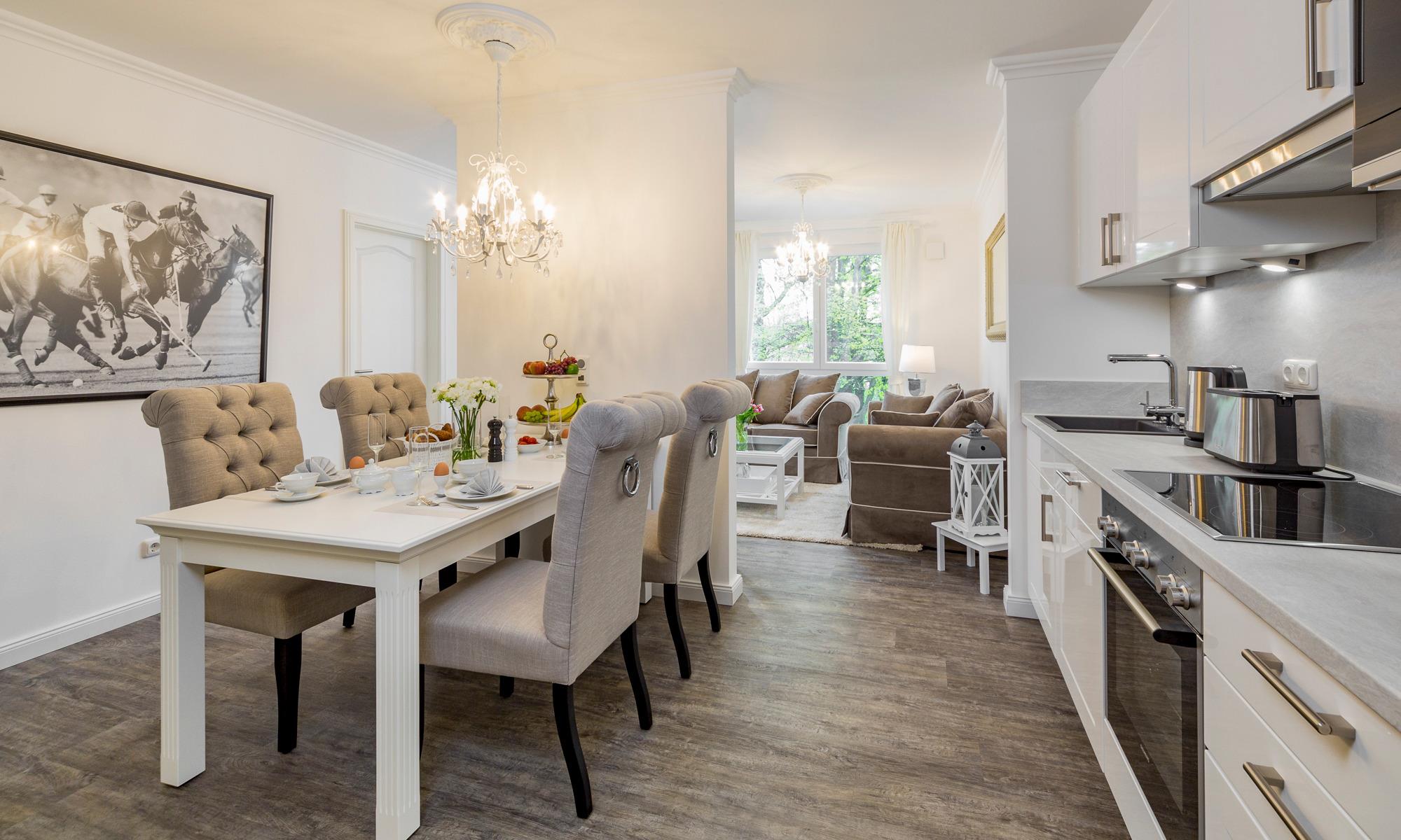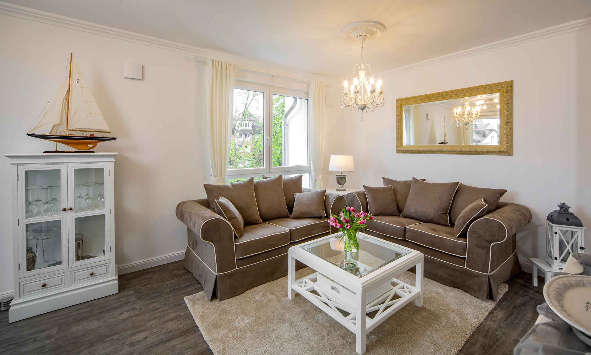 3-Zimmerwohnung "Sunrise Suite", 2 Bäder, 2 Schlafzimmer, Tiefgaragenstellplatz (Durchfahrtshöhe 2,10 m) in der Strandvilla Augustusbad, bis zu vier Personen.