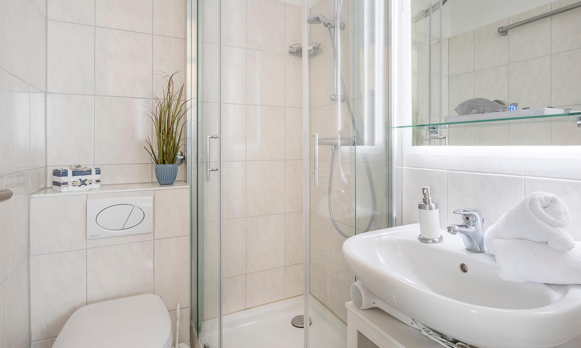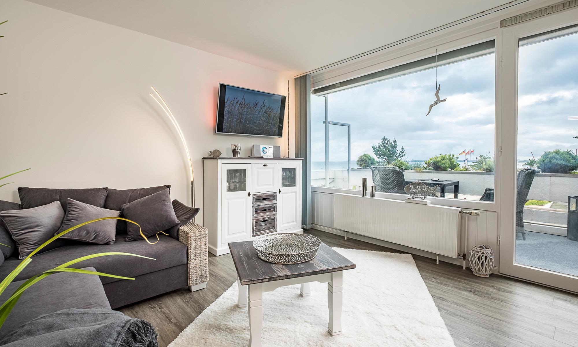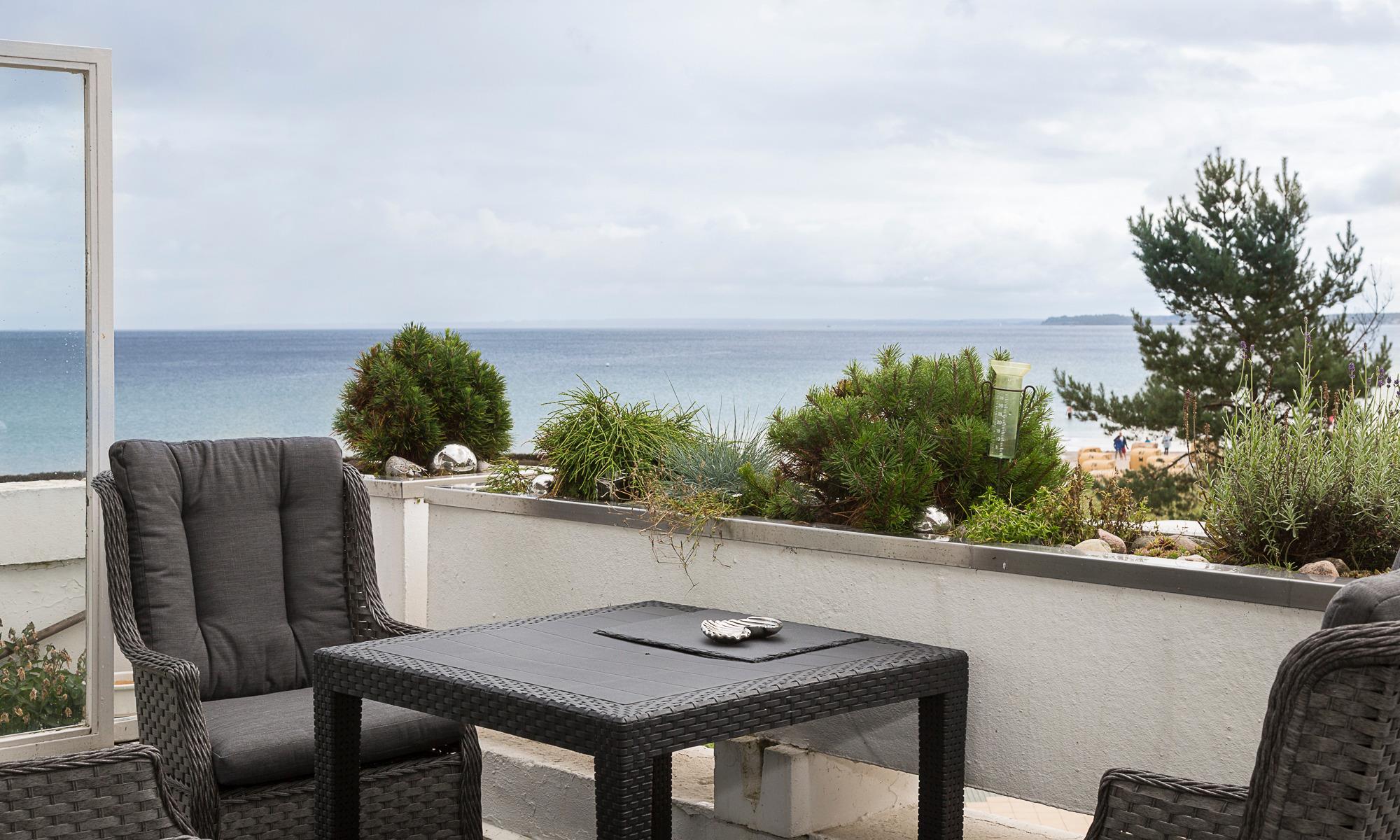 2,5-Zimmer-Ferienwohnung, ca. 56 m², Südbalkon mit herrlichem Ostseeblick, Duschbad, Kfz-Außenstellplatz, für bis zu 3 Personen. Die Wohnung liegt im 1. OG nach Süden. Bis zur Wohnung sind einige kleine Treppenstufen zu gehen.