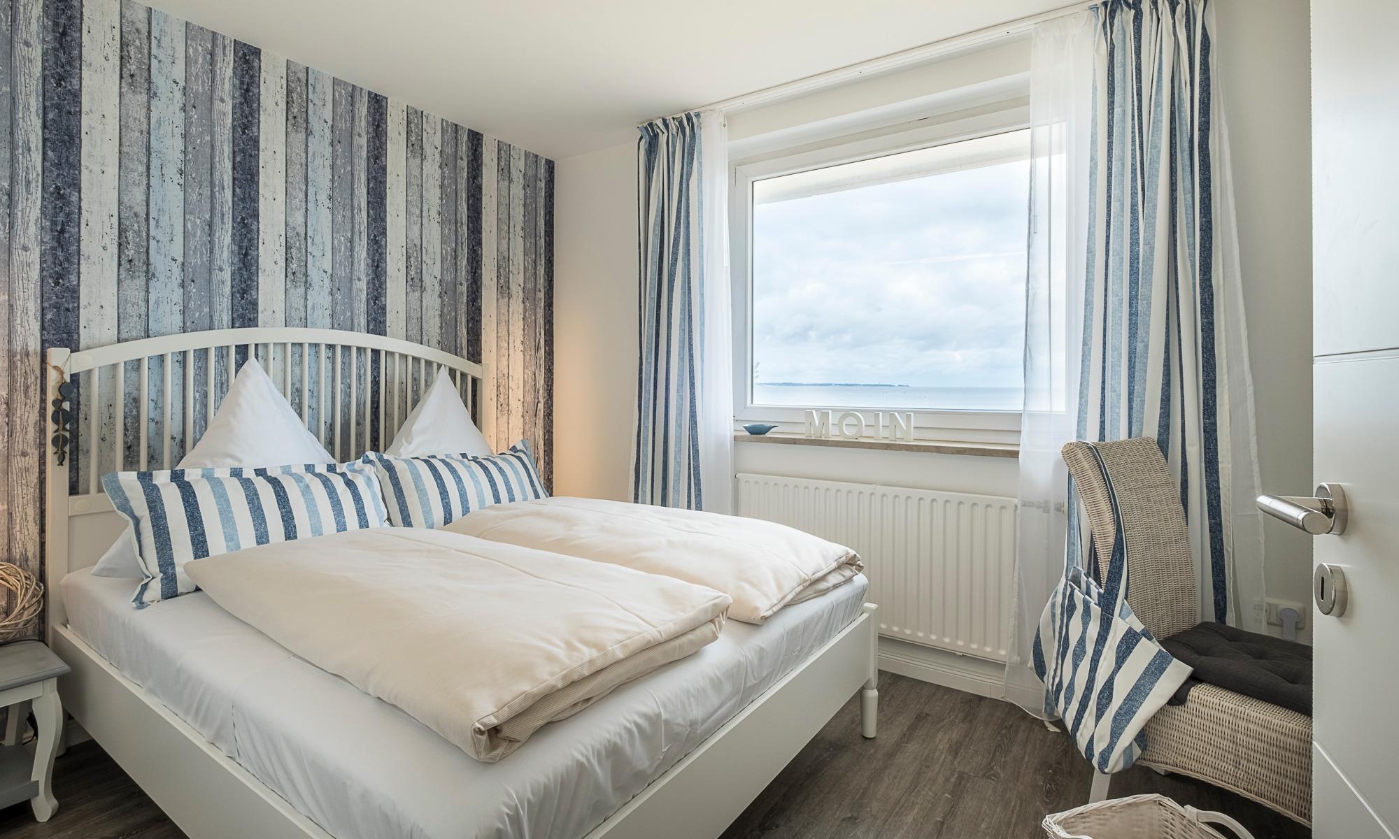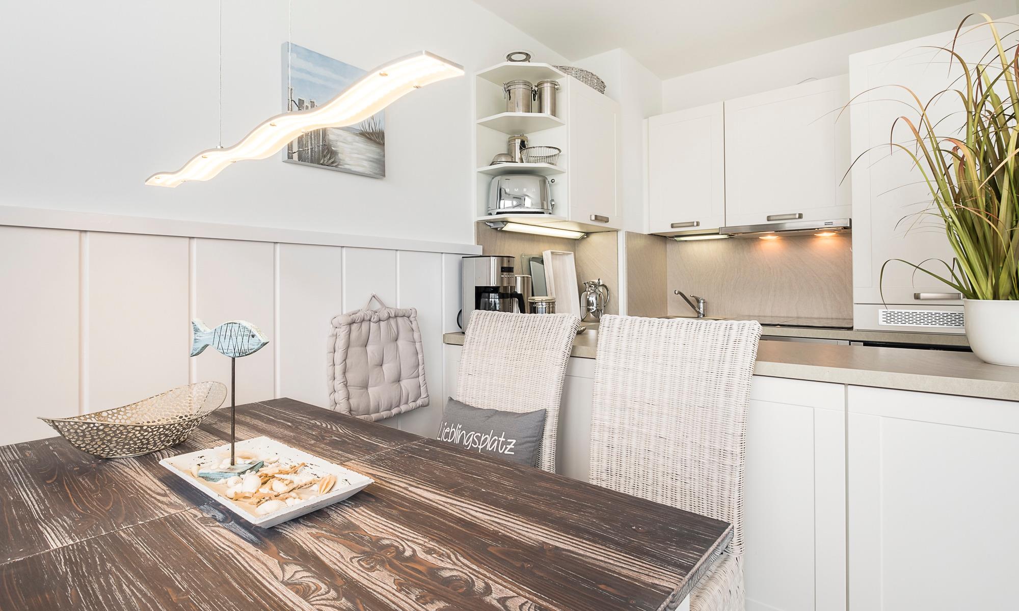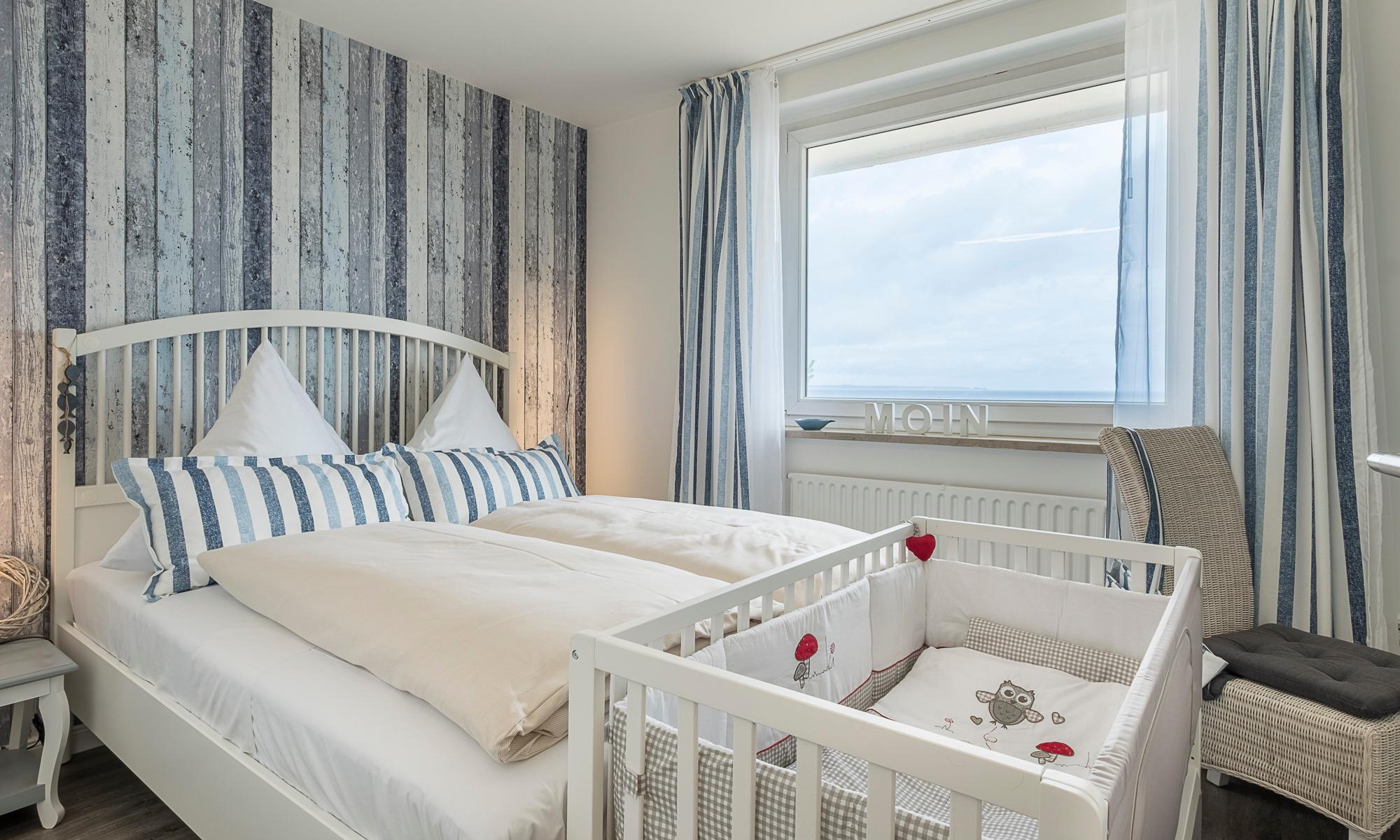 Meerblick, Kaffeemaschine mit Milchaufschäumer, WMF-WOK, Fußbodenheizung, Handtuchheizkörper, Kinderbett, Kinderhochstuhl und Babybadewanne, Fluxtec-Bollerwagen, WLAN, Kfz-Außenstellplatz, Strandkorb gegenüber am Strand (saisonbedingt 15.05. – 15.09.).