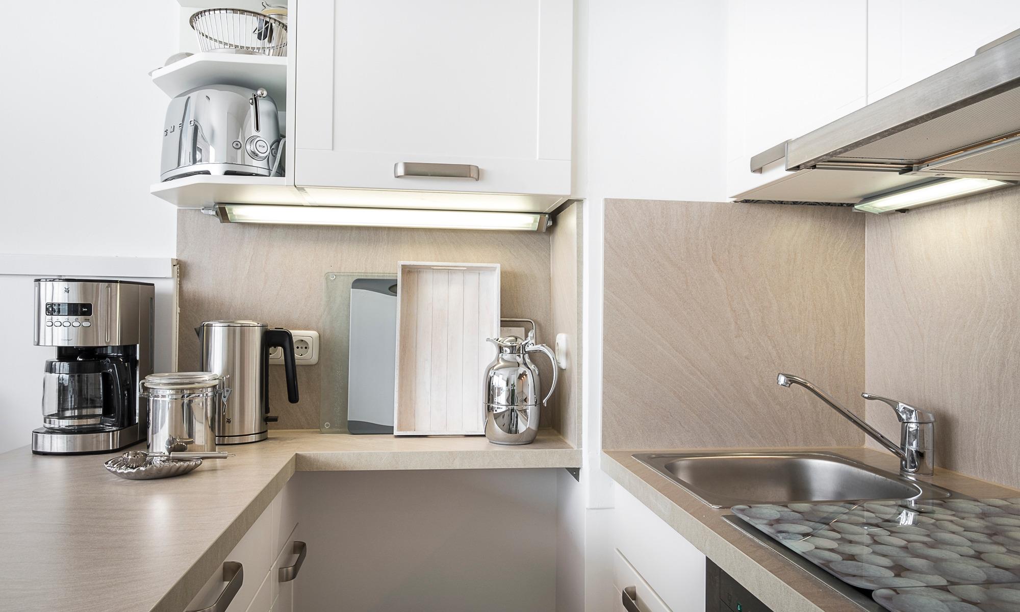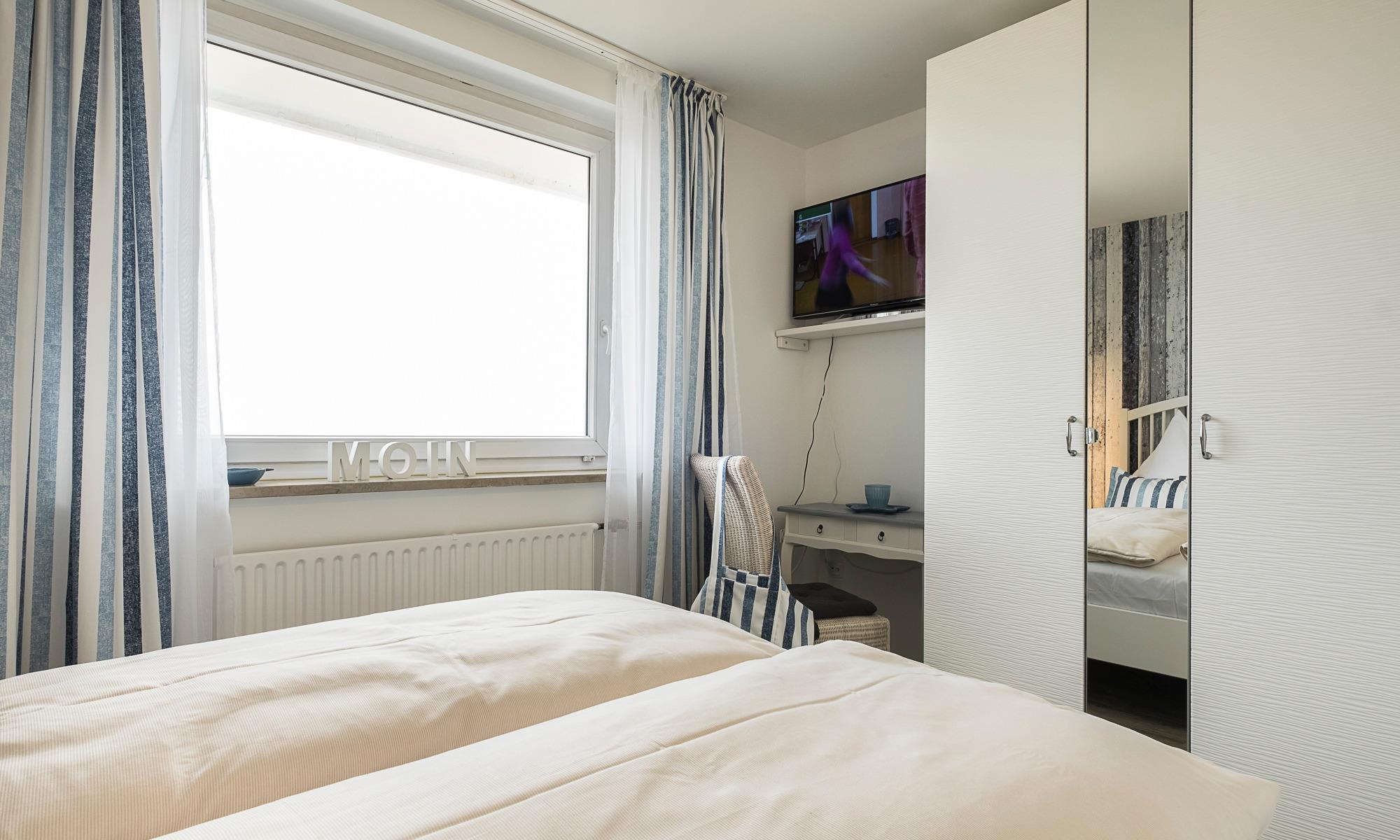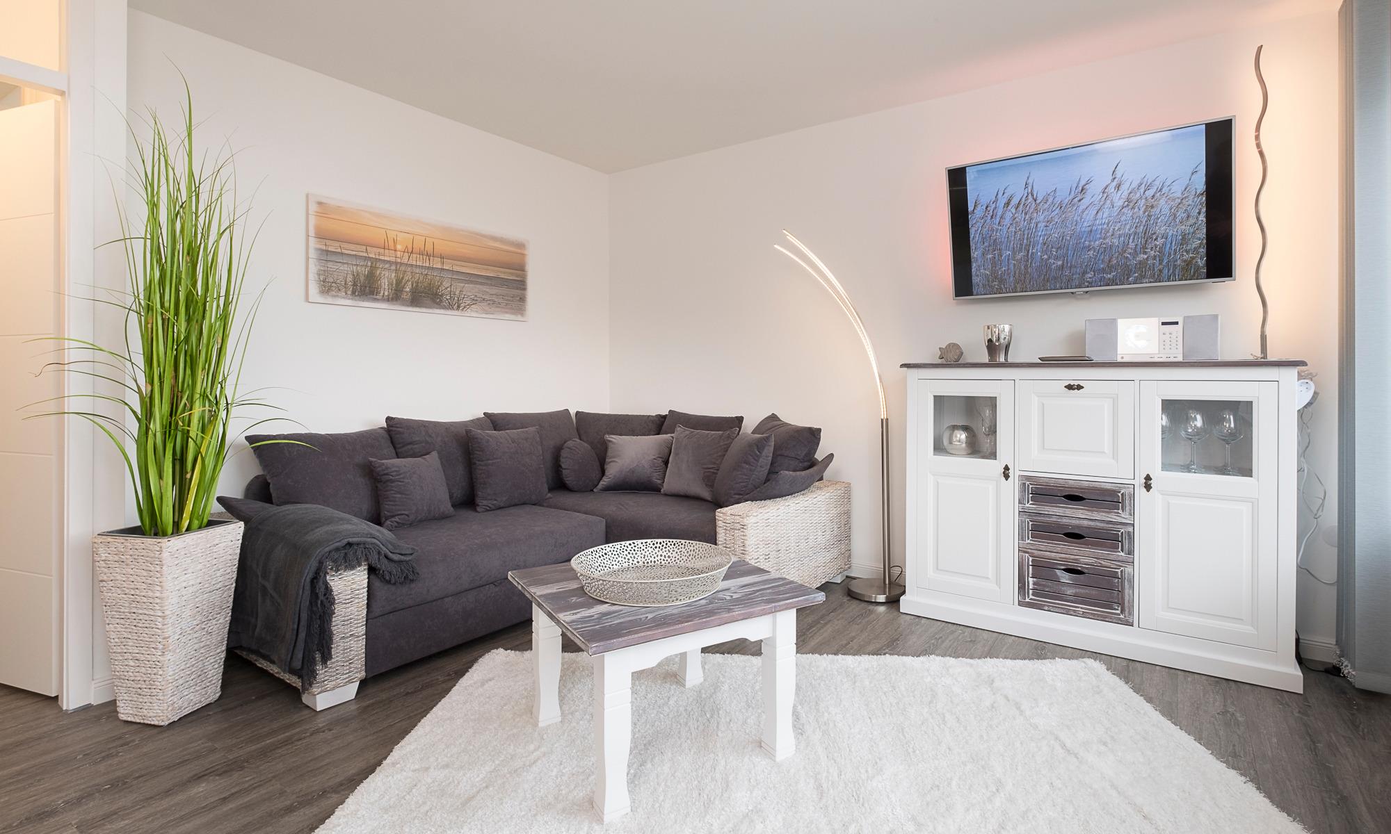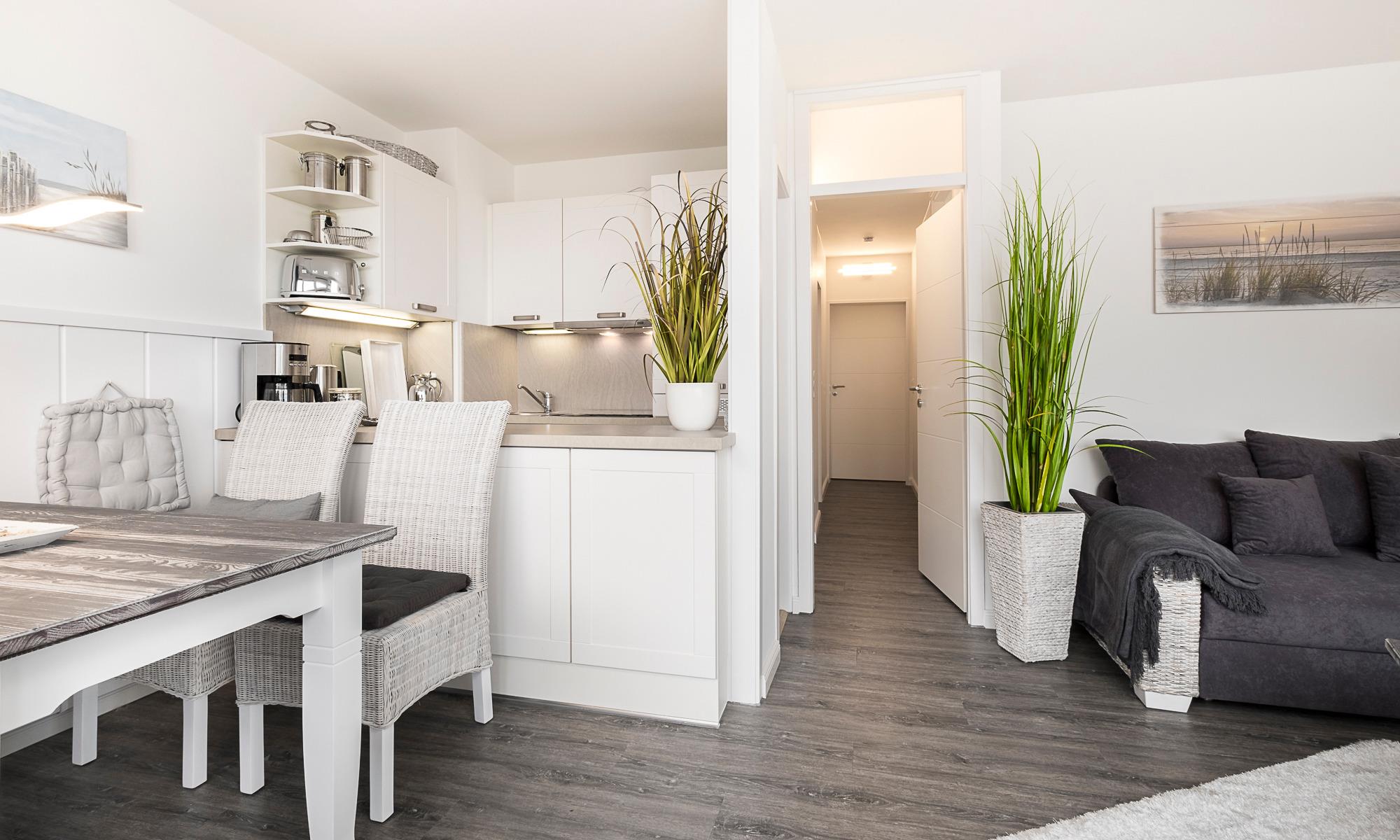 Meerblick, Kaffeemaschine mit Milchaufschäumer, WMF-WOK, Fußbodenheizung, Handtuchheizkörper, Kinderbett, Kinderhochstuhl und Babybadewanne, Fluxtec-Bollerwagen, WLAN, Kfz-Außenstellplatz, Strandkorb gegenüber am Strand (saisonbedingt 15.05. – 15.09.).