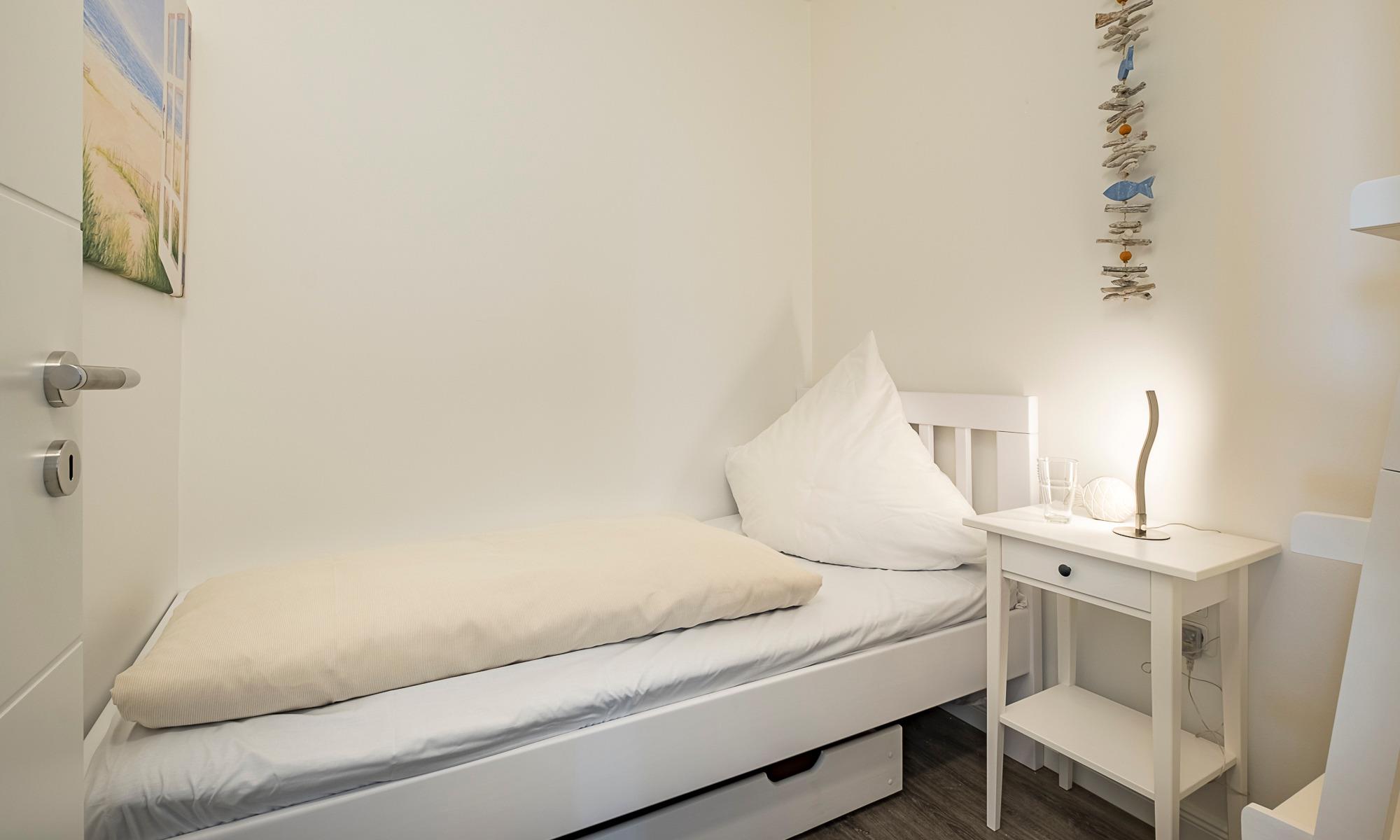 Helles, gemütliches Wohnzimmer, mit 4-K-Ultra-HD-TV mit Ambilight an der Wand. Offene Küche mit angrenzendem Essbereich. Vom Essbereich aus haben Sie einen schönen Meerblick; hier können Sie lange verweilen, auch für fröhliche Spielabende bietet Ihnen dieser Bereich ausreichend Platz und Bequemlichkeit. Das Schlafzimmer ist mit einem Doppelbett (1,60 x 2,00m), einem Kleiderschrank und einem Wand-TV ausgestattet. Auch von hier aus haben Sie einen herrlichen Ostseeblick. Ein weiteres Schlafzimmer ohne Fenster, mit einem Einzelbett, bietet ausreichend Platz für eine dritte Person. Auf dem Flur ist eine Garderobe mit einem Ganzkörperspiegel. Das Duschbad ist in heller Optik. Das Haus verfügt über eine Waschmaschine im Waschkeller und einen Fahrradkeller.