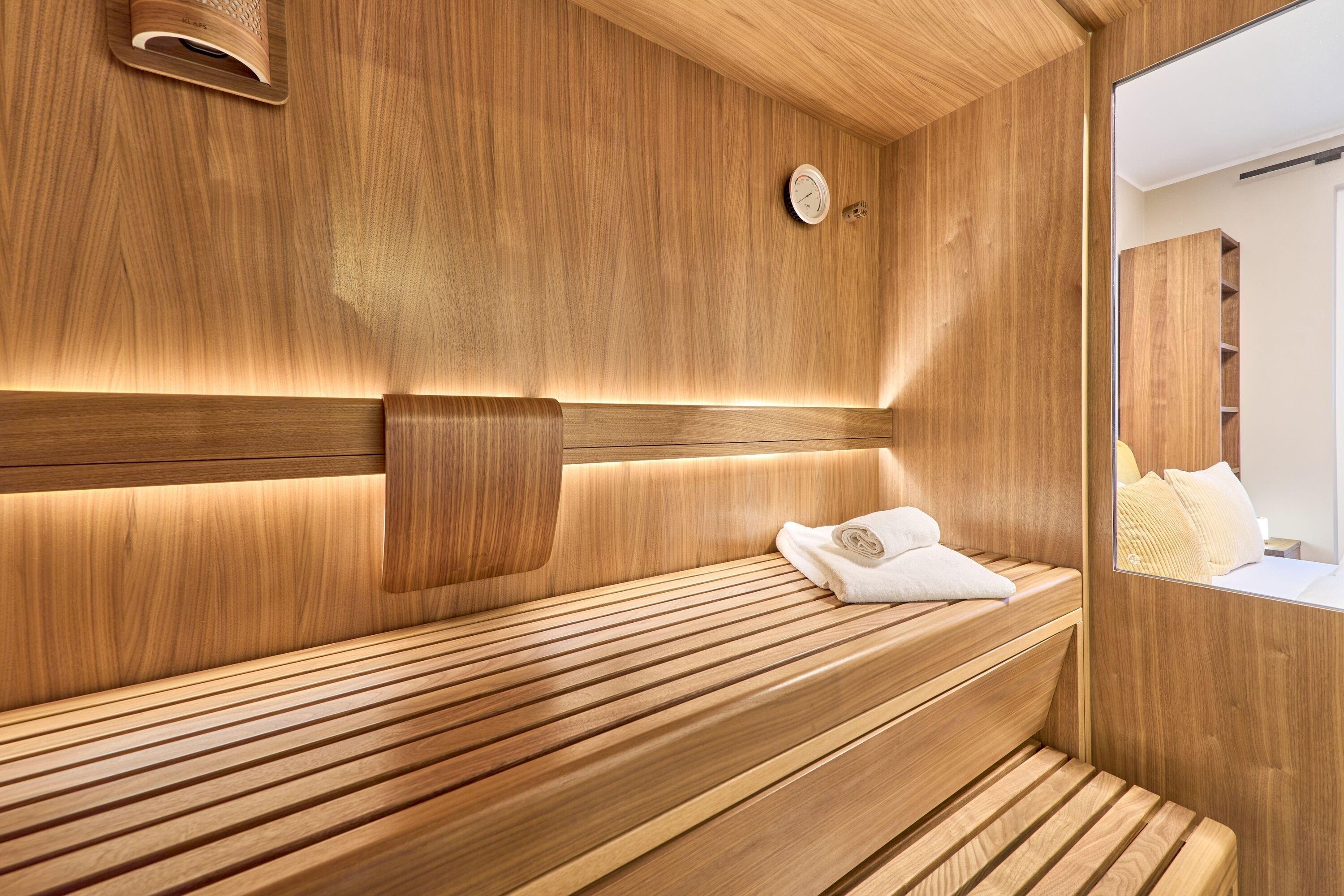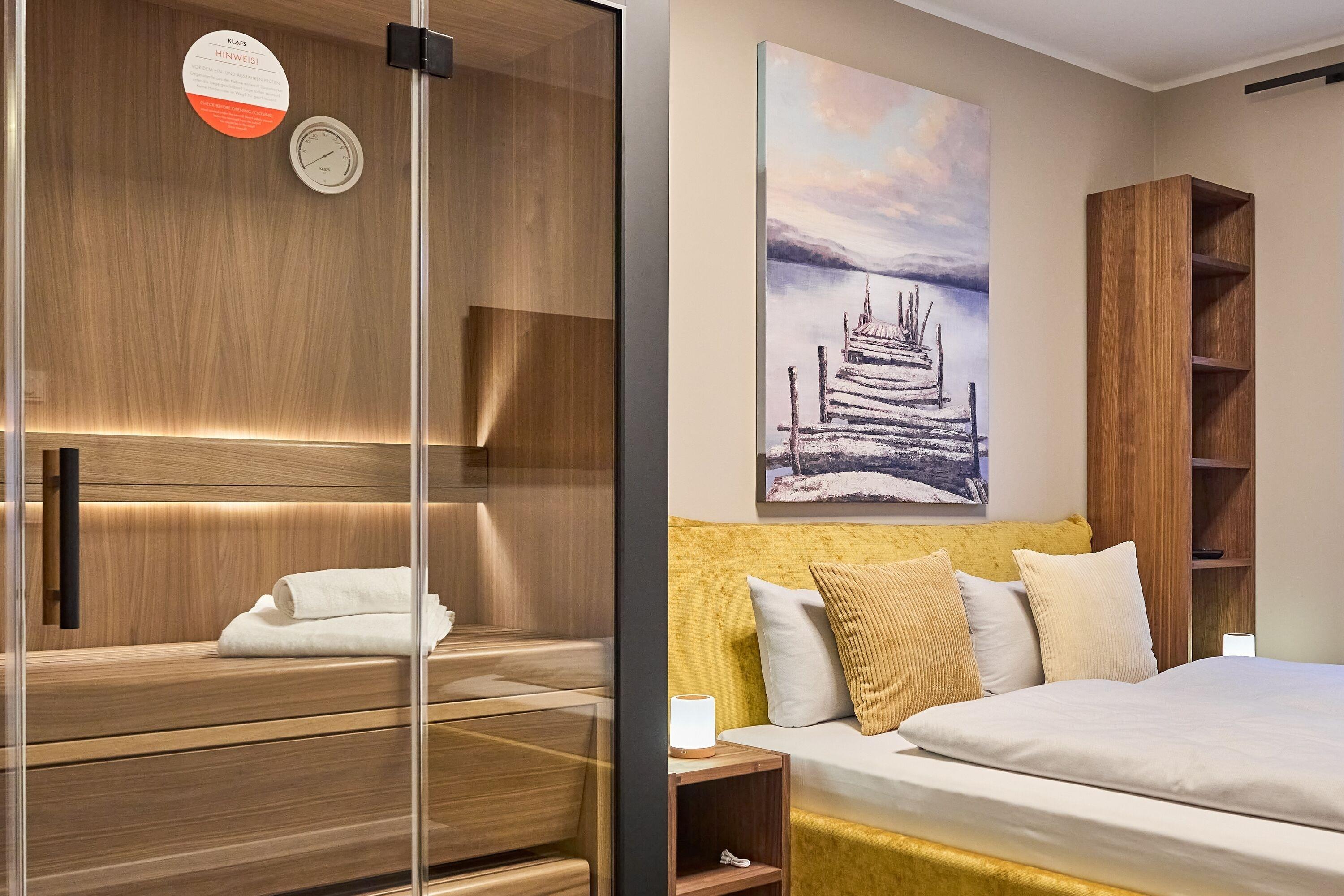 Die 2 Schlafzimmer sind jeweils mit einem Doppelbett (1,80 bzw. 1,60 x 2,00 m), einem Flachbild-TV und – das größere Schlafzimmer – mit einem Kleiderschrank ausgestattet. Relaxen Sie nach einem Spaziergang in der ausfahrbaren Sauna von Klafs mit Sanarium. Diese tolle Technik der Sauna befindet sich im 2. Schlafzimmer.