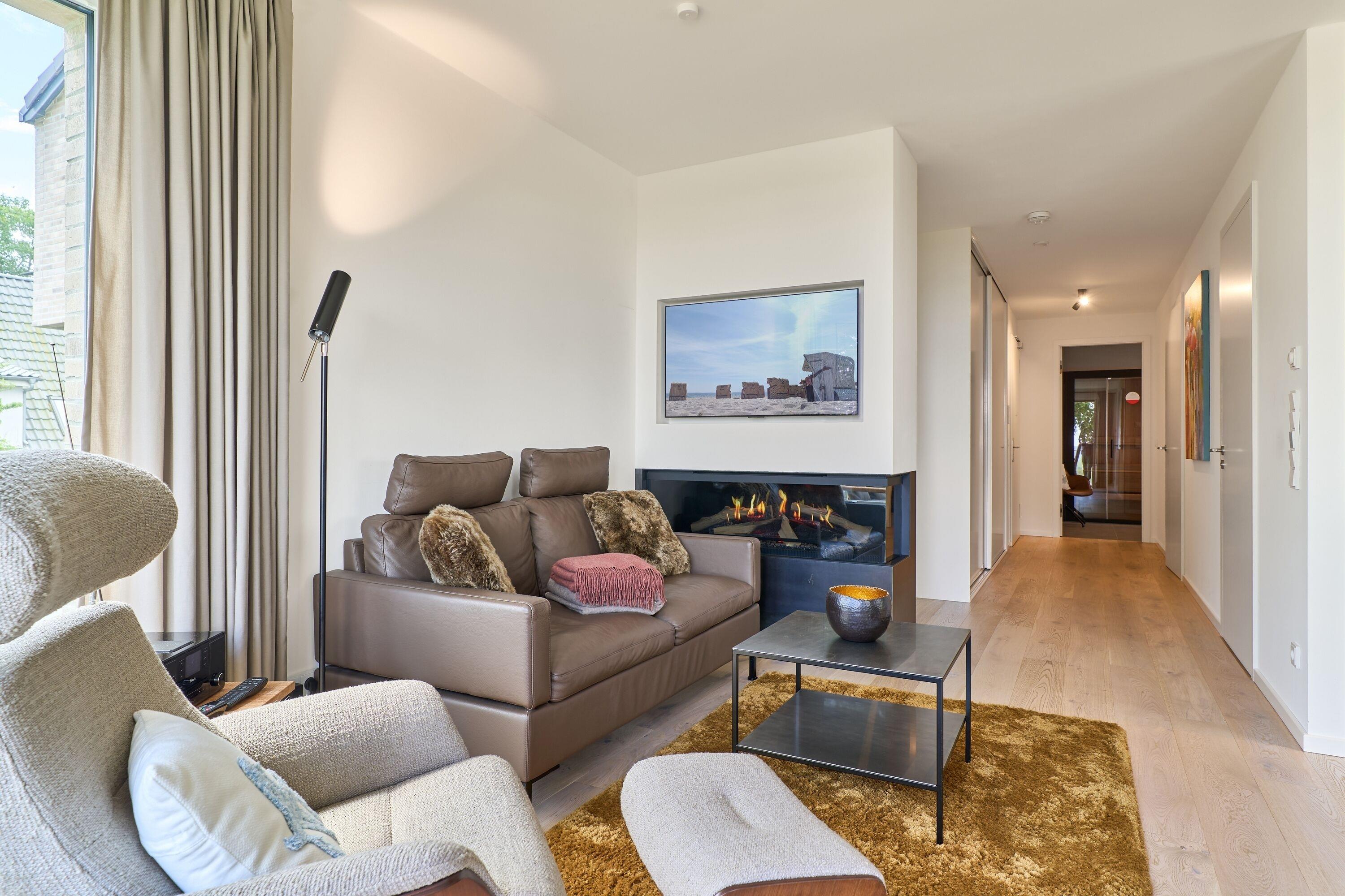 Mit einem Sofa und einem Relaxsessel lädt der Wohnbereich zu gemütlichen Stunden vor dem Elektrokamin ein. Neben einem Flach-TV mit neuester Technik steht Ihnen selbstverständlich kostenloses WLAN zur Verfügung. Das Bad verfügt über eine bodentiefe Dusche, einen Handtuchheizkörper und – wie die gesamte Wohnung – eine Fußbodenheizung.