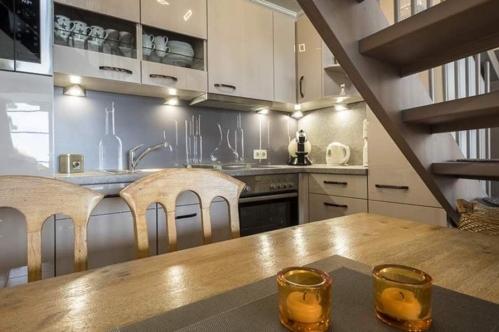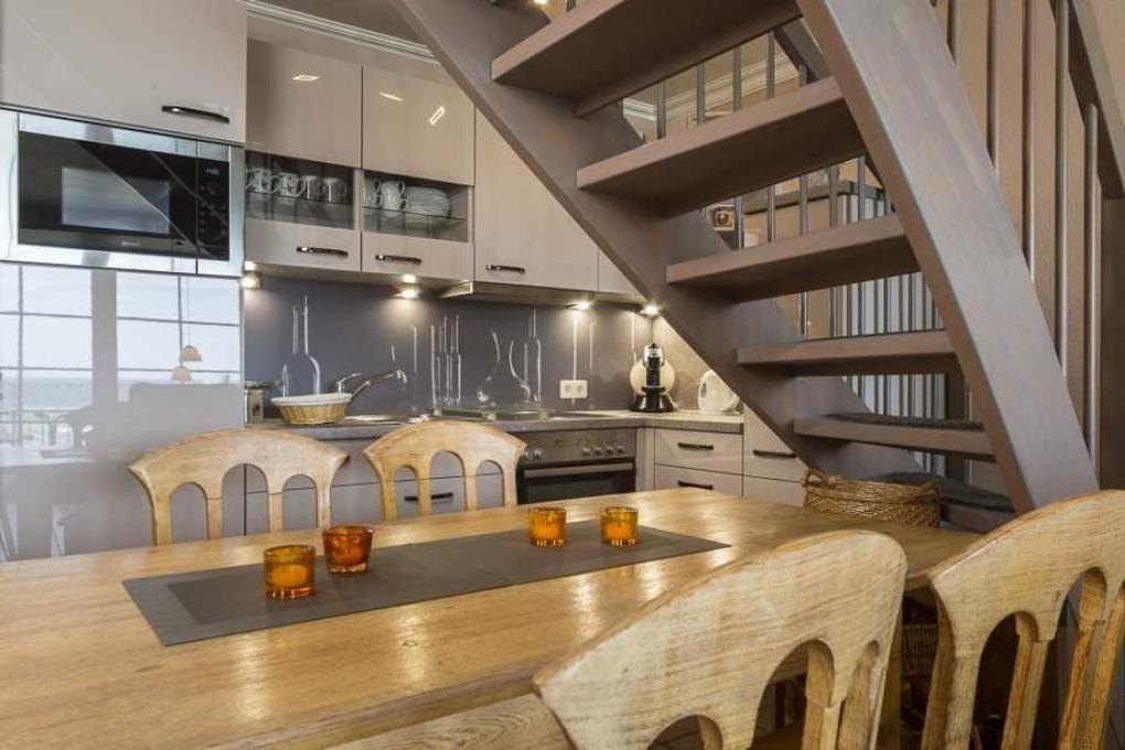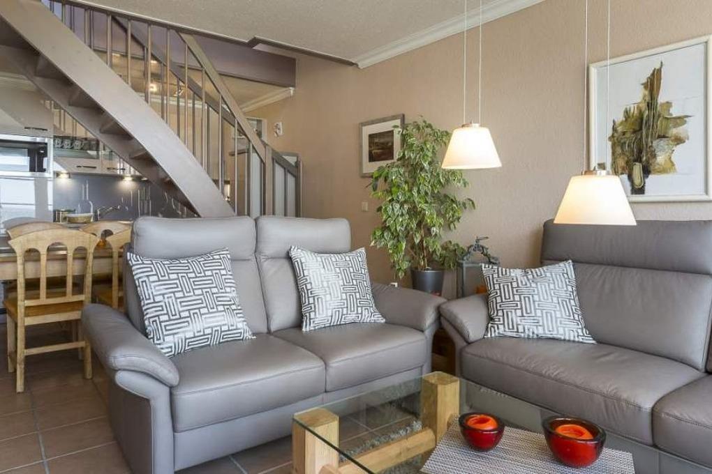 Im unteren Bereich erwartet Sie das erste Schlafzimmer, ausgestattet mit einem Doppelbett (1,80 x 2,00m) und einem geräumigen Kleiderschrank. Das untere Bad verfügt über eine Dusche. Der Wohn-Essbereich ist mit einem Esstisch und mit gemütlichen Sitzgelegenheiten ausgestattet. Neben einem Flachbildfernseher, einem BluRay-Player und einem CD-Player steht Ihnen selbstverständlich kostenloses WLAN zur Verfügung. Der Balkon, Richtung Osten, ist mit einem Tisch und Stühlen ausgestattet. Die helle Küche ist komplett ausgestattet. Über eine Treppe gelangen Sie in den oberen Bereich. Das Galeriezimmer ist mit einem Fernseher, einem DVD-Player und einem Sofa ausgestattet, das mit nur wenigen Handgriffen in ein bequemes Schlafsofa umzuwandeln ist. Im oberen Schlafzimmer stehen zwei Einzelbetten und ein geräumiger Schrank. Von dort aus haben Sie Zugang zur Dachterrasse Richtung Westen und können die Nachmittags- und Abendsonne genießen. Das zweite Bad verfügt über eine Badewanne.