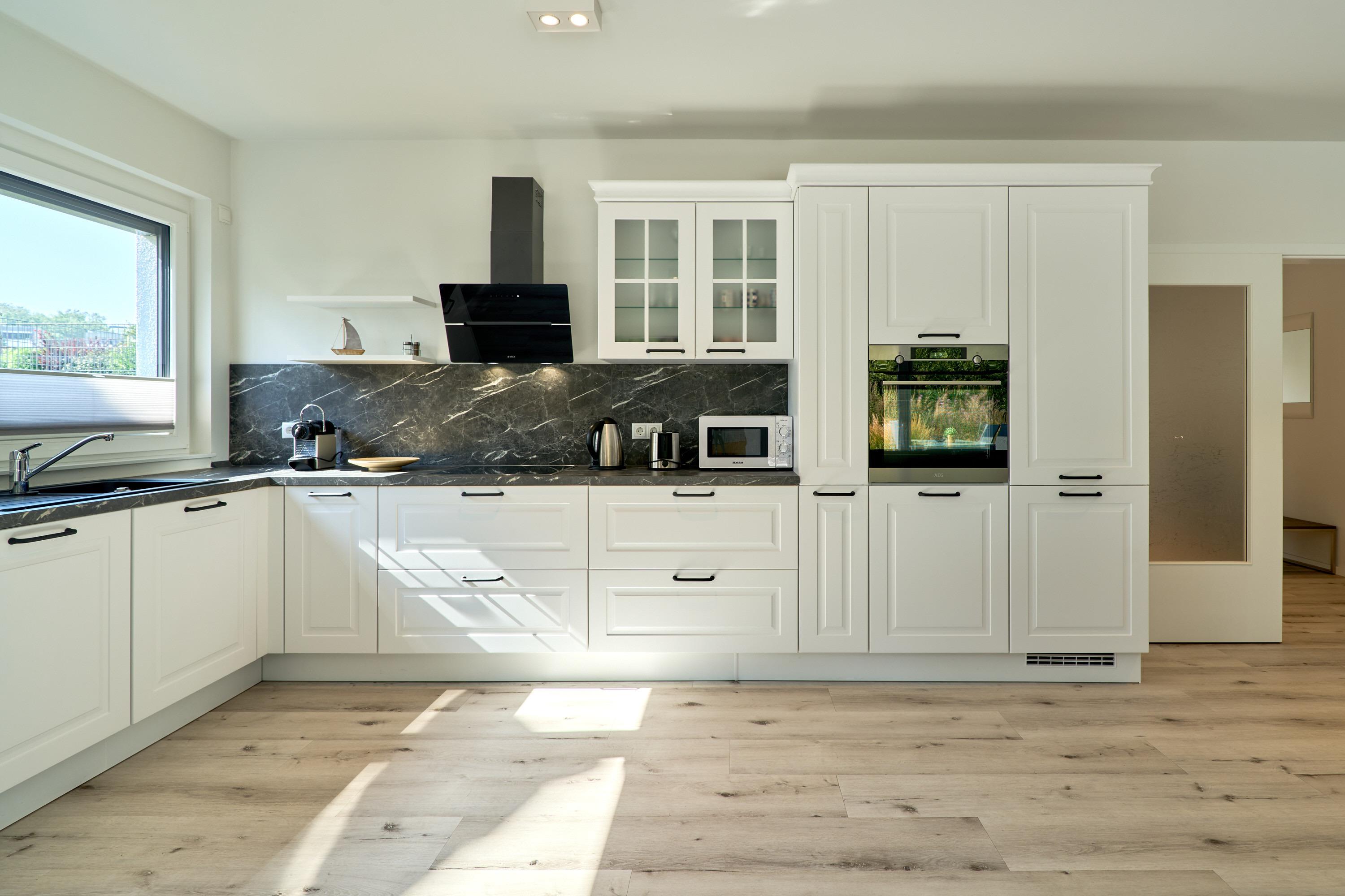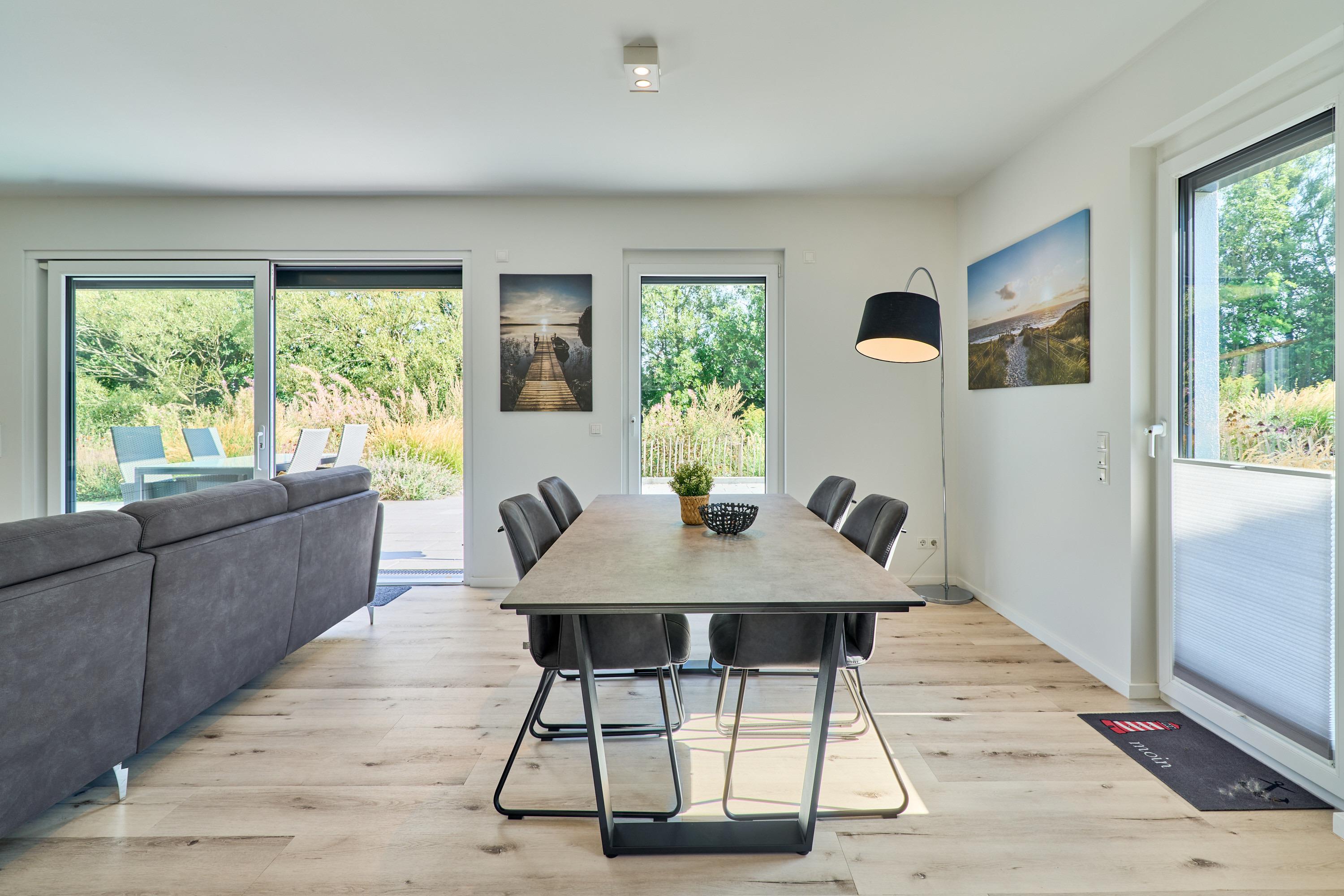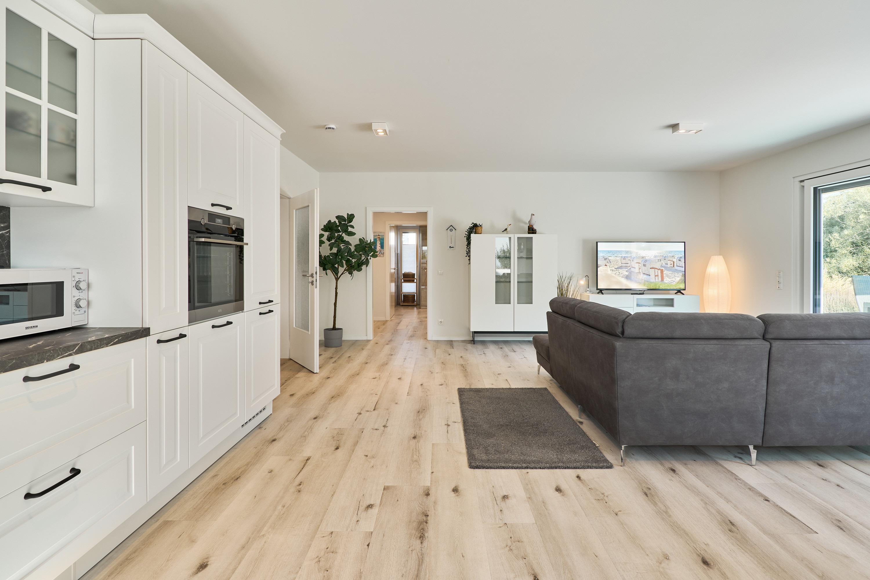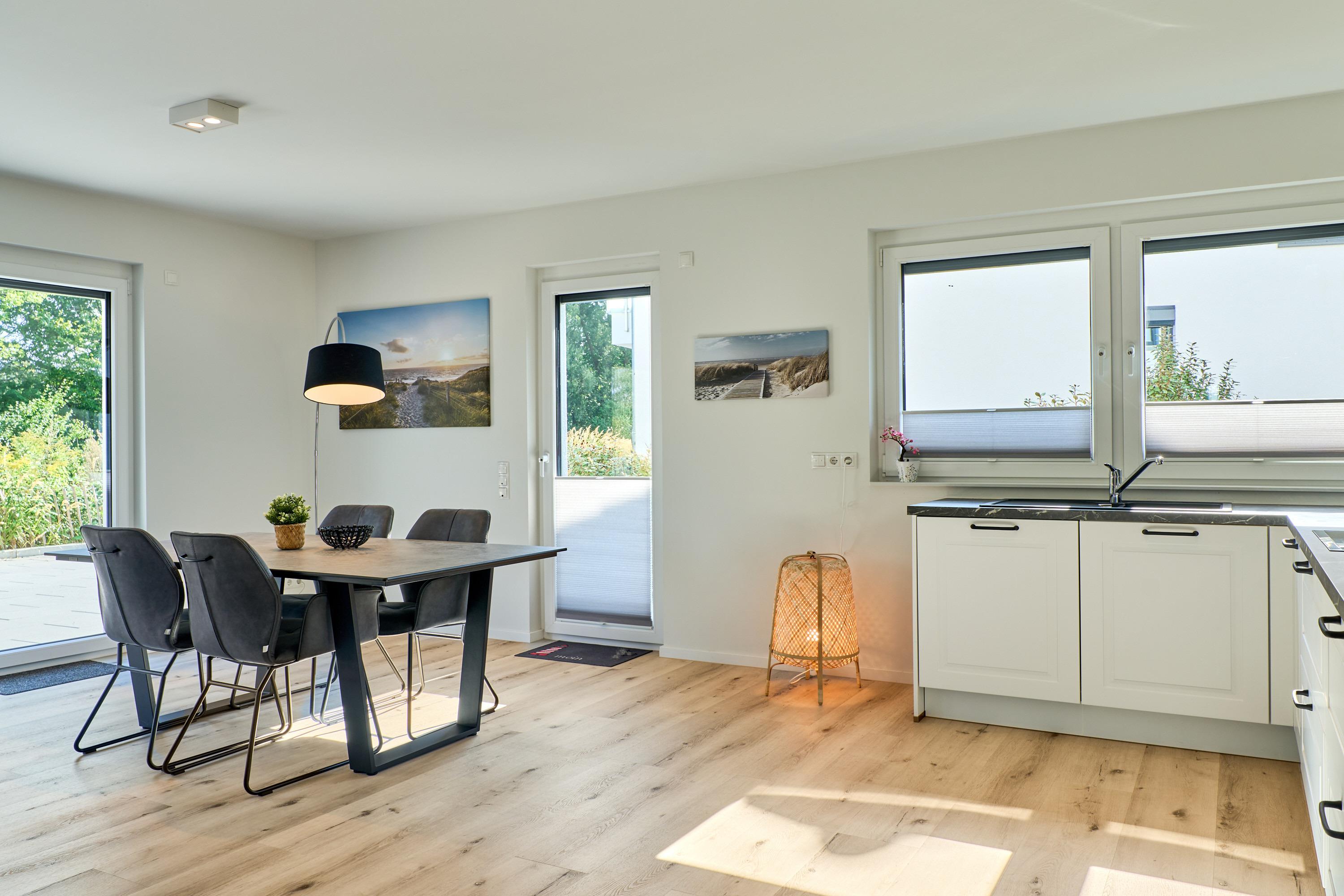Das große Wohnzimmer mit integrierter Küchenzeile, einem Esstisch ( Platz für 6 Personen ) sowie einem Wohlfühlwohnbereich. [nbsp] Rollläden