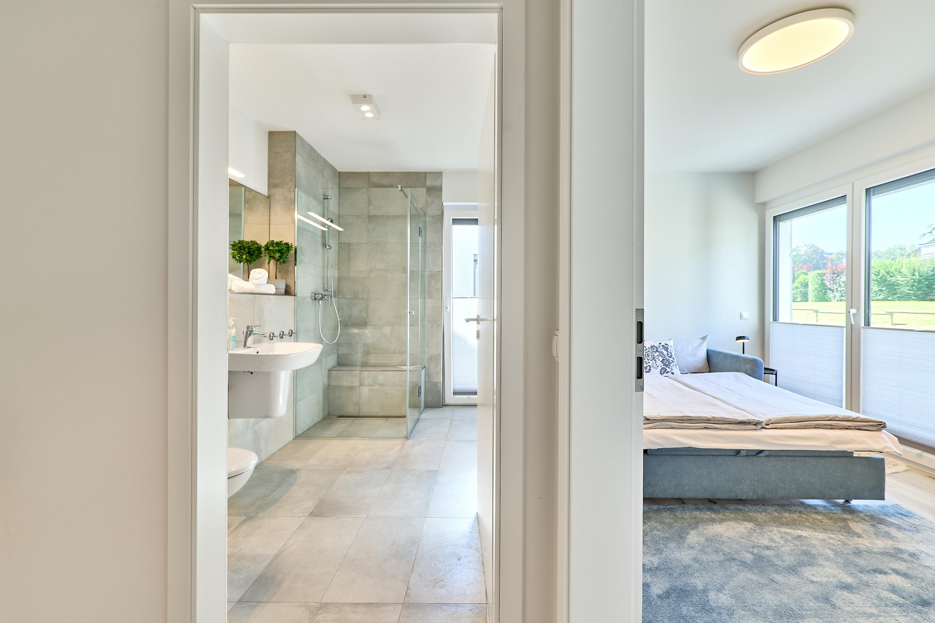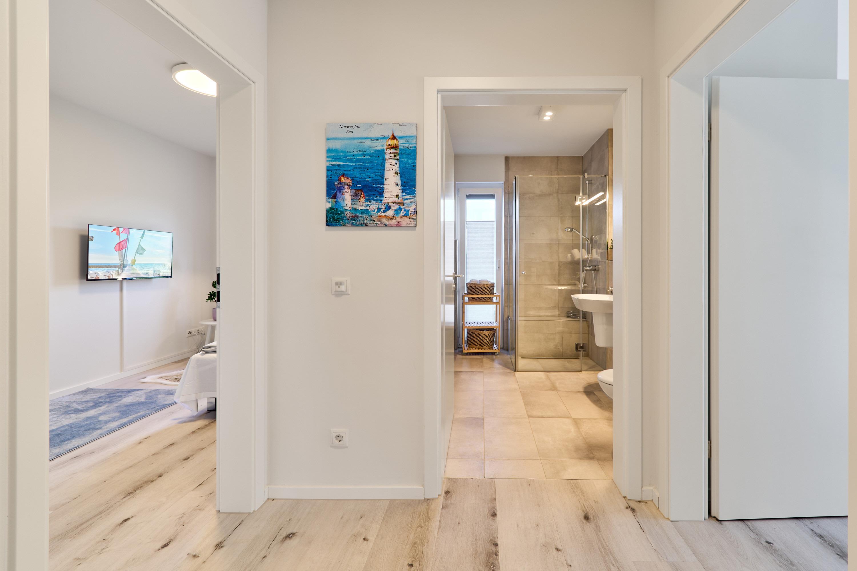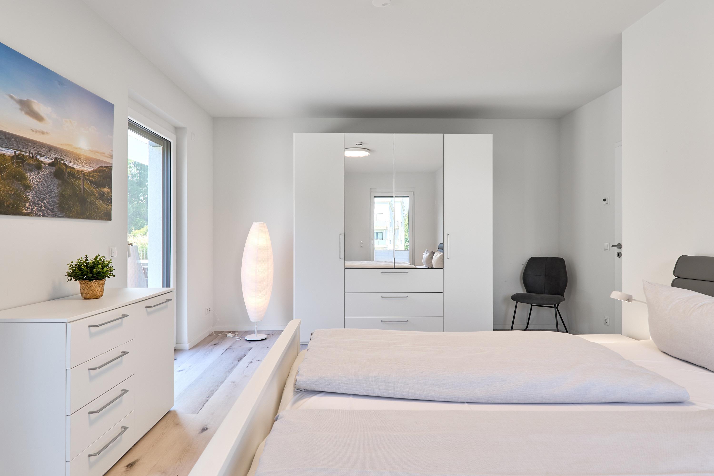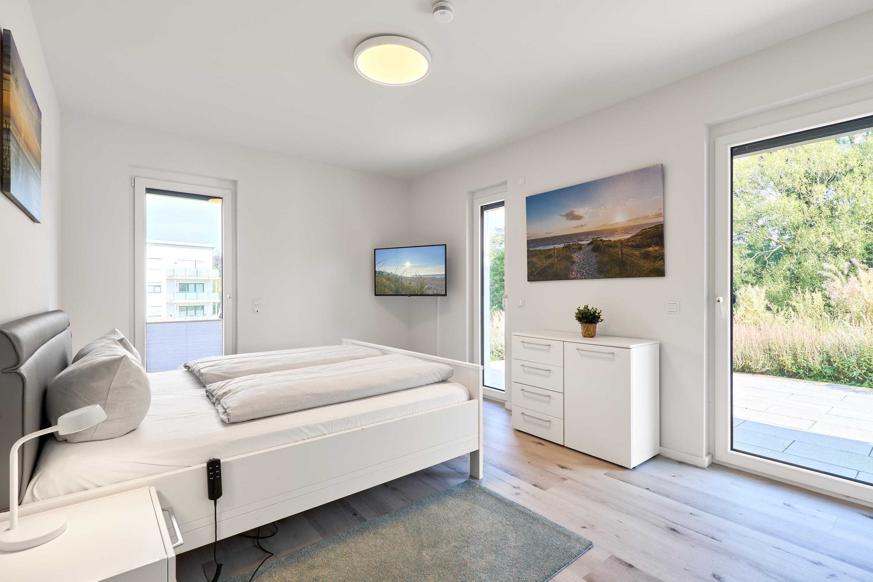 Genießen Sie Ihren Urlaub in dieser lichtdurchfluteten Ferienwohnung. Das Elternschlafzimmer ist geräumig und mit einem Doppelbett (Einzelmatratzen) mit verstellbarem Kopf- und Fußteil, zwei Nachttischen, einem Kleiderschrank und einem TV ausgestattet. Außenrollläden. 2 Tageslichtbäder mit bodengleicher Dusche.