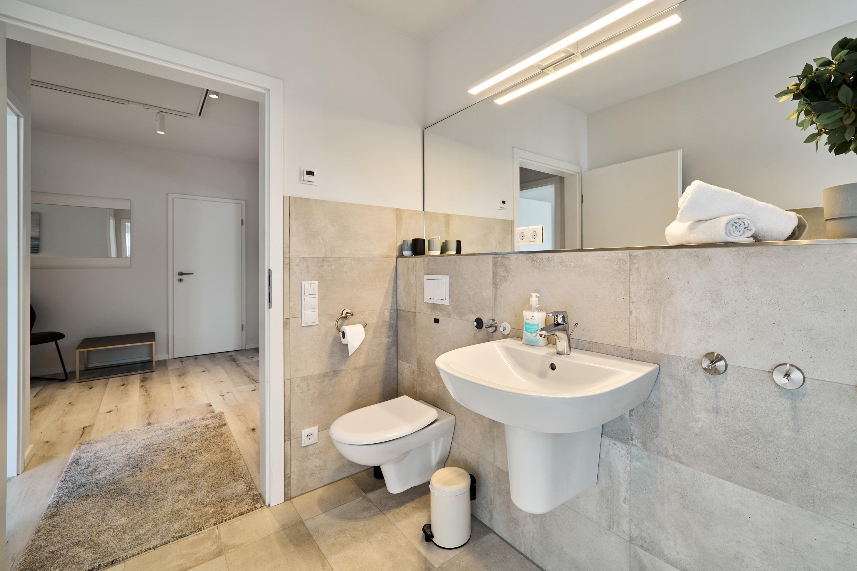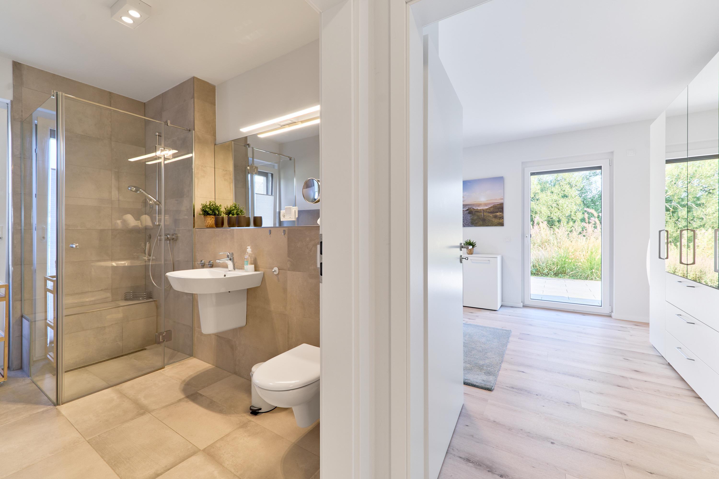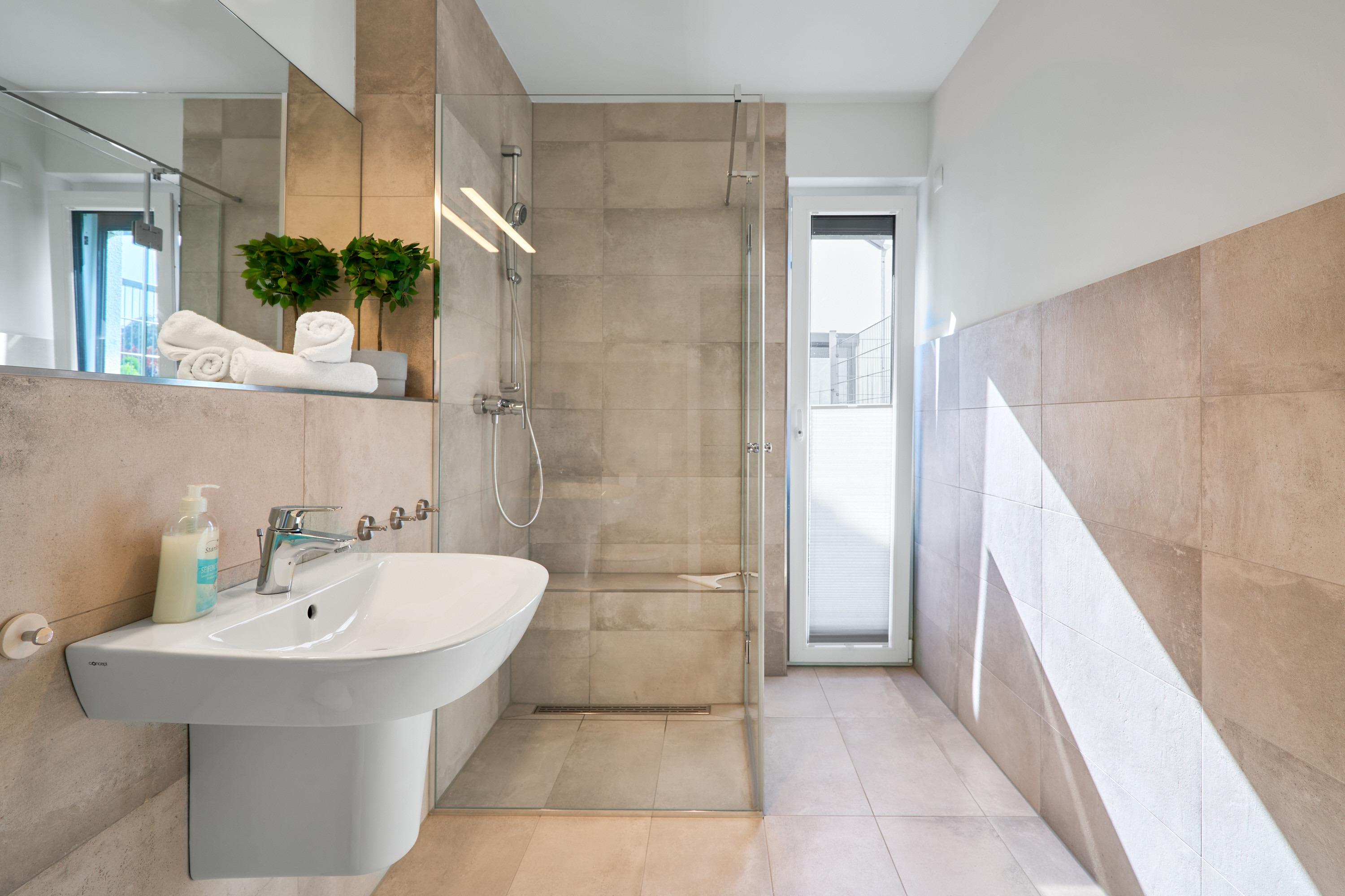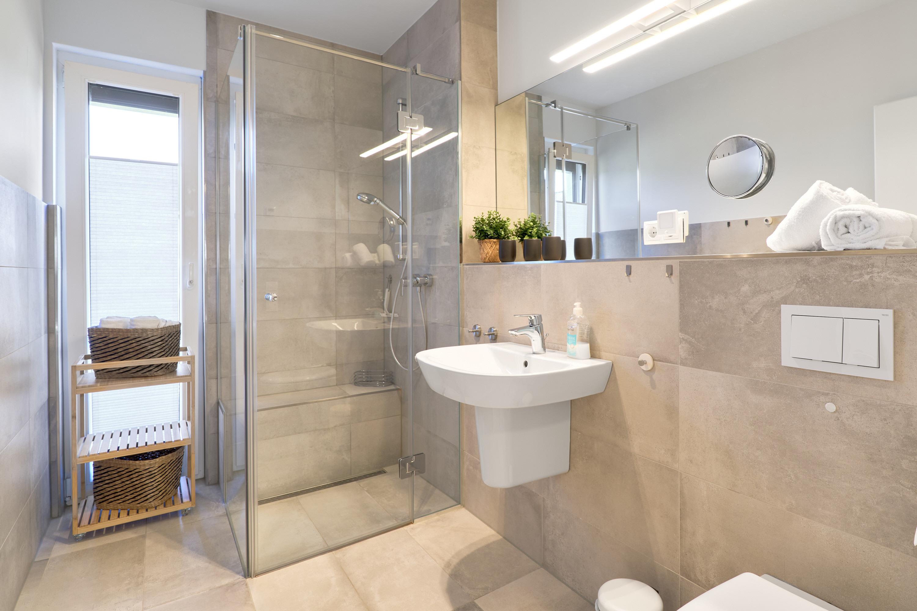 Genießen Sie Ihren Urlaub in dieser lichtdurchfluteten Ferienwohnung. Das Elternschlafzimmer ist geräumig und mit einem Doppelbett (Einzelmatratzen) mit verstellbarem Kopf- und Fußteil, zwei Nachttischen, einem Kleiderschrank und einem TV ausgestattet. Außenrollläden. 2 Tageslichtbäder mit bodengleicher Dusche.