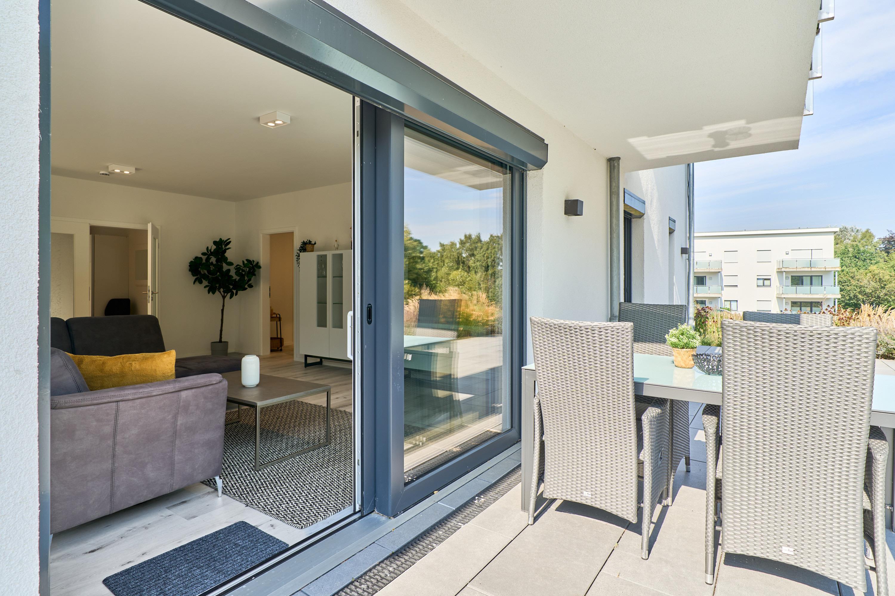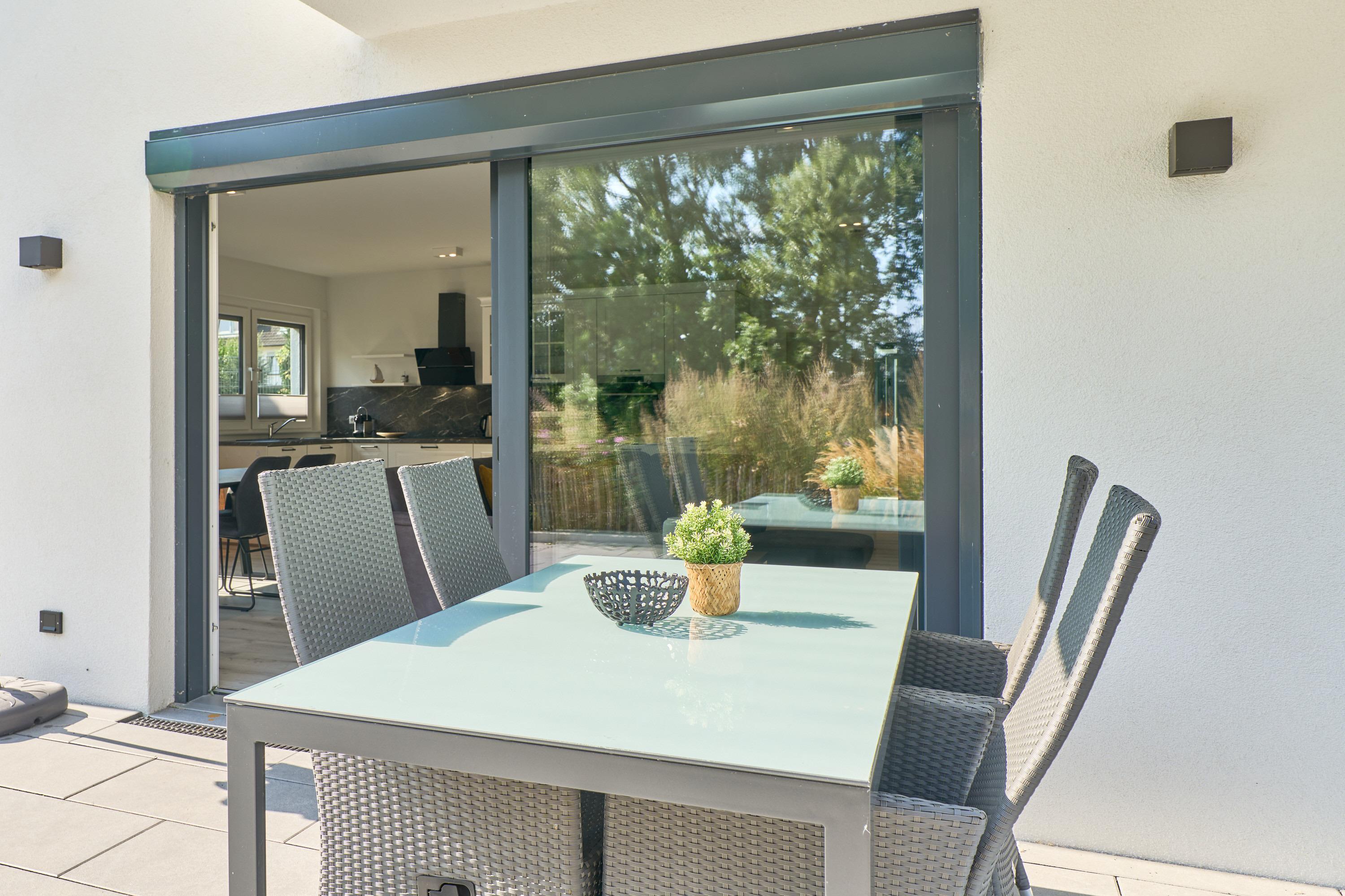 Auf der eingezäunten, großen Terrasse stehen Ihnen Tisch und Stühle zur Verfügung, Blick ins Grüne.