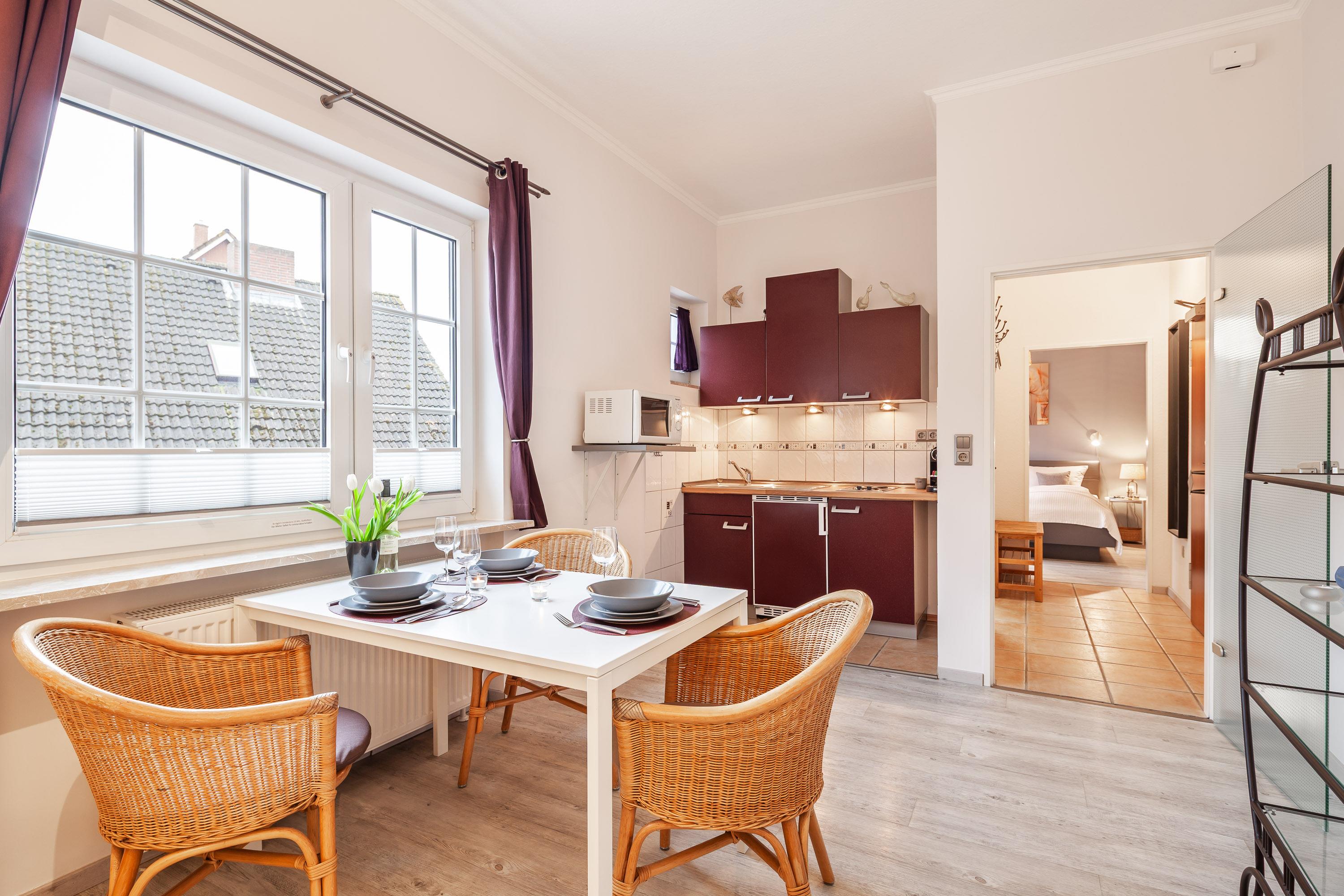 Das "Appartement 03" im Gästehaus Daheim ist eine 37 m² große sonnige Ferienwohnung, die Platz für maximal 3 Personen (zzgl. max. 1 Babybett) bietet. Sie befindet sich im Hochparterre und ist daher besonders für Gäste geeignet, die nur wenige Treppen steigen möchten. Die Wohnung verfügt über ein Schlafzimmer und ein Wohnzimmer. Ein Parkplatz steht direkt am Haus kostenfrei zur Verfügung.