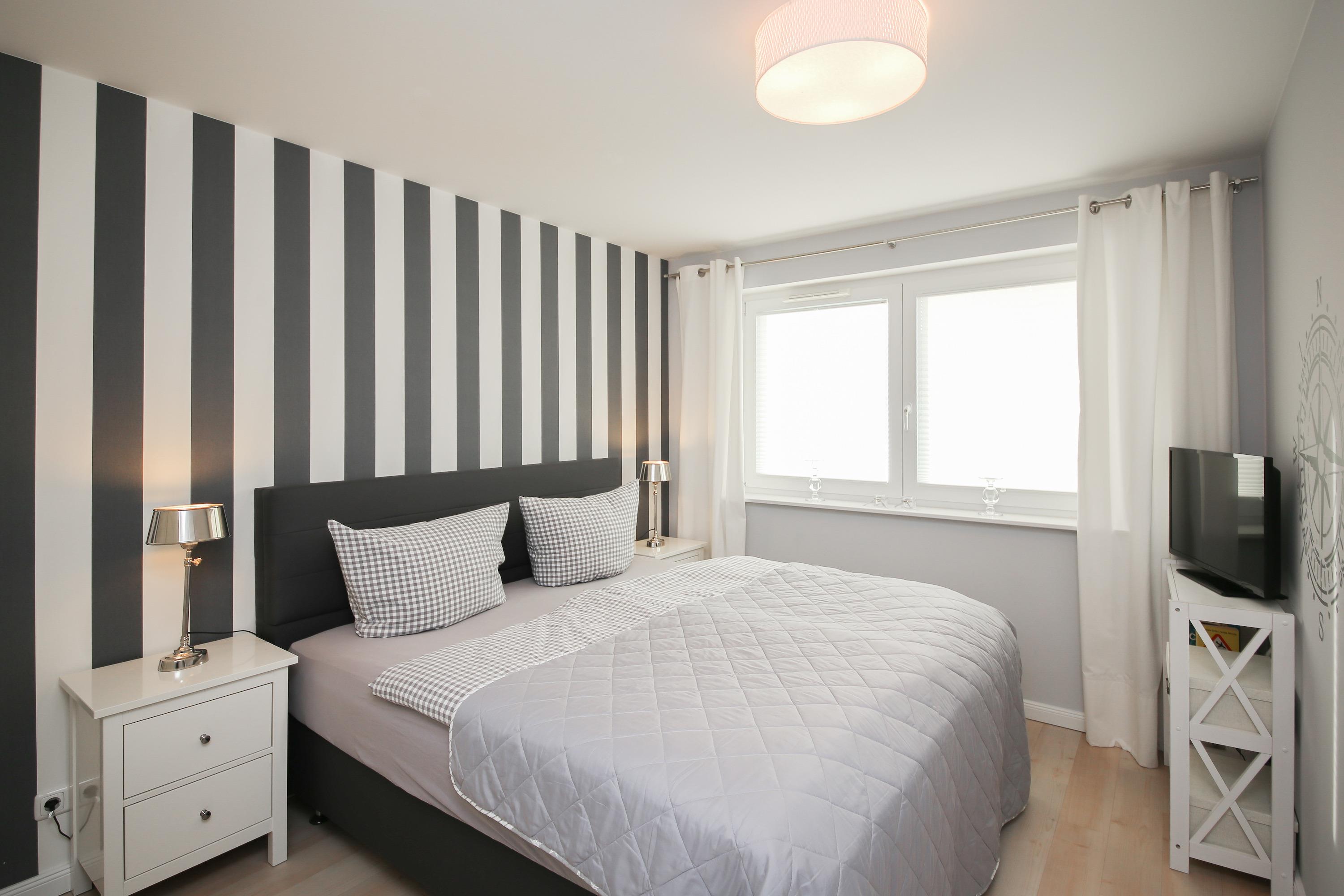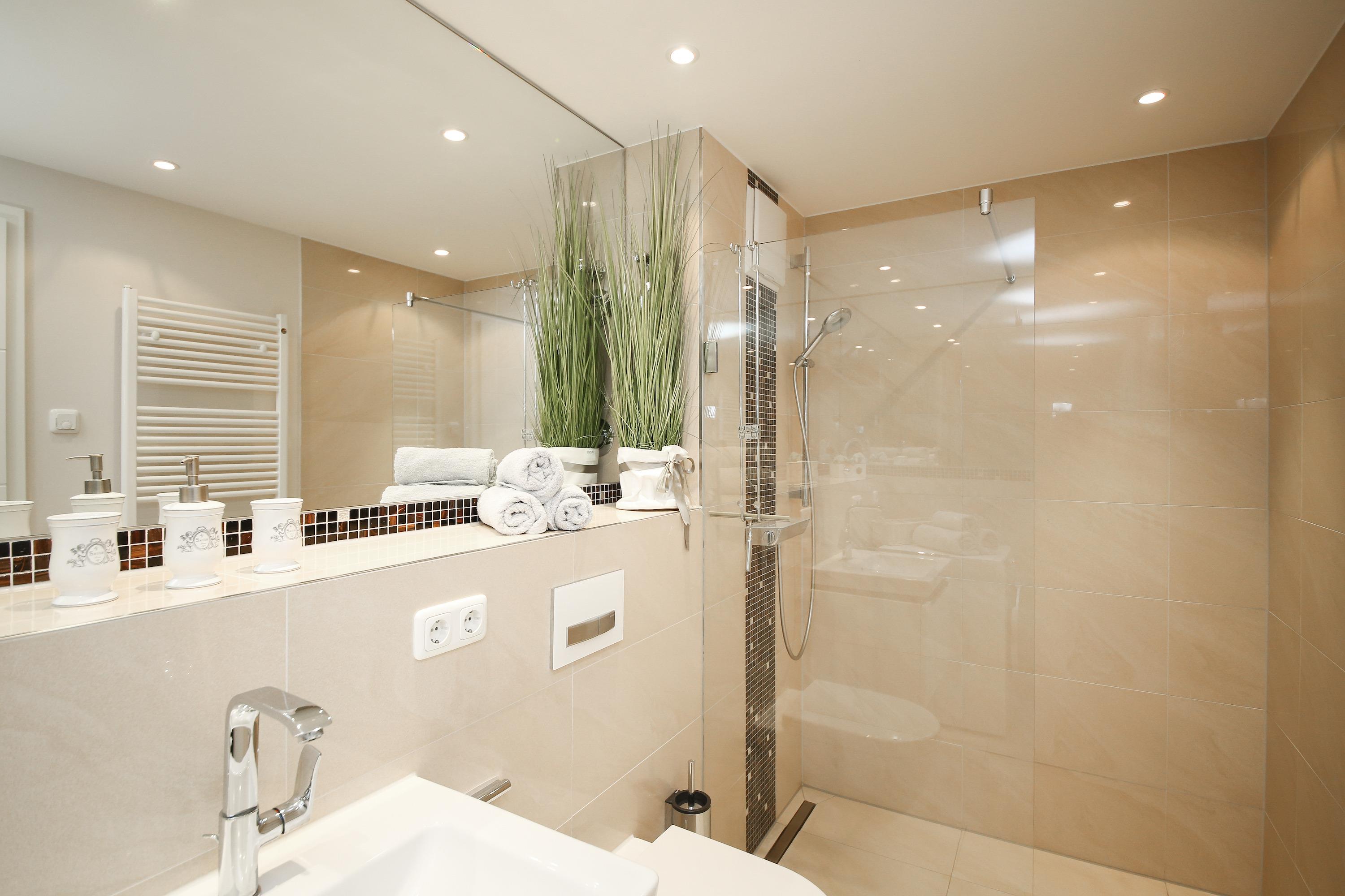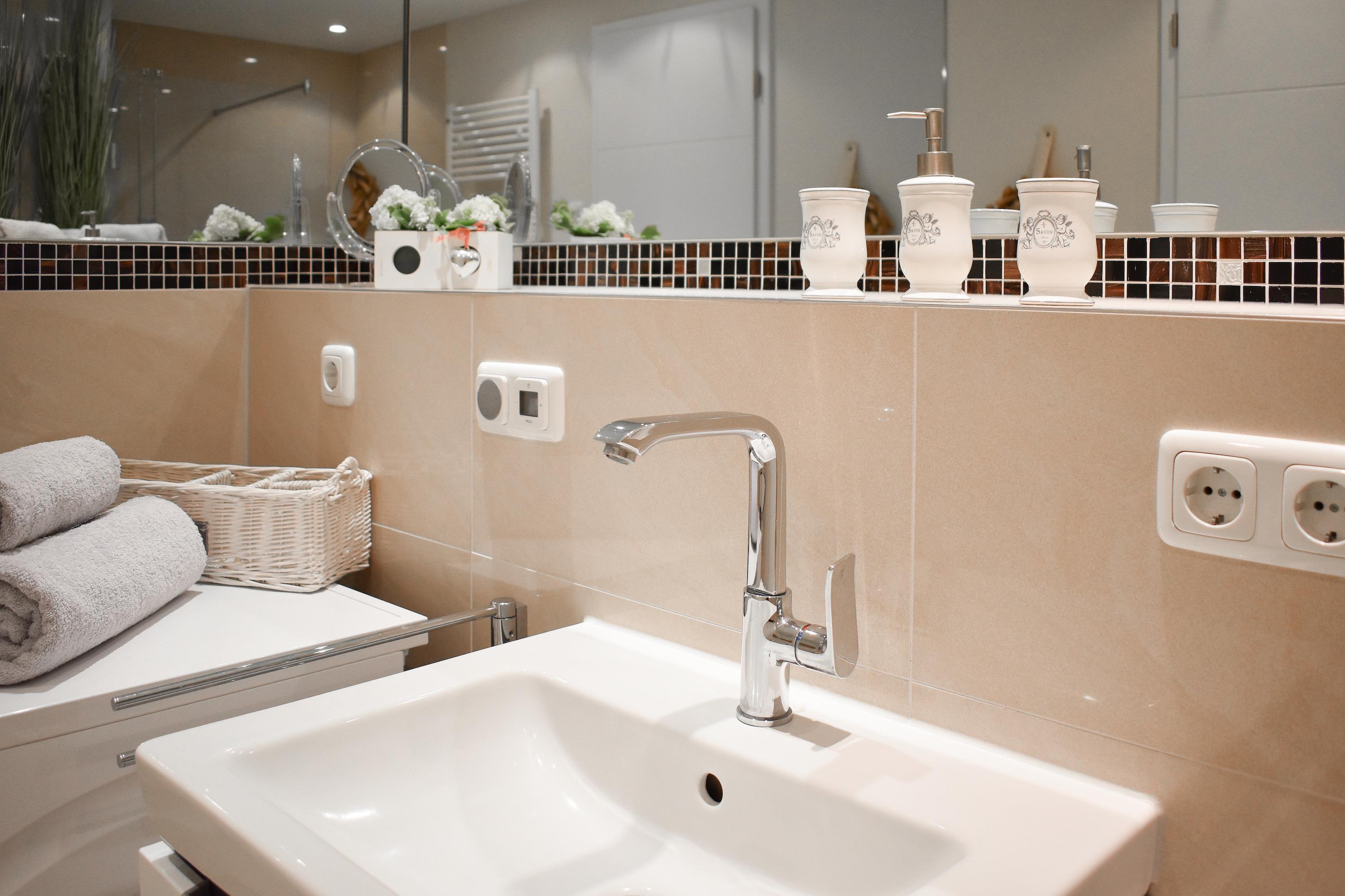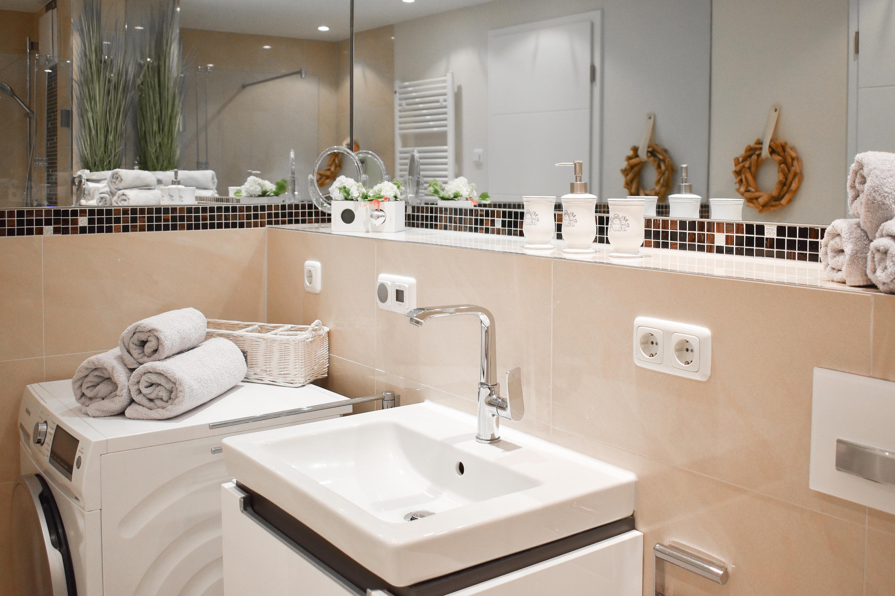 Es gibt 1 Schlafzimmer, ausgestattet mit einem Boxspringbett (180x200), Flat TV sowie elektrischen Außenjalousien zum Verdunkeln. Für eine 3. Person kann im Wohnbereich ein Zustellbett (max. 80 kg) zur Verfügung gestellt werden. Das innenliegende hochwertige Bad verfügt über eine große, ebenerdige Dusche, WC, Waschtrockner und Fußbodenheizung und ein Radio. WLAN steht selbstverständlich kostenlos zur Verfügung.