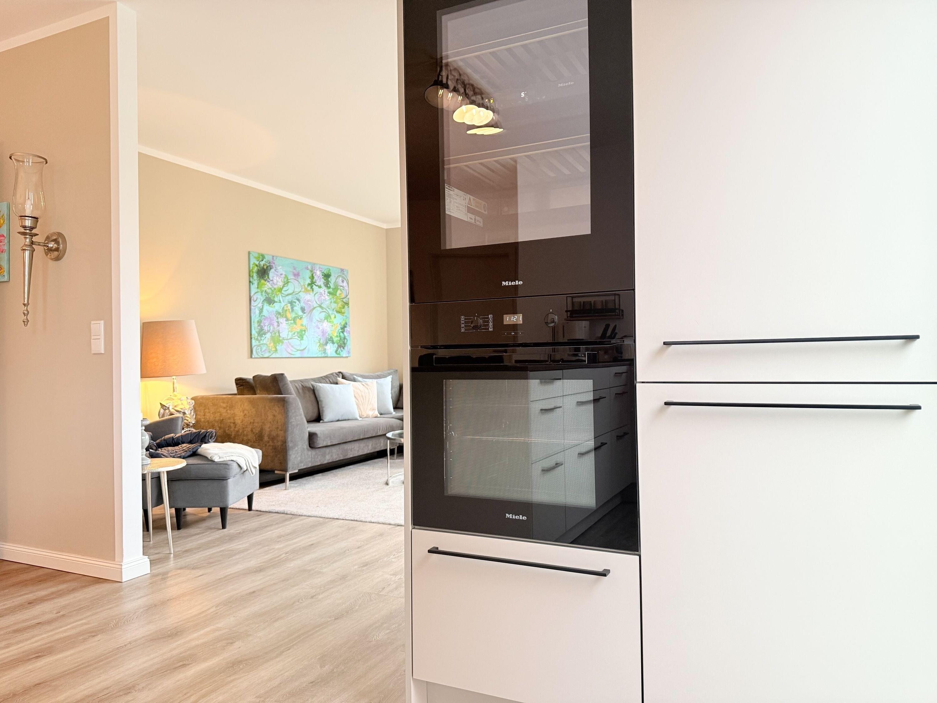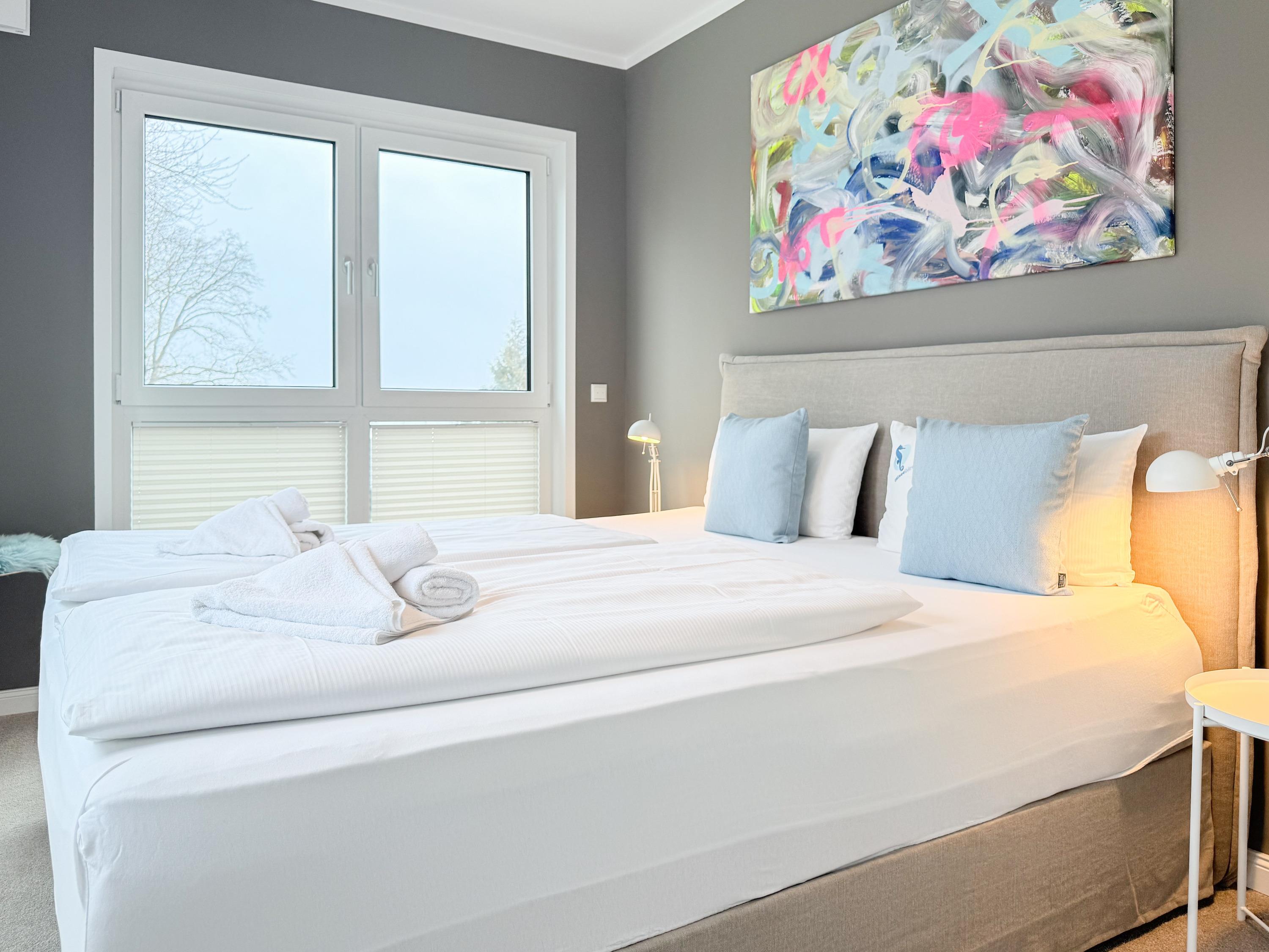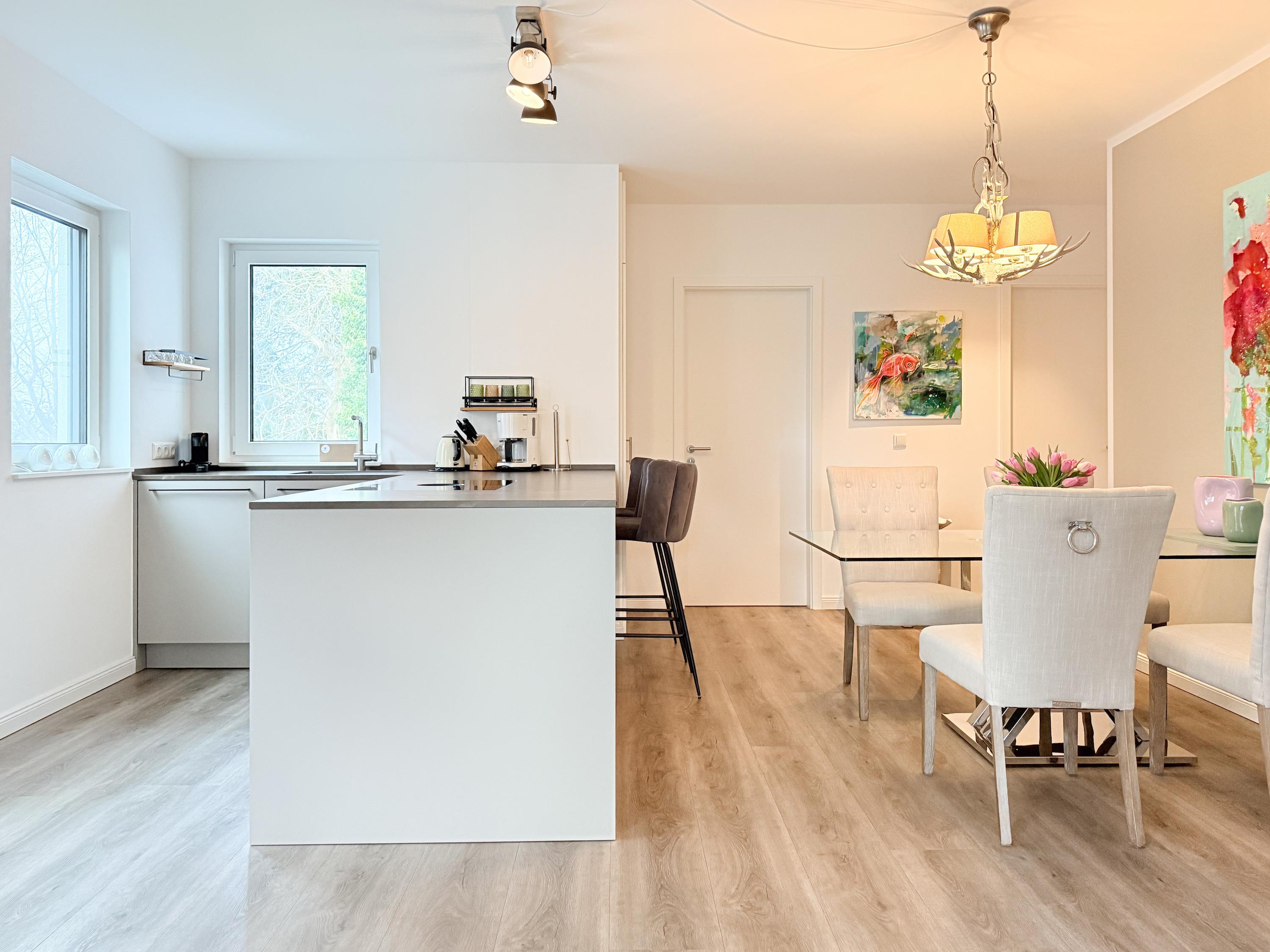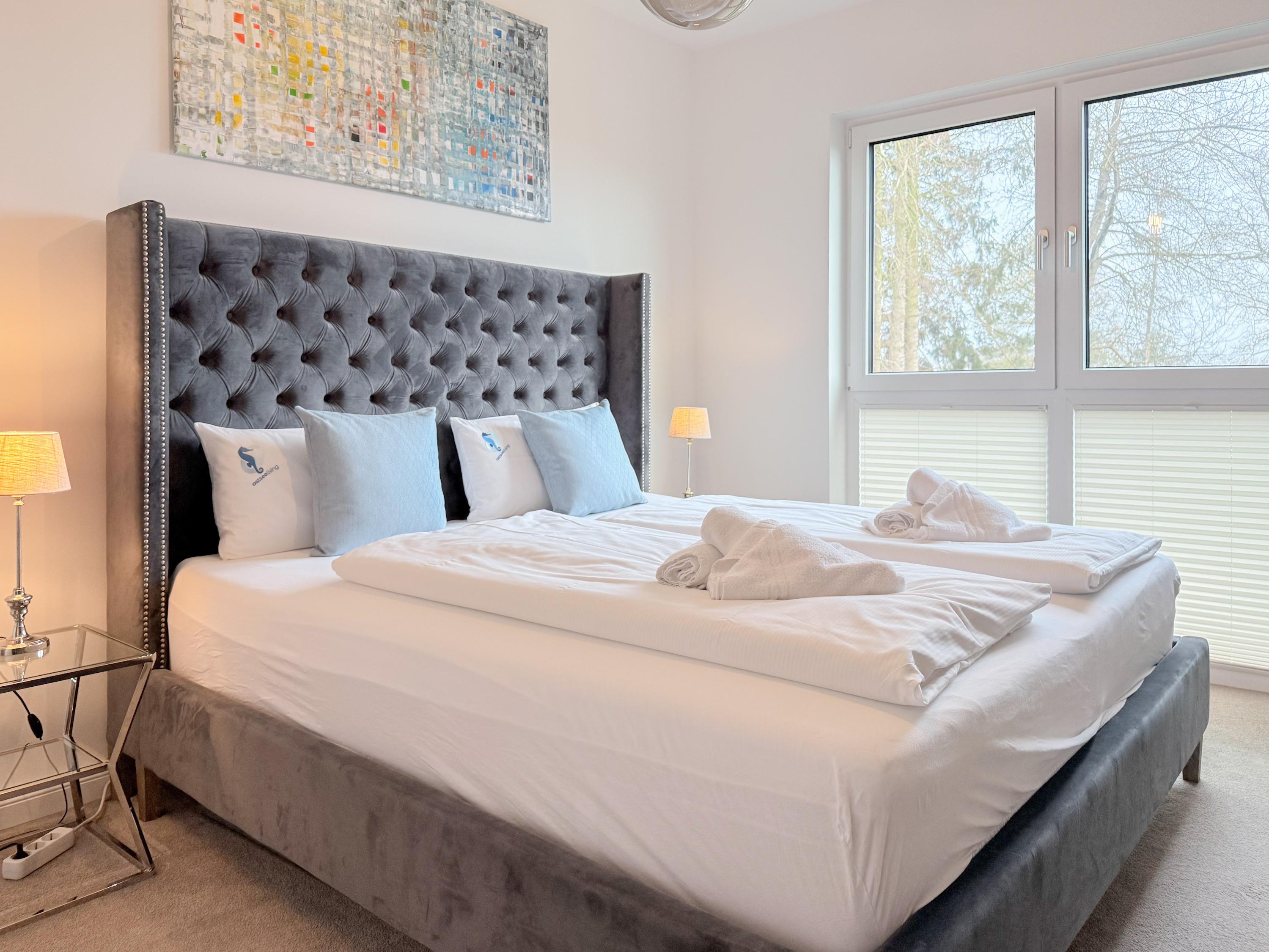 Es erwartet Sie eine äußerst hochwertig ausgestattete und geschmackvoll eingerichtete Ferienwohnung, die mit 2 separaten Schlafzimmern ausreichend Raum für 4 Personen bietet, um einen entspannten Urlaub in einem herrlichen Ambiente zu verleben. Fußbodenheizung, elektrische Außenjalousien und bodentiefe Fensterelemente, die für ein offenes Raumgefühl sorgen, gewährleisten einen hohen Wohnstandard. Mittelpunkt der Ferienwohnung bildet die Siematic Design Küche mit Kochinsel in bester Ausstattung, die zum gemeinsamen Kochen einlädt und der anschließende Essbereich im Hampton Style. Der behagliche Wohnbereich, eingerichtet mit Sofa und TV, bietet Blick und Zugang auf die großzügig angelegte Westterrasse mit Gartenmöbeln und Sonnenliegen, um den Tag bei einem Glas Wein mit Ostseeblick ausklingen zu lassen. Beide Schlafzimmer bieten einen herrlichen Ausblick bis auf bis auf das Meer und sind mit hochwertigem Teppichboden,[nbsp] Doppelbetten (180x200) und einem Kleiderschrank ausgestattet. In einem der Schlafräume befindet sich ein zusätzlicher Fernseher.[nbsp] Im Flur des Eingangsbereichs steht ein weiterer Einbauschrank für Jacken und Mäntel zur Verfügung. Das Bad ist sehr hochwertig und modern, ausgestattet mit einer XXL Walk In Dusche. Waschmaschine und Trockner befinden sich in einem Einbauschrank. WLAN steht selbstverständlich zur kostenlosen Nutzung zur Verfügung. Fahrräder können auf der Terrasse der Wohnung abgestellt werden.