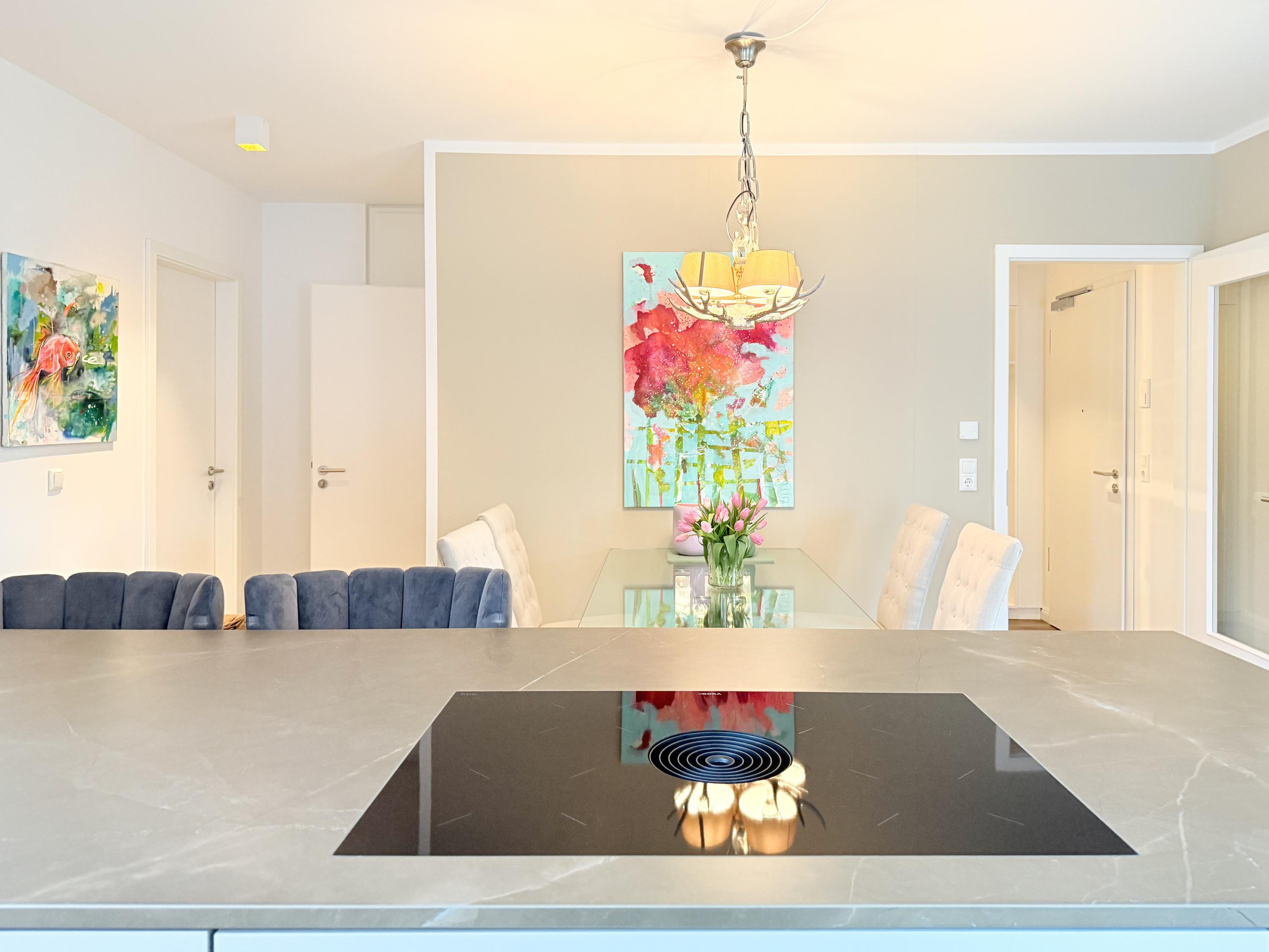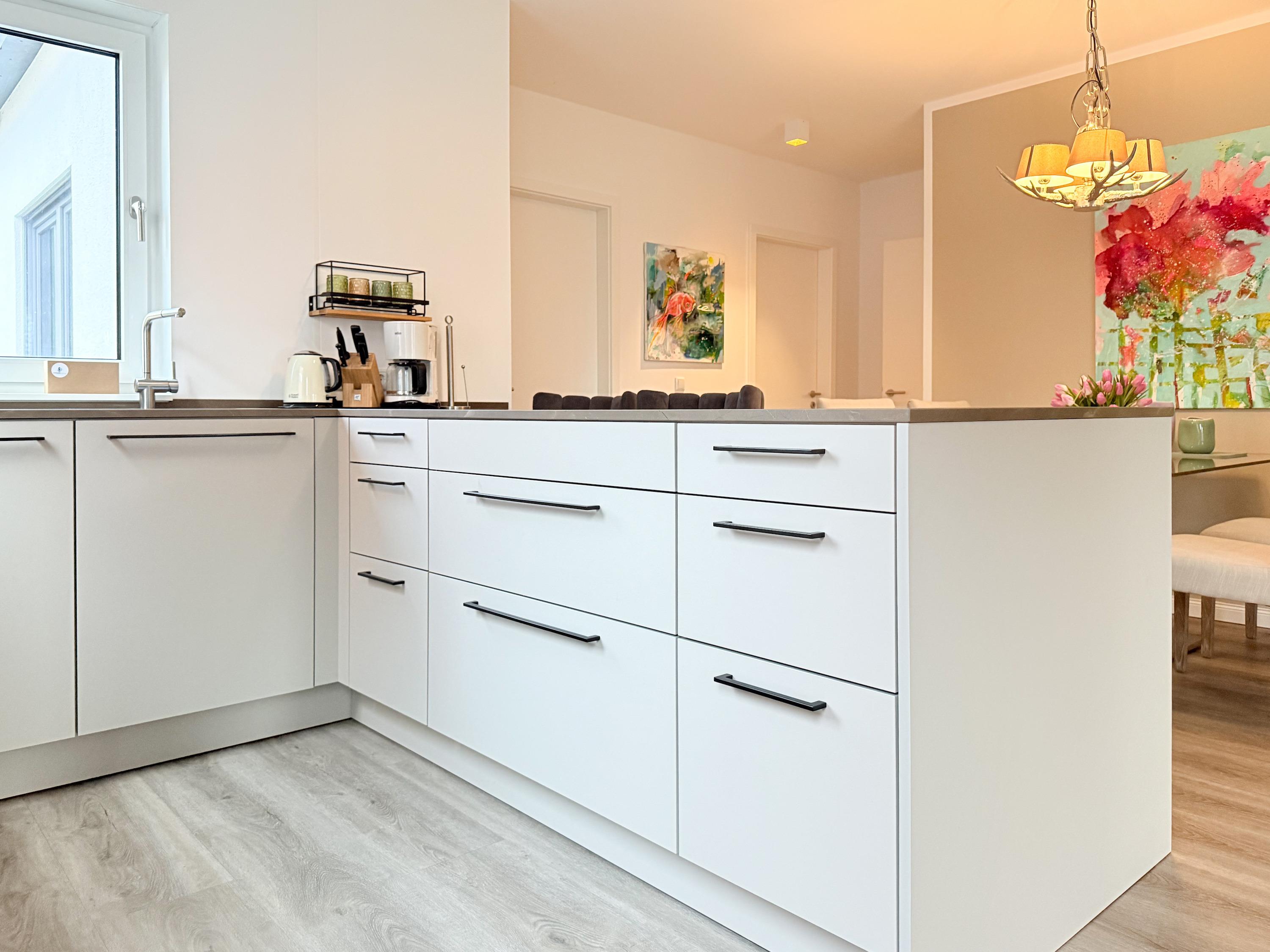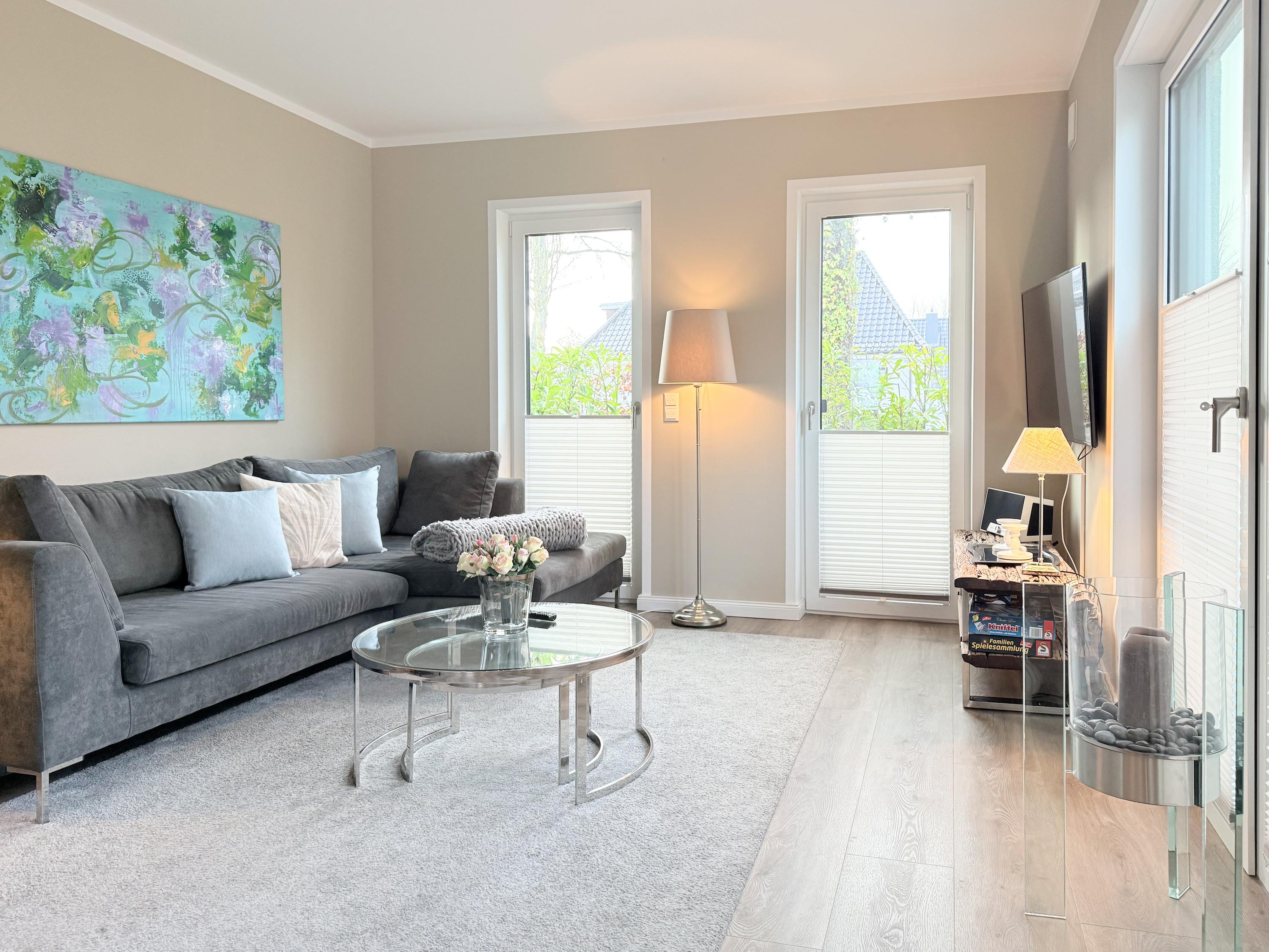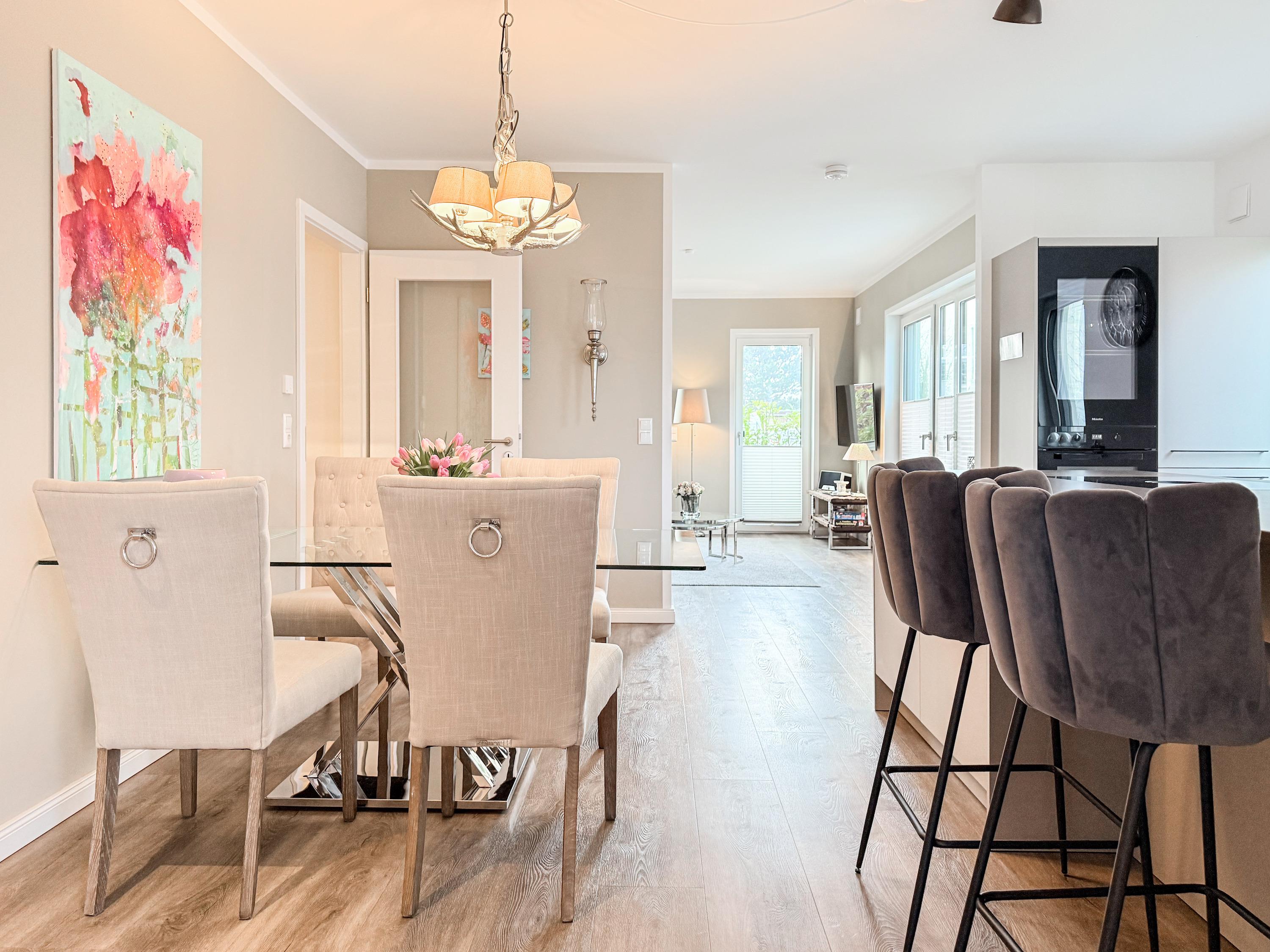 Es erwartet Sie eine äußerst hochwertig ausgestattete und geschmackvoll eingerichtete Ferienwohnung, die mit 2 separaten Schlafzimmern ausreichend Raum für 4 Personen bietet, um einen entspannten Urlaub in einem herrlichen Ambiente zu verleben. Fußbodenheizung, elektrische Außenjalousien und bodentiefe Fensterelemente, die für ein offenes Raumgefühl sorgen, gewährleisten einen hohen Wohnstandard. Mittelpunkt der Ferienwohnung bildet die Siematic Design Küche mit Kochinsel in bester Ausstattung, die zum gemeinsamen Kochen einlädt und der anschließende Essbereich im Hampton Style. Der behagliche Wohnbereich, eingerichtet mit Sofa und TV, bietet Blick und Zugang auf die großzügig angelegte Westterrasse mit Gartenmöbeln und Sonnenliegen, um den Tag bei einem Glas Wein mit Ostseeblick ausklingen zu lassen. Beide Schlafzimmer bieten einen herrlichen Ausblick bis auf bis auf das Meer und sind mit hochwertigem Teppichboden,[nbsp] Doppelbetten (180x200) und einem Kleiderschrank ausgestattet. In einem der Schlafräume befindet sich ein zusätzlicher Fernseher.[nbsp] Im Flur des Eingangsbereichs steht ein weiterer Einbauschrank für Jacken und Mäntel zur Verfügung. Das Bad ist sehr hochwertig und modern, ausgestattet mit einer XXL Walk In Dusche. Waschmaschine und Trockner befinden sich in einem Einbauschrank. WLAN steht selbstverständlich zur kostenlosen Nutzung zur Verfügung. Fahrräder können auf der Terrasse der Wohnung abgestellt werden.