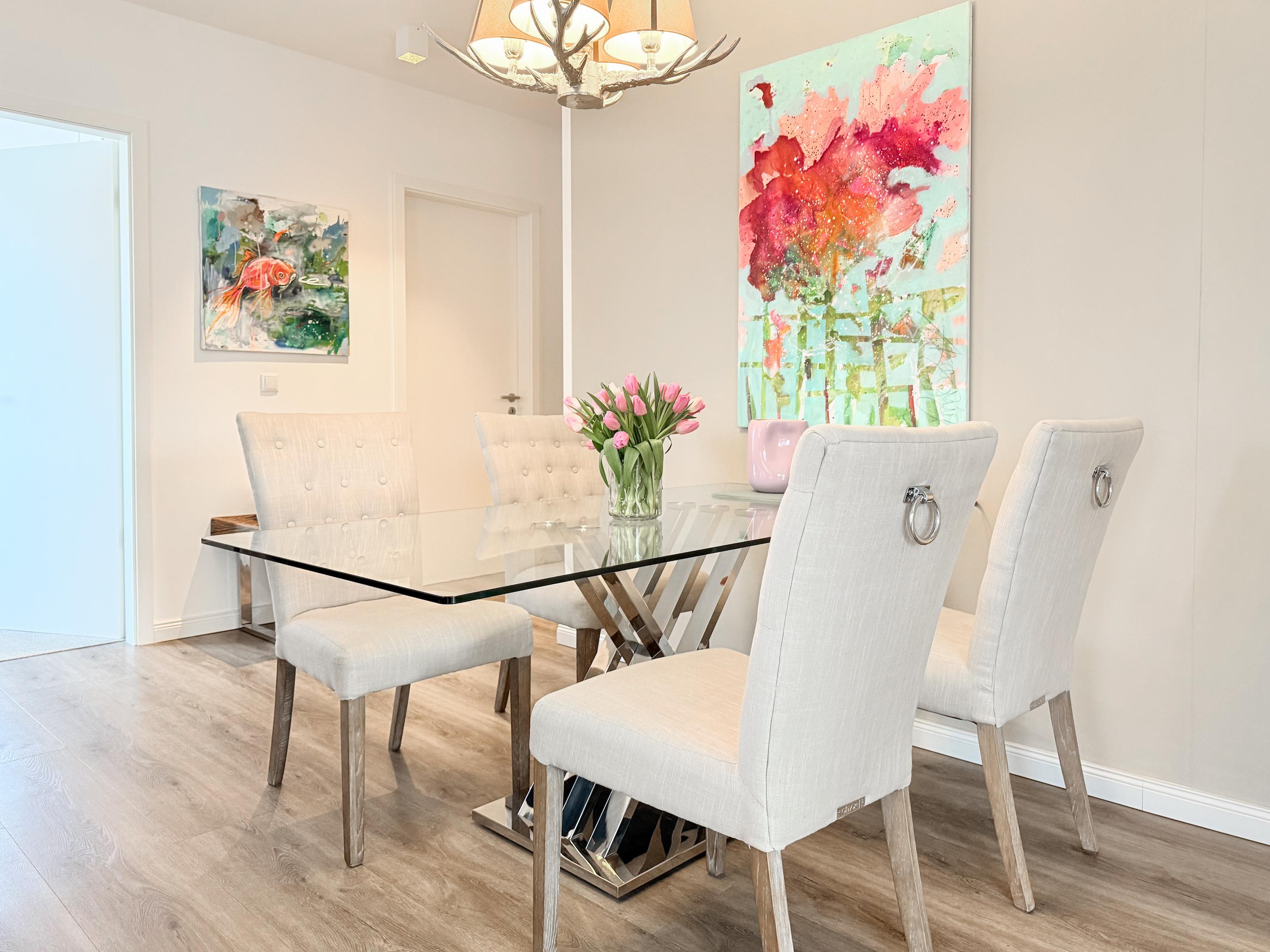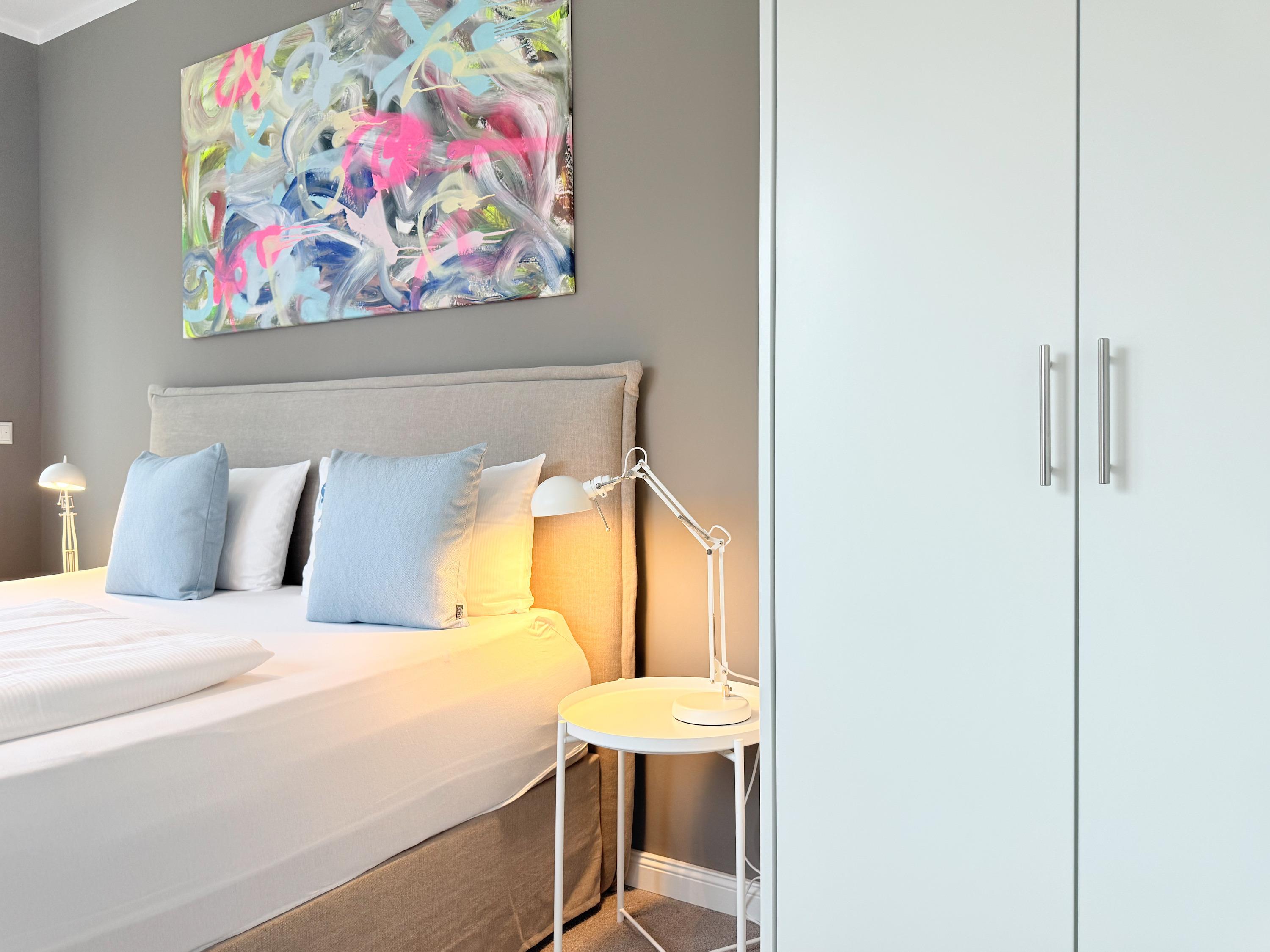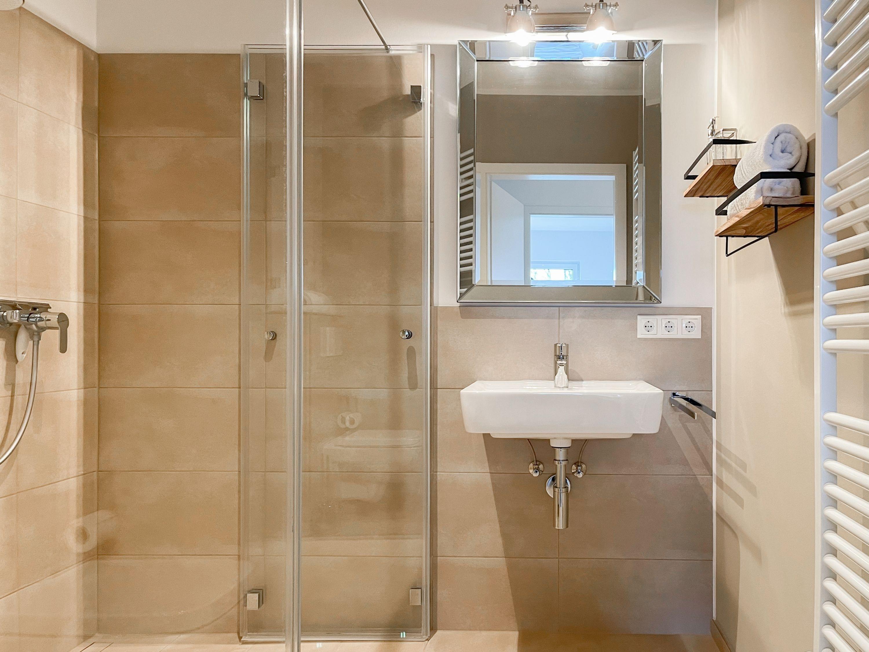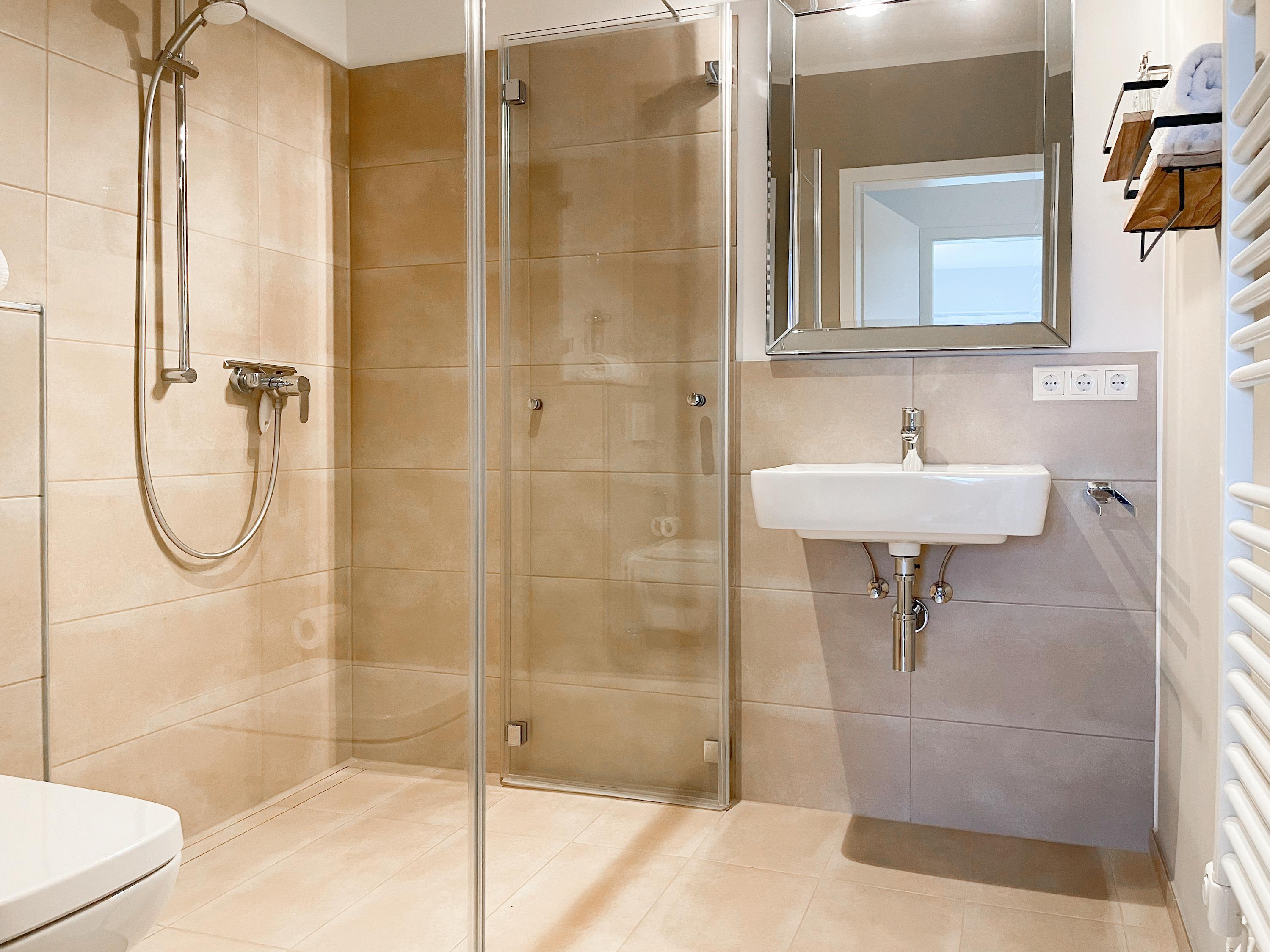 Es erwartet Sie eine äußerst hochwertig ausgestattete und geschmackvoll eingerichtete Ferienwohnung, die mit 2 separaten Schlafzimmern ausreichend Raum für 4 Personen bietet, um einen entspannten Urlaub in einem herrlichen Ambiente zu verleben. Fußbodenheizung, elektrische Außenjalousien und bodentiefe Fensterelemente, die für ein offenes Raumgefühl sorgen, gewährleisten einen hohen Wohnstandard. Mittelpunkt der Ferienwohnung bildet die Siematic Design Küche mit Kochinsel in bester Ausstattung, die zum gemeinsamen Kochen einlädt und der anschließende Essbereich im Hampton Style. Der behagliche Wohnbereich, eingerichtet mit Sofa und TV, bietet Blick und Zugang auf die großzügig angelegte Westterrasse mit Gartenmöbeln und Sonnenliegen, um den Tag bei einem Glas Wein mit Ostseeblick ausklingen zu lassen. Beide Schlafzimmer bieten einen herrlichen Ausblick bis auf bis auf das Meer und sind mit hochwertigem Teppichboden,[nbsp] Doppelbetten (180x200) und einem Kleiderschrank ausgestattet. In einem der Schlafräume befindet sich ein zusätzlicher Fernseher.[nbsp] Im Flur des Eingangsbereichs steht ein weiterer Einbauschrank für Jacken und Mäntel zur Verfügung. Das Bad ist sehr hochwertig und modern, ausgestattet mit einer XXL Walk In Dusche. Waschmaschine und Trockner befinden sich in einem Einbauschrank. WLAN steht selbstverständlich zur kostenlosen Nutzung zur Verfügung. Fahrräder können auf der Terrasse der Wohnung abgestellt werden.