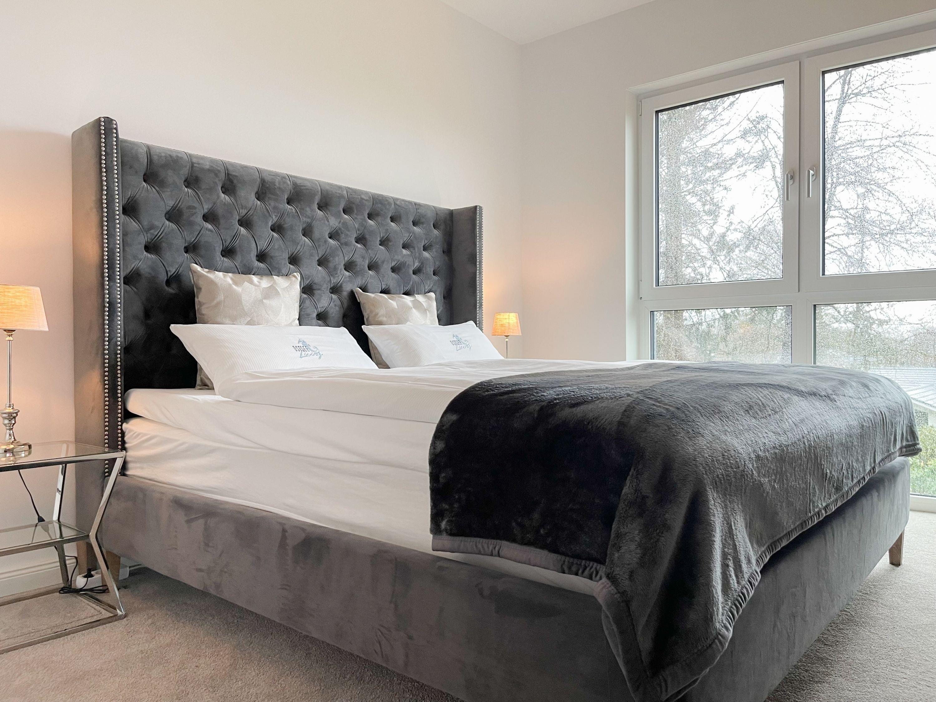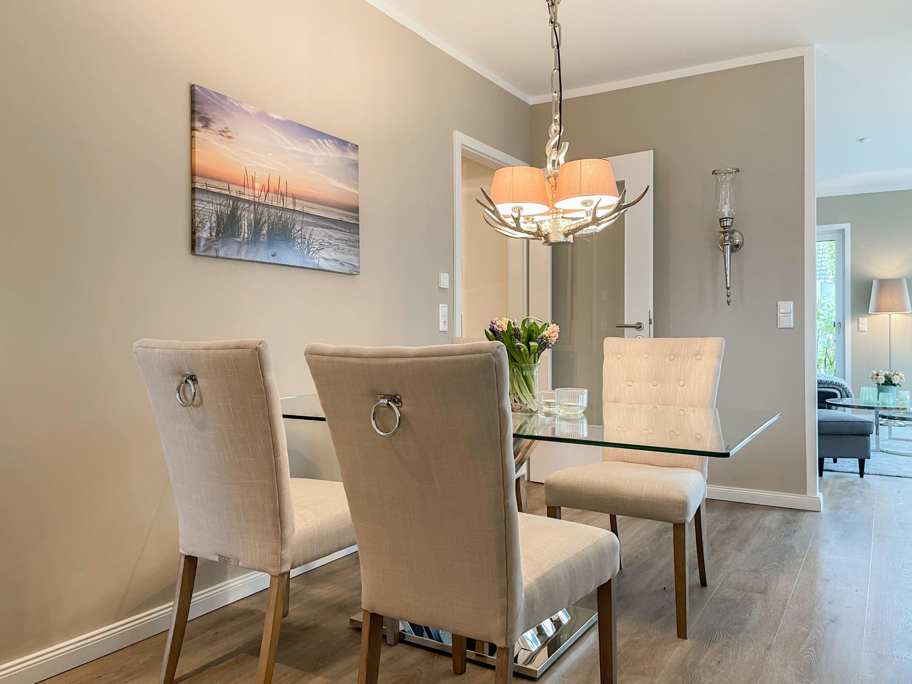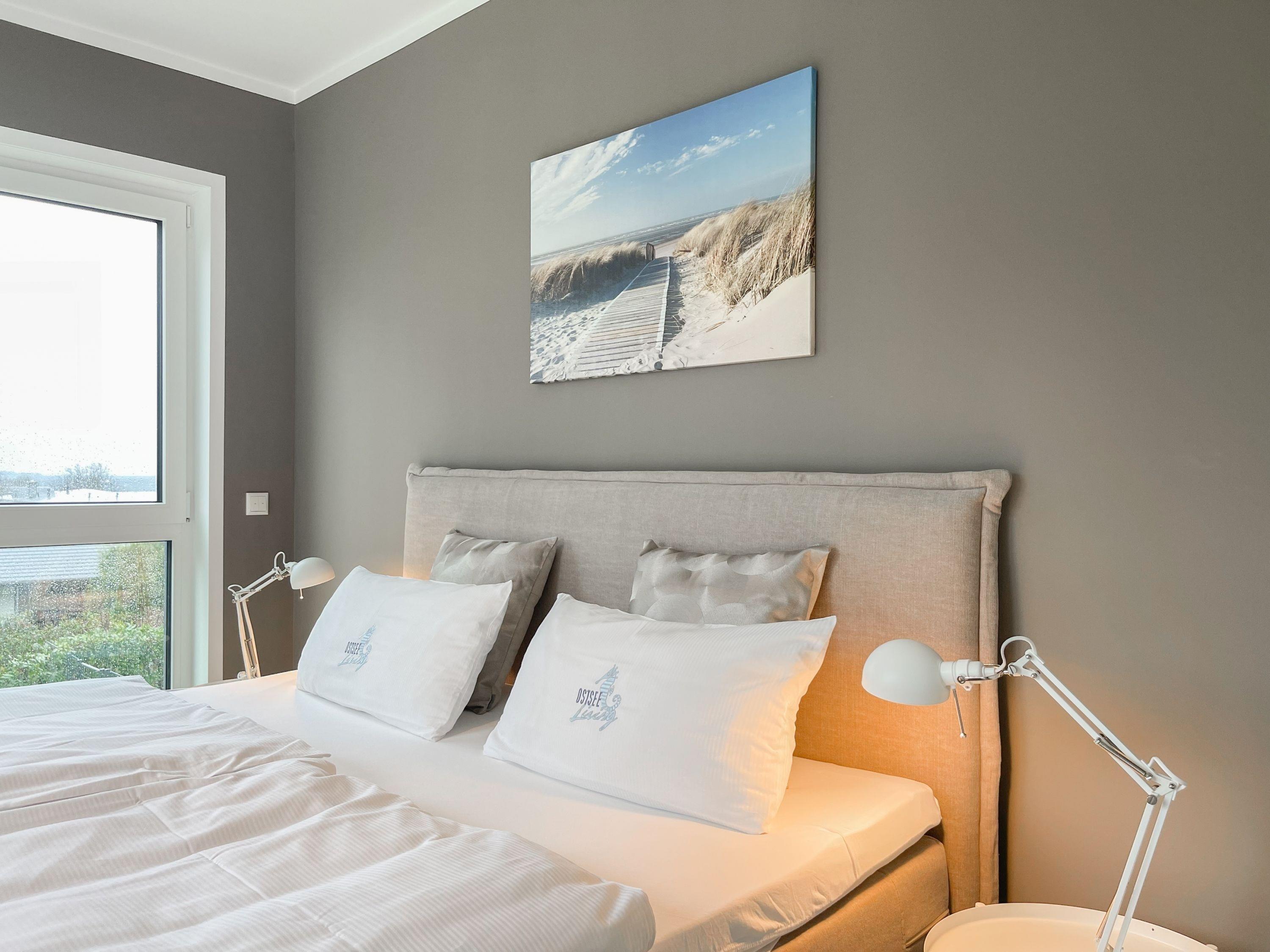 Es erwartet Sie eine äußerst hochwertig ausgestattete und geschmackvoll eingerichtete Ferienwohnung, die mit 2 separaten Schlafzimmern ausreichend Raum für 4 Personen bietet, um einen entspannten Urlaub in einem herrlichen Ambiente zu verleben. Fußbodenheizung, elektrische Außenjalousien und bodentiefe Fensterelemente, die für ein offenes Raumgefühl sorgen, gewährleisten einen hohen Wohnstandard. Mittelpunkt der Ferienwohnung bildet die Siematic Design Küche mit Kochinsel in bester Ausstattung, die zum gemeinsamen Kochen einlädt und der anschließende Essbereich im Hampton Style. Der behagliche Wohnbereich, eingerichtet mit Sofa und TV, bietet Blick und Zugang auf die großzügig angelegte Westterrasse mit Gartenmöbeln und Sonnenliegen, um den Tag bei einem Glas Wein ausklingen, um den Tag bei einem Glas Wein mit Ostseeblick ausklingen zu lassen. Beide Schlafzimmer bieten einen herrlichen Ausblick bis auf bis auf das Meer und sind mit hochwertigem Teppichboden,[nbsp] Doppelbetten (180x200) und einem Kleiderschrank ausgestattet. In einem der Schlafräume befindet sich ein zusätzlicher Fernseher.[nbsp] Im Flur des Eingangsbereichs steht ein weiterer Einbauschrank für Jacken und Mäntel zur Verfügung. Das Bad ist sehr hochwertig und modern, ausgestattet mit einer XXL Walk In Dusche. Waschmaschine und Trockner befinden sich in einem Einbauschrank. WLAN steht selbstverständlich zur kostenlosen Nutzung zur Verfügung. Fahrräder können auf der Terrasse der Wohnung abgestellt werden.