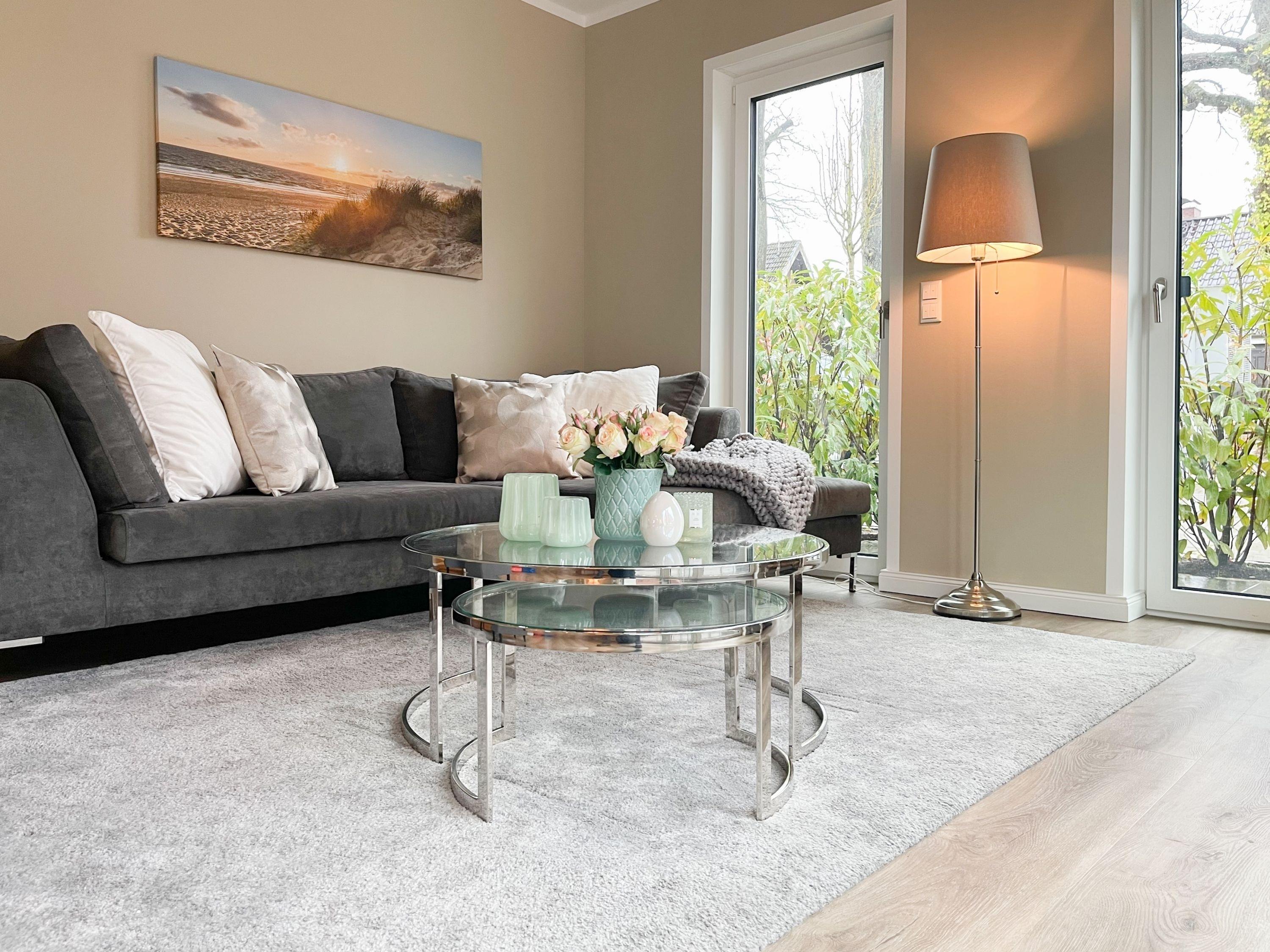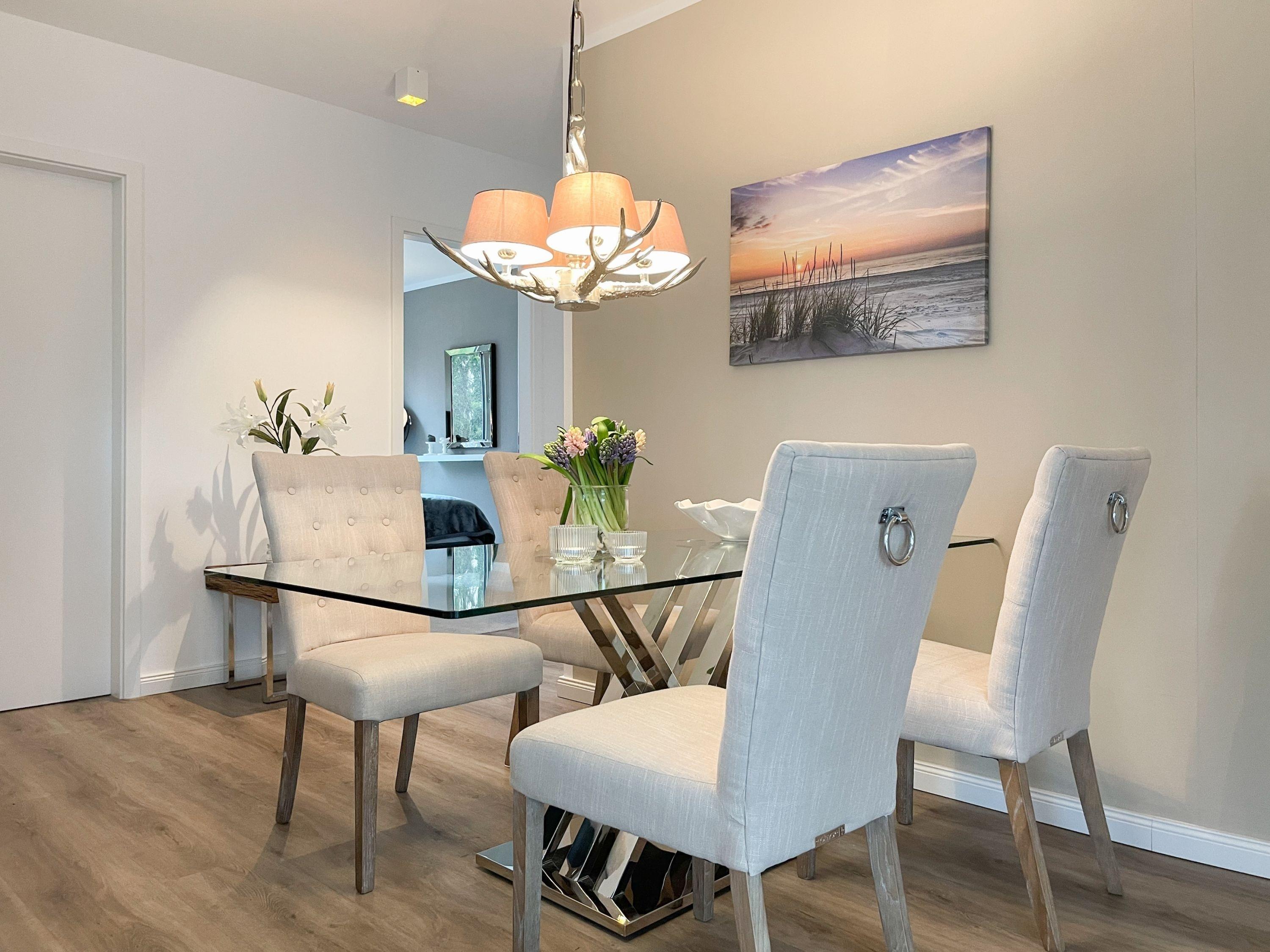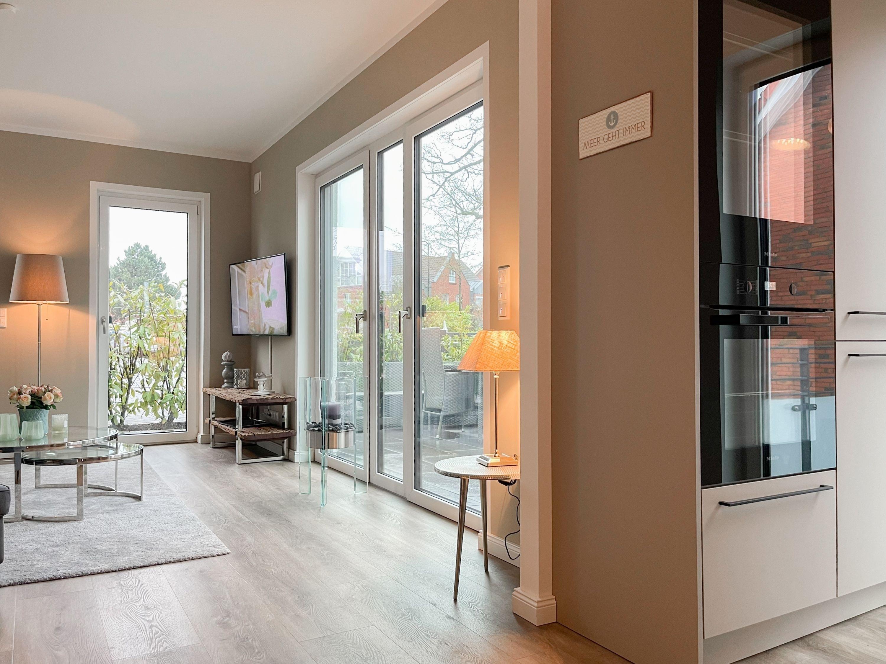 Es erwartet Sie eine äußerst hochwertig ausgestattete und geschmackvoll eingerichtete Ferienwohnung, die mit 2 separaten Schlafzimmern ausreichend Raum für 4 Personen bietet, um einen entspannten Urlaub in einem herrlichen Ambiente zu verleben. Fußbodenheizung, elektrische Außenjalousien und bodentiefe Fensterelemente, die für ein offenes Raumgefühl sorgen, gewährleisten einen hohen Wohnstandard. Mittelpunkt der Ferienwohnung bildet die Siematic Design Küche mit Kochinsel in bester Ausstattung, die zum gemeinsamen Kochen einlädt und der anschließende Essbereich im Hampton Style. Der behagliche Wohnbereich, eingerichtet mit Sofa und TV, bietet Blick und Zugang auf die großzügig angelegte Westterrasse mit Gartenmöbeln und Sonnenliegen, um den Tag bei einem Glas Wein ausklingen, um den Tag bei einem Glas Wein mit Ostseeblick ausklingen zu lassen. Beide Schlafzimmer bieten einen herrlichen Ausblick bis auf bis auf das Meer und sind mit hochwertigem Teppichboden,[nbsp] Doppelbetten (180x200) und einem Kleiderschrank ausgestattet. In einem der Schlafräume befindet sich ein zusätzlicher Fernseher.[nbsp] Im Flur des Eingangsbereichs steht ein weiterer Einbauschrank für Jacken und Mäntel zur Verfügung. Das Bad ist sehr hochwertig und modern, ausgestattet mit einer XXL Walk In Dusche. Waschmaschine und Trockner befinden sich in einem Einbauschrank. WLAN steht selbstverständlich zur kostenlosen Nutzung zur Verfügung. Fahrräder können auf der Terrasse der Wohnung abgestellt werden.