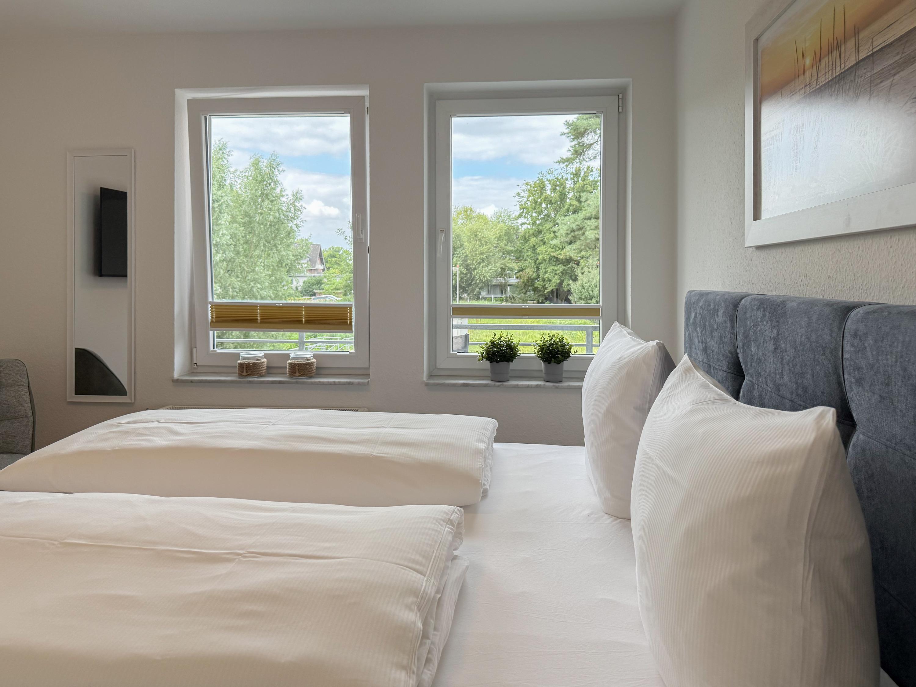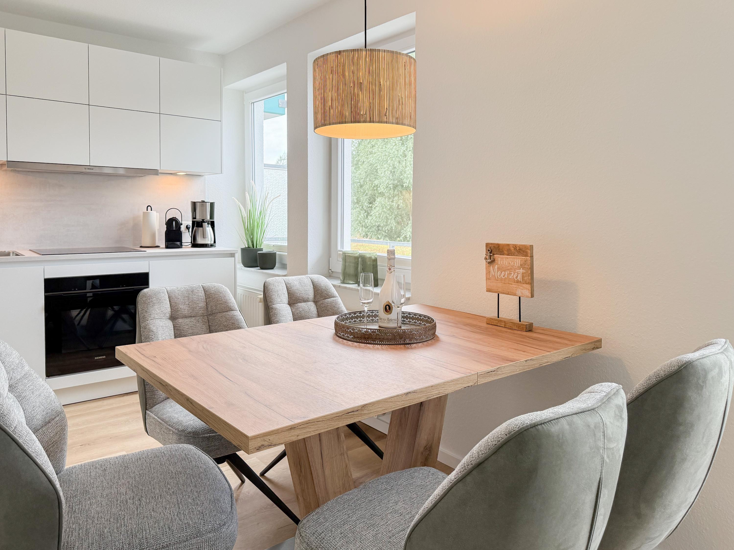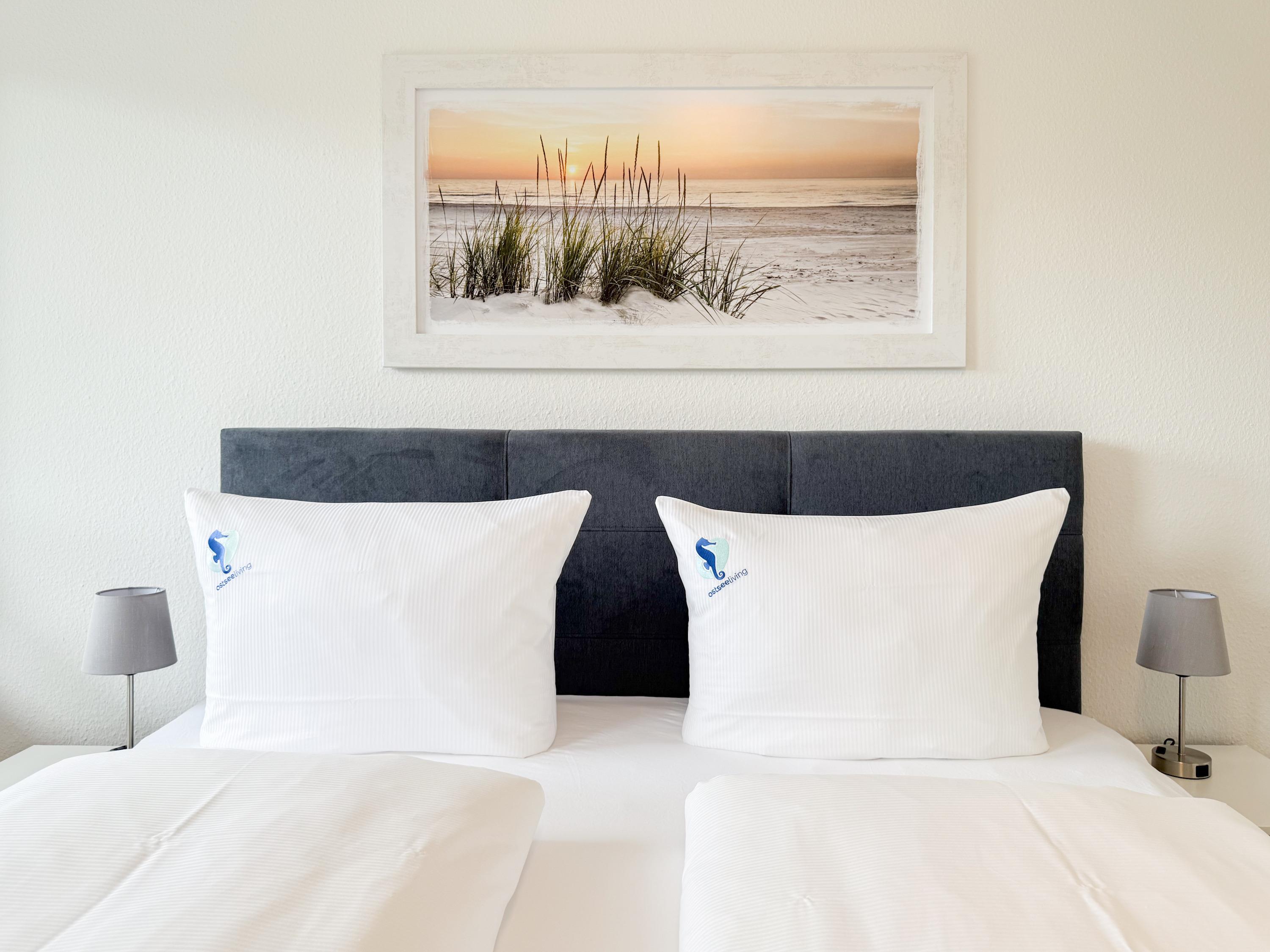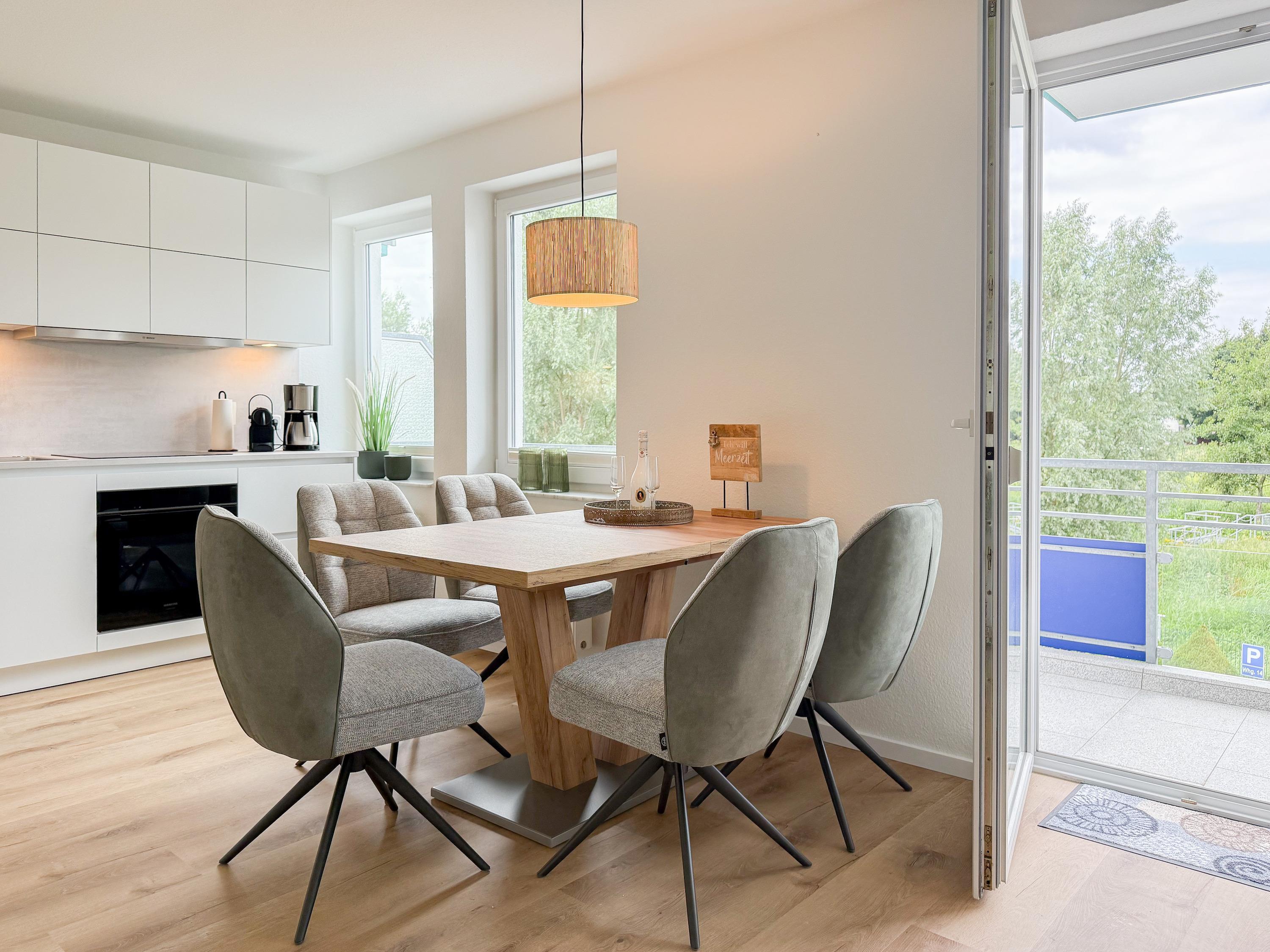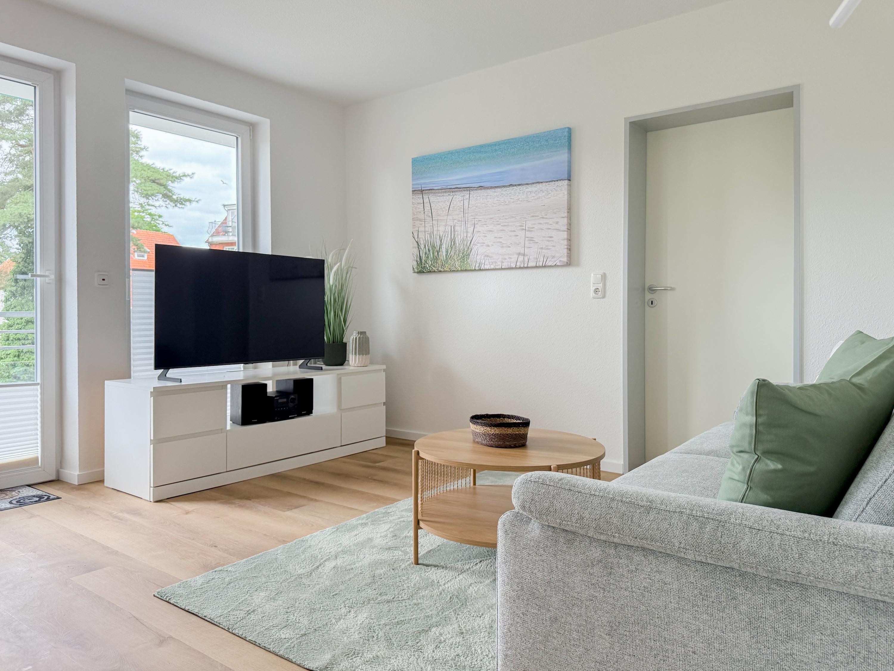 Im Jahr 2025 frisch und aufwendig renoviert, erwartet Sie in der 1. Etage einer sehr gepflegten Wohnanlage, eine lichtdurchflutete Wohlfühloase mit seitlichem Meerblick. Die hochwertige Einrichtung und Ausstattung der Wohnung sorgen für einen hohen Wohnstandard, um in einem schönen Ambiente den wohlverdienten Ostseeurlaub zu verbringen. Der helle Wohnbereich verfügt über ein komfortables Sofa, Smart-TV und einen schönen Essbereich mit ausreichend Platz für gemeinsame Mahlzeiten und gemütliches Beisammensein. Die neue integrierte Einbauküche ist hochwertig und bestens ausgestattet, mit Spülmaschine, Backofen-Mikrowellen-Kombi, Induktionskochfeld, Gefrierschrank und vielem mehr. Der Balkon, teilweise überdacht, erstreckt sich über die gesamte Wohnungsbreite und bietet sowohl einen schönen Blick ins Grüne als auch einen herrlichen seitlichen Blick auf die Ostsee. Genießen Sie vom späten Nachmittag die letzten Sonnenstunden und lassen den Abend bei einem Glas Wein ausklingen. Es gibt 2 separate Schlafzimmer, beide ausgestattet mit einem Boxspringbett (180x200 und 160x200) und TV. Das große Schlafzimmer ist mit einem Boxspringbett (180x200), TV, Verdunkelungsplissees und einem Kleiderschrank mit reichlich Stauraum eingerichtet. Das kleine, innenliegende Schlafzimmer ist ebenfalls mit einem Boxspringbett (160x200),[nbsp] TV und einem kleinen Kleiderschrank ausgestattet. Es verfügt über ein kippbares Fenster zum Wohnbereich, das mit einem Verdunkelungsrollo versehen ist. Das neuwertige moderne Duschbad ist ausreichend groß, Handtuchtrockner und Föhn sind vorhanden. WLAN steht selbstverständlich zur Verfügung.