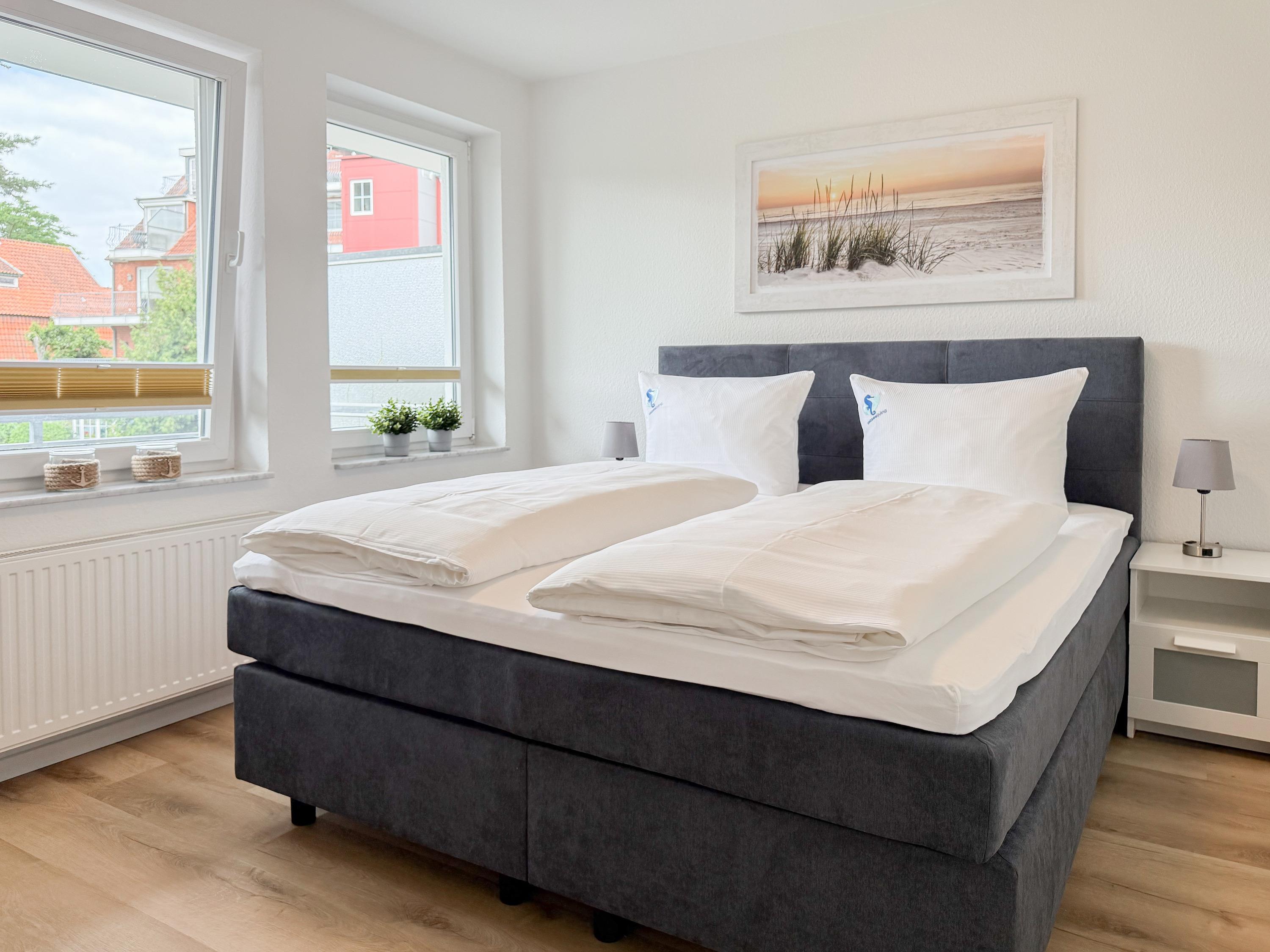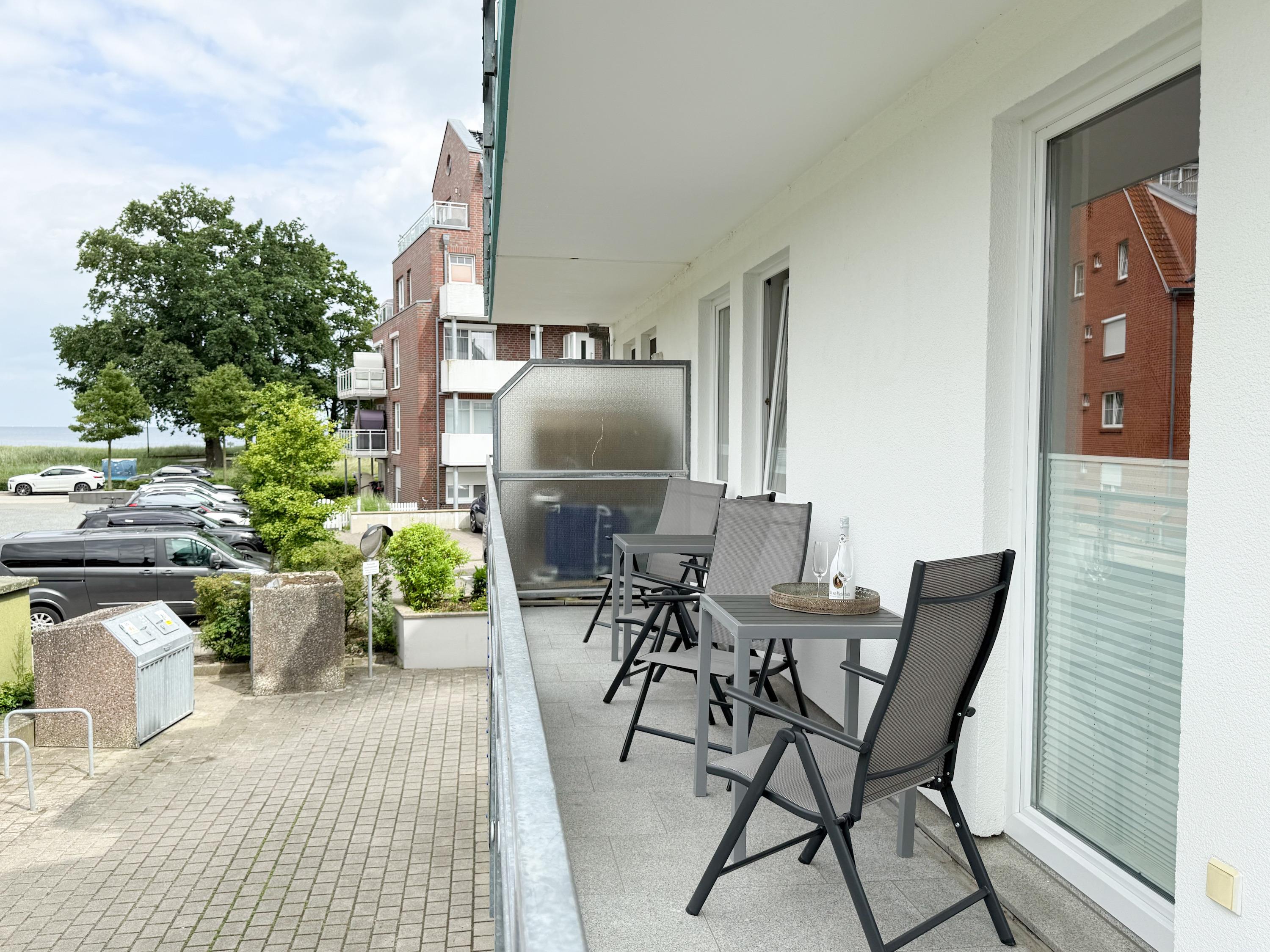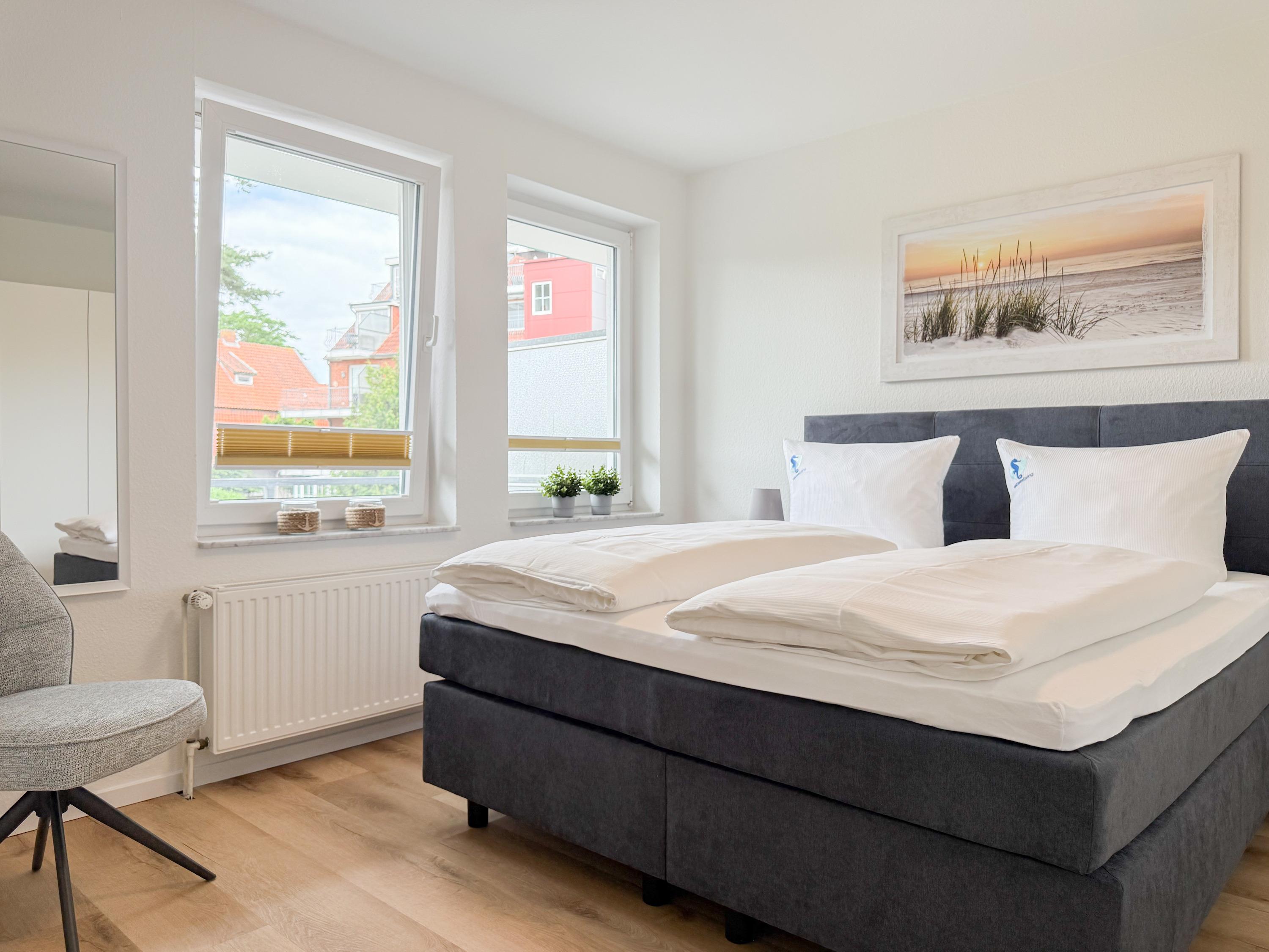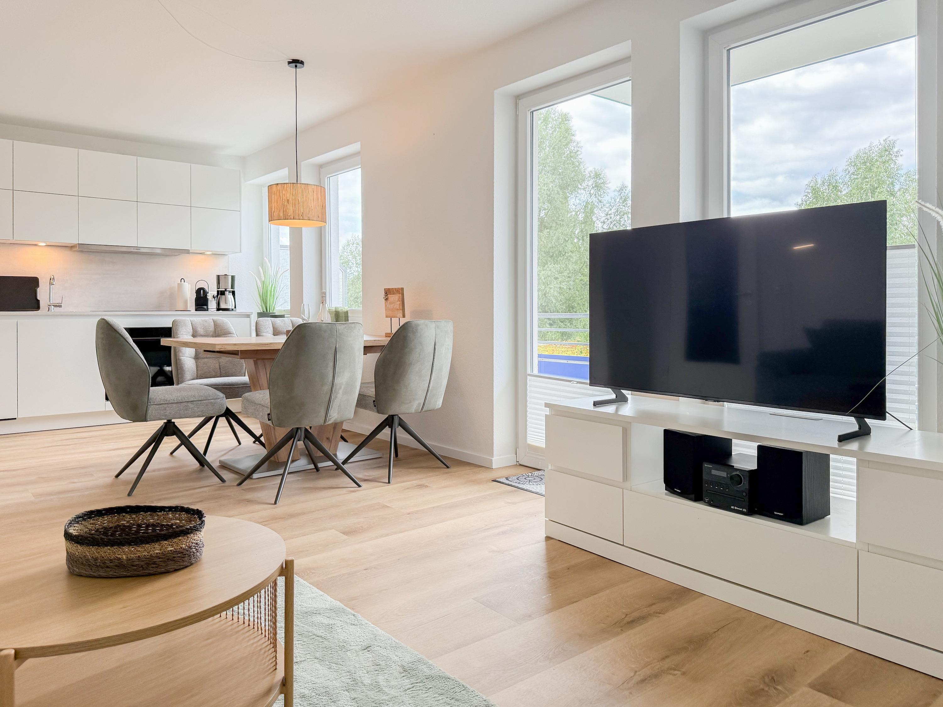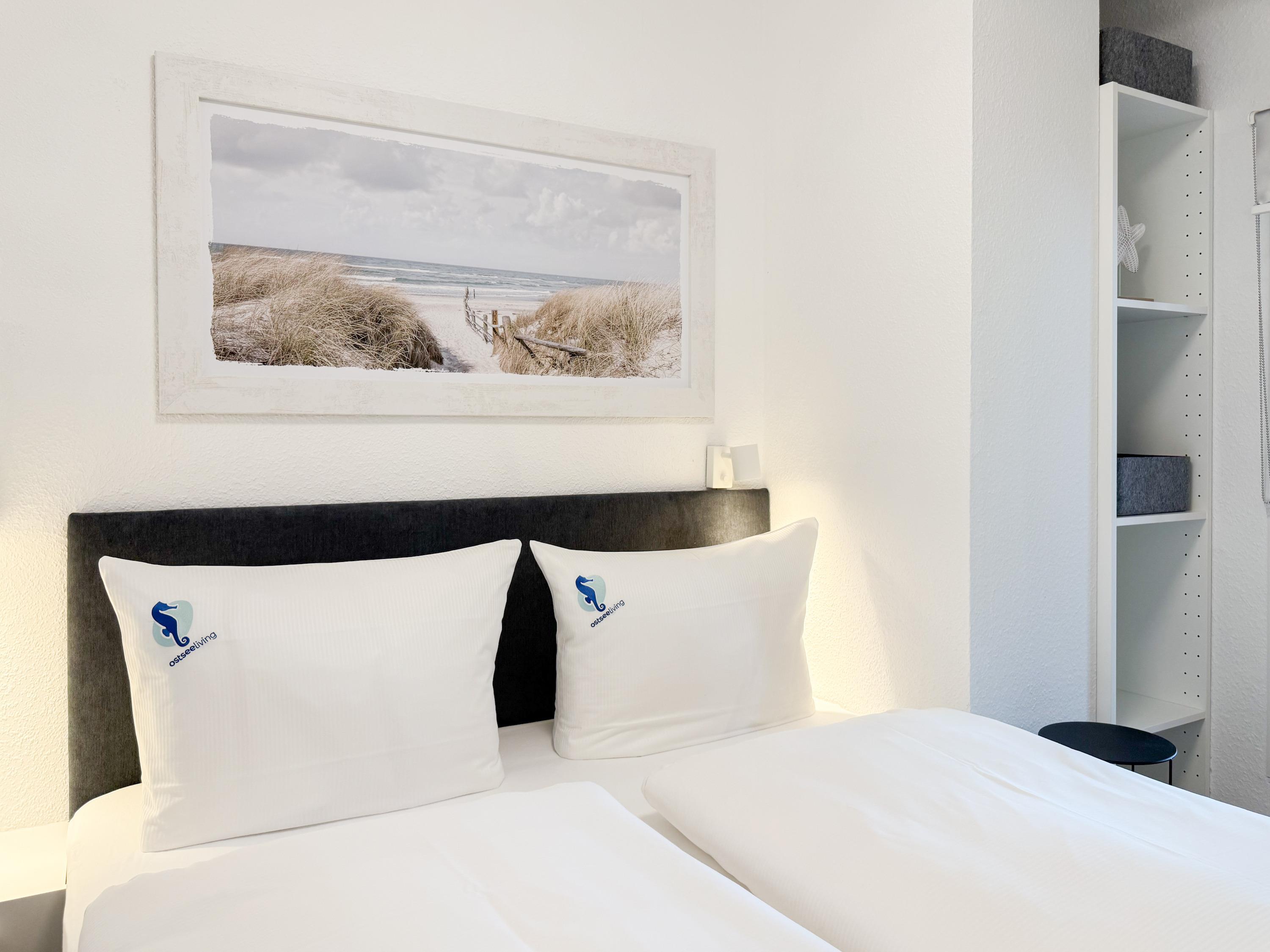 Im Jahr 2025 frisch und aufwendig renoviert, erwartet Sie in der 1. Etage einer sehr gepflegten Wohnanlage, eine lichtdurchflutete Wohlfühloase mit seitlichem Meerblick. Die hochwertige Einrichtung und Ausstattung der Wohnung sorgen für einen hohen Wohnstandard, um in einem schönen Ambiente den wohlverdienten Ostseeurlaub zu verbringen. Der helle Wohnbereich verfügt über ein komfortables Sofa, Smart-TV und einen schönen Essbereich mit ausreichend Platz für gemeinsame Mahlzeiten und gemütliches Beisammensein. Die neue integrierte Einbauküche ist hochwertig und bestens ausgestattet, mit Spülmaschine, Backofen-Mikrowellen-Kombi, Induktionskochfeld, Gefrierschrank und vielem mehr. Der Balkon, teilweise überdacht, erstreckt sich über die gesamte Wohnungsbreite und bietet sowohl einen schönen Blick ins Grüne als auch einen herrlichen seitlichen Blick auf die Ostsee. Genießen Sie vom späten Nachmittag die letzten Sonnenstunden und lassen den Abend bei einem Glas Wein ausklingen. Es gibt 2 separate Schlafzimmer, beide ausgestattet mit einem Boxspringbett (180x200 und 160x200) und TV. Das große Schlafzimmer ist mit einem Boxspringbett (180x200), TV, Verdunkelungsplissees und einem Kleiderschrank mit reichlich Stauraum eingerichtet. Das kleine, innenliegende Schlafzimmer ist ebenfalls mit einem Boxspringbett (160x200),[nbsp] TV und einem kleinen Kleiderschrank ausgestattet. Es verfügt über ein kippbares Fenster zum Wohnbereich, das mit einem Verdunkelungsrollo versehen ist. Das neuwertige moderne Duschbad ist ausreichend groß, Handtuchtrockner und Föhn sind vorhanden. WLAN steht selbstverständlich zur Verfügung.