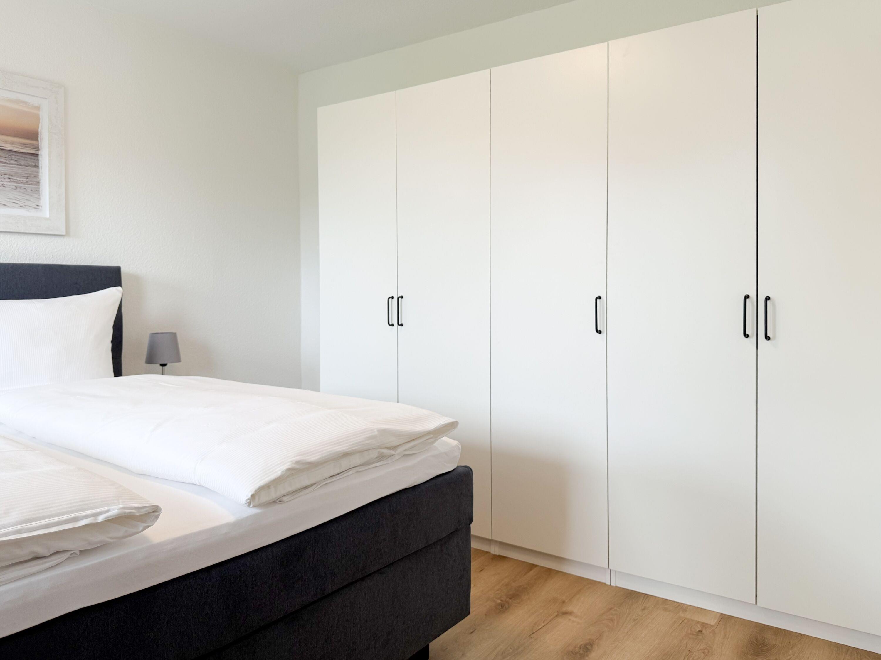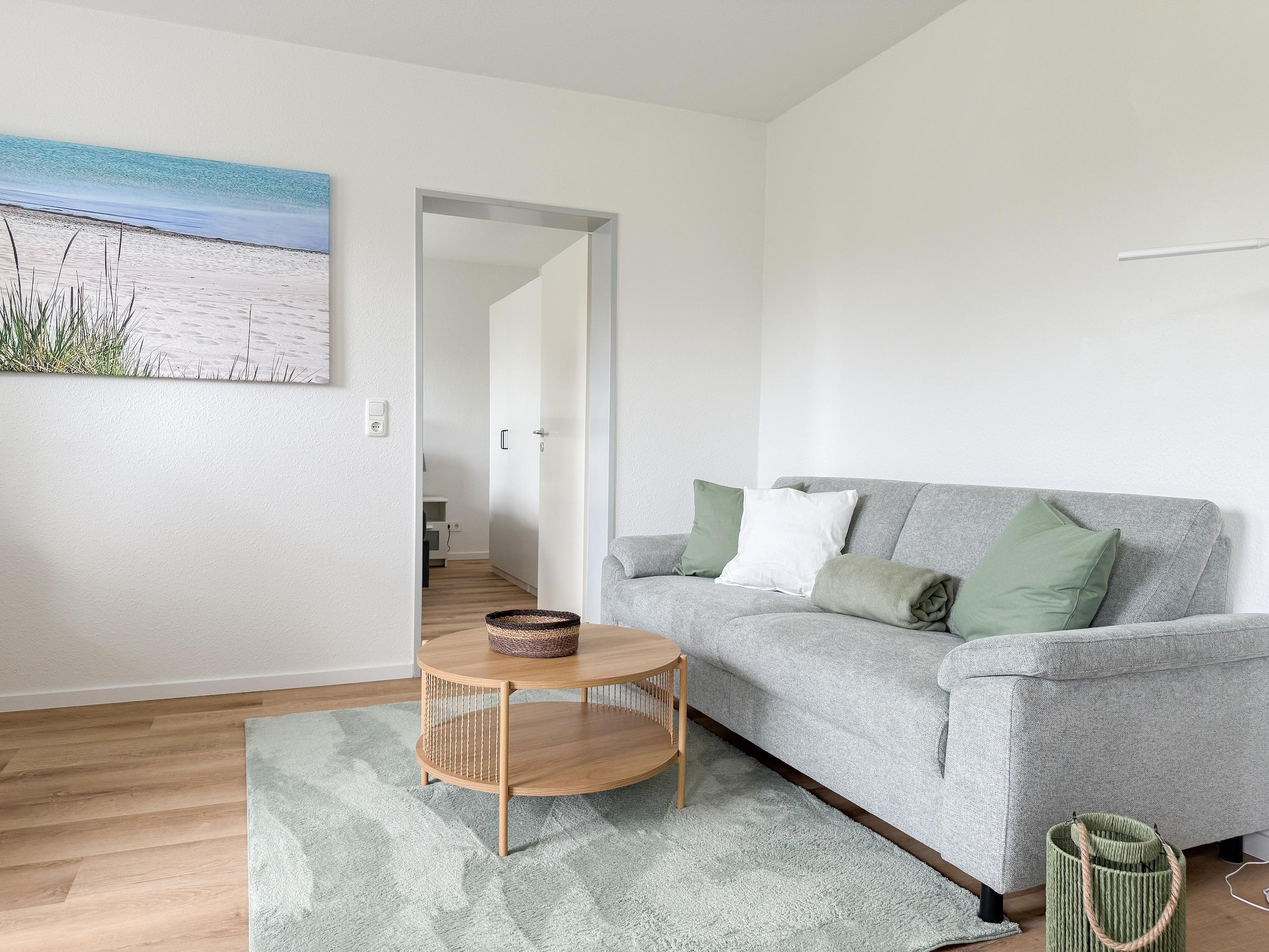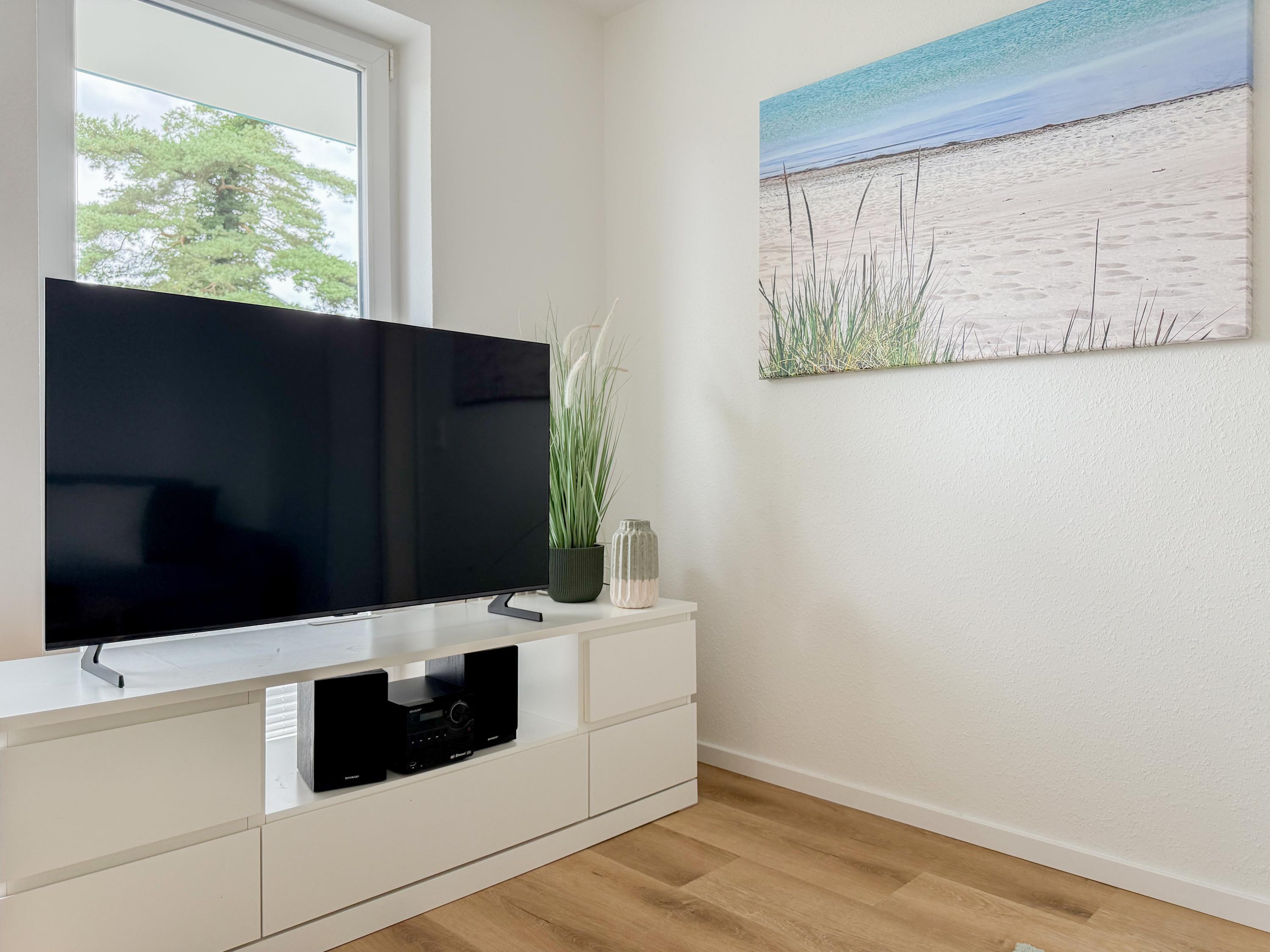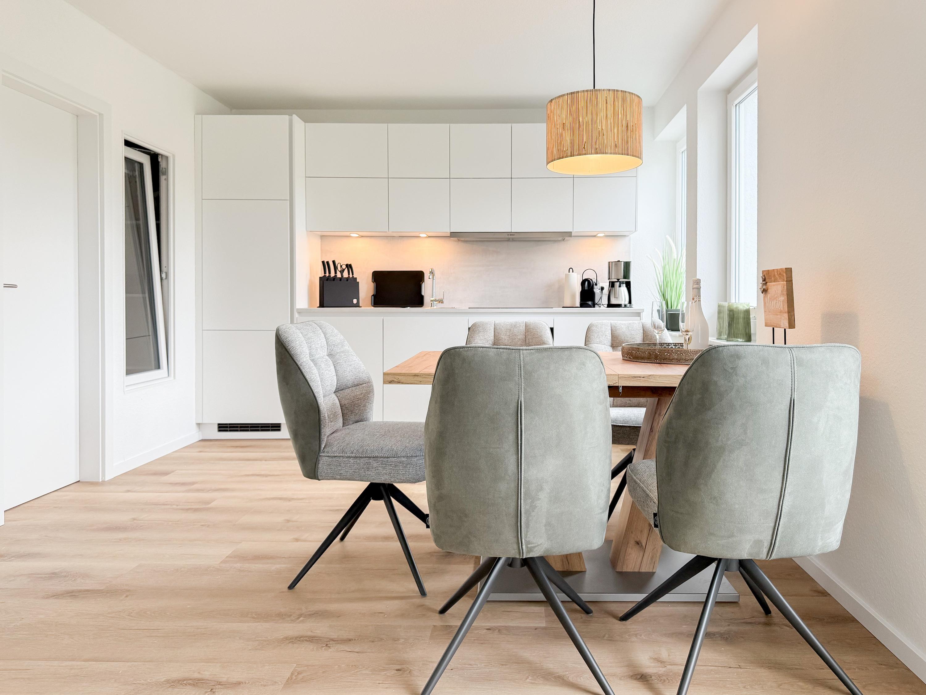 Im Jahr 2025 frisch und aufwendig renoviert, erwartet Sie in der 1. Etage einer sehr gepflegten Wohnanlage, eine lichtdurchflutete Wohlfühloase mit seitlichem Meerblick. Die hochwertige Einrichtung und Ausstattung der Wohnung sorgen für einen hohen Wohnstandard, um in einem schönen Ambiente den wohlverdienten Ostseeurlaub zu verbringen. Der helle Wohnbereich verfügt über ein komfortables Sofa, Smart-TV und einen schönen Essbereich mit ausreichend Platz für gemeinsame Mahlzeiten und gemütliches Beisammensein. Die neue integrierte Einbauküche ist hochwertig und bestens ausgestattet, mit Spülmaschine, Backofen-Mikrowellen-Kombi, Induktionskochfeld, Gefrierschrank und vielem mehr. Der Balkon, teilweise überdacht, erstreckt sich über die gesamte Wohnungsbreite und bietet sowohl einen schönen Blick ins Grüne als auch einen herrlichen seitlichen Blick auf die Ostsee. Genießen Sie vom späten Nachmittag die letzten Sonnenstunden und lassen den Abend bei einem Glas Wein ausklingen. Es gibt 2 separate Schlafzimmer, beide ausgestattet mit einem Boxspringbett (180x200 und 160x200) und TV. Das große Schlafzimmer ist mit einem Boxspringbett (180x200), TV, Verdunkelungsplissees und einem Kleiderschrank mit reichlich Stauraum eingerichtet. Das kleine, innenliegende Schlafzimmer ist ebenfalls mit einem Boxspringbett (160x200),[nbsp] TV und einem kleinen Kleiderschrank ausgestattet. Es verfügt über ein kippbares Fenster zum Wohnbereich, das mit einem Verdunkelungsrollo versehen ist. Das neuwertige moderne Duschbad ist ausreichend groß, Handtuchtrockner und Föhn sind vorhanden. WLAN steht selbstverständlich zur Verfügung.