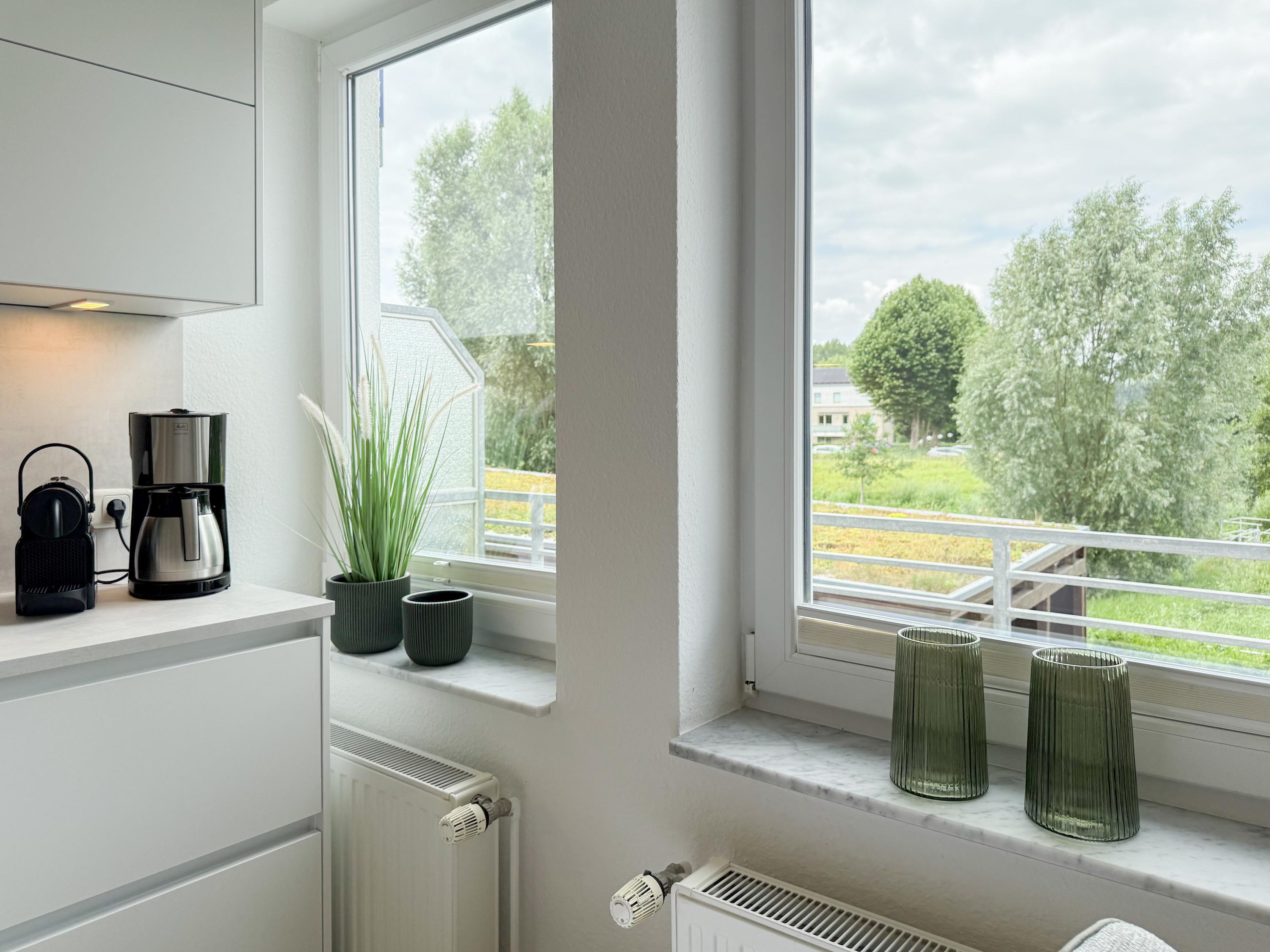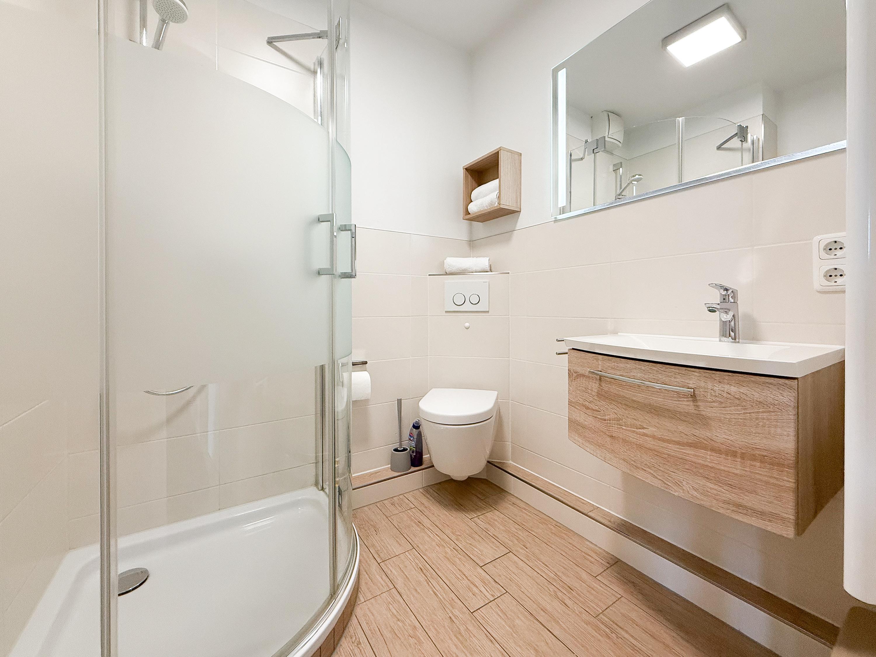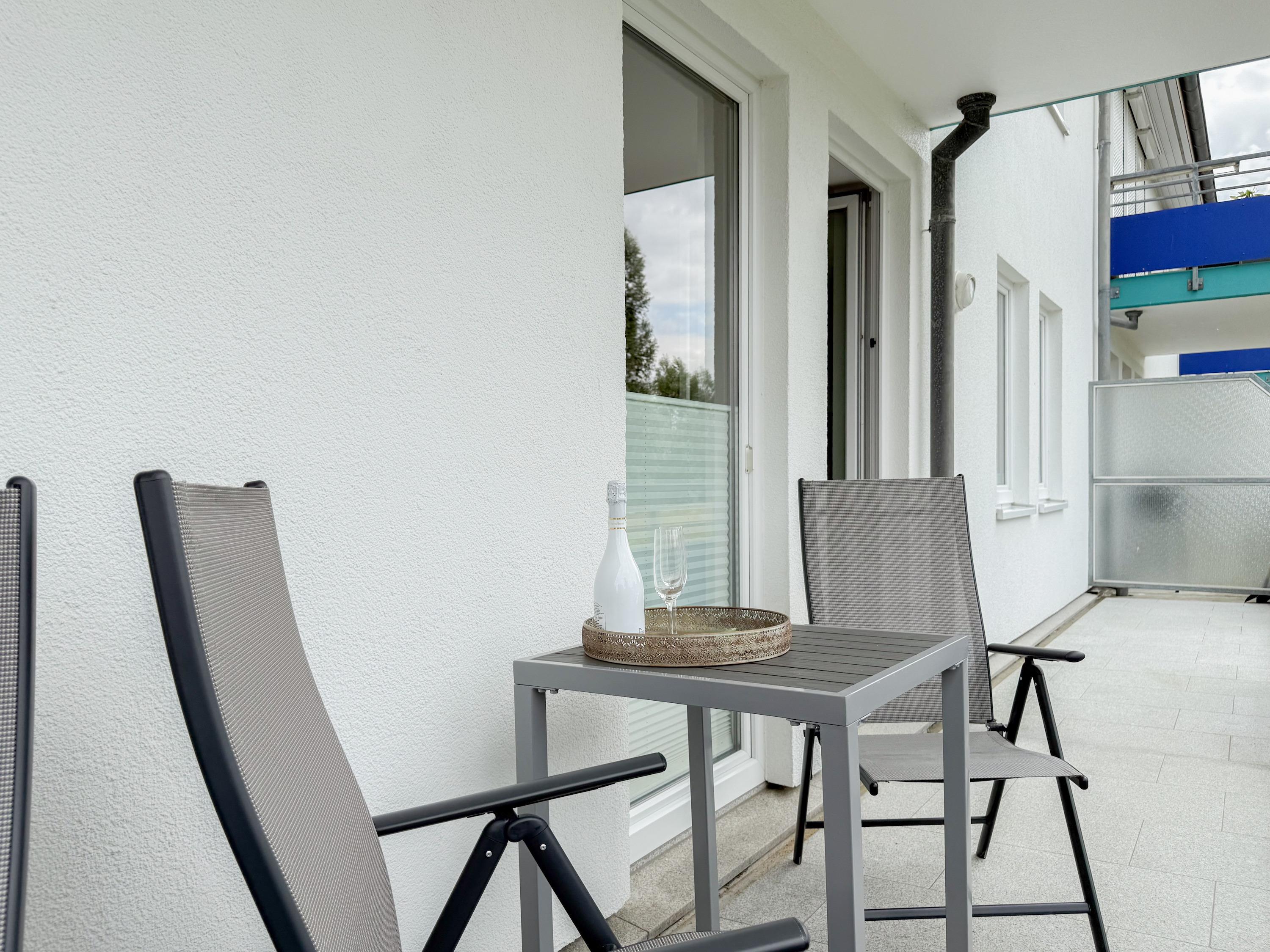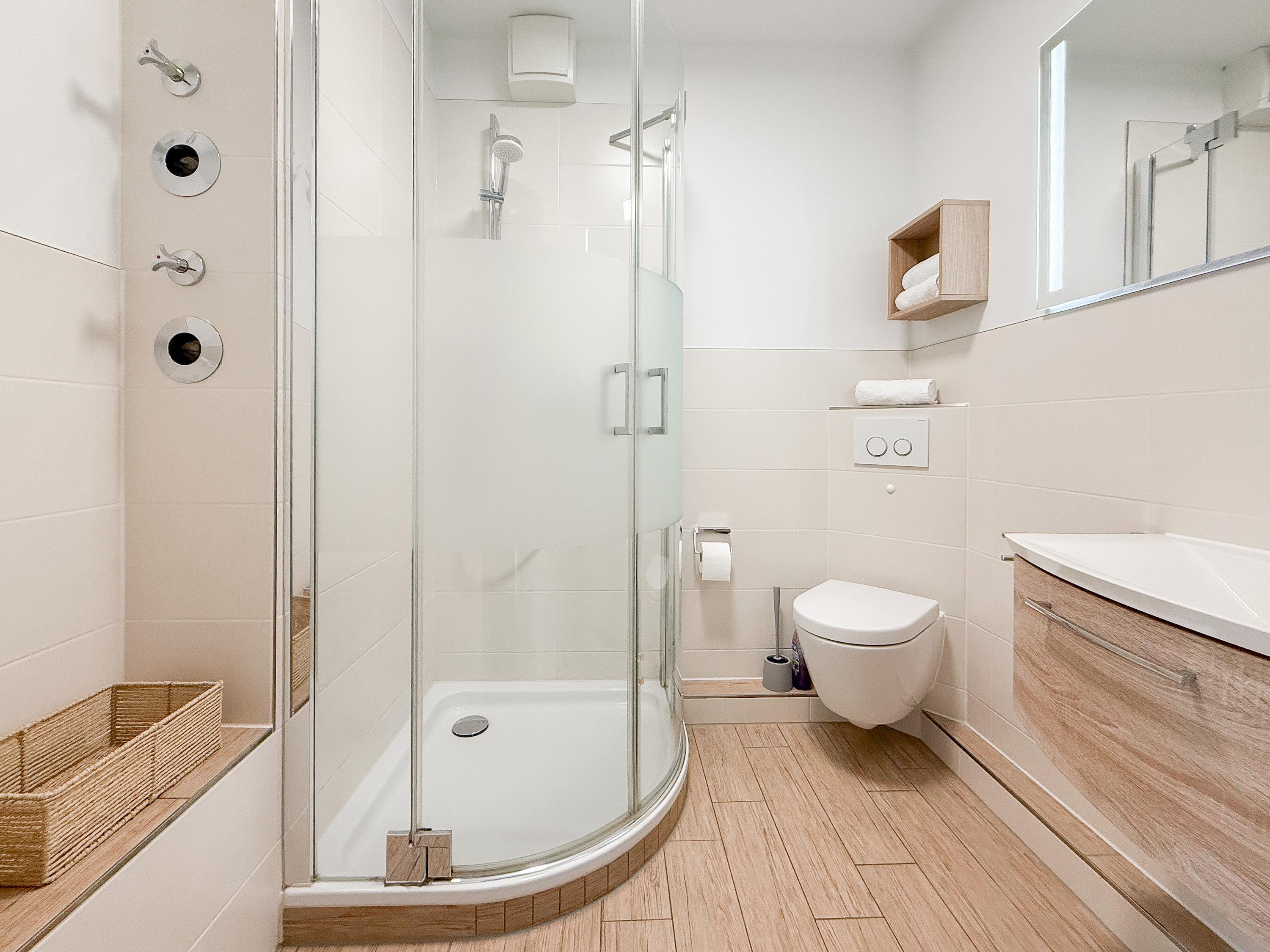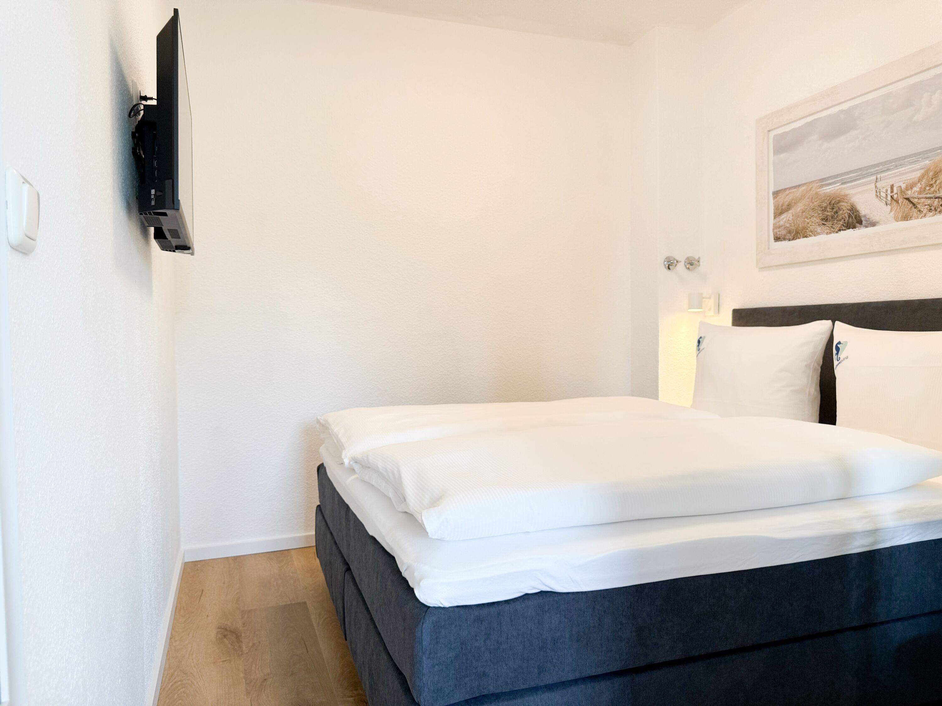 Im Jahr 2025 frisch und aufwendig renoviert, erwartet Sie in der 1. Etage einer sehr gepflegten Wohnanlage, eine lichtdurchflutete Wohlfühloase mit seitlichem Meerblick. Die hochwertige Einrichtung und Ausstattung der Wohnung sorgen für einen hohen Wohnstandard, um in einem schönen Ambiente den wohlverdienten Ostseeurlaub zu verbringen. Der helle Wohnbereich verfügt über ein komfortables Sofa, Smart-TV und einen schönen Essbereich mit ausreichend Platz für gemeinsame Mahlzeiten und gemütliches Beisammensein. Die neue integrierte Einbauküche ist hochwertig und bestens ausgestattet, mit Spülmaschine, Backofen-Mikrowellen-Kombi, Induktionskochfeld, Gefrierschrank und vielem mehr. Der Balkon, teilweise überdacht, erstreckt sich über die gesamte Wohnungsbreite und bietet sowohl einen schönen Blick ins Grüne als auch einen herrlichen seitlichen Blick auf die Ostsee. Genießen Sie vom späten Nachmittag die letzten Sonnenstunden und lassen den Abend bei einem Glas Wein ausklingen. Es gibt 2 separate Schlafzimmer, beide ausgestattet mit einem Boxspringbett (180x200 und 160x200) und TV. Das große Schlafzimmer ist mit einem Boxspringbett (180x200), TV, Verdunkelungsplissees und einem Kleiderschrank mit reichlich Stauraum eingerichtet. Das kleine, innenliegende Schlafzimmer ist ebenfalls mit einem Boxspringbett (160x200),[nbsp] TV und einem kleinen Kleiderschrank ausgestattet. Es verfügt über ein kippbares Fenster zum Wohnbereich, das mit einem Verdunkelungsrollo versehen ist. Das neuwertige moderne Duschbad ist ausreichend groß, Handtuchtrockner und Föhn sind vorhanden. WLAN steht selbstverständlich zur Verfügung.
