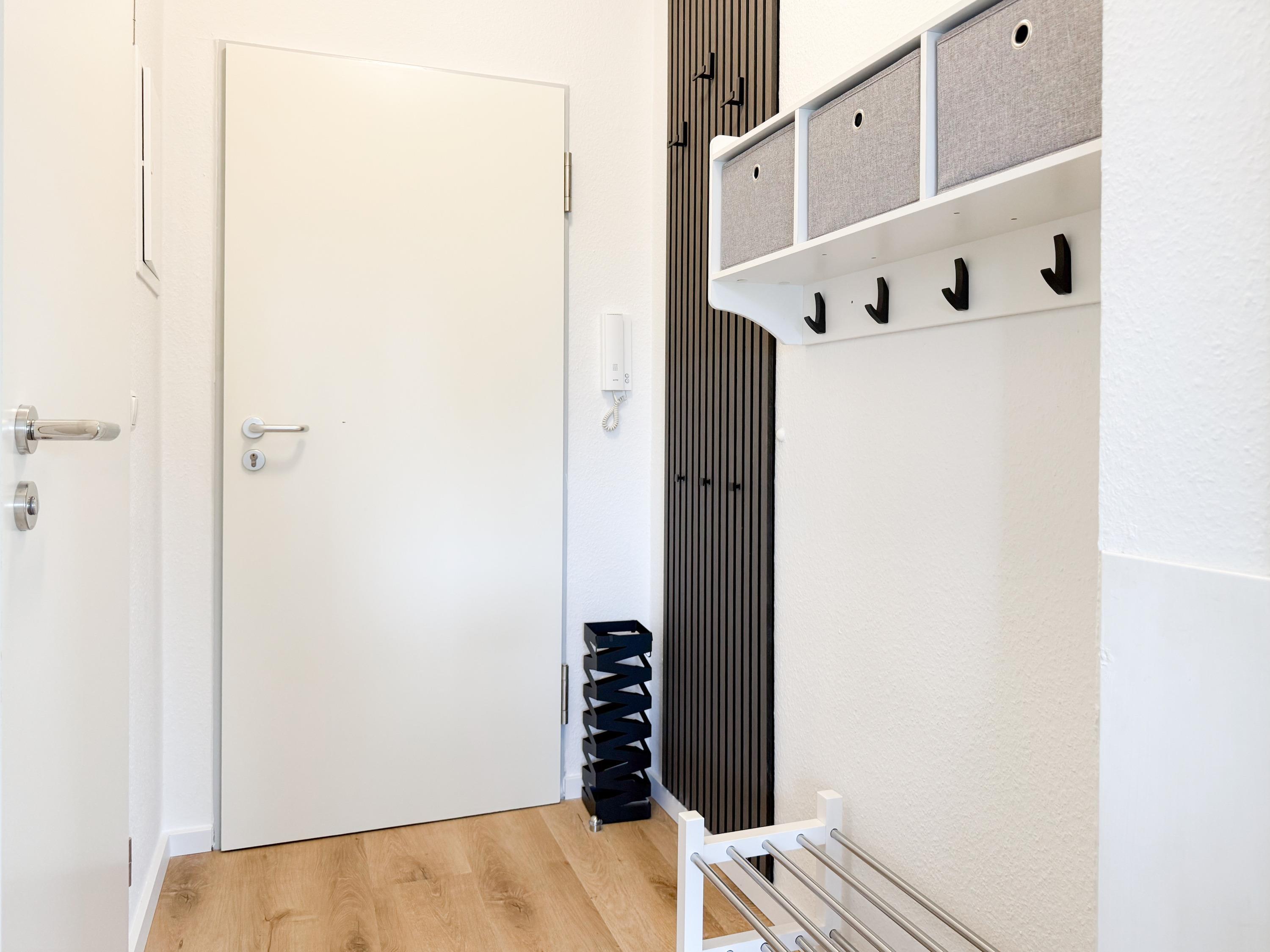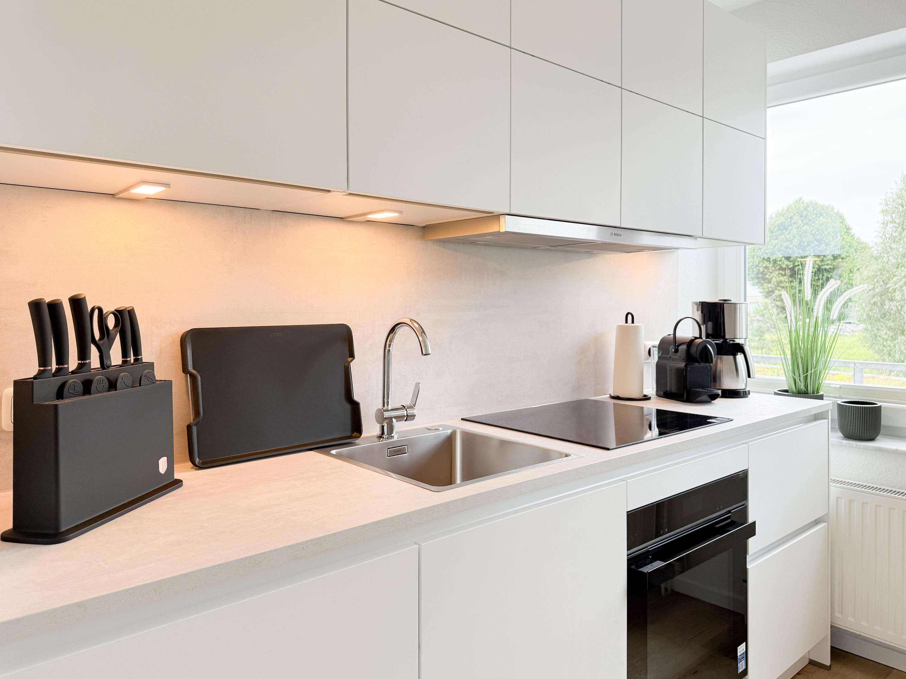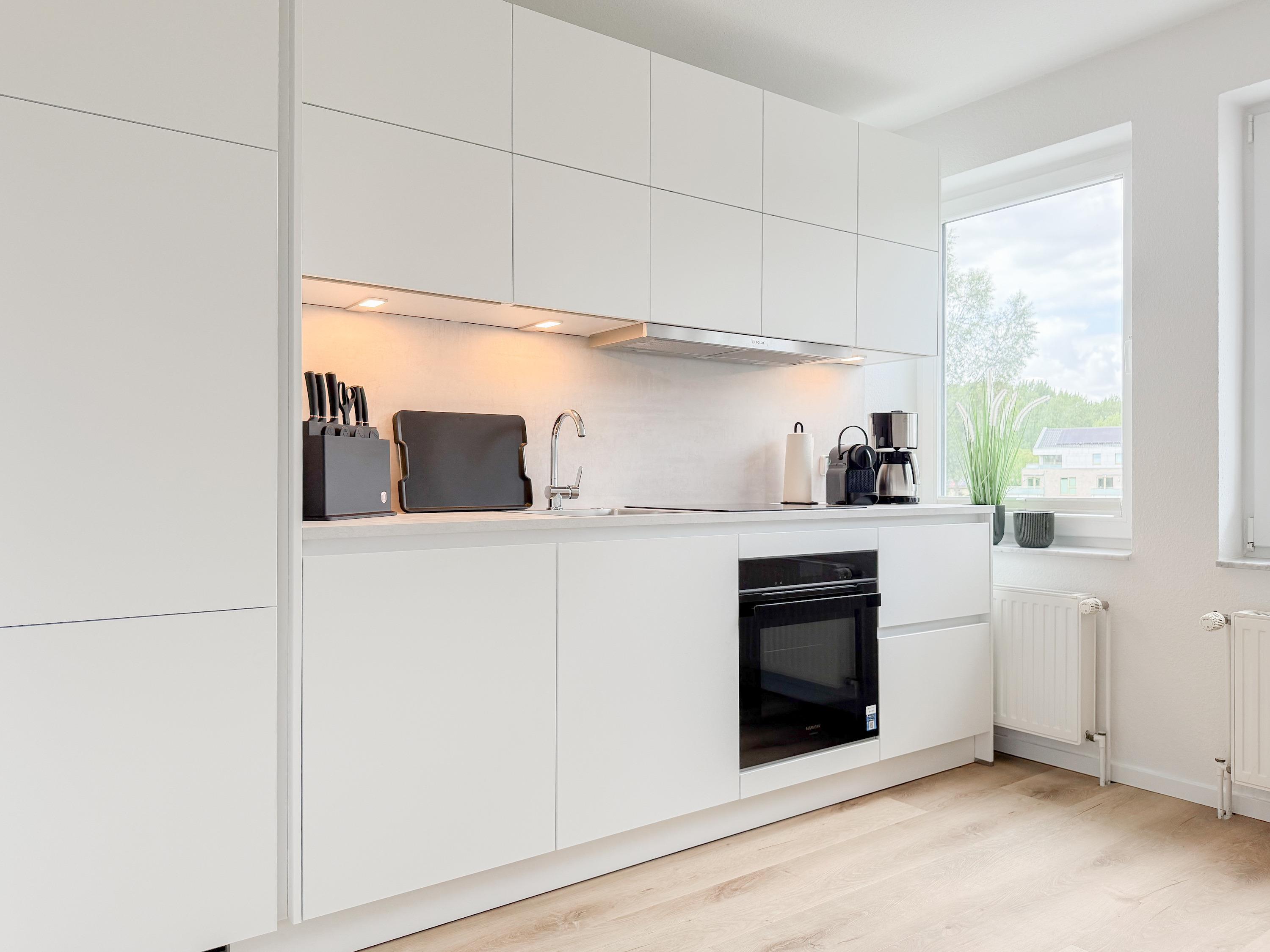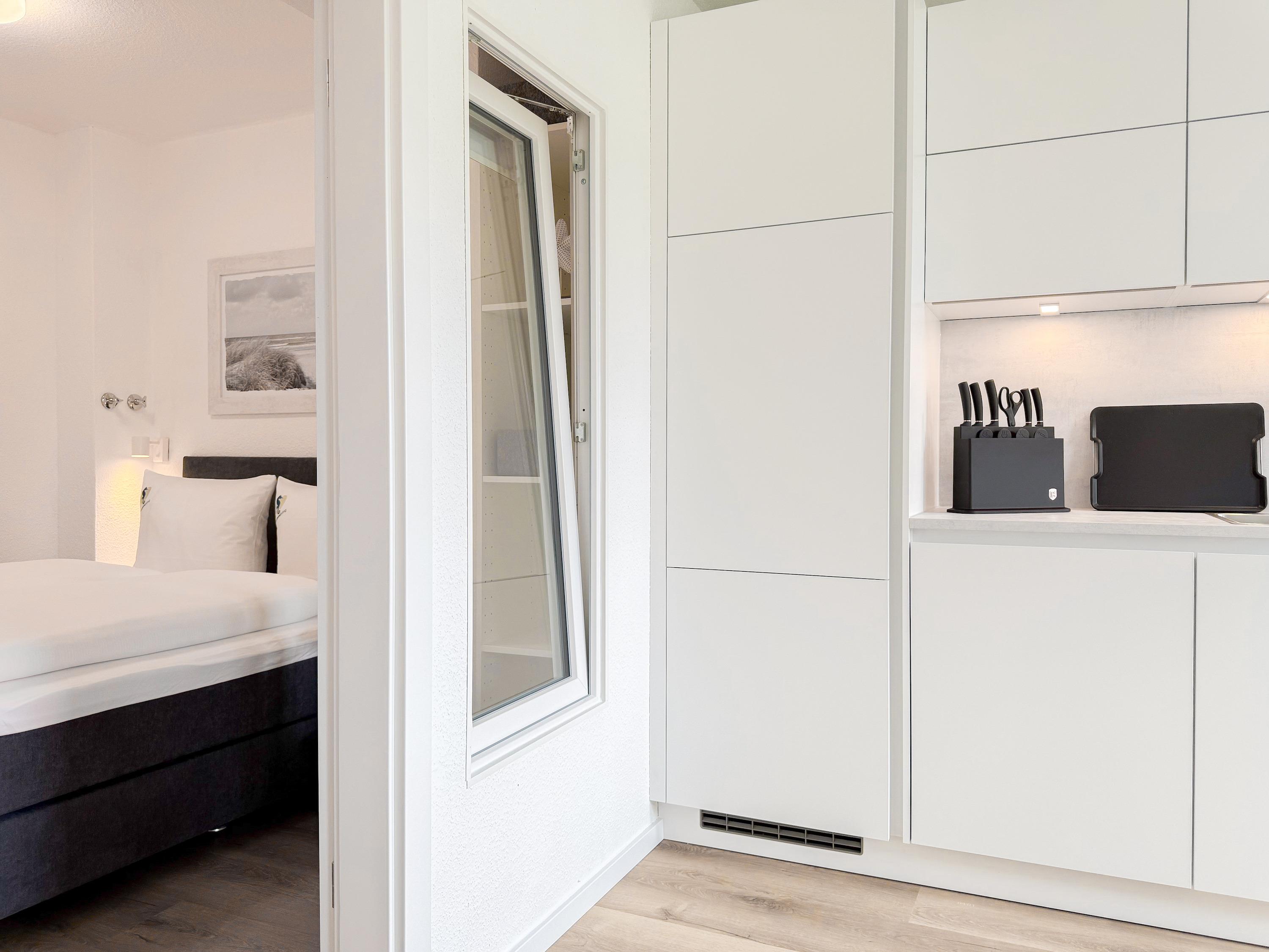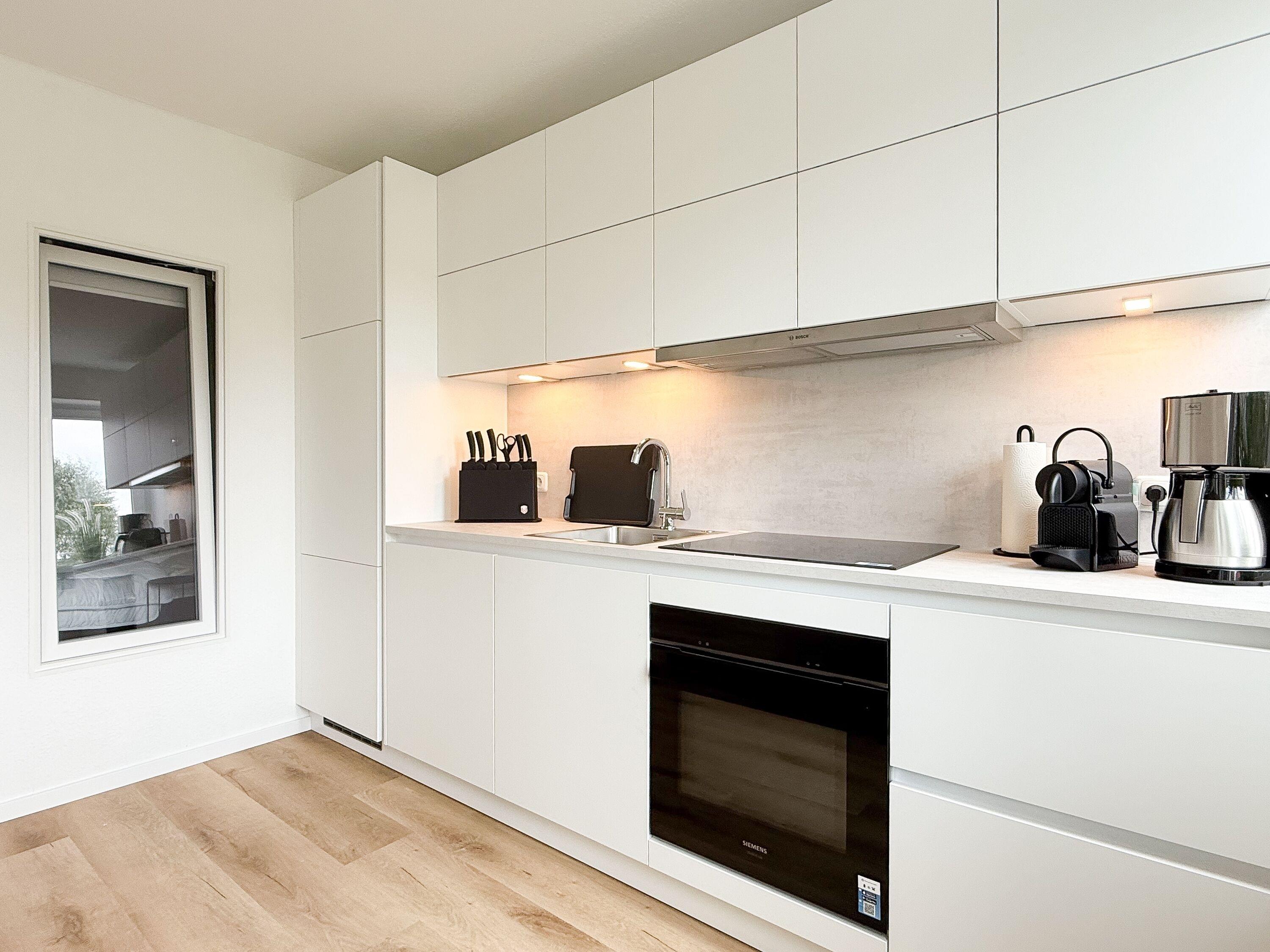Im Jahr 2025 frisch und aufwendig renoviert, erwartet Sie in der 1. Etage einer sehr gepflegten Wohnanlage, eine lichtdurchflutete Wohlfühloase mit seitlichem Meerblick. Die hochwertige Einrichtung und Ausstattung der Wohnung sorgen für einen hohen Wohnstandard, um in einem schönen Ambiente den wohlverdienten Ostseeurlaub zu verbringen. Der helle Wohnbereich verfügt über ein komfortables Sofa, Smart-TV und einen schönen Essbereich mit ausreichend Platz für gemeinsame Mahlzeiten und gemütliches Beisammensein. Die neue integrierte Einbauküche ist hochwertig und bestens ausgestattet, mit Spülmaschine, Backofen-Mikrowellen-Kombi, Induktionskochfeld, Gefrierschrank und vielem mehr. Der Balkon, teilweise überdacht, erstreckt sich über die gesamte Wohnungsbreite und bietet sowohl einen schönen Blick ins Grüne als auch einen herrlichen seitlichen Blick auf die Ostsee. Genießen Sie vom späten Nachmittag die letzten Sonnenstunden und lassen den Abend bei einem Glas Wein ausklingen. Es gibt 2 separate Schlafzimmer, beide ausgestattet mit einem Boxspringbett (180x200 und 160x200) und TV. Das große Schlafzimmer ist mit einem Boxspringbett (180x200), TV, Verdunkelungsplissees und einem Kleiderschrank mit reichlich Stauraum eingerichtet. Das kleine, innenliegende Schlafzimmer ist ebenfalls mit einem Boxspringbett (160x200),[nbsp] TV und einem kleinen Kleiderschrank ausgestattet. Es verfügt über ein kippbares Fenster zum Wohnbereich, das mit einem Verdunkelungsrollo versehen ist. Das neuwertige moderne Duschbad ist ausreichend groß, Handtuchtrockner und Föhn sind vorhanden. WLAN steht selbstverständlich zur Verfügung.
