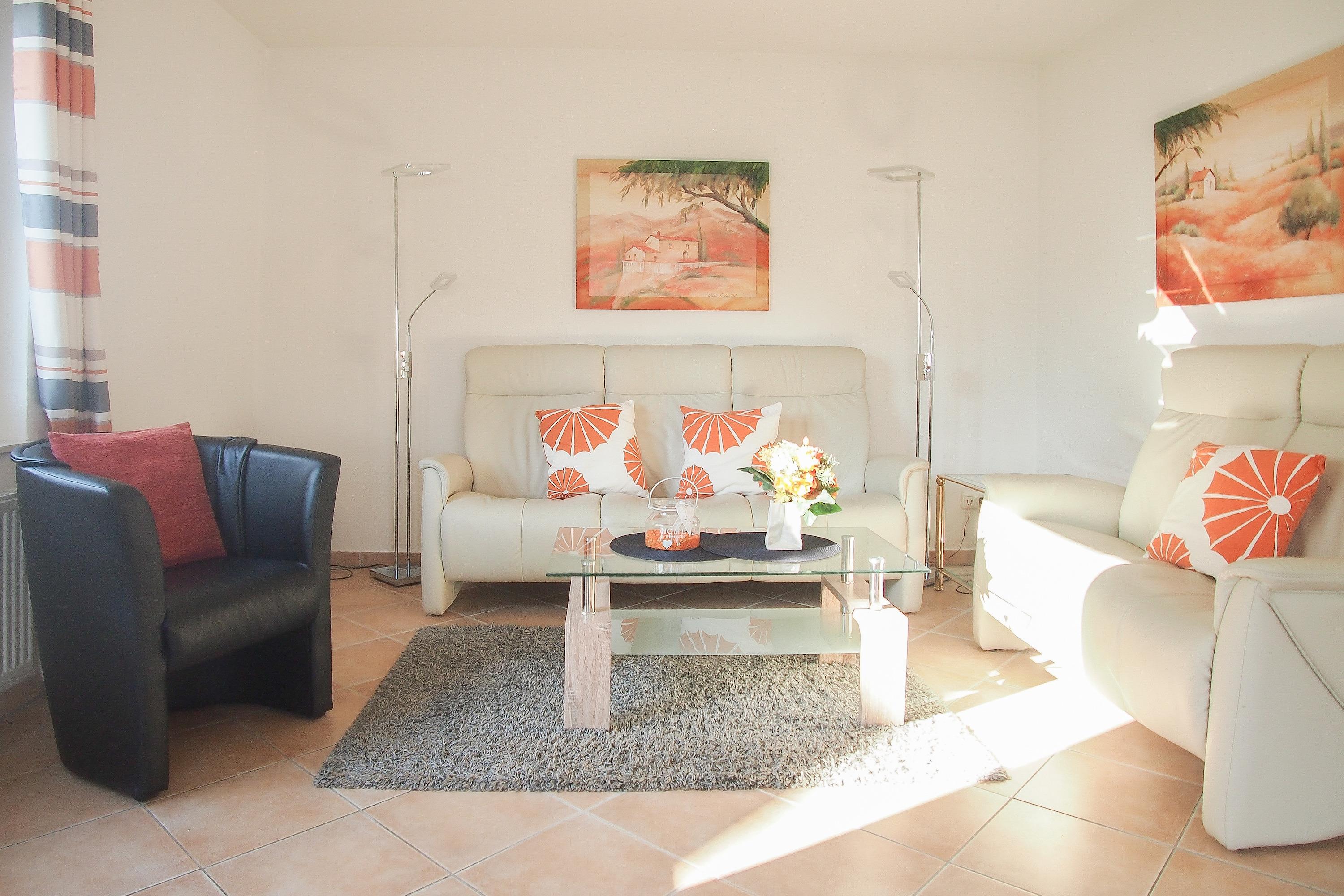 Das Ferienhaus Melanie[nbsp] bietet auf über 100 qm Wohnfläche mit 3 Schlafzimmern ausreichend Platz für 6 Personen plus Kleinkind, um einen entspannten Urlaub zu verleben. Im Erdgeschoss befindet sich ein gemütlicher Wohnbereich, hell und freundlich, mit TV, DVD Player, WLAN und Musikanlage. Angrenzend gibt es einen weiteren Sitz- oder Lesebereich mit einem Sofa mit Schlaffunktion und Zugang[nbsp] zur möblierten Süd Terrasse. Die zweite möblierte Terrasse mit Gasgrill ist zum Westen ausgerichtet und befindet sich im hinteren Teil des Gartens vor dem Garagenhaus. Das Herzstück bildet die offene Wohnküche in bester Ausstattung mit allen technischen Geräten und der großzügig angelegte Essbereich, sonnig und hell dank viel Fensterfläche. Ein großes Gäste WC mit Waschmaschine und Trockner zur kostenlosen Nutzung, [nbsp]ist ebenfalls im Erdgeschoss untergebracht.