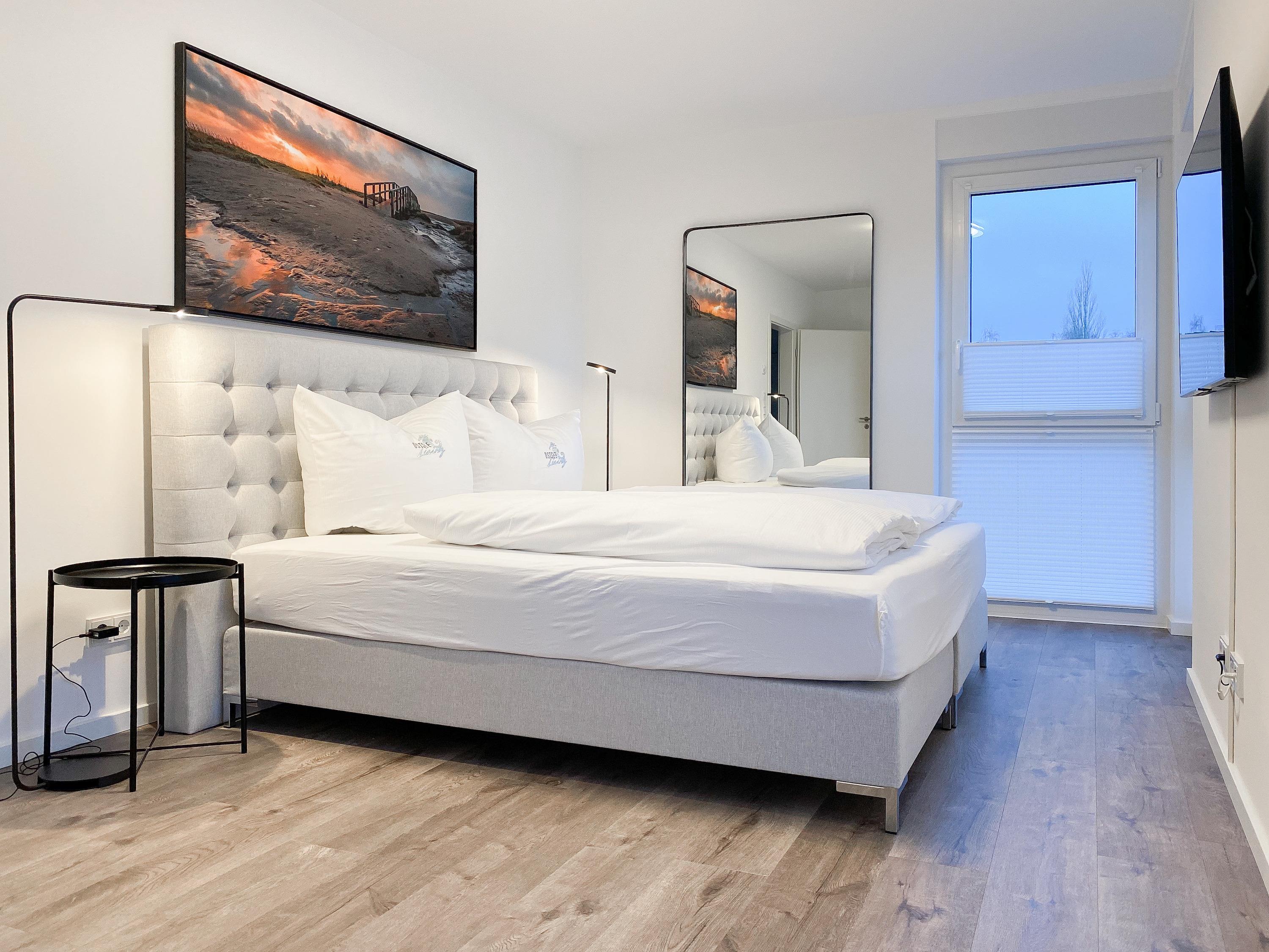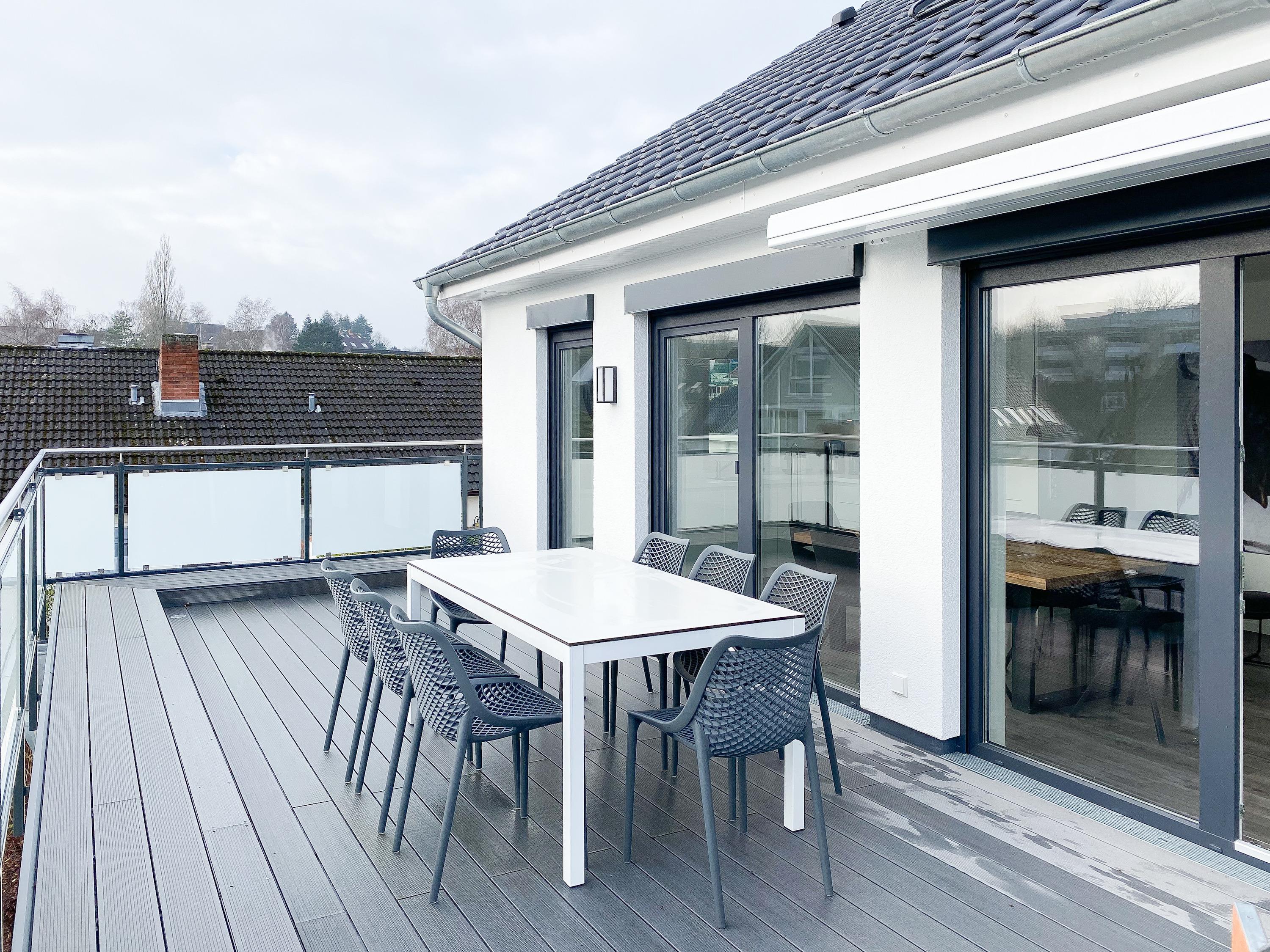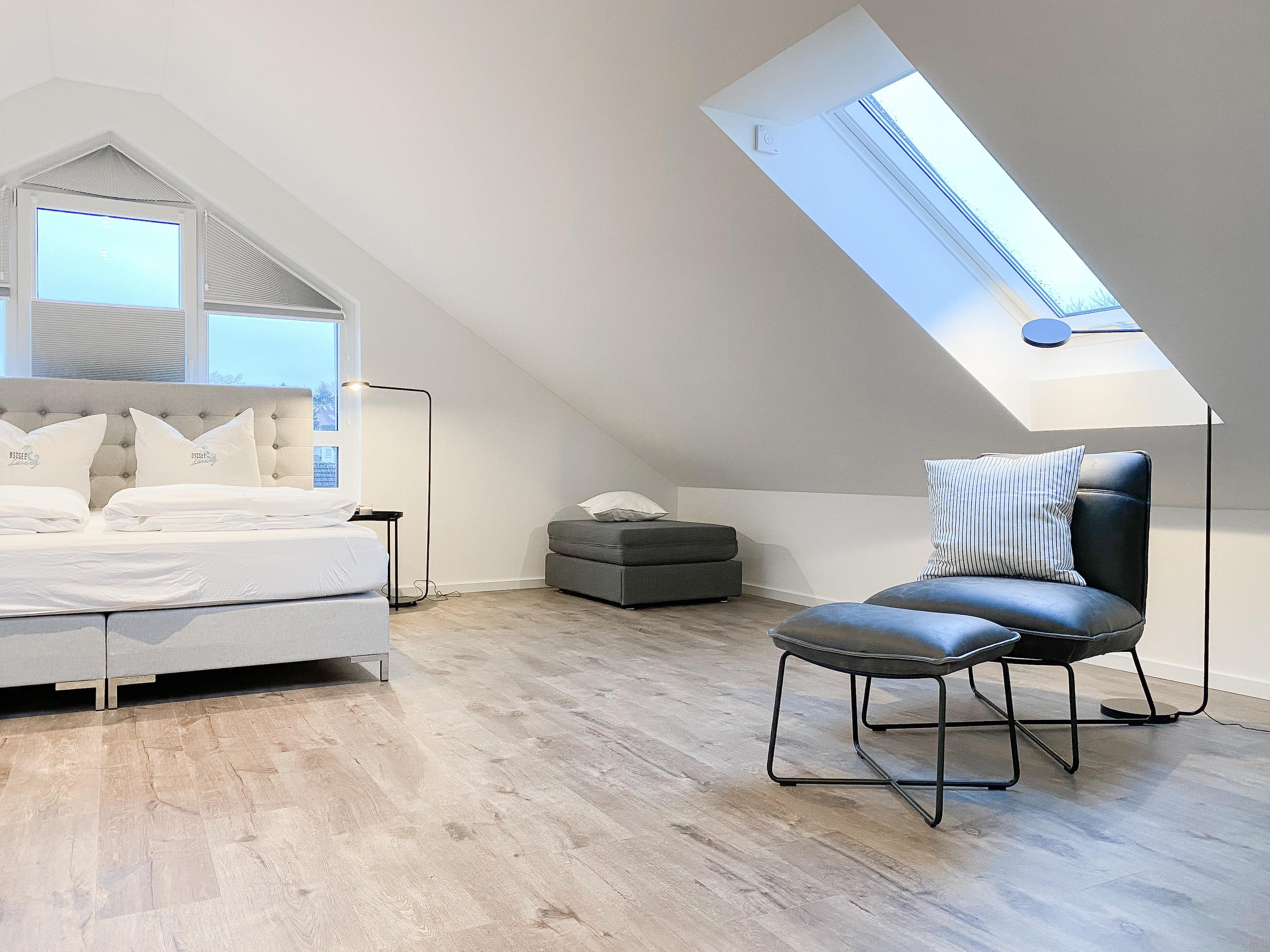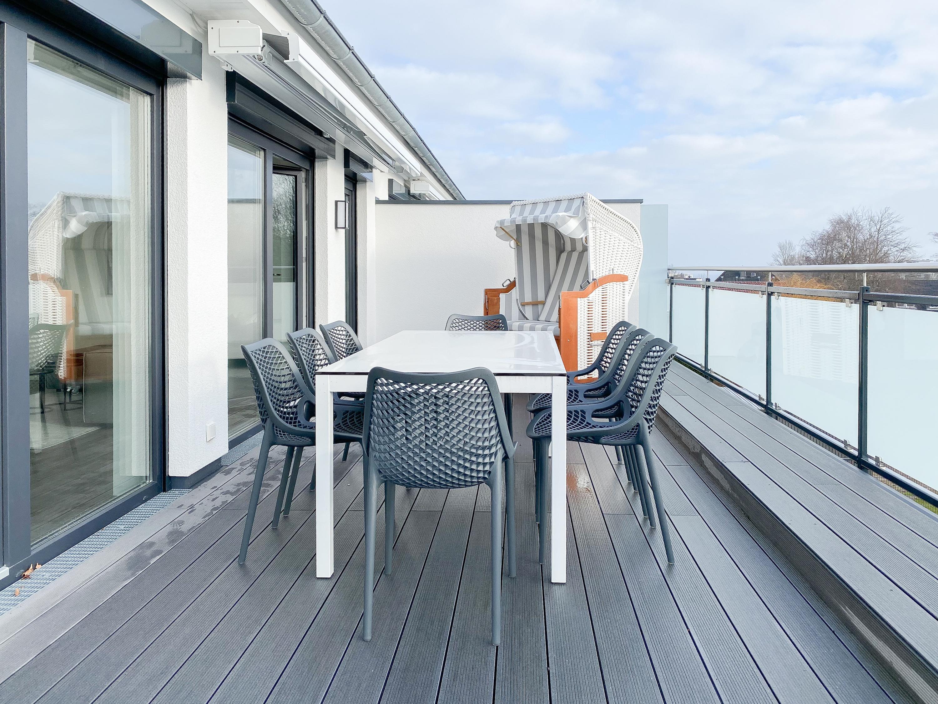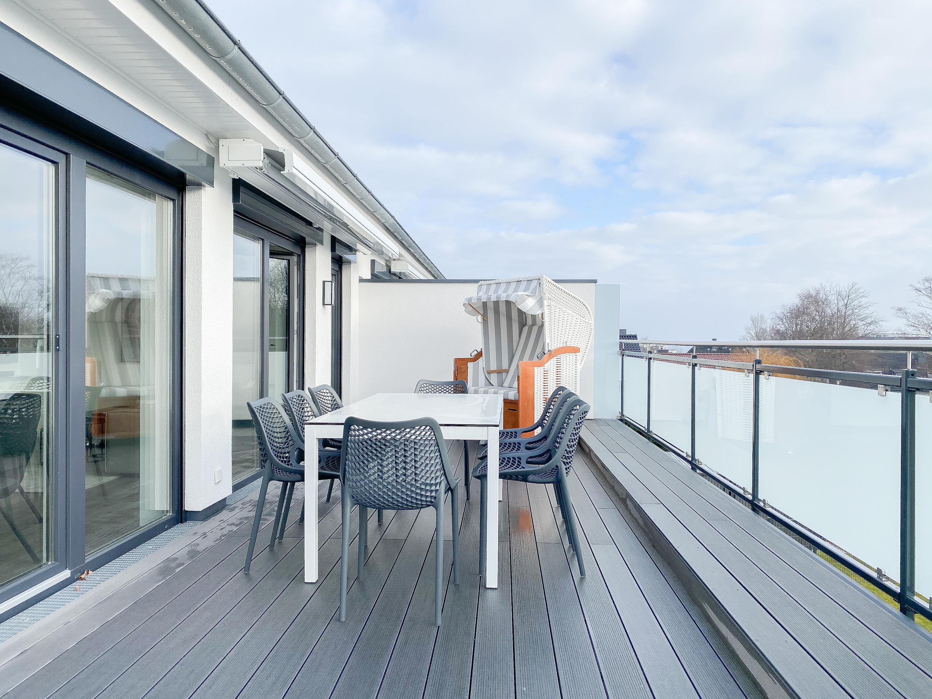 Das Penthouse erstreckt sich über 2 Wohnebenen und bietet auf über 100 qm Wohnfläche ausreichend Raum für 4-6 Personen, um einen entspannten Urlaub zu verleben. Mittelpunkt der unteren Ebene ist der großzügig kombinierte Wohn- Essbereich mit Smart TV und Soundbar. Die anschließende Einbauküche, die dank bester Ausstattung keine Wünsche offen lässt, lädt zum gemeinsamen Kochen ein. Bodentiefe Fensterelemente sorgen für lichtdurchflutete Räumlichkeiten und bieten einen direkten Zugang auf die großzügig angelegte Dachterrasse, auf der Sie im Strandkorb sitzend die Sonne genießen und die Seele baumeln lassen können. Für Schatten sorgt die elektrische Markise und für gemeinsame Mahlzeiten steht eine Essgruppe mit ausreichend Platz für 8 Personen zur Verfügung. Über den Flur erreichen Sie das erste Schlafzimmer, ausgestattet mit einem Boxspringbett (180x200) und TV sowie ein geräumiges Bad mit Walk In Dusche, Fenster und integriertem Waschtrockner. Alle Fenster der unteren Ebene sind mit elektrischen Außenjalousien versehen. Auf der zweiten Wohnebene erwartet Sie ein weiteres Tageslichtbad mit Walk In Dusche und ein äußerst großes Schlafzimmer, ausgestattet mit einem Boxspringbett (180x200) und zwei Hockern, die zum Gästebett ausgezogen werden können. Die Fenster sind mit Black Out Plissees versehen und ein TV ist ebenfalls vorhanden.