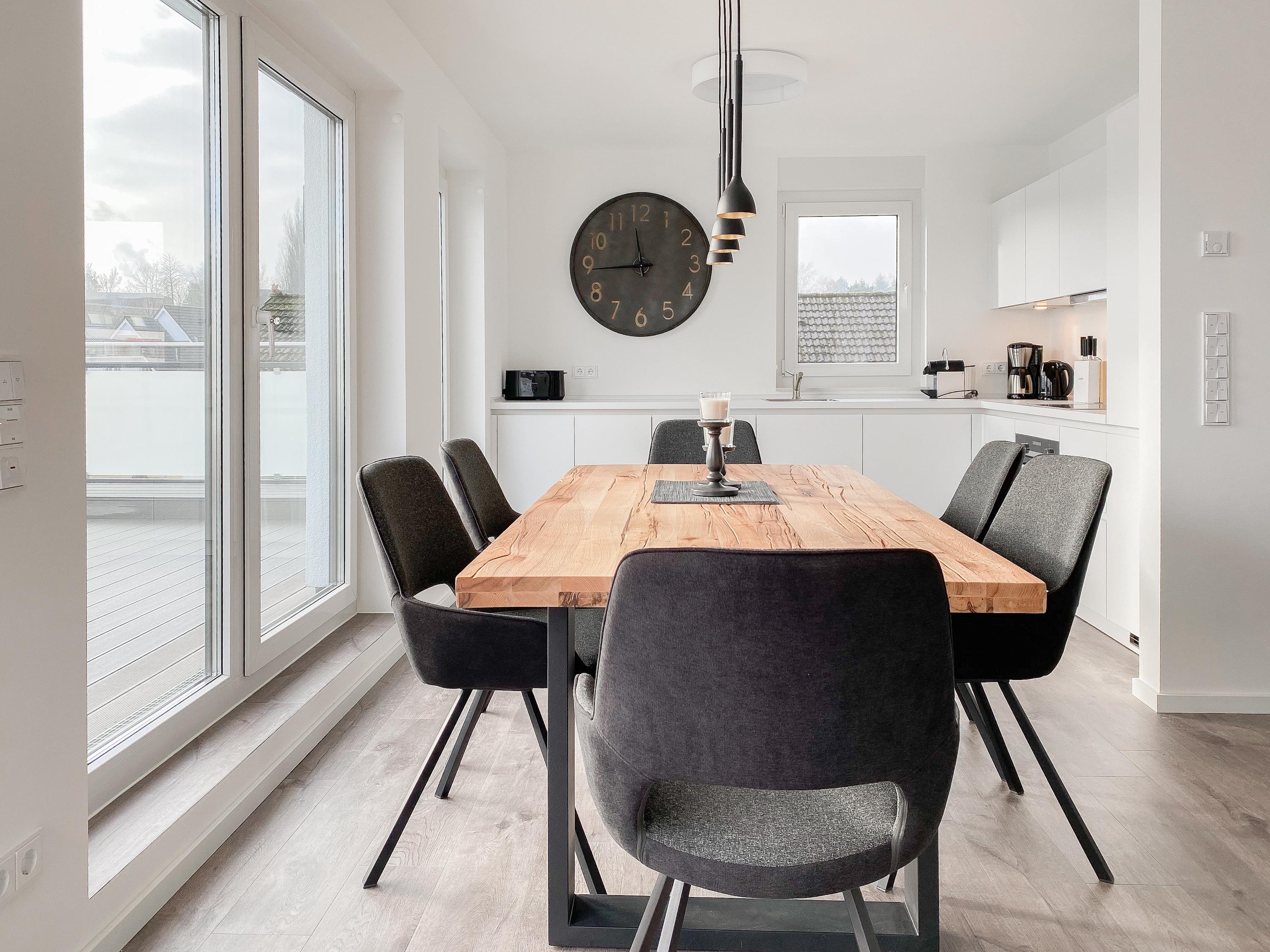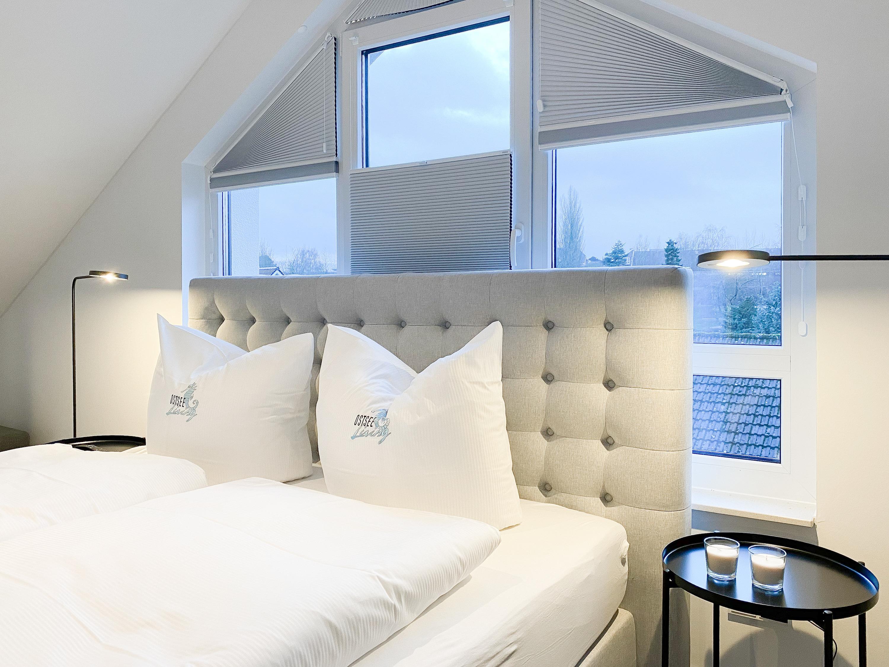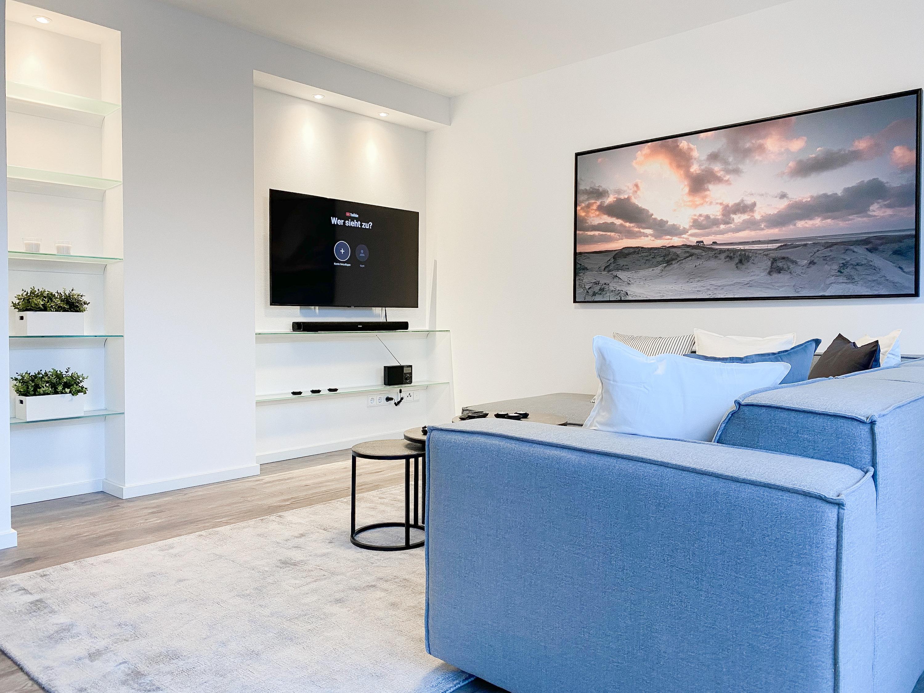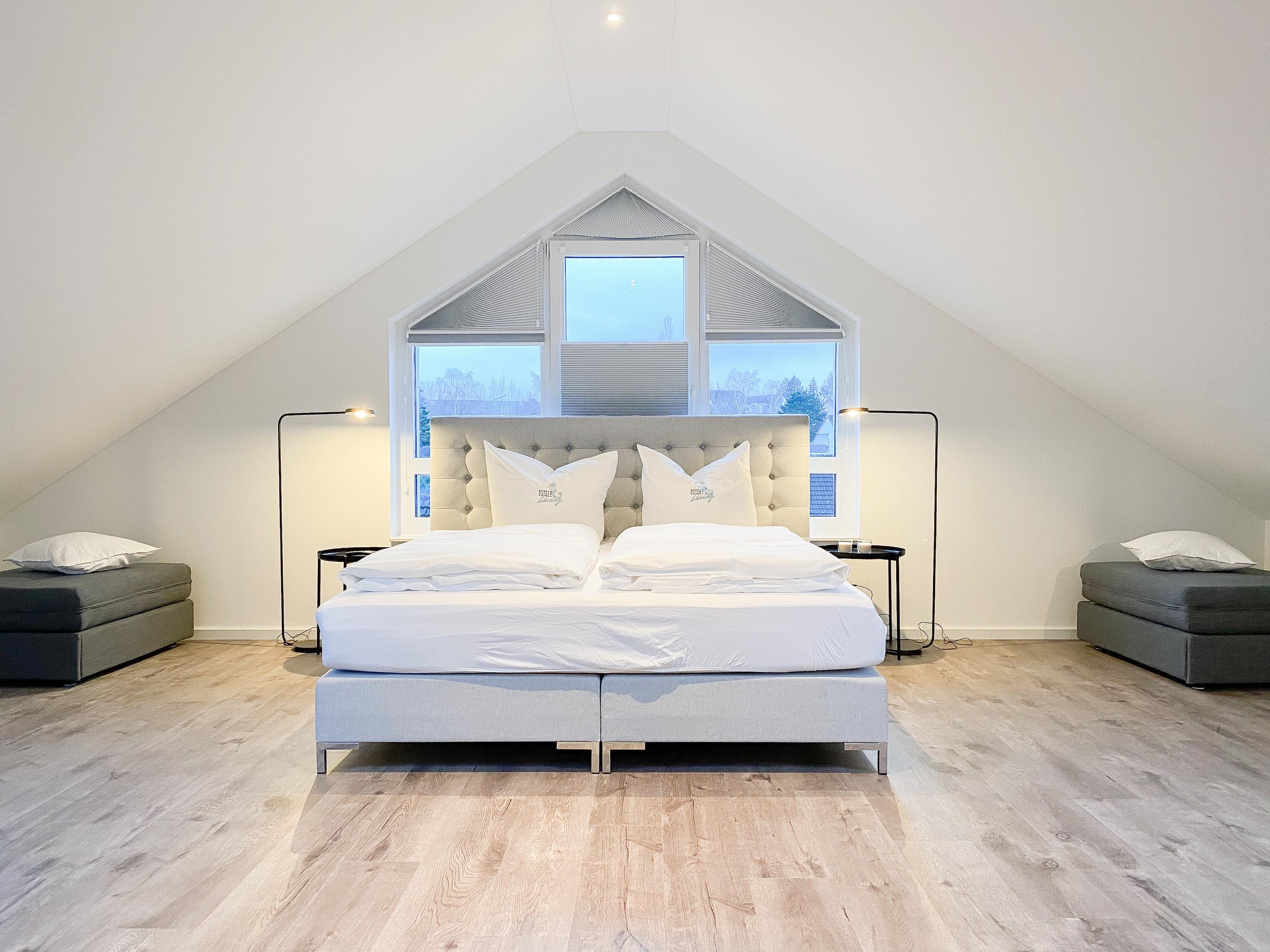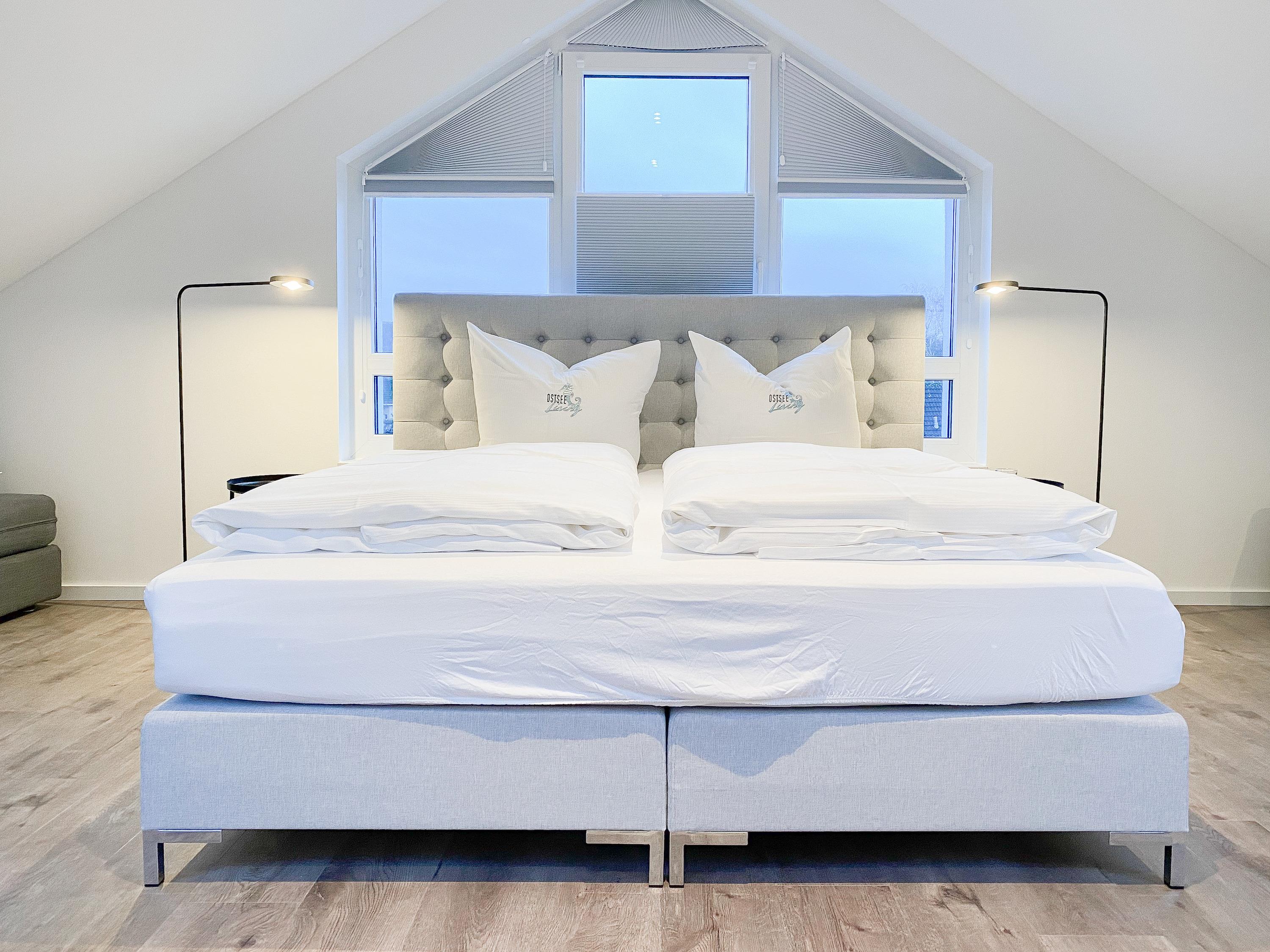 Das Penthouse erstreckt sich über 2 Wohnebenen und bietet auf über 100 qm Wohnfläche ausreichend Raum für 4-6 Personen, um einen entspannten Urlaub zu verleben. Mittelpunkt der unteren Ebene ist der großzügig kombinierte Wohn- Essbereich mit Smart TV und Soundbar. Die anschließende Einbauküche, die dank bester Ausstattung keine Wünsche offen lässt, lädt zum gemeinsamen Kochen ein. Bodentiefe Fensterelemente sorgen für lichtdurchflutete Räumlichkeiten und bieten einen direkten Zugang auf die großzügig angelegte Dachterrasse, auf der Sie im Strandkorb sitzend die Sonne genießen und die Seele baumeln lassen können. Für Schatten sorgt die elektrische Markise und für gemeinsame Mahlzeiten steht eine Essgruppe mit ausreichend Platz für 8 Personen zur Verfügung. Über den Flur erreichen Sie das erste Schlafzimmer, ausgestattet mit einem Boxspringbett (180x200) und TV sowie ein geräumiges Bad mit Walk In Dusche, Fenster und integriertem Waschtrockner. Alle Fenster der unteren Ebene sind mit elektrischen Außenjalousien versehen. Auf der zweiten Wohnebene erwartet Sie ein weiteres Tageslichtbad mit Walk In Dusche und ein äußerst großes Schlafzimmer, ausgestattet mit einem Boxspringbett (180x200) und zwei Hockern, die zum Gästebett ausgezogen werden können. Die Fenster sind mit Black Out Plissees versehen und ein TV ist ebenfalls vorhanden.