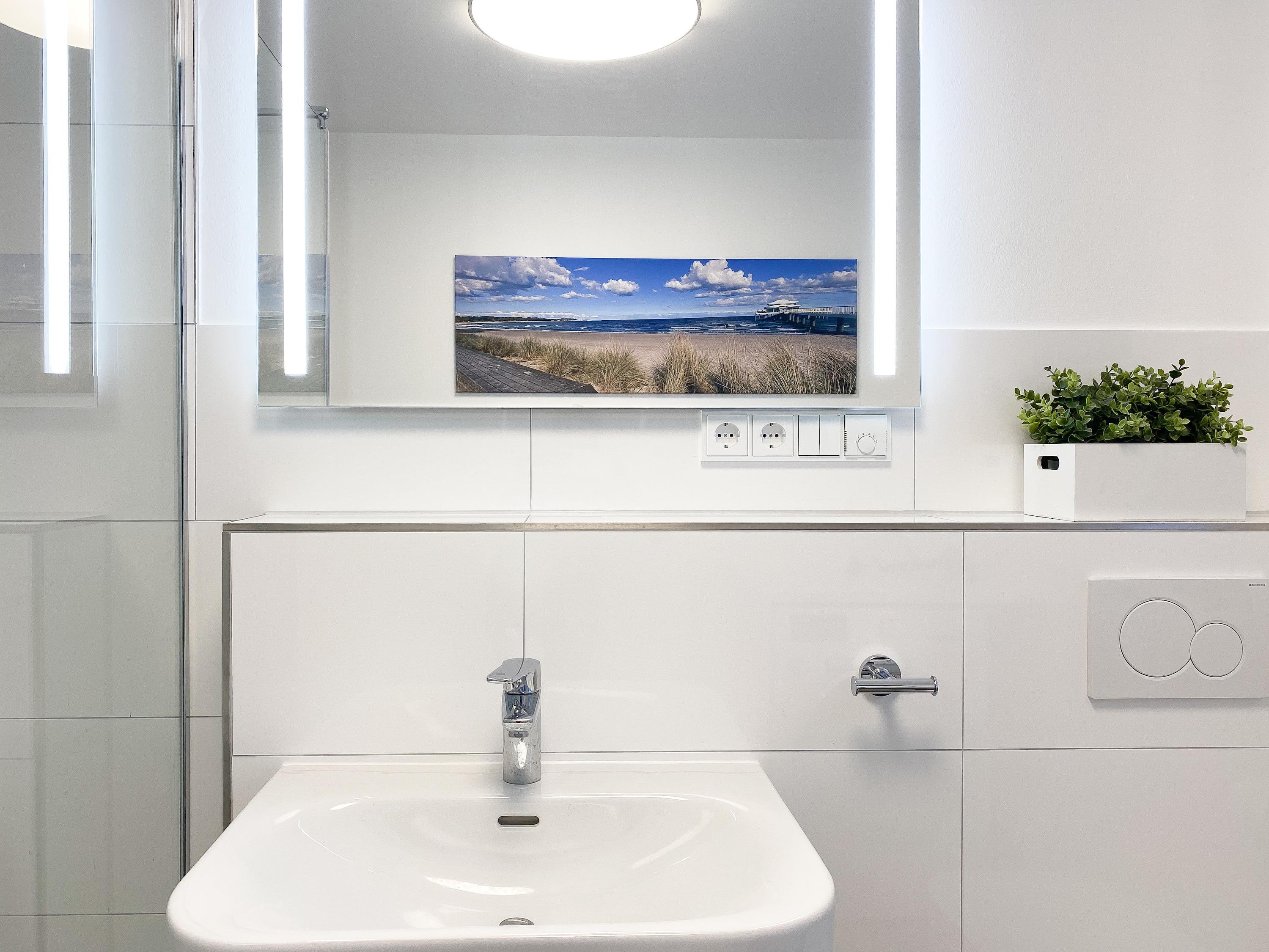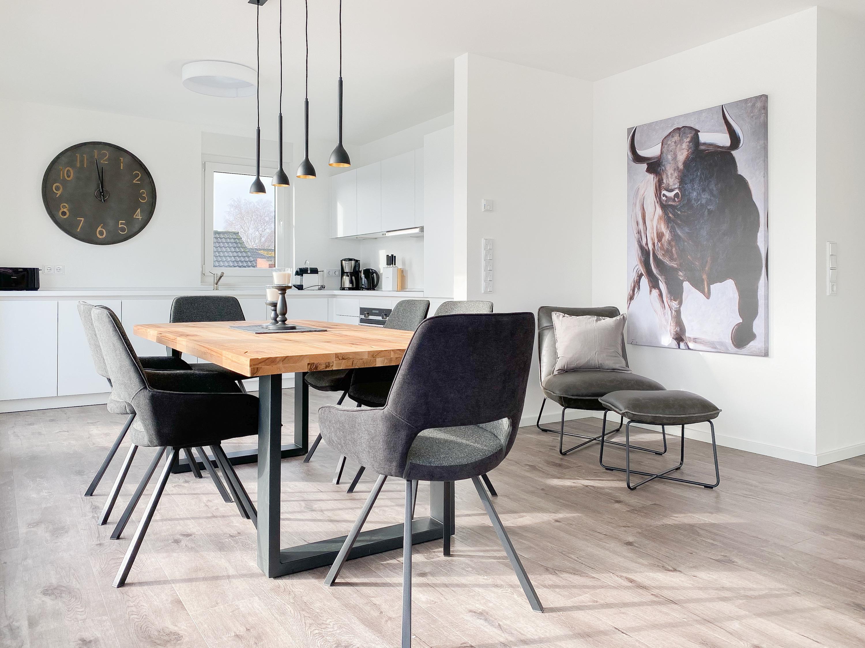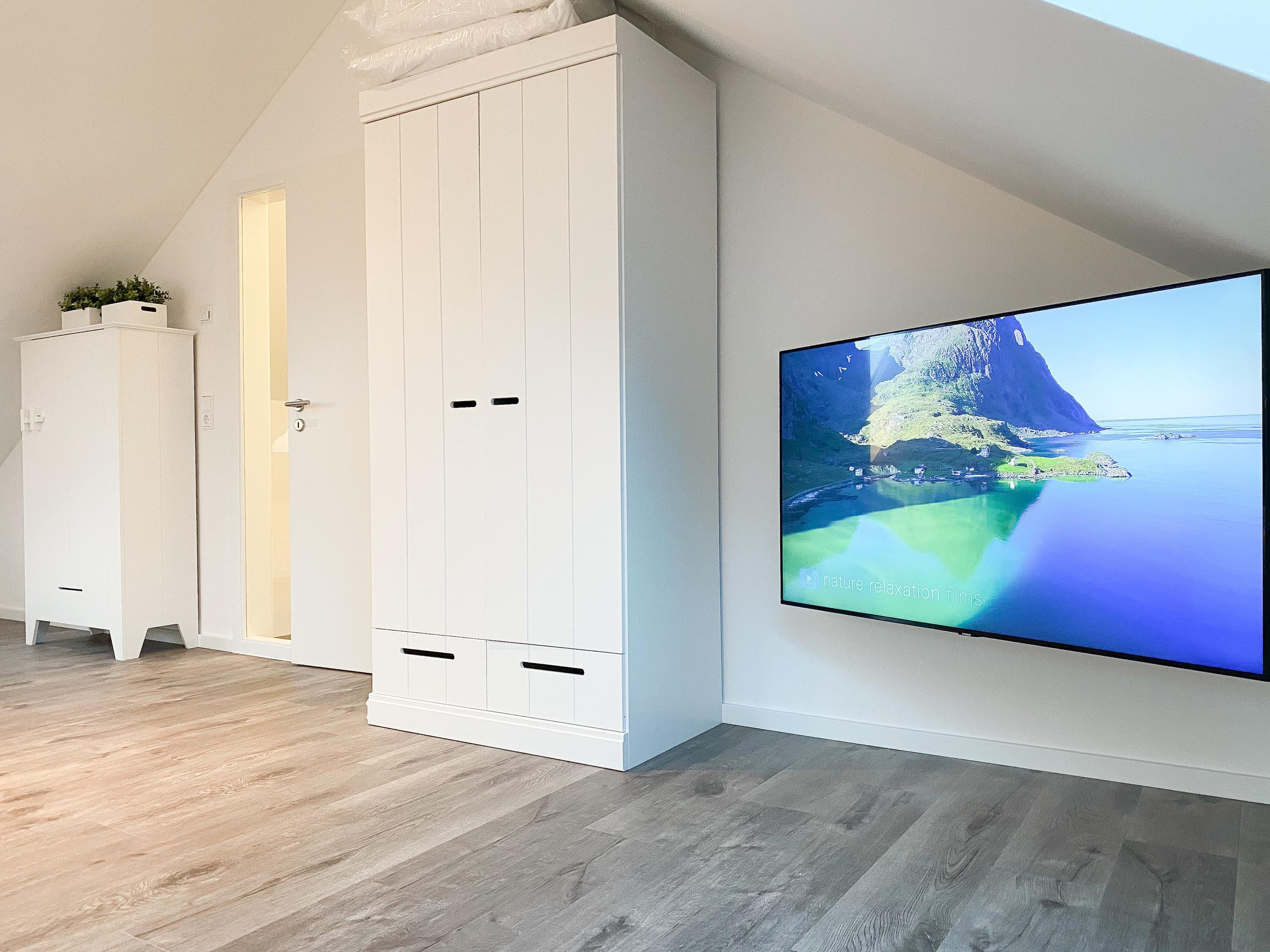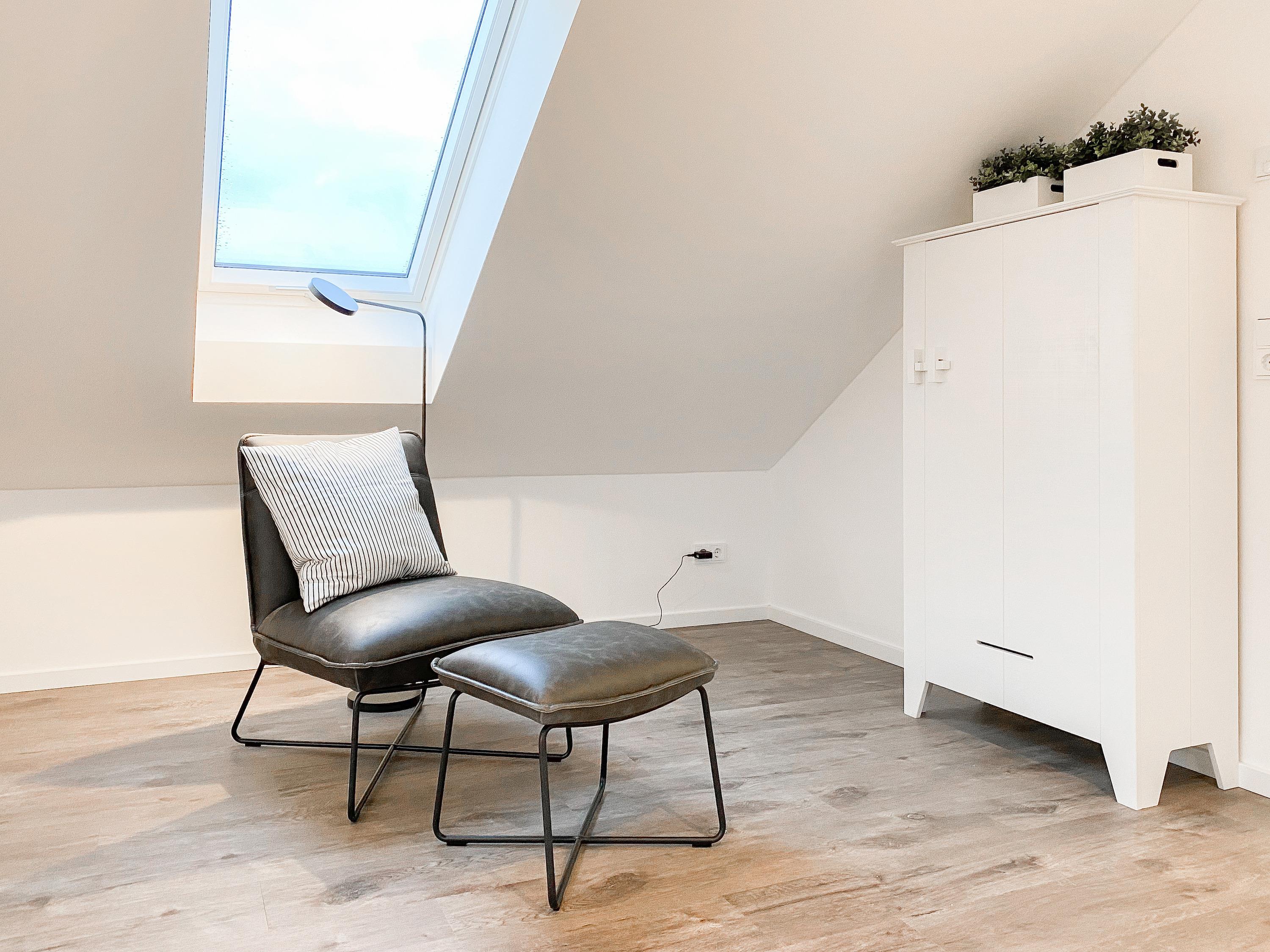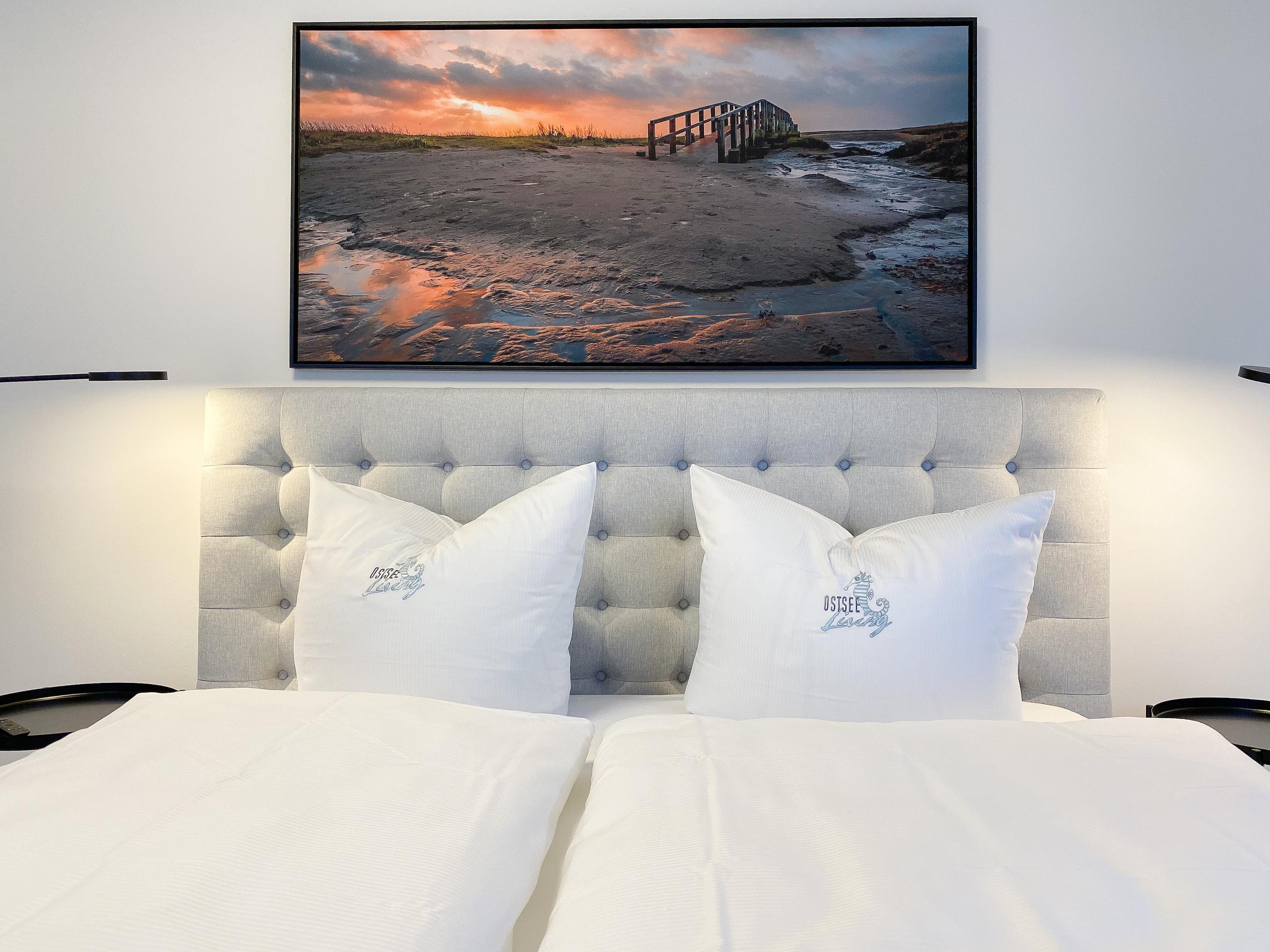 Das Penthouse erstreckt sich über 2 Wohnebenen und bietet auf über 100 qm Wohnfläche ausreichend Raum für 4-6 Personen, um einen entspannten Urlaub zu verleben. Mittelpunkt der unteren Ebene ist der großzügig kombinierte Wohn- Essbereich mit Smart TV und Soundbar. Die anschließende Einbauküche, die dank bester Ausstattung keine Wünsche offen lässt, lädt zum gemeinsamen Kochen ein. Bodentiefe Fensterelemente sorgen für lichtdurchflutete Räumlichkeiten und bieten einen direkten Zugang auf die großzügig angelegte Dachterrasse, auf der Sie im Strandkorb sitzend die Sonne genießen und die Seele baumeln lassen können. Für Schatten sorgt die elektrische Markise und für gemeinsame Mahlzeiten steht eine Essgruppe mit ausreichend Platz für 8 Personen zur Verfügung. Über den Flur erreichen Sie das erste Schlafzimmer, ausgestattet mit einem Boxspringbett (180x200) und TV sowie ein geräumiges Bad mit Walk In Dusche, Fenster und integriertem Waschtrockner. Alle Fenster der unteren Ebene sind mit elektrischen Außenjalousien versehen. Auf der zweiten Wohnebene erwartet Sie ein weiteres Tageslichtbad mit Walk In Dusche und ein äußerst großes Schlafzimmer, ausgestattet mit einem Boxspringbett (180x200) und zwei Hockern, die zum Gästebett ausgezogen werden können. Die Fenster sind mit Black Out Plissees versehen und ein TV ist ebenfalls vorhanden.
