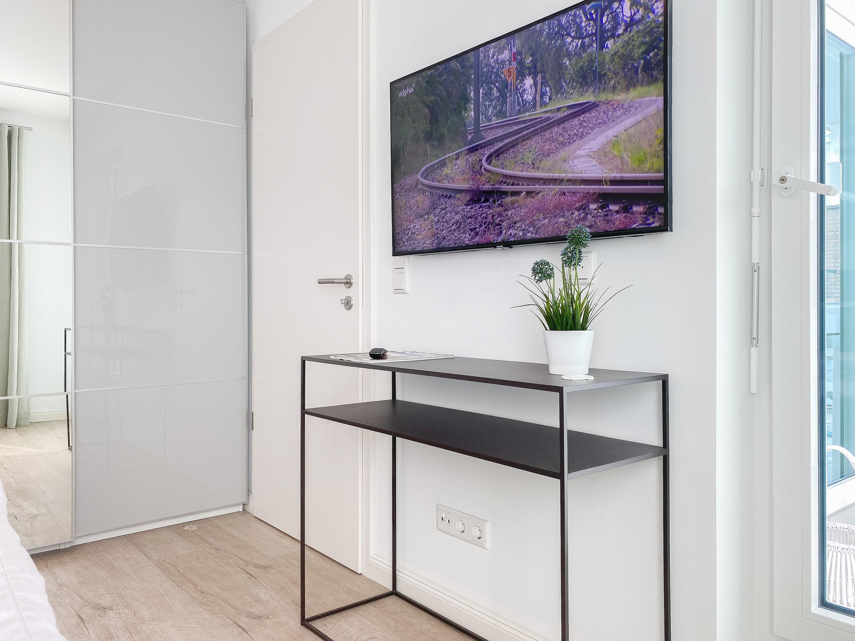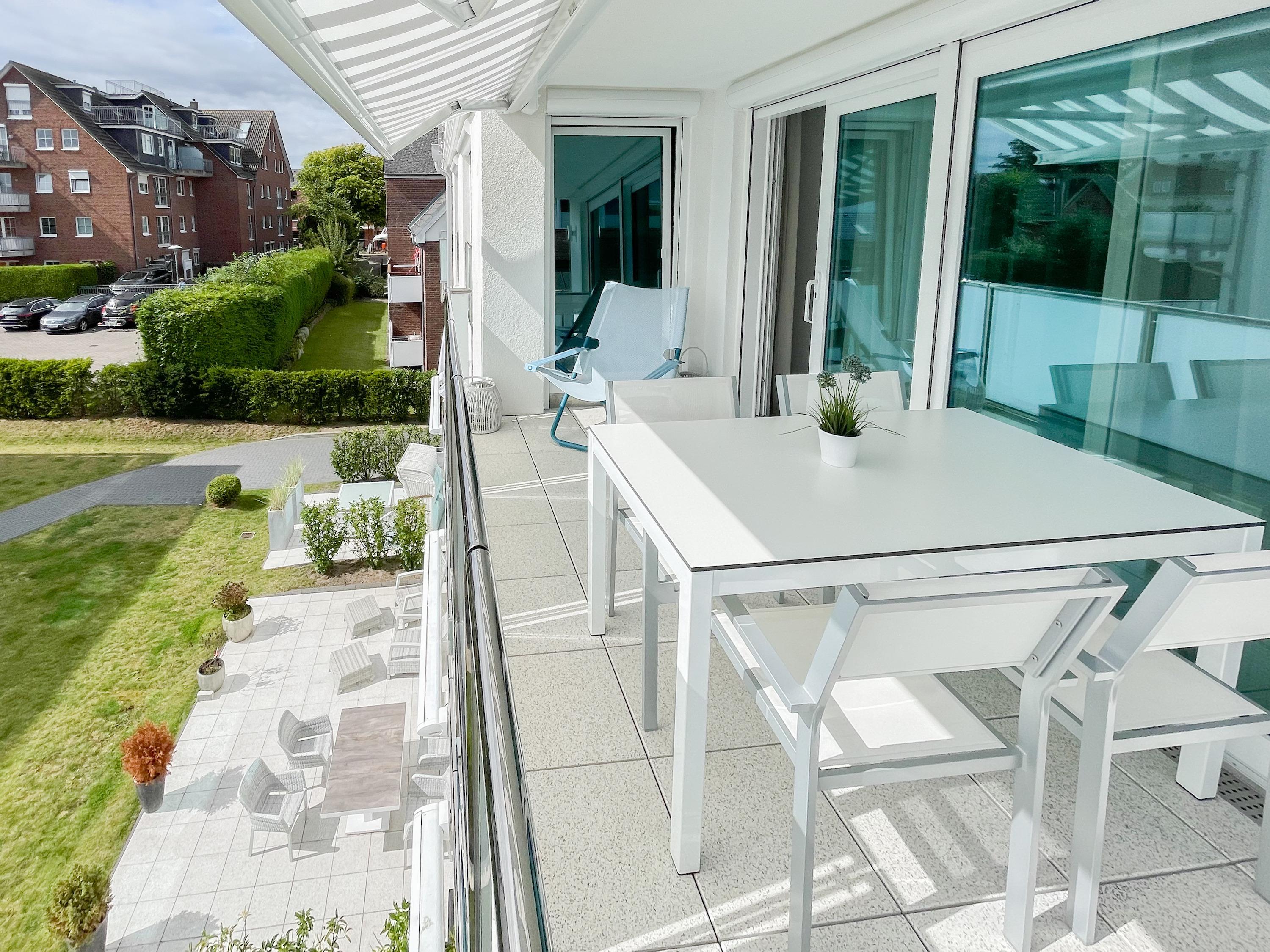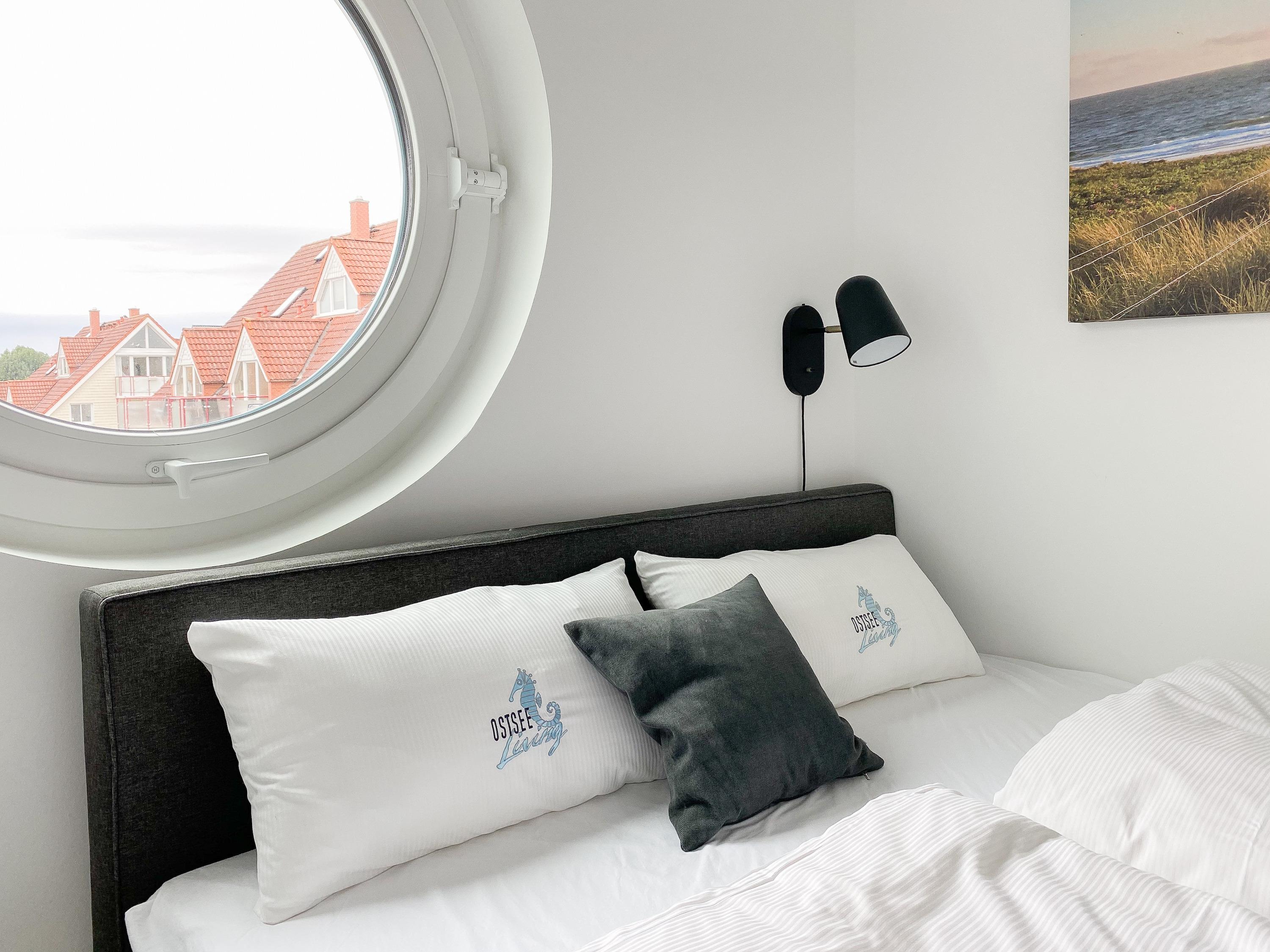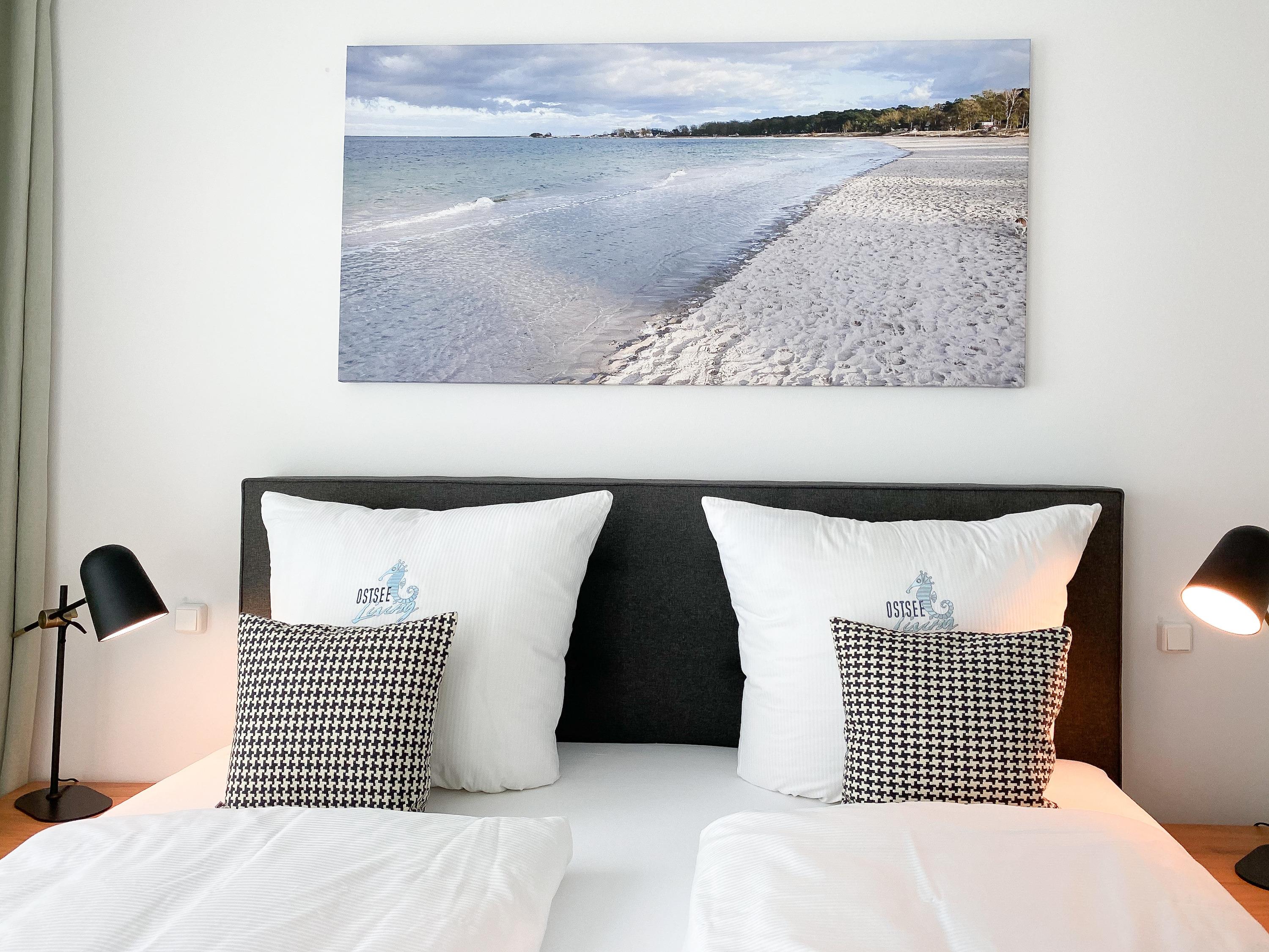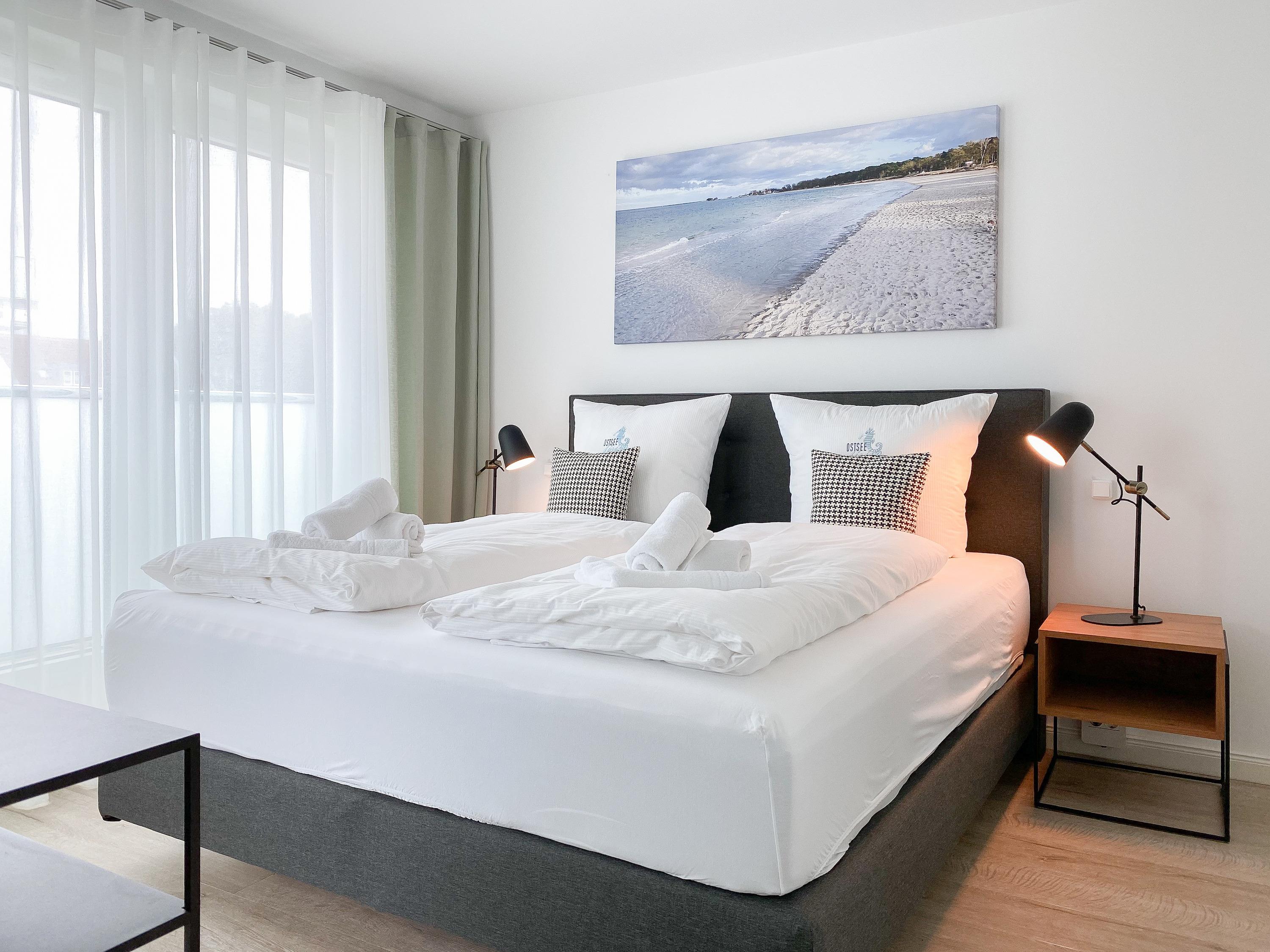 Es erwarten Sie luftige und lichtdurchflutete Räumlichkeiten mit bodentiefen Fensterflächen, äußerst hochwertig ausgestattet und geschmackvoll nach offenem Raumkonzept gestaltet.[nbsp] Panoramafenster umschließen den großzügigen Essbereich und bieten einen wunderschönen Blick bis auf die Ostsee. Auf dem vorgelagerten Minibalkon lassen sich beim Morgenkaffee die ersten Sonnenstrahlen mit Meerblick genießen. Gekocht wird in der anschließenden Wohnküche, die technisch bestens ausgestattet ist.[nbsp] Der Wohnbereich ist mit einem Sofa, 2 Einzelsesseln und einem Relaxsessel eingerichtet. TV (Frame), Bluetooth und Internetzugang über WLAN stehen zur Verfügung. Der großzügige Südbalkon verfügt über eine elektrische Markise, Gartenmöbel und 2 Sonnensessel. Es stehen 2 separate Schlafzimmer mit hochwertigen Boxspringdoppelbetten (180x200 und 160x200) zur Verfügung. Der größere Schlafraum verfügt über einen weiteren TV und ein modernes Bad ensuite mit Dusche und kleiner Badewanne. Ein zweites Duschbad befindet sich im Eingangsbereich gegenüber des kleineren Schlafzimmers, dessen Rundfenster mittels eines Rollos vollständig verdunkelt werden kann. Alle weiteren Fenster der Wohnung sind mit elektrischen Außenjalousien versehen.