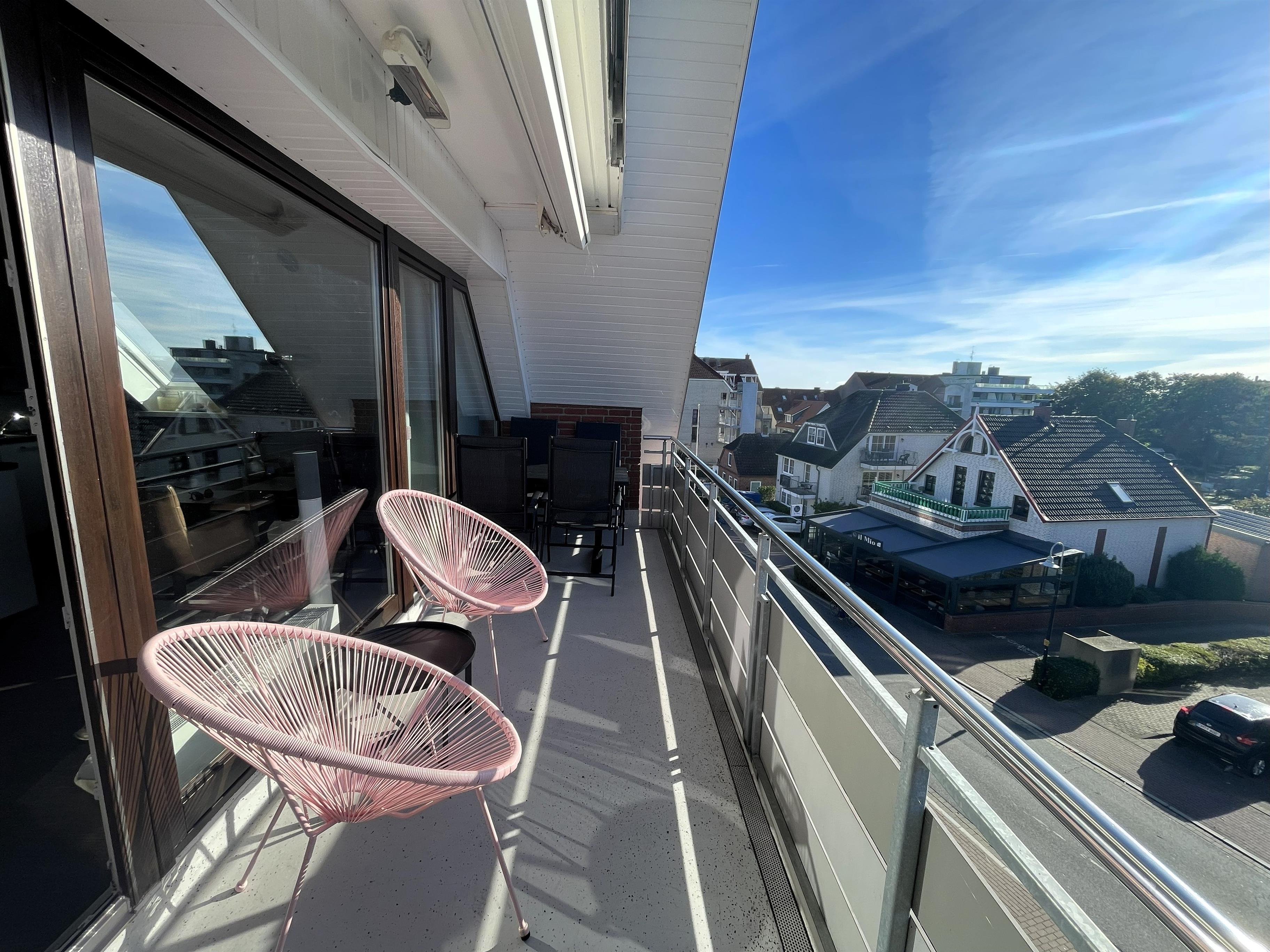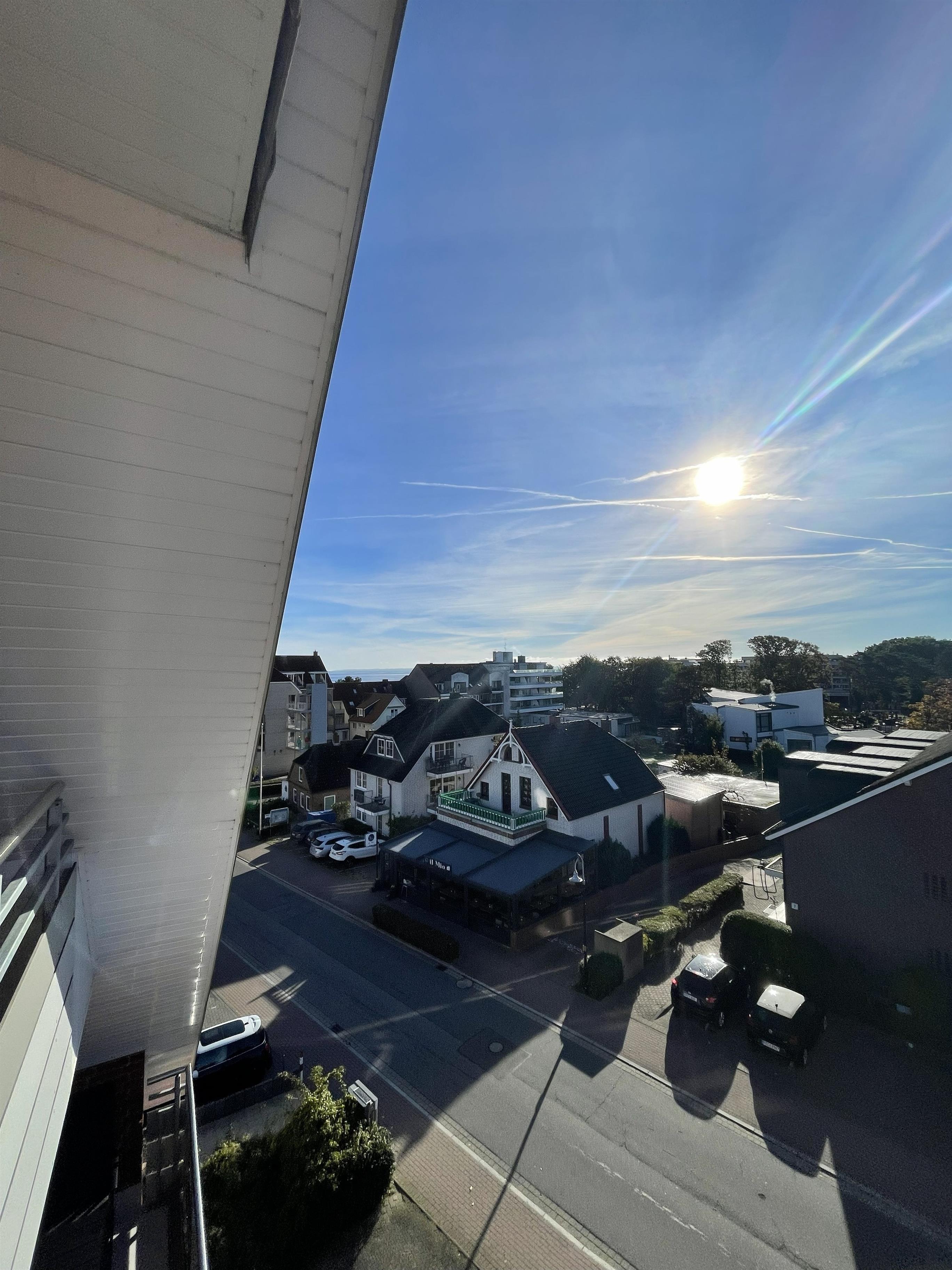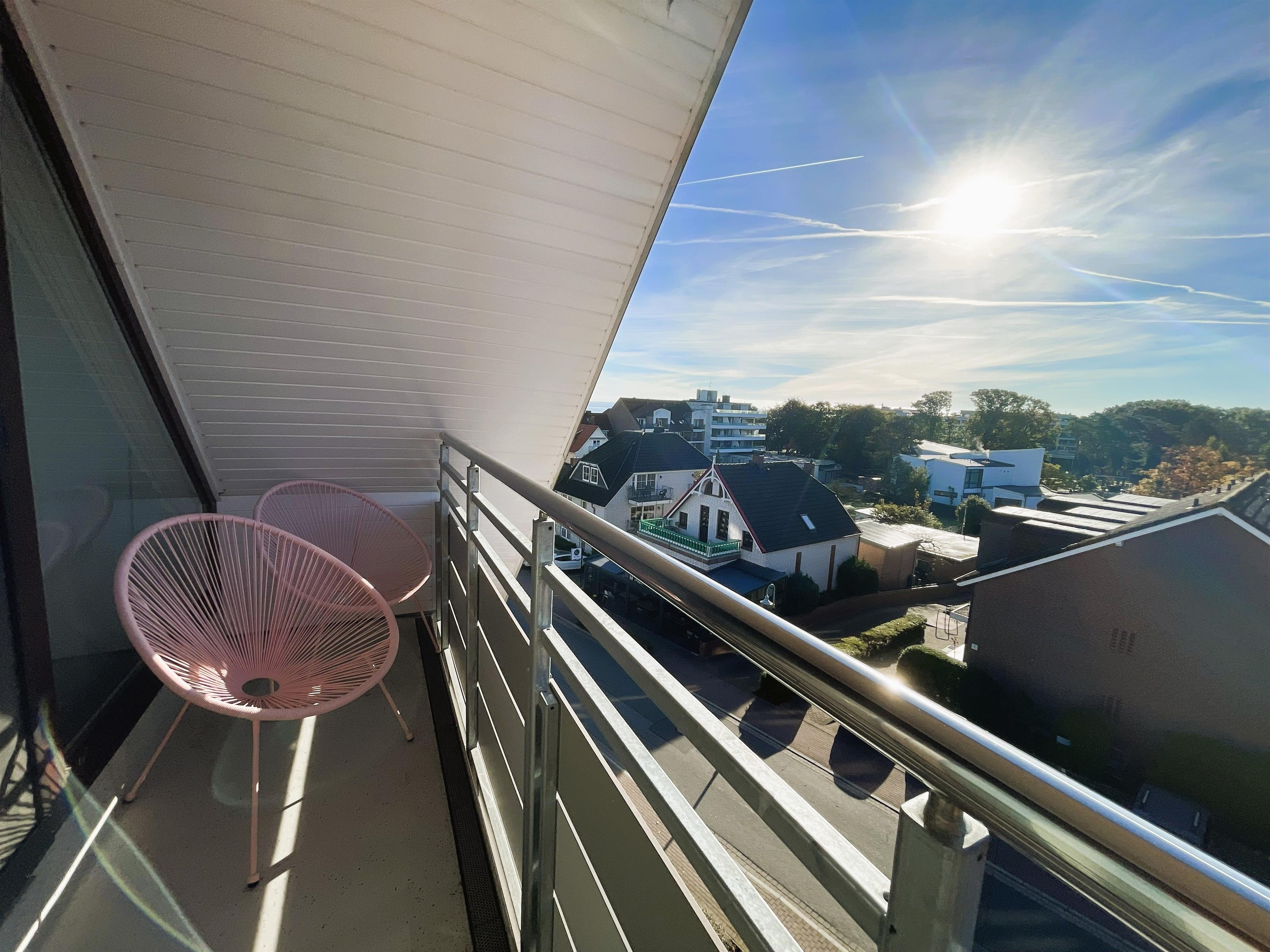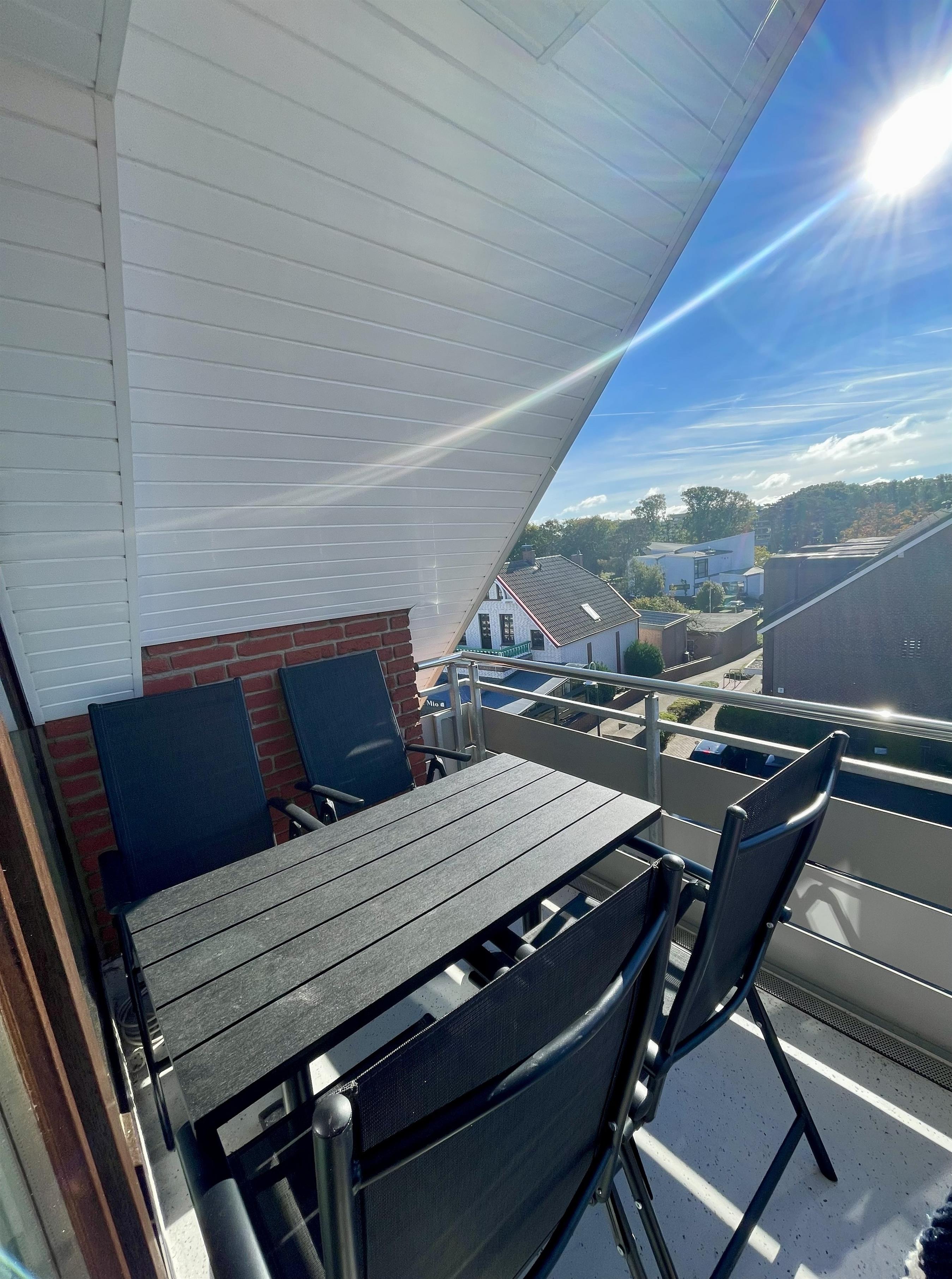 Vom Wohnbereich aus gelangen Sie auf den Süd-Balkon mit leichtem Meerblick – der perfekte Ort für genussvolle Stunden im Freien. Hier befindet sich eine elegante Essecke für vier Personen – ideal für ein gemütliches Frühstück in der Morgensonne oder ein entspanntes Abendessen mit Blick über Scharbeutz. Genießen Sie die frische Ostseeluft und das besondere Licht der Lübecker Bucht.