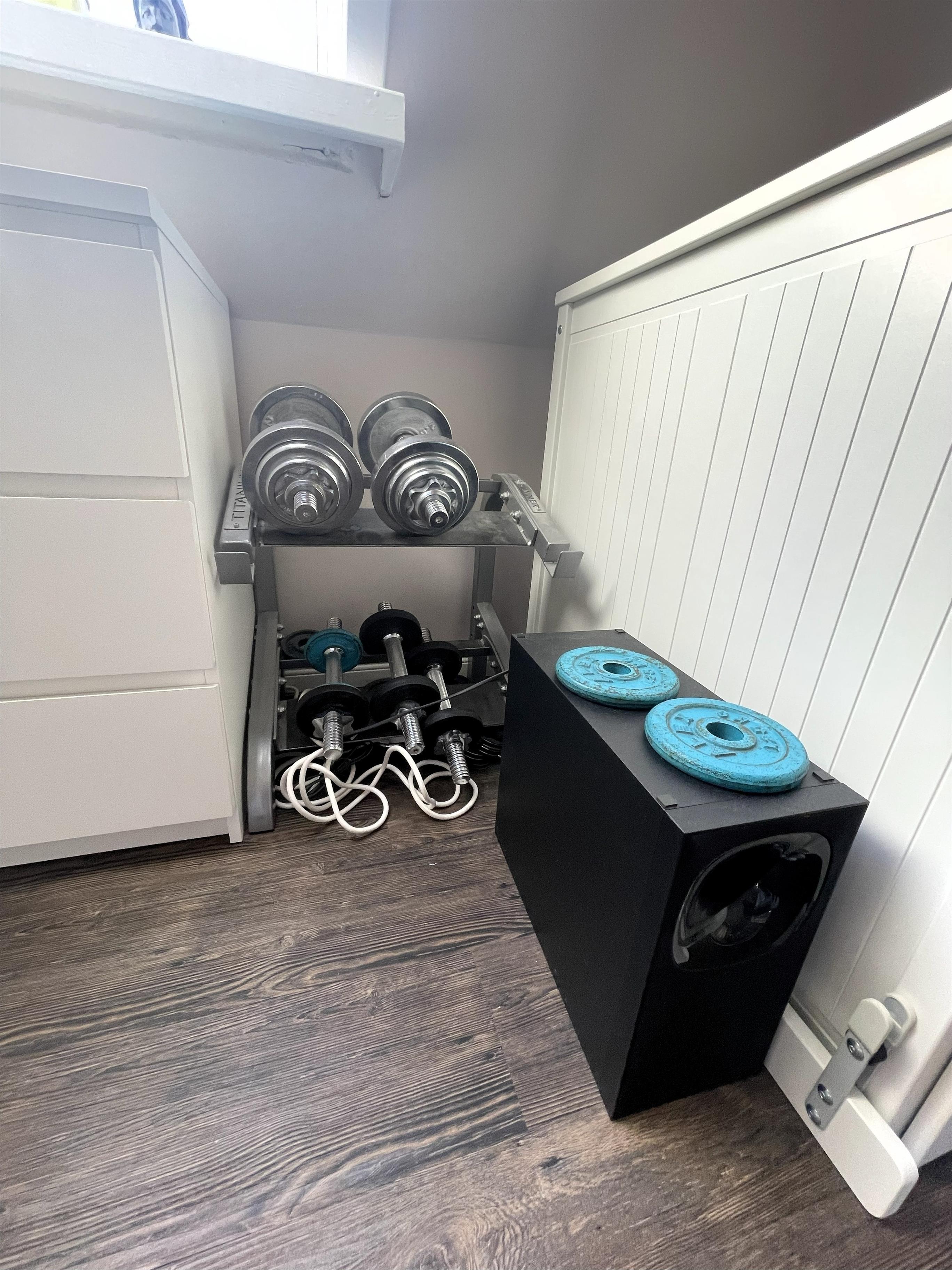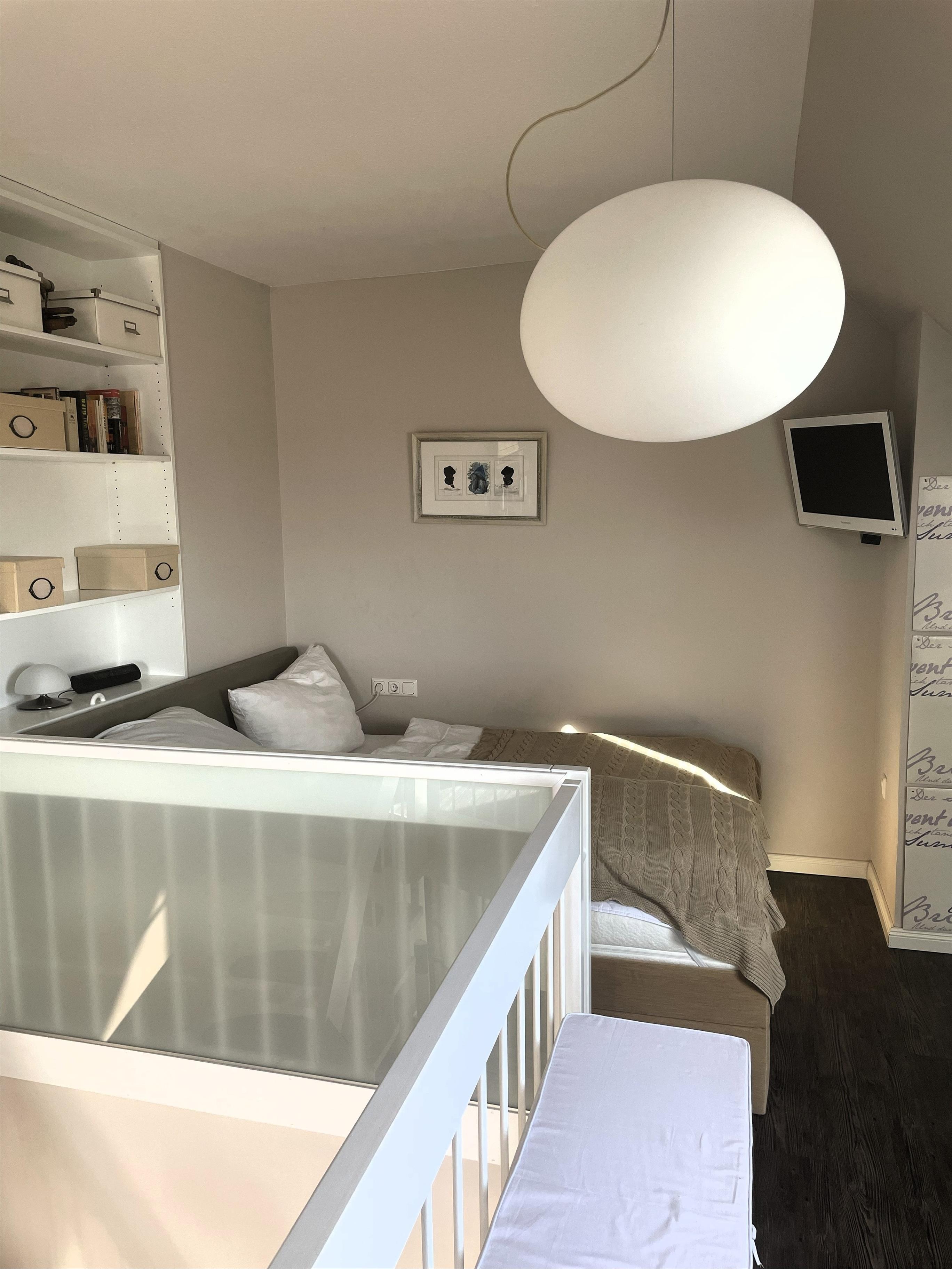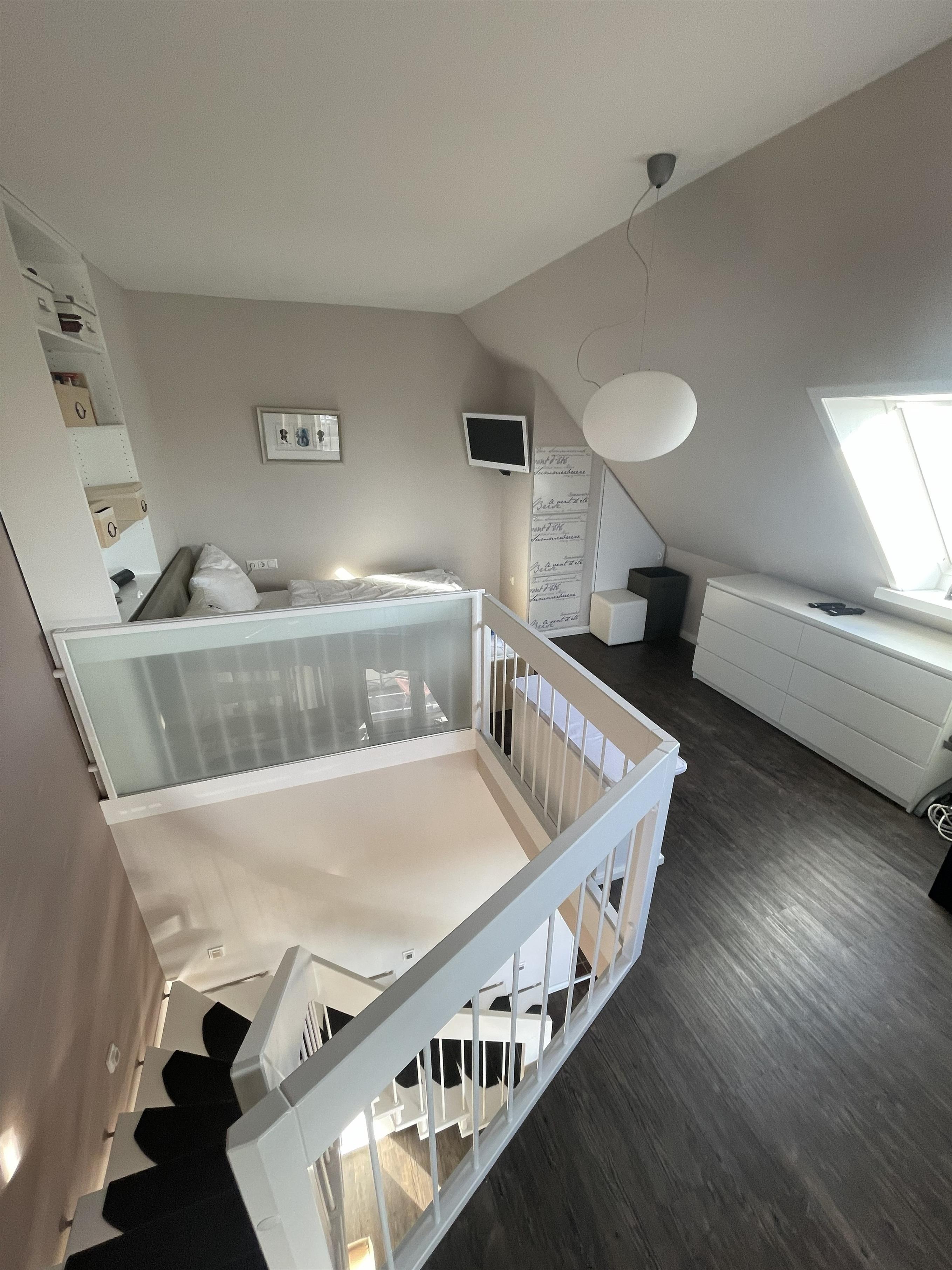 Über die stilvolle Wendeltreppe gelangen Sie in den offen gestalteten Schlaf- und Relaxbereich. Hier erwartet Sie ein gemütliches Daybed zum Entspannen, Lesen oder für Filmabende auf dem großen Flachbildfernseher mit Soundsystem. Wer aktiv bleiben möchte, nutzt das bereitliegende Hantelset.