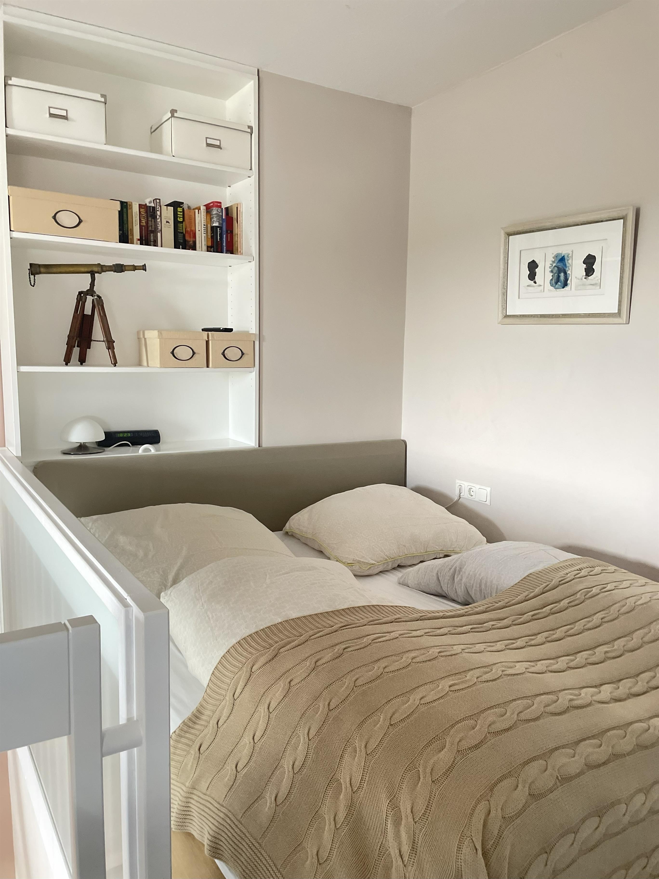Das komfortable Doppelbett (1,60 × 2,00 m) – Einstieg nur über das Fußende möglich – sorgt für erholsamen Schlaf, während sich das Daybed zu einem Doppelbett für zwei Kinder verwandeln lässt – ideal für den Familienurlaub an der Ostsee.