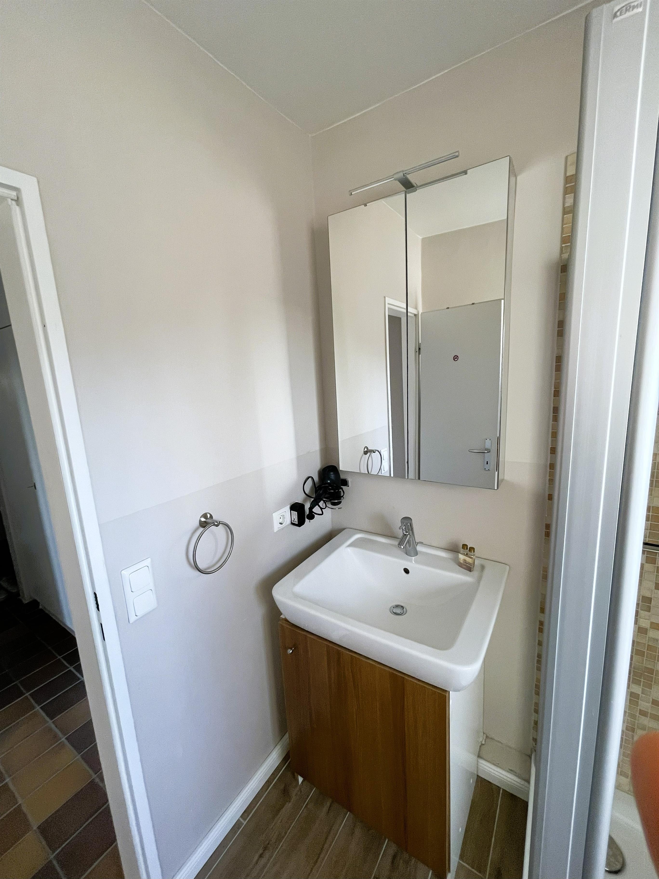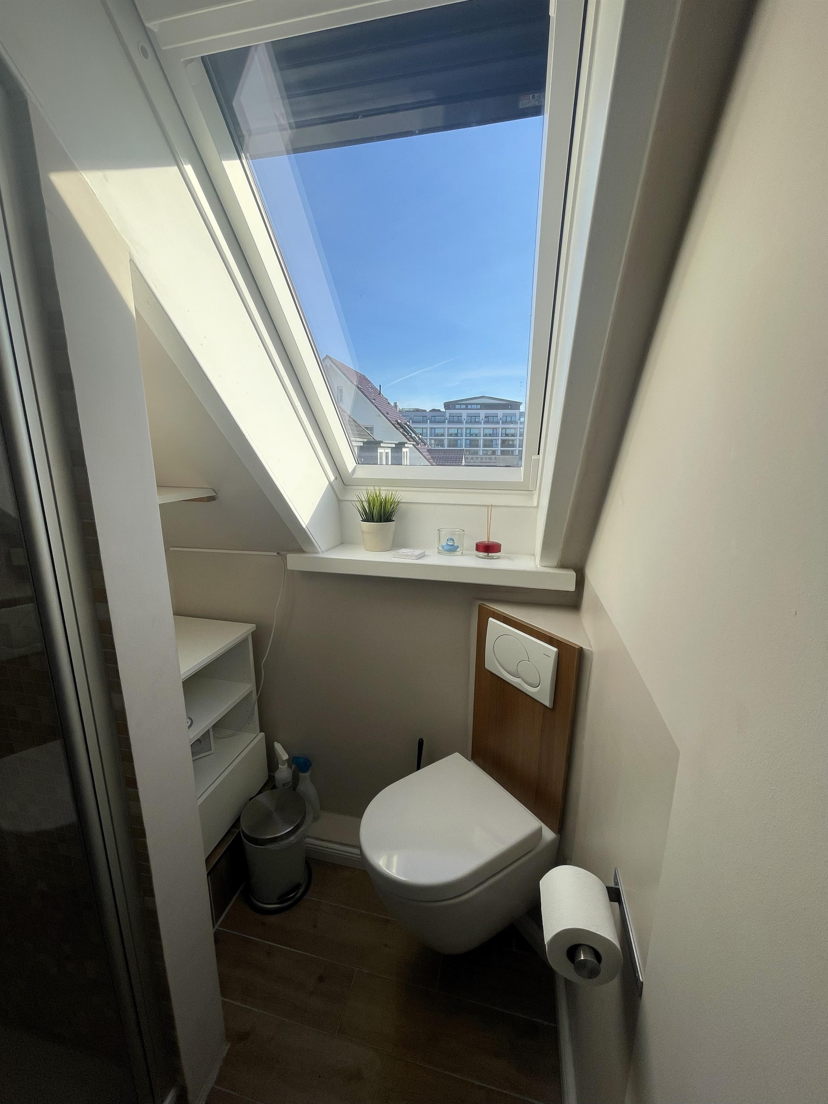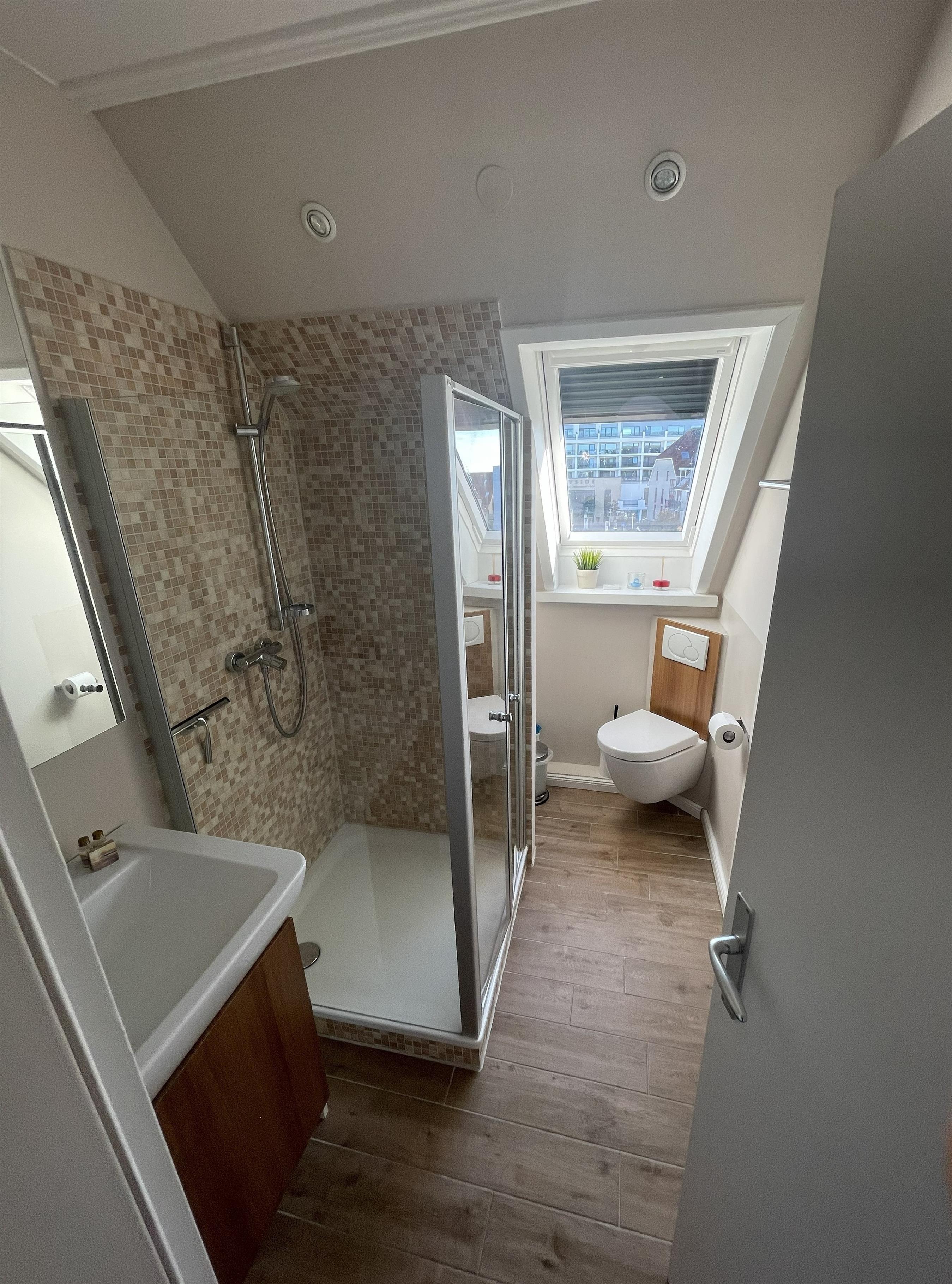 Das Badezimmer in der unteren Etage ist hell und modern gestaltet, mit Dusche, Waschbecken, Spiegelschrank und großem Dachfenster. Ein Föhn steht selbstverständlich auch zur Verfügung.