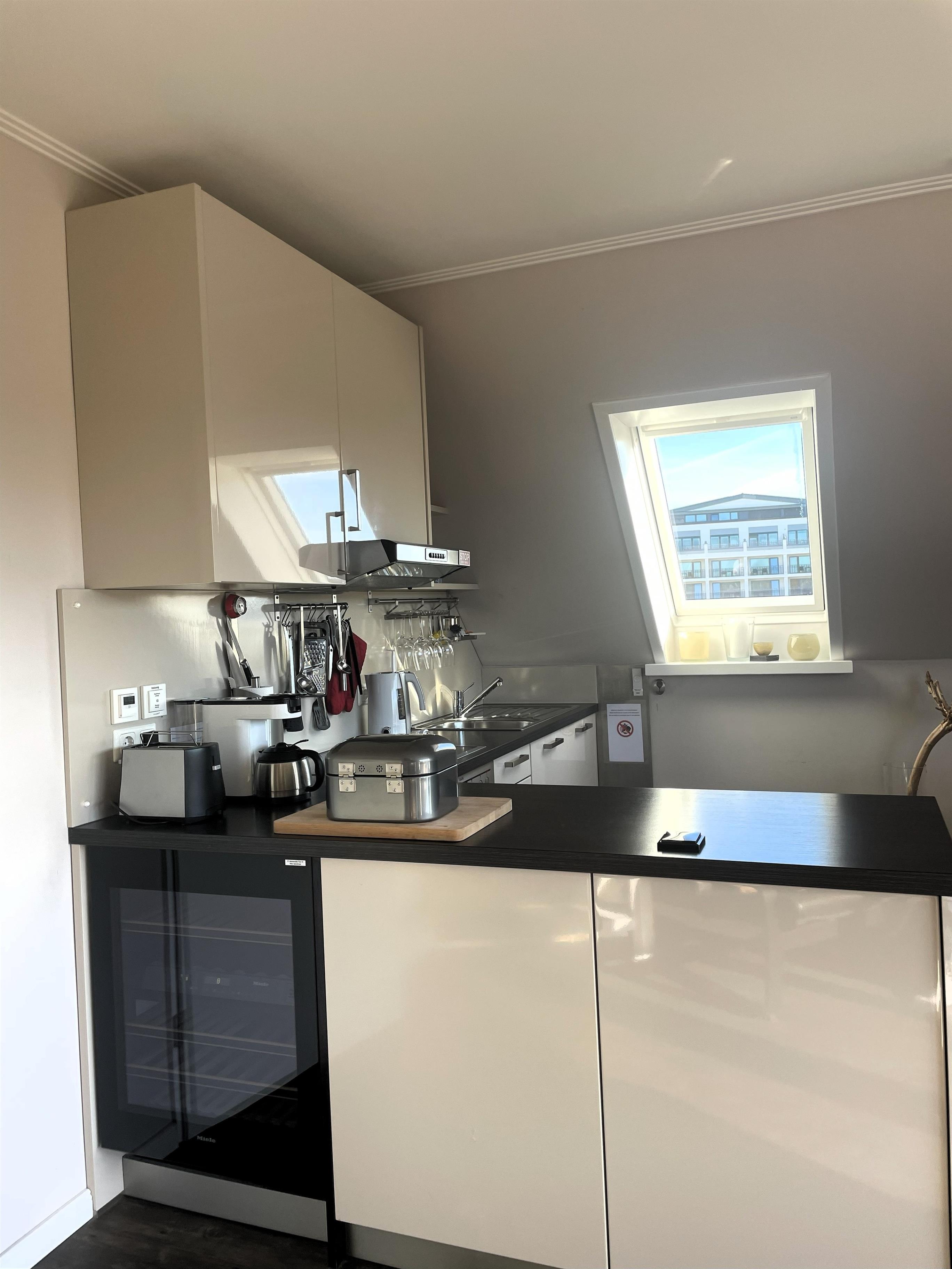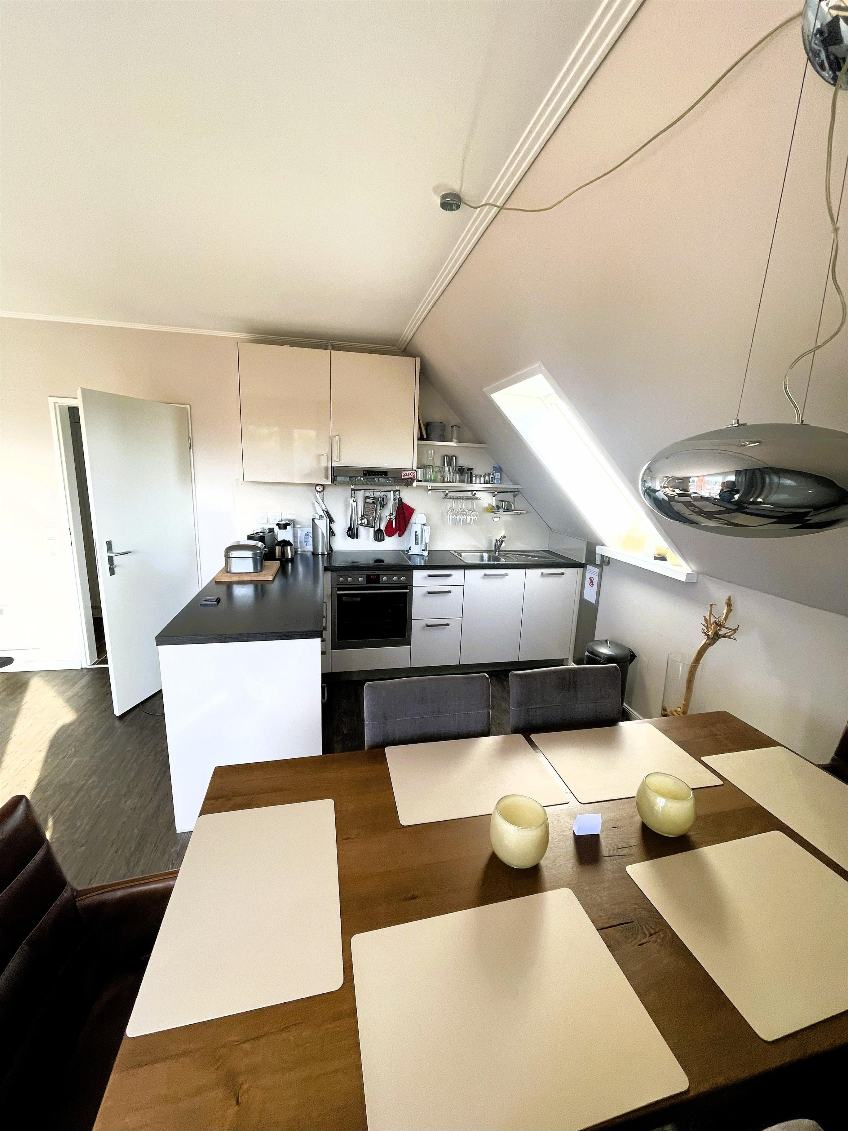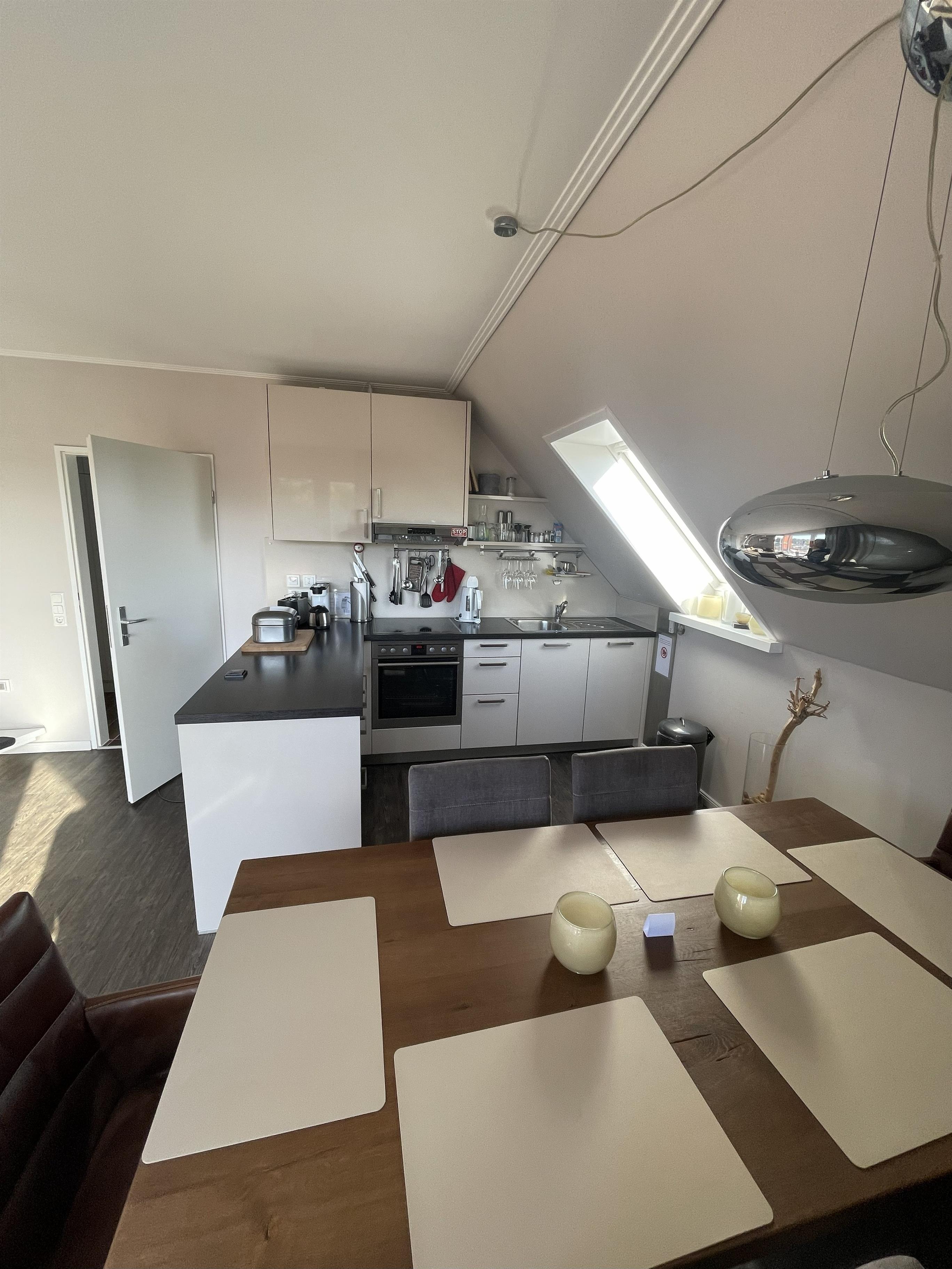 In der dritten Etage betreten Sie einen hellen Flur, der direkt in den modernen Wohn-Essbereich mit angeschlossener Pantryküche führt. Warme Farben, natürliche Materialien und liebevolle Details schaffen ein Ambiente, in dem man sofort zur Ruhe kommt. Das komfortable Sofa und der gemütliche Schwingsessel laden zum Entspannen ein – beim Fernsehen mit TV und DVD-Player, beim Lesen oder beim Blick in den Scharbeutzer Kurpark.