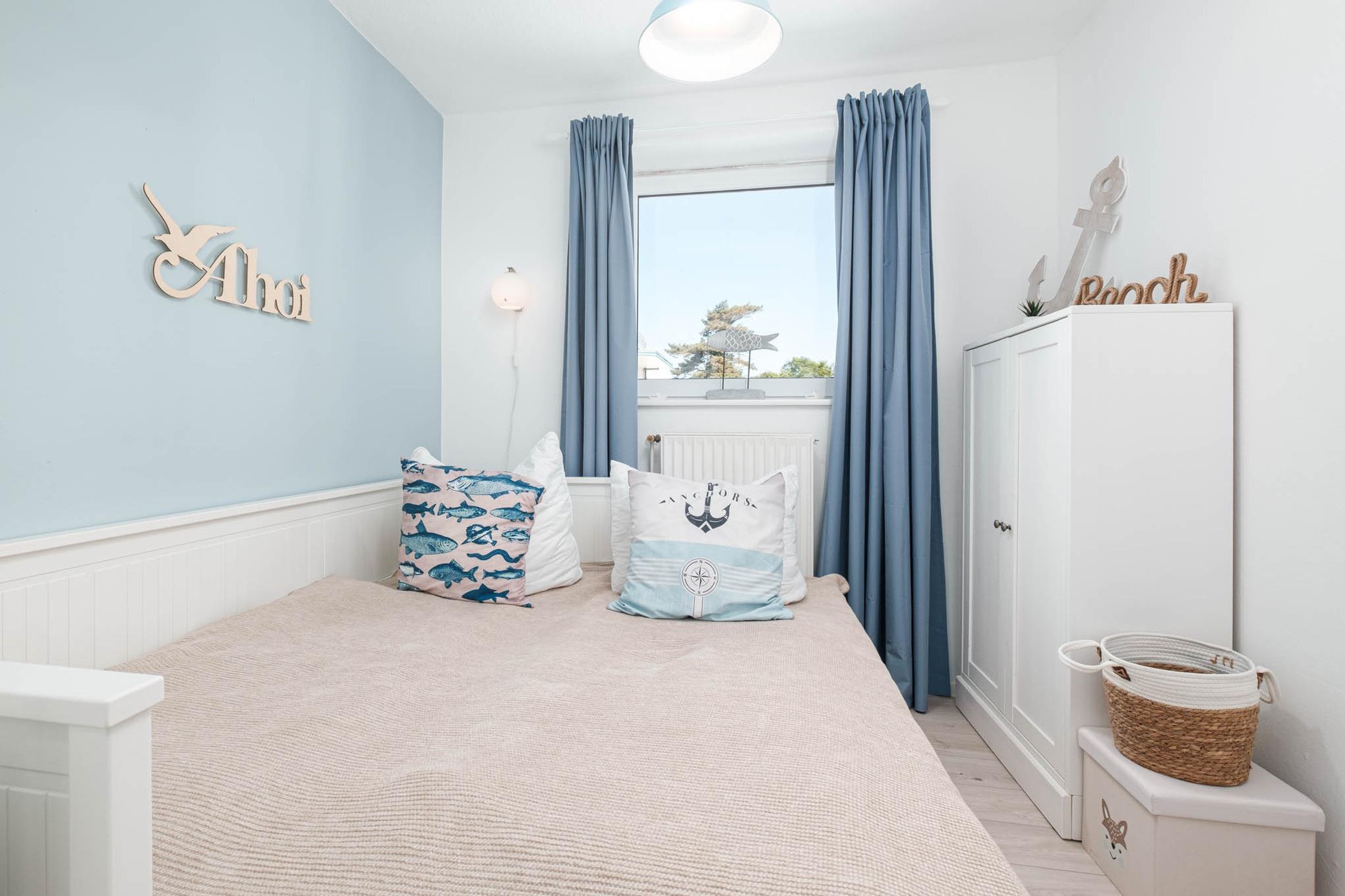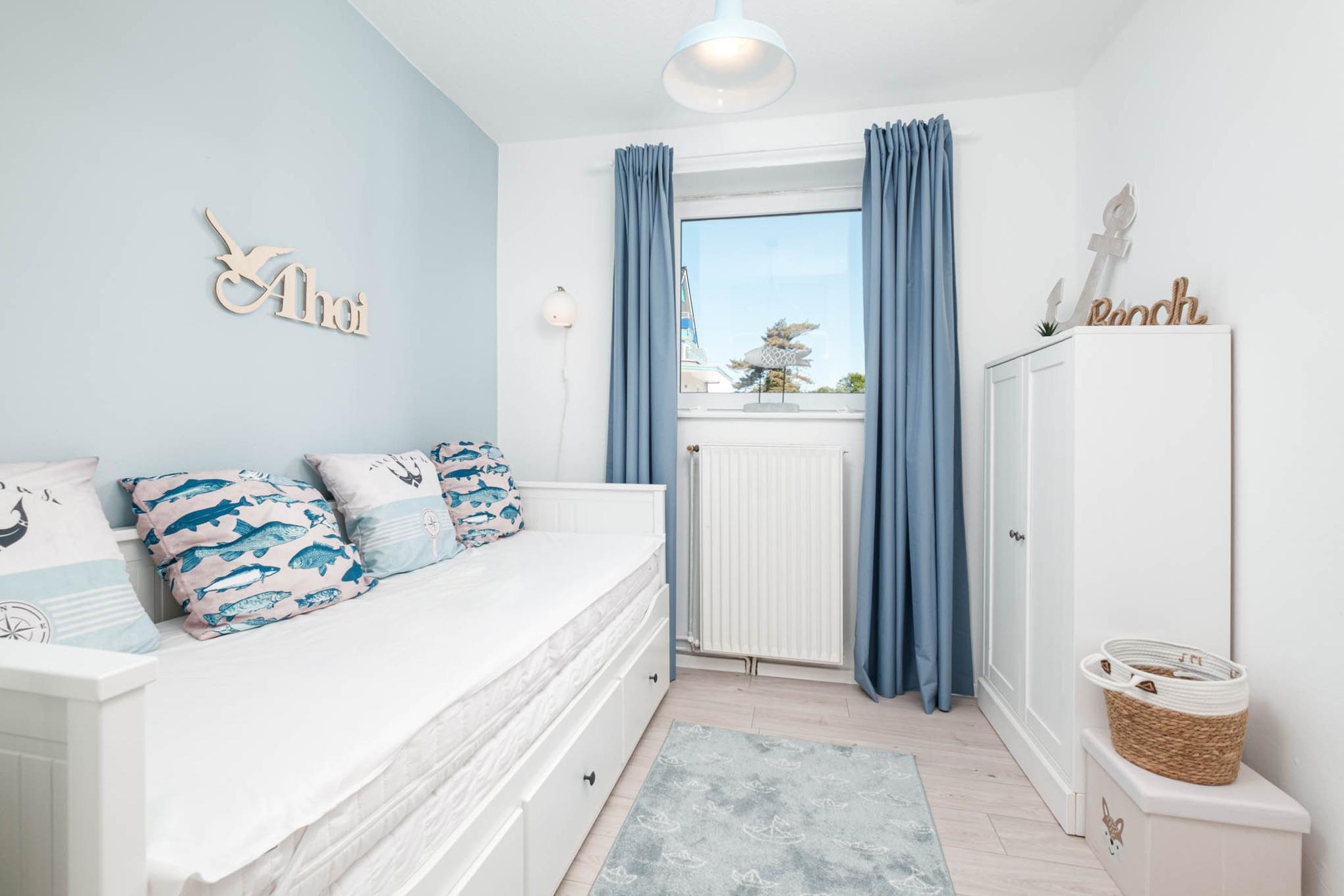 Das Schlafzimmer II verfügt über ein Tandembett (ausziehbar auf 160x200cm) und eine Kommode. Um Ihnen einen erholsamen Schlaf zu garantieren, lassen sich die Schlafräume der Ferienwohnung mittels Vorhängen abdunkeln.