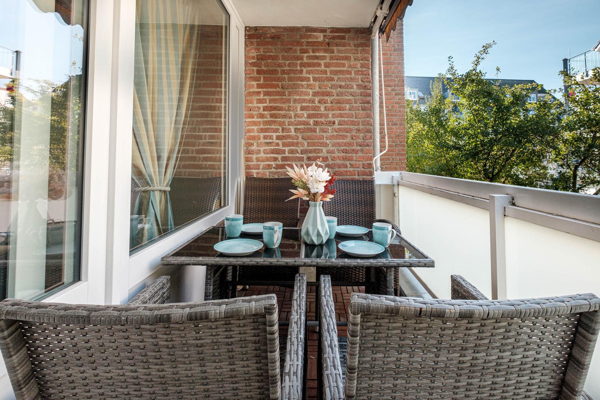 Ein sonniger Balkon in Westlage mit Markise und Balkonmöbeln lädt zum Verweilen und Sonnenbaden ein.