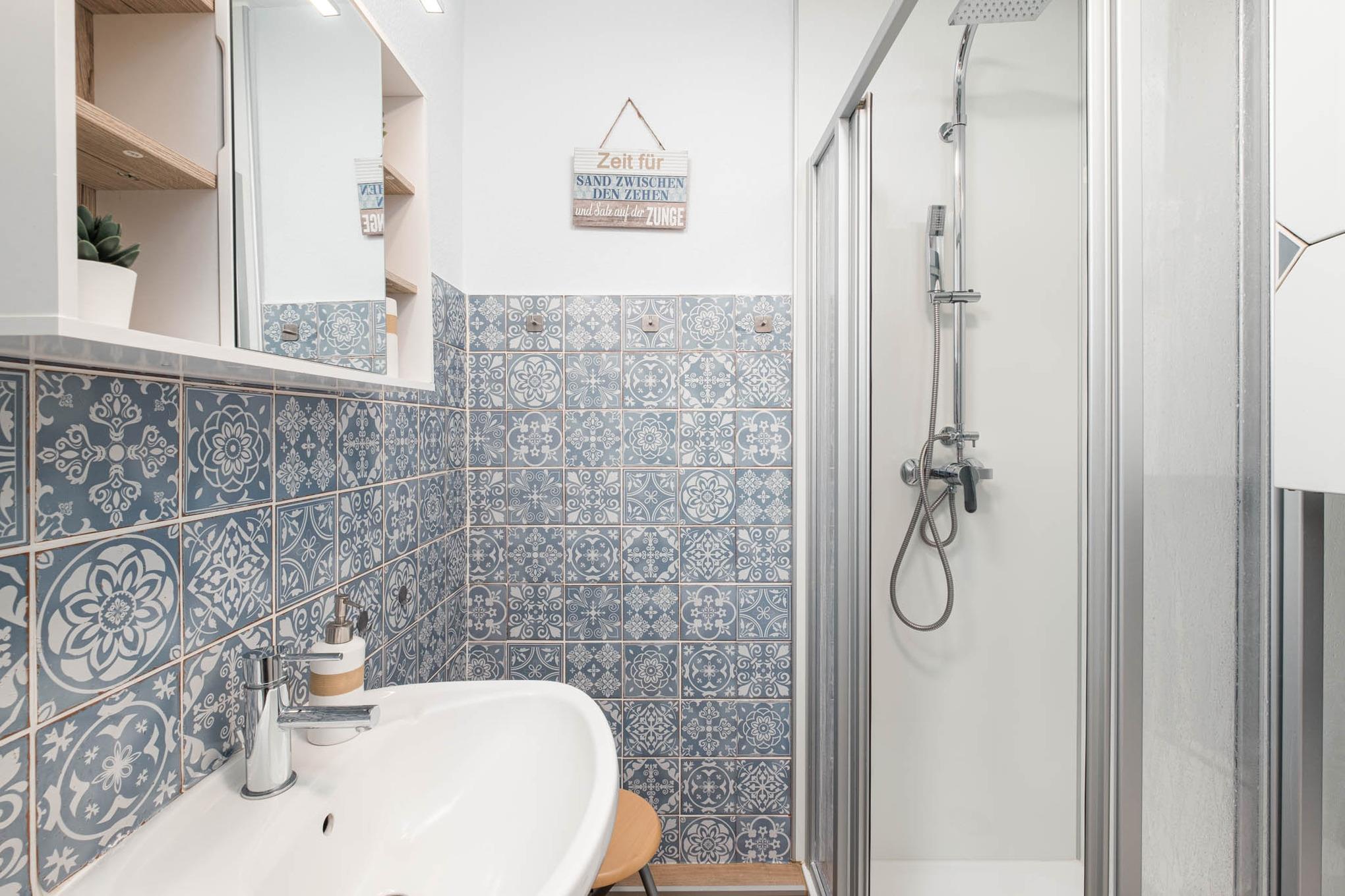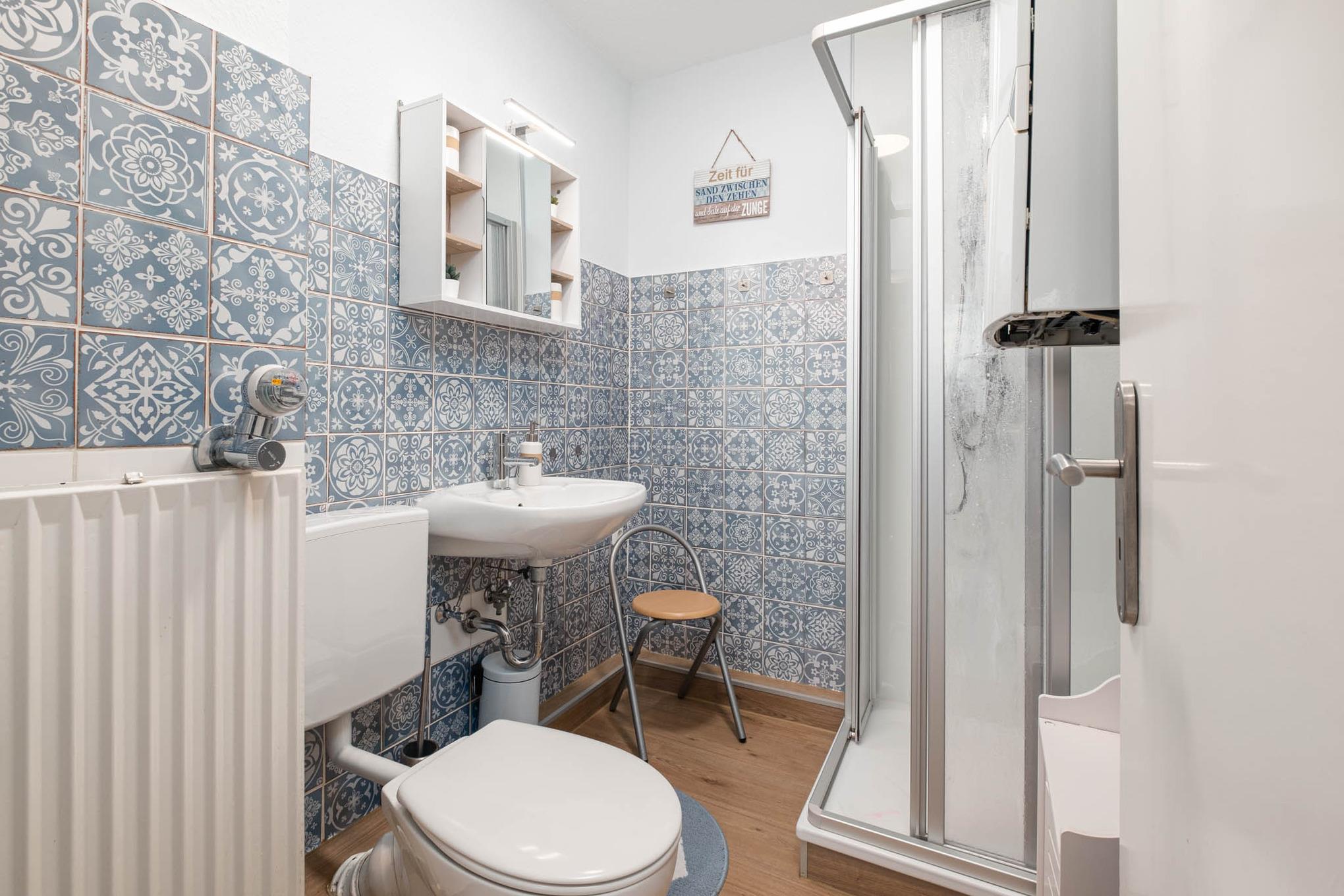 Das Bad mit tollem Fliesendesign bietet Ihnen eine Dusche und ein WC.