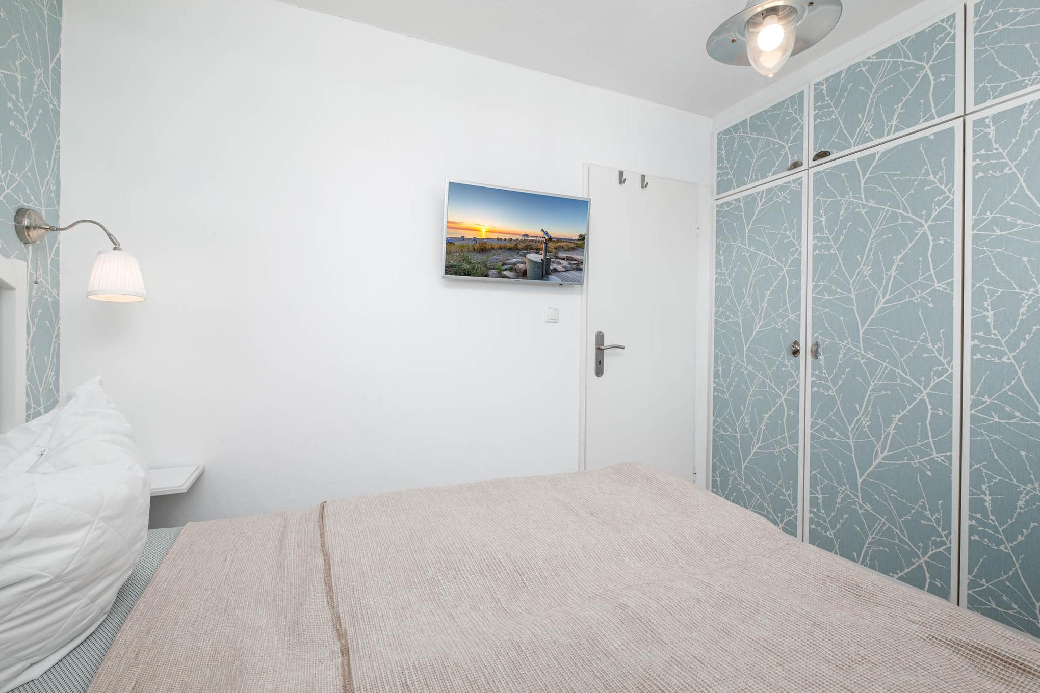 Das Schlafzimmer I ist mit einem Doppelbett (160x200cm), einem Einbauschrank sowie einem Flatscreen-TV ausgestattet.