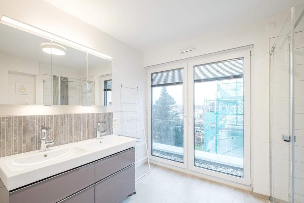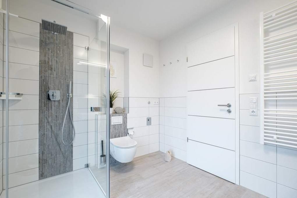 Das hochwertig eingerichtete Bad der Ferienwohnung lädt durch die vorhandene Regenschauerdusche und das Einbau-Radio zum Verweilen ein.