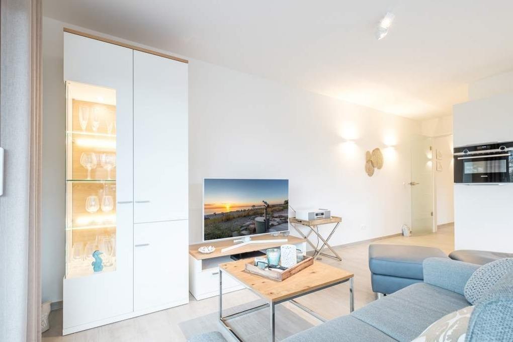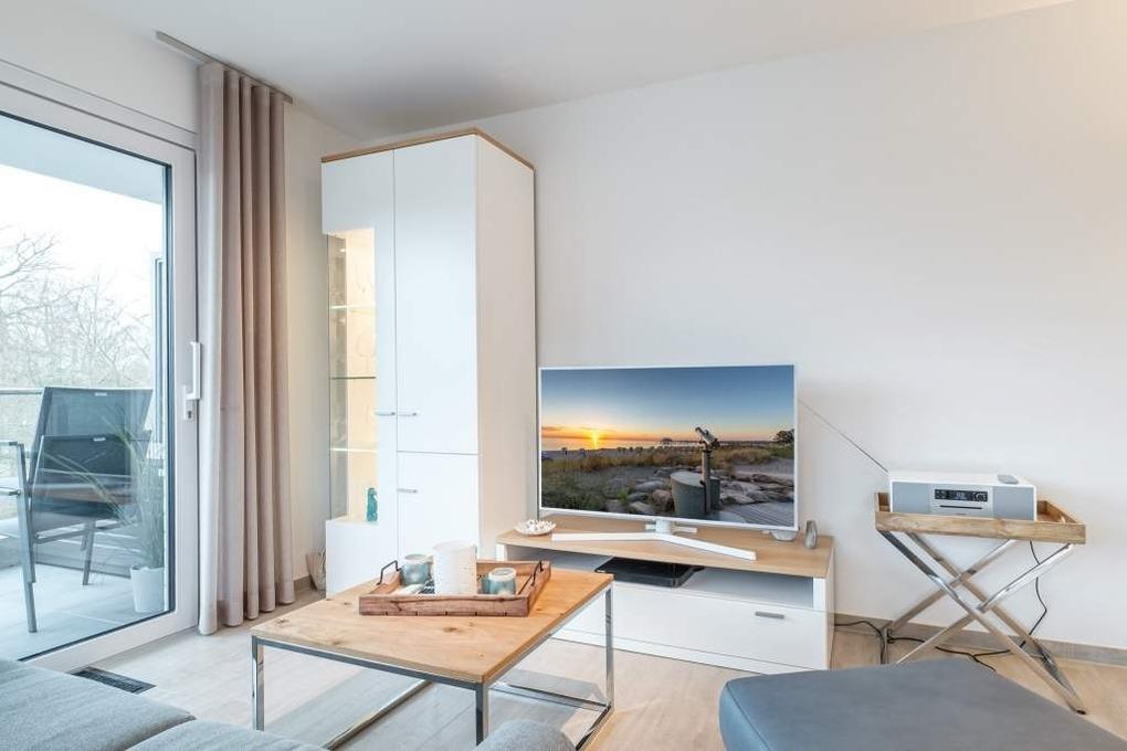 Das gemütliche Wohnzimmer der Scharbeutzer Ferienwohnung verfügt über eine hochwertige Couchgarnitur, einen Flatscreen-TV, einen Blue-Ray-Player und eine Sound-Musikanlage, über die Sie auch Ihre eigene Musik von Ihrem Mobiltelefon abspielen können.
