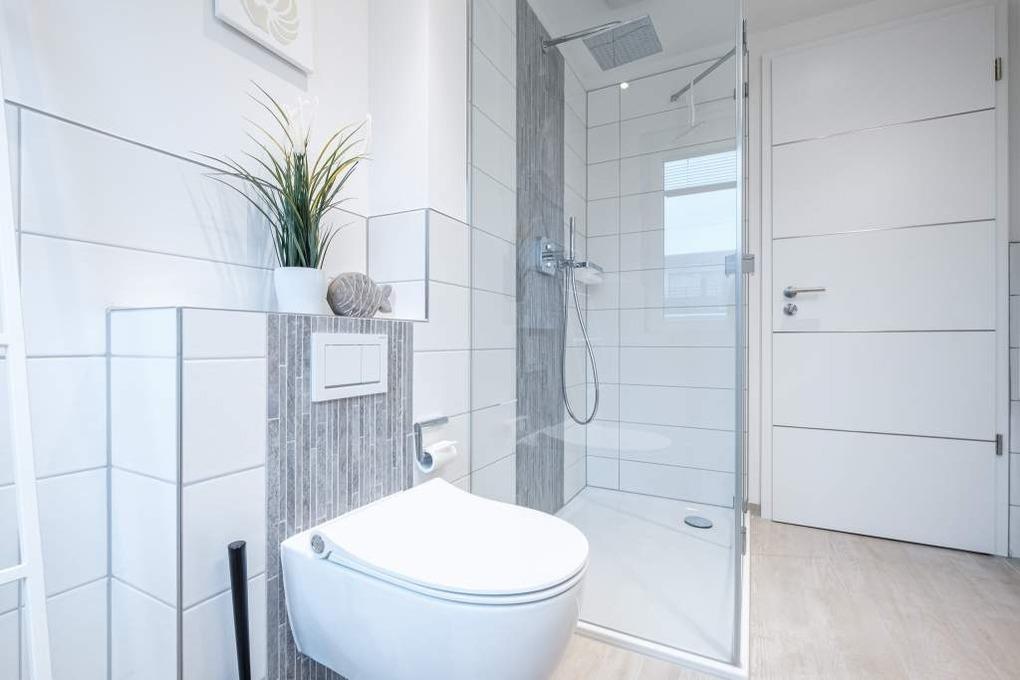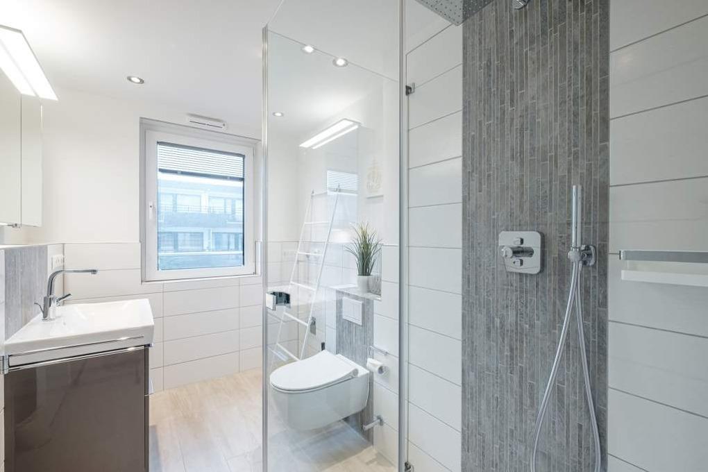 Das hochwertig eingerichtete Bad der Ferienwohnung lädt durch die vorhandene Regenschauerdusche und das Einbau-Radio zum Verweilen ein.