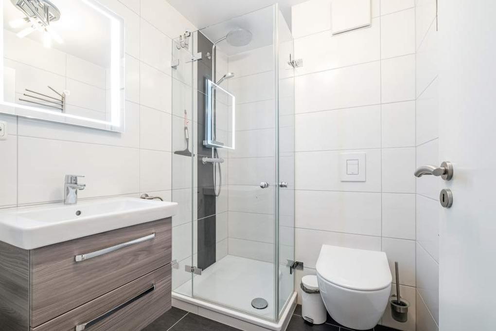 Im modernen, stilvoll designten Badezimmer erwartet Sie eine Dusche mit flachem Einstieg und WC.