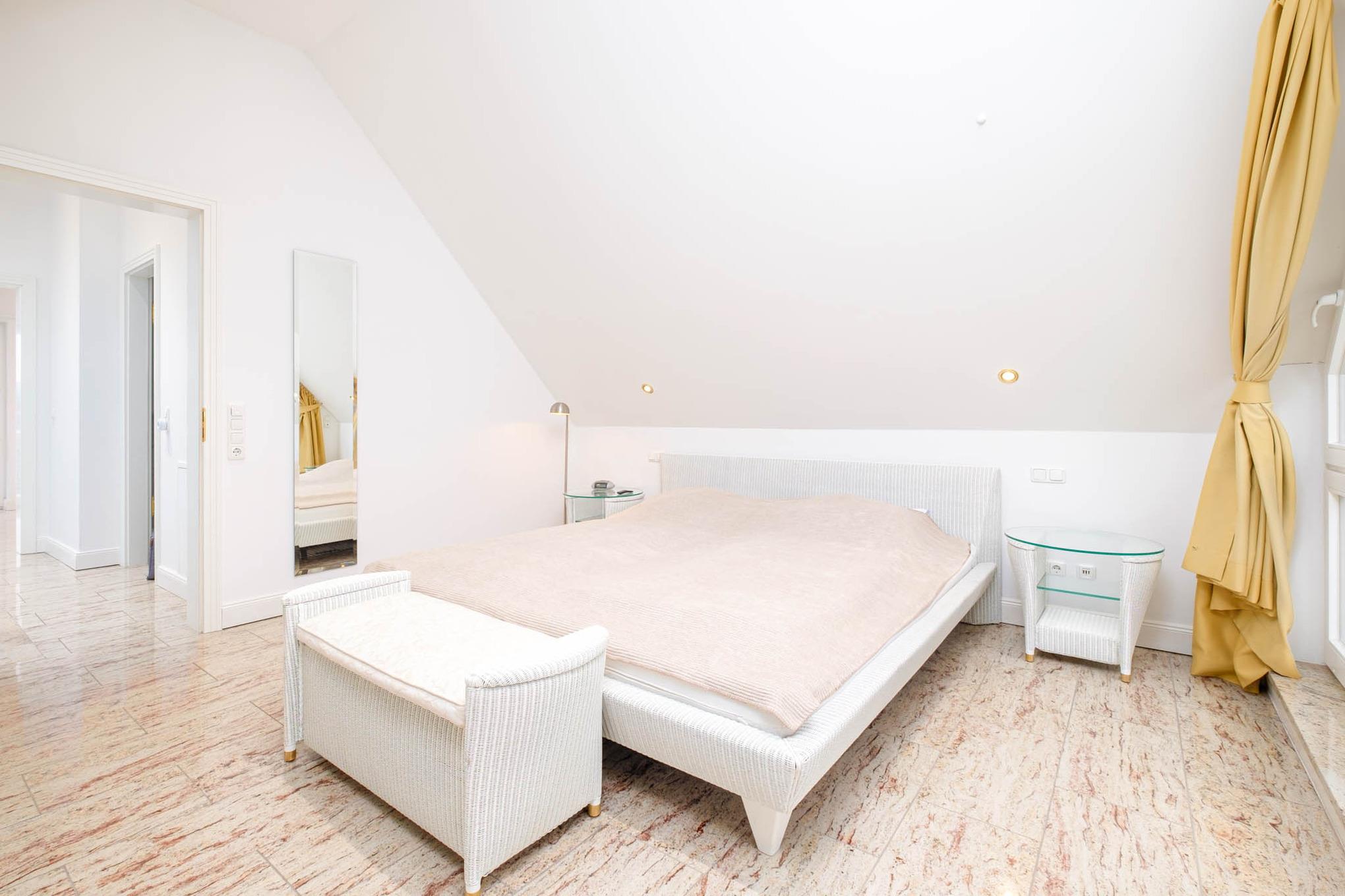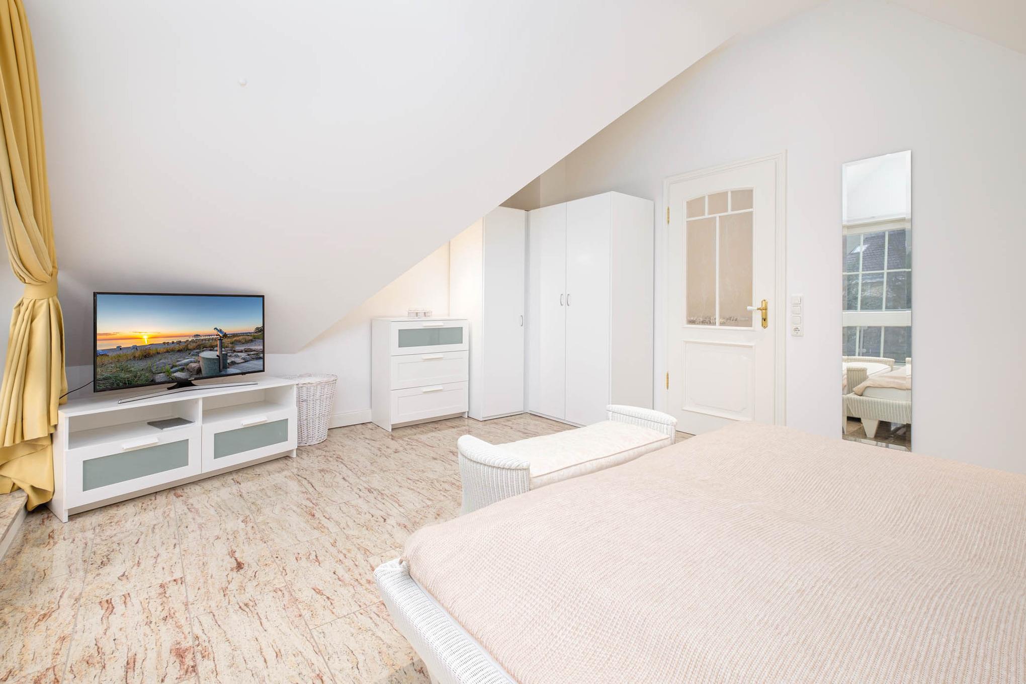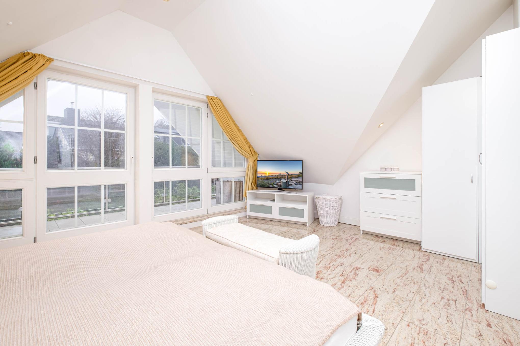 In der Unterkunft befinden sich 2 separate Schlafzimmer, welche beide im Obergeschoss des Hauses liegen. Das Schlafzimmer I ist mit einem Doppelbett (180x200 cm), Flatscreen-TV und Kleiderschrank ausgestattet. Zudem haben Sie von diesem Schlafzimmer Zugang zur überdachten Loggia. Im Schlafzimmer II finden Sie ein weiteres Doppelbett (180 x 200 cm), sowie einen Kleiderschrank vor. Beide Schlafzimmer lassen sich mittels Verdunkelungsvorhängen abdunkeln.