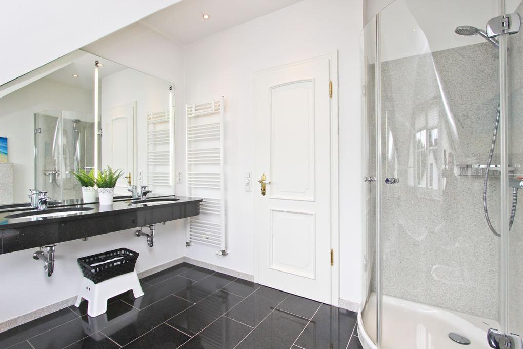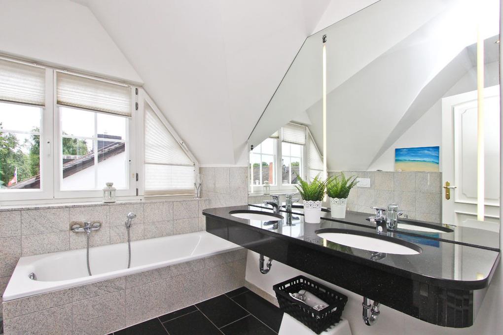 Das Obergeschoss wird durch das moderne Badezimmer mit Dusche, Badewanne, Doppel-Waschtisch, Bidet, Handtuchheizkörper und WC abgerundet. Darüber hinaus verfügt das Erdgeschoss über ein zusätzliches Gäste-WC.